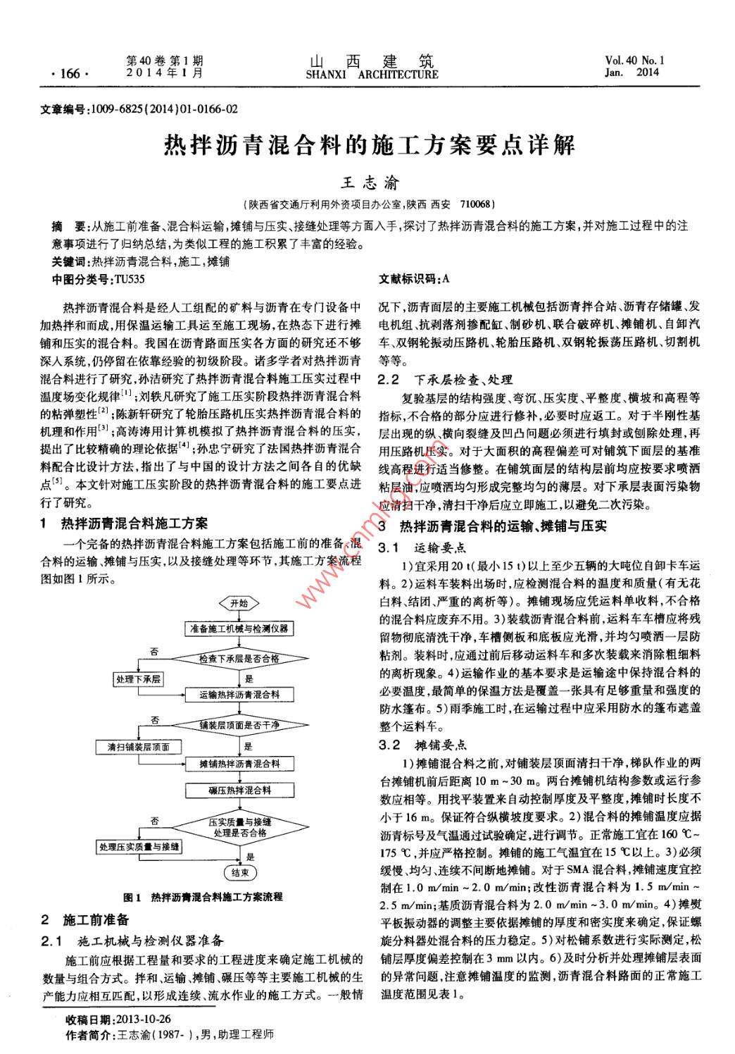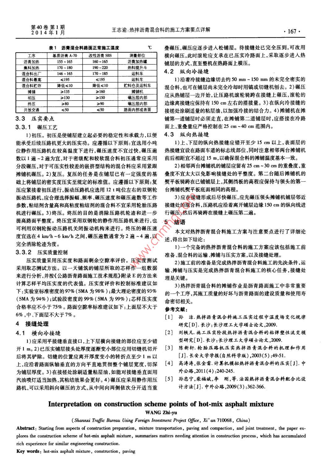 第40卷第1期山西建筑Vol. 40 No. 12014年1月SHANXI ARCHTTECTUREJan.2014文章編號:1009-6825 (2014 )01 -0166-02熱拌瀝青混合料的施工方案要點詳解王志渝(陜西省交通廳利用外資項目辦公室,陜西西安710068)摘要:從施工前準備、混合料運輸,攤鋪與壓實、接縫處理等方面入手,探討了熱拌瀝青混合料的施工方案,并對施工過程中的注意事項進行了歸納總結,為類似工程的施工積累了豐富的經(jīng)驗。關鍵詞:熱拌瀝青混合料,施工,攤鋪中圖分類號:TU535文獻標識碼:A,熱拌瀝青混合料是經(jīng)人工組配的礦料與瀝青在專門設備中況 下,瀝青面層的主要施工機械包括瀝青拌合站、瀝青存儲罐、發(fā)加熱拌和而成,用保溫運輸工具運至施工現(xiàn)場,在熱態(tài)下進行攤電機組抗剝落劑摻配缸、制砂機、聯(lián)合破碎機、攤鋪機、自卸汽鋪和壓實的混合料。我國在瀝青路面壓實各方面的研究還不夠車、雙鋼輪振動壓路機、輪胎壓路機雙鋼輪振蕩壓路機、切割機深人系統(tǒng),仍停留在依靠經(jīng)驗的初級階段。諸多學者對熱拌瀝青等等?;旌狭线M行了研究,孫潔研究了熱拌瀝青混合料施工壓實過程中2.2 下承層檢查、處理溫度場變化規(guī)律" ;劉軼凡研究了施工壓實階段熱拌瀝青混合料復驗基層的結構強度、彎沉、壓實度、平整度、橫坡和高程等的粘彈塑性[2]1 ;陳新軒研究了輪胎壓路機壓實熱拌瀝青混合料的指標,不合 格的部分應進行修補,必要時應返工。對于半剛性基機理和作用);高濤濤用計算機模擬了熱拌瀝青混合料的壓實,層出現(xiàn)的縱、橫向裂縫及凹凸問題必須進行填封或刨除處理,再提出了比較精確的理論依據(jù)141 ;孫忠寧研究了法國熱拌瀝青混合用壓路機壓實。 對于大面積的高程偏差可對鋪筑下面層的基準料配合比設計方法,指出了與中國的設計方法之間各自的優(yōu)缺線高程進行適當修整。在鋪筑面層的結構層前均應按要求噴酒點”。本文針對施工壓實階段的熱拌瀝青混合料的施工要點進粘層 油,應噴酒均勻形成完整均勻的薄層。對下承層表面污染物行了研究。應清掃千凈,清掃干凈后應立即施工,以避免二次污染。1熱拌瀝青混合料施工方案3熱拌瀝青混合料的運輸、攤鋪與壓實-個完備的熱拌瀝青混合料施工方案包括施工前的準備、混3.1 運輸要點合料的運輸、攤鋪與壓實,以及接縫處理等環(huán)節(jié),其施工方案流程1)宜采用20 "(最小15 )以上至少五輛的大噸位自卸卡車運圖如圖1所示。料。2)運料車裝料出場時,應檢測混合料的溫度和質(zhì)量(有無花<開始>白料、結團、嚴重的離析等)。攤鋪現(xiàn)場應憑運料單收料,不合格的混合料應廢棄不用。3)裝載瀝青混合料前,運料車車槽應將殘C準備施工機械與檢測儀器留物徹底清洗干凈,車槽側板和底板應光滑,并均勻噴灑--層防否檢查下承層是否合格>粘劑。裝料時,應通過前后移動運料車和多次裝載來消除粗細料的離析現(xiàn)象。4)運輸作業(yè)的基本要求是運輸途中保持混合料的處理下承層。是運輸熱拌瀝青混合料必要溫度,最簡單的保溫方法是覆蓋一張具有 足夠重量和強度的防水篷布。5)雨季施工時,在運輸過程中應采用防水的篷布遮蓋鋪裝層頂面是否干凈>整個運料車。C清掃鋪裝層頂面門]是3.2 攤鋪要點攤鋪熱拌瀝青混合料1)攤鋪混合料之前,對鋪裝層頂面清掃干凈,梯隊作業(yè)的兩臺攤鋪機前后距離10 m~30 m。兩臺攤鋪機結構參數(shù)或運行參碾壓熱拌混合料.數(shù)應相等。用找平裝置來自動控制厚度及平整度,攤鋪時長度不壓實質(zhì)量與接縫小于16m。保證符合縱橫坡度要求。2)混合料的攤鋪溫度應據(jù), 處理是否合格瀝青標號及氣溫通過試驗確定,進行調(diào)節(jié)。正常施工宜在160 C-[處理壓實質(zhì)與接縫175 C ,并應嚴格控制。攤鋪的施工氣溫宜在15 C以上。3)必須(結束)緩慢、均勻、連續(xù)不間斷地攤鋪。對于SMA混合料,攤鋪速度宜控制在1.0 m/min~2. 0 m/min;改性瀝青混合料為1.5 m/min ~圖1熱拌瀝青混合料施工方案流程2.5 m/min;基質(zhì)瀝青混合料為2.0 m/min ~3.0 m/min。4)攤熨2施工前準備平板振動器的調(diào)整主要依據(jù)攤鋪的厚度和密實度來確定,保證螺2.1施工機械與檢測儀器準備旋分料器處混合料的壓力穩(wěn)定。5)對松鋪系數(shù)進行實際測定,松施工前應根據(jù)工程量和要求的工程進度來確定施工機械的鋪層厚度偏差控制在3mm以內(nèi)。6)及時分析并處理攤鋪層表面數(shù)量與組合方式。拌和運輸、攤鋪碾壓等等主要施工機械的生的異常問題,注意攤鋪溫度的監(jiān)測,瀝青混合料路面的正常施工產(chǎn)能力應相互匹配,以形成連續(xù)、流水作業(yè)的施工方式。一般情溫度范圍見表 1。收稿日期:2013-10-26作者簡介:王志渝(1987- ),男,助理工程師第40卷第1期2014年1月王志渝:熱拌瀝青混合料的施工方案要點詳解●167●表1瀝青混合料路面正常施工溫度疊碾壓,碾壓應逐步進入松鋪層。待接縫處已完全壓到,可改用基質(zhì)瀝青A-70改性瀝青SBS測量部位.橫向碾壓,此時滾輪應支承在已壓實冷路面上,采取逐步進入熱瀝青加熱155 -165160-165瀝青加熱罐鋪層的方式,直至整機在熱路面上橫壓。集料加熱170 ~ 180190 220熱料提升斗4.2縱向冷接縫混合料出廠146- 165170-185運料車混合料最高≤1951)沿著冷接縫邊緣切去約50 mm ~ 150 mm的未完全密實的混合料貯存降低≤10貯料倉及運料車混合料,也
