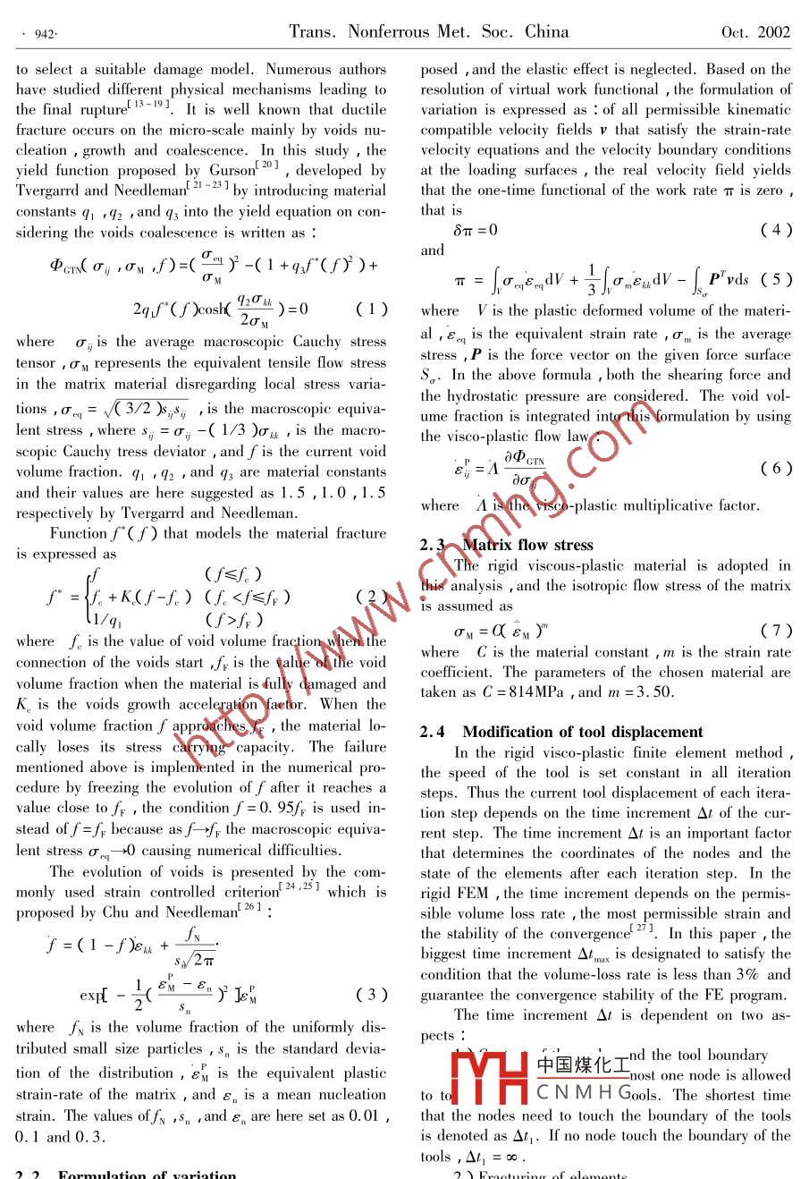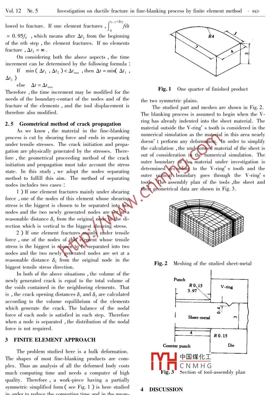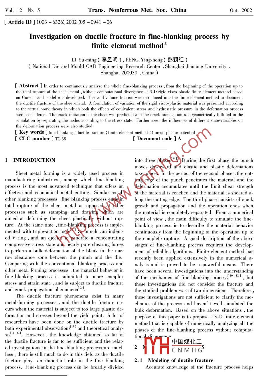 Vol.12 No. 5Trans. Nonferrous Met. Soc. ChinaOct. 2002[ Article ID ] 1003 - 6326( 2002 )05 -0941 -06.Investigation on ductile fracture in fine-blanking process byfinite element method'LI Yu-ming(李昱明), PENG Ying-hong(彭穎紅)( National Die and Mould CAD Engineering Research Center , Shanghai Jiaotong University ,Shanghai 200030 , China )[ Abstract ] In order to continuously analyze the whole fine-blanking process , from the beginning of the operation up tothe total rupture of the sheet-metal , without computational divergence ,a 3-D rigid visco-plastic finite- element method basedon Gurson void model was developed. The void volume fraction was introduced into the finite element method to documentthe ductile fracture of the sheet-metal. A formulation of variation of the rigid visco-plastic material was presented accordingto the virtual work theory in which both the ffcts of equivalent stress and hydrostatic pressure in the deformation processwere considered. The crack initation of the sheet was predicted and the crack propagation was geometrically fufilled in thesimulation by separating the nodes according to the stress state. Furthermore ,the influences of different state-variables onthe deformation process were also studied.[ Key words ] fine-blanking ; ductile fracture ; finite element method ; Gurson plastic potential[CLCnumber]TG38.[ Document code ]A1 INTRODUCTIONinto three phases9. During the first phase the punchmoves downward and elastic and plastic deformationsSheet metal forming is a widely used process intake place. In the period of the second phase , the cut-manufacturing industries , among which fine-blankingting edge of the punch penetrates the material and theprocess is the most advanced technique that offers andeformation accumulates until the limit shear strengtheffective and economical metal cutting. Similar as allof the material is reached and the material is sheared a-other blanking processes , fine blanking process ends inlong the cutting edge. The third phase consists of cracktotal rupture of the sheet metal as opposed at othergrowth and propagation and the operation ends whenprocesses such as stamping and drawing which arethe material is completely separated. From a numericalaimed at deforming the sheet plastically without rup-point of view , the main difficulty to simulate the fine-ture. At the same time , fine-blanking process is imple-blanking process is to describe the material behaviormented with triple-action tools :a punch , an indent-continuously from the beginning of the operation up toed V-ring , and an ejector to generate a concentratingthe complete rupture. A good description of the abovecompressive stress state and nearly pure shearing forcesstages of fine-blanking process requires the develop-to perform a bulk deformation of the blank in the nar-ment of reliable algorithms. Finite element method hasrow clearance zone between the punch and the die.recently been applied extensively in the numerical a-Comparing with the conventional blanking process andnalysis and is proved to be a powerful means. Thereother metal forming processes , the material behavior inhave been several investigations into the understandingfine-blanking process is submitted to more complexof the mechanics of fine-blanking processt[10-12], butstress and strain state , and is subject to ductile fracturethese investigations did not consider the fracture andand crack propagation phenomenat 21the studied problem was of two dimensions. Therefore ,The ductile fracture phenomena exist in manythese investigations are not sufficient to clarify the me-metal-forming processes , and the ductile fracture oc-chanics of the process and haven' t well simulated thecurs when the material is subject to too large plastic de-bulk deformation. Based on the above situations , theformation and stresses beyond the yield point. A lot ofpurpose of this paper is to propose a 3-D finite elementresearches have been done on the ductile fracture bymethod that is capable of numerically analyzing all theboth experimental observations”and theoretical analy-phases of the fine-blanking process without computa-sis4-8. However , the knowledge obtained so far ofthe ductile fracture is far to be sufficient and the relat-中國煤化工ed investigations in the fine-blanking process are muchTYHiCNMHGless , there is still much to do in this field as the ductilefracture plays an important role in the fine blanking2.1 Modeling of ductile fractureprocess. Fine-blanking process can be broadly dividedAccurate knowledge of the fracture process helps①[ Reee格揭o1 -10 -16 ;[ Aceped date 12001-121 -29942.Trans. Nonferrous Met. Soc. ChinaOct.2002to select a suitable damage model. Numerous authorsposed , and the elastic effect is neglected. Based on thehave studied different physical mechanisms leading toresolution of virtual work functional , the formulation ofthe final rupture't is well known that ductilevariation is expressed as : of all permissible kinematicfracture occurs on the micro-scale mainly by voids nu-compatible velocity fields v that satisfy the strain-ratecleation , growth and coalescence. In this study , thevelocity equations and the velocity boundary conditionsyield function proposed by Gurson' 20developed byat the loading surfaces , the real velocity field yieldsTvergarrd and Needleman' 21 ~23 ] by introducing materialthat the one-time functional of the work rate π is zero ,constants 91 ,92 , and 93 into the yield equation on con-that issidering the voids coalescence is written as :δπ=0(4 )andφcm(σj,σμ f)=(二)-(1 +qsf"(fY )+π=|σ_εwdV+→σmendV- |。 P'vds (5)2qJf*(f )cosh( 2 )=0(1 )where V is the plastic deformed volume of the materi-where σis the average macroscopic Cauchy stressal IEeq is the equivalent strain rate ,σm is the averagetensor , σM represents the equivalent tensile flow stressstress ,P is the force vector on the given force surfacein the matrix material disregarding local stress