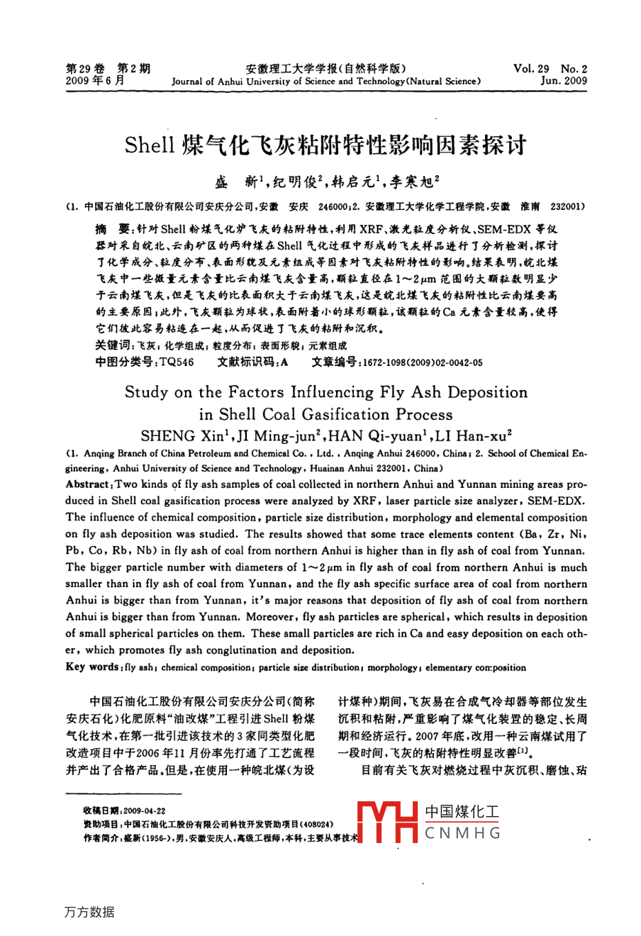 第29卷第2期安徽理工大學學報(自然科學版)Vol. 29 No. 22009年6月Journal of Anhui University of Science and Technology(Natural Science)Jun.2009Shell煤氣化飛灰粘附特性影響因素探討盛新,紀明俊",韓啟元',李寒旭2(1.中國石油化工股份有限公司安慶分公司,安徽安慶246000;2. 安徽理工大學化學工程學院,安徽淮南232001)摘要:針對Shell粉煤氣化爐飛灰的粘附特性,利用XRF、激光粒度分析儀.SEM-EDX等儀器對采自皖北、云南礦區(qū)的兩種煤在Shell氣化過程中形成的飛灰樣品進行了分析檢測,探討了化學成分、粒度分布、表面形貌及元素組成等因素對飛灰粘附特性的影響。結果表明,皖北煤飛灰中一些微量元素含量比云南煤飛灰含量高,顆粒直徑在1~2μm范圍的大顆粒數(shù)明顯少于云南煤飛灰,但是飛灰的比表面積大于云南煤飛灰,這是皖北煤飛灰的粘附性比云南蝶要高的主要原因;此外,飛灰顆粒為球狀,表面附著小的球形顆粒,該顆粒的Ca元素含量較高,使得它們彼此容易粘連在一起,從而促進了飛灰的粘附和沉積。關鍵詞:飛灰;化學組成;粒度分布;表面形貌;元素組成中圖分類號:TQ546文獻標識碼:A文章編號: 162-182002-0042.05Study on the Factors Influencing Fly Ash Depositionin Shell Coal Gasification ProcessSHENG Xin' ,JI Ming-jun2 ,HAN Qi-yuan' ,LI Han-xu2(1. Anqing Branch of China Petroleum and Chemical Co.。Ltd. . Anqing Anhui 246000, China; 2. School of Chemical En-gineering, Anbui University of Science and Technology , Huainan Anhui 232001, China)Abstract:Two kinds of fly ash samples of coal collected in northern Anhui and Yunnan mining areas pro-duced in Shell coal gasification process were analyzed by XRF , laser particle size analyzer , SEM-EDX.The influence of chemical composition,particle size distribution, morphology and elemental compositionon fly ash deposition was studied. The results showed that some trace elements content (Ba, Zr, Ni,Pb, Co, Rb, Nb) in fly ash of coal from northern Anhui is higher than in fly ash of coal from Yunnan.The bigger particle number with diameters of 1~2μm in fly ash of coal from northern Anhui is muchsmaller than in fly ash of coal from Yunnan, and the fly ash specific surface area of coal from northernAnhui is bigger than from Yunnan, it's major reasons that deposition of fly ash of coal from northernAnhui is bigger than from Y unnan. Moreover, fly ash particles are spherical, which results in depositionof small spherical particles on them. These small particles are rich in Ca and easy deposition on each oth-er, which promotes fly ash conglutination and deposition.Key words :fly ash; chemical composition; particle size distribution; morphology; elementary corposition中國石油化工股份有限公司安慶分公司(簡稱計煤種)期間,飛灰易在合成氣冷卻器等部位發(fā)生安慶石化)化肥原料“油改煤”工程引進Shell粉煤沉積和粘附,嚴重影響了煤氣化裝置的穩(wěn)定、長周氣化技術,在第- -批引進該技術的3家同類型化肥期和經(jīng)濟運行。2007年底,改用一種云南煤試用了改造項目中于2006年11月份率先打通了工藝流程一段時間,飛灰的粘附特性明顯改善[1]。并產(chǎn)出了合格產(chǎn)品.但是,在使用一種皖北煤(為設目前有關飛灰對燃燒過程中灰沉積、磨蝕、玷收稿日期2009-04-22中國煤化工資助項目:中國石油化工股份有限公司科技開發(fā)資助項目(4108024)作者簡介:盛新(1956-).男,安徽安慶人,高級工程師,本科,主要從事技術MYHCNMHG第2期盛新,等:Shell 煤氣化飛灰粘附特性影響因素探討43污、腐蝕影響研究主要集中在電站粉煤鍋爐(氧化表1皖北、云南入爐煤 飛灰中的礦物無素%氣氛)[24),而對Shell粉煤氣化爐飛灰的粘附特性成分皖北飛灰云南飛灰研究較少。為滿足安慶石化Shell粉煤氣化裝置的SiO248. 8943.9穩(wěn)定、長周期和經(jīng)濟運行的需要,研究飛灰粘附特Al2Os21. 7724. 6性與灰組分之間的關系、探討灰的粘附機理,是一CaO16.1317.5項十分有意義的課題。本文利用XRF、激光粒度分CO23.40析儀、SEM-EDX等儀器對皖北、云南兩種入爐煤FexOs3. 183. 69形成的飛灰樣品進行了化學成分、粒度分布、表面K2O2. 4762.39形貌和元素組成測定,旨在為生產(chǎn)實踐中預報飛灰TiOz1. 4411. 40的粘附傾向,以及為建立Shell粉煤氣化爐適應性煤種提供一定的參考和建議。SO;1. 0081.43MgO0.7432. 081實驗部分SrO0. 1800. 181Na2O0.2160. 8981.1飛灰樣 品的采集BaO0. 103采集的皖北煤和云南煤兩種飛灰樣品,均取自于ZrOz0.0900.0405安慶石化Shell粉煤氣化裝置生產(chǎn)過程中產(chǎn)生的飛灰。P:rOs0. 1070.1111.2實驗方法CuO0.04560.034 1PbO0.037 5利用日本SHIMADZU公司XRF-1800射線熒CrO30.03100.054 5光儀對灰化學成分測定;利用英國馬爾文儀器有限Ga2O,0. 028 2公司MS-2000型激光粒度分析儀進行粒度分布測MnO0.021 80.030 0定;通過日本日立S-3000N掃描電鏡(SEM)和JSM-6301F場發(fā)射掃描電子顯微鏡(SEM/EDX)ZnO0.027 70.019 1對樣品進行表面形貌分析及元素組成分析.NiO0.024 4Y2O30, 013 30.023 82結果和討論CorO30.014 8Rb2O0.012 42.1飛灰的化學成分分析NbO0. 006 9從化學觀點來看,煤是由無機組分和有機組分組成的。煤在燃燒、氣化時礦物中元素會發(fā)生遷移,2.2飛灰的粒度分 布分析經(jīng)過復雜的物理化學變化之后,分別向底渣、飛灰飛灰的粒徑呈正態(tài)分布,云南煤飛灰的粒徑分中轉化,這個再分配過程與元素在煤中的存在形布比皖北煤要寬一些,同時粒徑也較大(見圖1).態(tài).元素的物理化學特性、氣化過程所表現(xiàn)出來的揮發(fā)性等眾多因素有關(見表1).皖北入爐煤飛灰中元素分布以元素Si