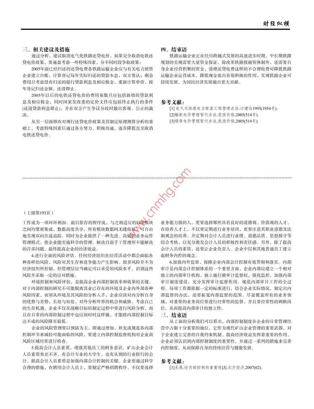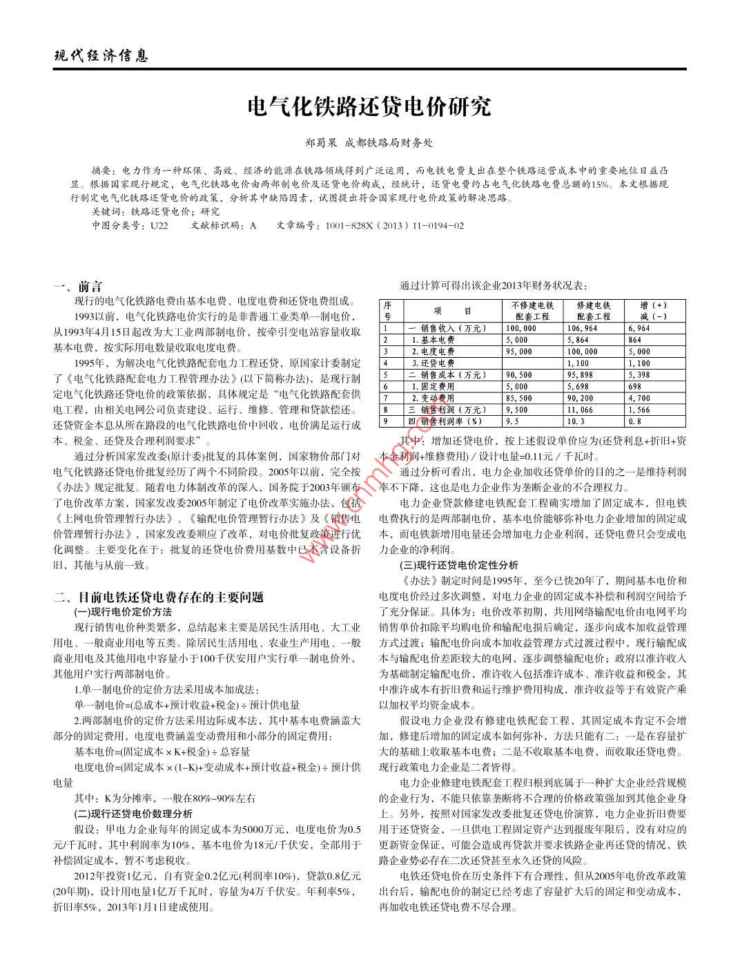 現(xiàn)代經(jīng)濟(jì)信息電氣化鐵路還貸電價(jià)研究鄭蜀果成都鐵路局財(cái)務(wù)處摘要:電力作為一種環(huán)保、高效、經(jīng)濟(jì)的能源在鐵路領(lǐng)域得到廣泛運(yùn)用,而電鐵電費(fèi)支出在整個(gè)鐵路運(yùn)營(yíng)成本中的重要地位日益凸顯。根據(jù)國(guó)家現(xiàn)行規(guī)定,電氣化鐵路電價(jià)由兩部制電價(jià)及還貸電價(jià)構(gòu)成,經(jīng)統(tǒng)計(jì),還貸電費(fèi)約占電氣化鐵路電費(fèi)總額的15%。本文根據(jù)現(xiàn)行制定電氣化鐵路還貸電價(jià)的政策,分析其中缺陷因素,試圖提出符合國(guó)家現(xiàn)行電價(jià)政策的解決思路。關(guān)鍵詞: 鐵路還貸電價(jià);研究中圖分類號(hào): U22文獻(xiàn)標(biāo)識(shí)碼: A文章編號(hào): 1001-828X (2013) 11-0194-02 .前言通過(guò)計(jì)算可得出該企業(yè)2013年財(cái)務(wù)狀況表:現(xiàn)行的電氣化鐵路電費(fèi)由基本電費(fèi)、電度電費(fèi)和還貸電費(fèi)組成。項(xiàng)目不修建電鐵修建電鐵增(+)1993以前,電氣化鐵路電價(jià)實(shí)行的是非普通工業(yè)類單-制電價(jià),配套工程從1993年4月15日起改為大工業(yè)兩部制電價(jià),按牽引變電站容量收取t一銷售收入(萬(wàn)元)100.000106, 964I 6, 9645, 0005, 864f 864基本電費(fèi),按實(shí)際用電數(shù)量收取電度電費(fèi)。95, 000100, 000s, 0001995年,為解決電氣化鐵路配套電力工程還貸,原國(guó)家計(jì)委制定L1, 1001,100了《電氣化鐵路配套電力工程管理辦法》(以下簡(jiǎn)稱辦法),是現(xiàn)行制二銷售成本(萬(wàn)元)90, 50095. 8985,398定電氣化鐵路還貸電價(jià)的政策依據(jù),具體規(guī)定是“電氣化鐵路配套供.1.固定費(fèi)用5,69869885, 50090,2004, 700電工程,由相關(guān)電網(wǎng)公司負(fù)責(zé)建設(shè)、運(yùn)行、維修、管理和貸款償還。三銷售利潤(rùn)(萬(wàn)元)50000還貸資金本息從所在路段的電氣化鐵路電價(jià)中回收,電價(jià)滿足運(yùn)行成9西銷售利潤(rùn)率(%)本、稅金、還貸及合理利潤(rùn)要求”其中:增加還貸電價(jià),按上述假設(shè)單價(jià)應(yīng)為(還貸利息+折舊+資通過(guò)分析國(guó)家發(fā)改委(原計(jì)委)批復(fù)的具體案例,國(guó)家物價(jià)部門(mén)對(duì)本 金利潤(rùn)+維修費(fèi)用)/設(shè)計(jì)電量=0.11元/千瓦時(shí)。電氣化鐵路還貸電價(jià)批復(fù)經(jīng)歷了兩個(gè)不同階段。2005年以前, 完全按通過(guò)分析可看出,電力企業(yè)加收還貸單價(jià)的目的之一是維持 利潤(rùn)《辦法》規(guī)定批復(fù)。隨著電力體制改革的深人,國(guó)務(wù)院于2003年頒布率不下降, 這也是電力企業(yè)作為壟斷企業(yè)的不合理權(quán)力。了電價(jià)改革方案,國(guó)家發(fā)改委2005年制定了電價(jià)改革實(shí)施辦法,包括電力企業(yè)貸款修建電鐵配套工程確實(shí)增加了固定成本,但電鐵《上網(wǎng)電價(jià)管理暫行辦法》、《輸配電價(jià)管理暫行辦法》 及《銷售電電 費(fèi)執(zhí)行的是兩部制電價(jià),基本電價(jià)能夠彌補(bǔ)電力企業(yè)增加的固定成價(jià)管理暫行辦法》,國(guó)家發(fā)改委順應(yīng)了改革,對(duì)電價(jià)批復(fù)政策進(jìn)行優(yōu)本, 而電鐵新增用電量還會(huì)增加電力企業(yè)利潤(rùn),還貸電費(fèi)只會(huì)變成電化調(diào)整。主要變化在于:批復(fù)的還貸電價(jià)費(fèi)用基數(shù)中已不含設(shè)備折力 企業(yè)的凈利潤(rùn)。舊,其他與從前一致。(三)現(xiàn)行還貸電價(jià)定性分析《辦法》制定時(shí)間是1995年,至今已快20年了,期間基本電價(jià)和目前電鐵還貸電費(fèi)存在的主要問(wèn)題電度電價(jià)經(jīng)過(guò)多次調(diào)整,對(duì)電力企業(yè)的固定成本補(bǔ)償和利潤(rùn)空間給予(-)現(xiàn)行電價(jià)定價(jià)方法了充分保證。具體為:電價(jià)改革初期,共用網(wǎng)絡(luò)輸配電價(jià)由電網(wǎng)平均現(xiàn)行銷售電價(jià)種類繁多,總結(jié)起來(lái)主要是居民生活用電、大工業(yè)銷售單價(jià)扣除平均購(gòu)電價(jià)和輸配電損后確定,逐步向成本加收益管理用電、一般商業(yè)用電等五類。除居民生活用電、農(nóng)業(yè)生產(chǎn)用電、一般方式過(guò)渡; 輸配電價(jià)向成本加收益管理方式過(guò)渡過(guò)程中,現(xiàn)行輸配成商業(yè)用電及其他用電中容量小于100千伏安用戶實(shí)行單- -制電價(jià)外,本與輸配電價(jià)差距較大的電網(wǎng),逐步調(diào)整輸配電價(jià);政府以準(zhǔn)許收入其他用戶實(shí)行兩部制電價(jià)。為基礎(chǔ)制定輸配電價(jià),準(zhǔn)許收入包括準(zhǔn)許成本、準(zhǔn)許收益和稅金,其1單一制電價(jià)的定價(jià)方法采用成本加成法:中準(zhǔn)許成本有折舊費(fèi)和運(yùn)行維護(hù)費(fèi)用構(gòu)成,準(zhǔn)許收益等于有效資產(chǎn)乘單一制電價(jià)=(總成本+預(yù)計(jì)收益+稅金)+預(yù)計(jì)供電量以加權(quán)平均資金成本。2.兩部制電價(jià)的定價(jià)方法采用邊際成本法,其中基本電費(fèi)涵蓋大假設(shè)電力企業(yè)沒(méi)有修建電鐵配套工程,其固定成本肯定不會(huì)增部分的固定費(fèi)用,電度電費(fèi)涵蓋變動(dòng)費(fèi)用和小部分的固定費(fèi)用:加,修建后增加的固定成本如何彌補(bǔ),方法只能有二: - -是在容量擴(kuò)基本電價(jià)