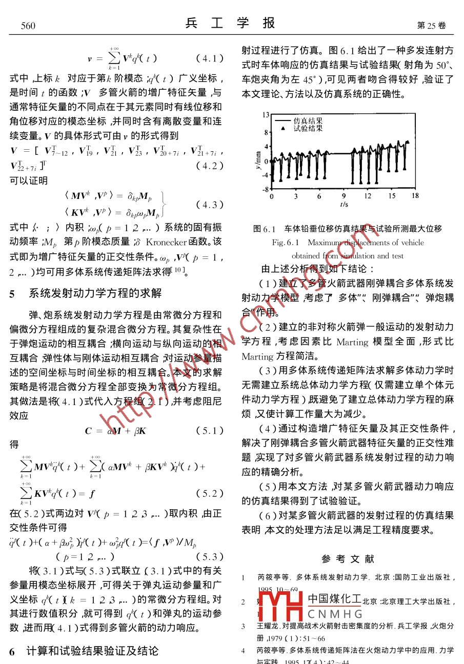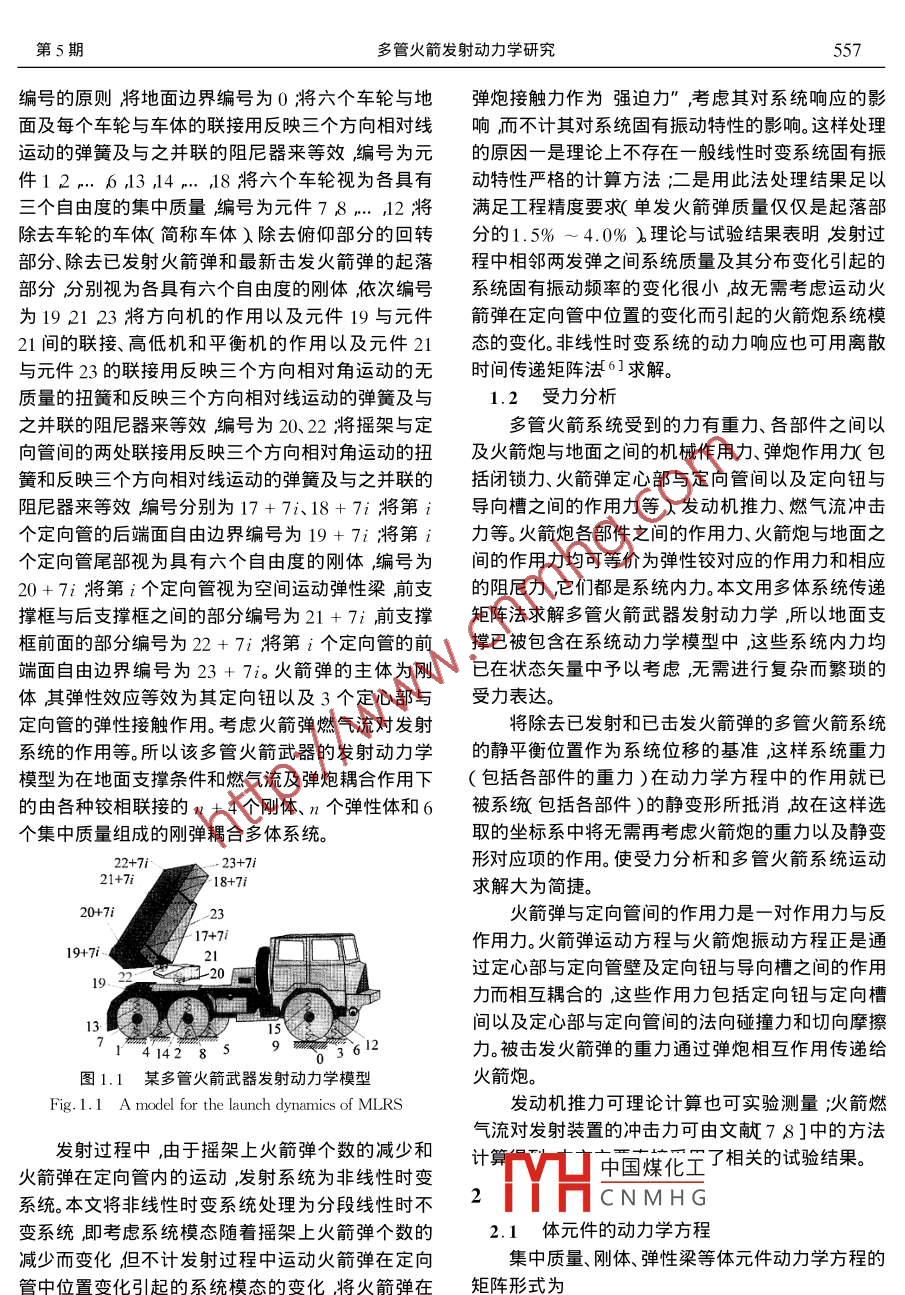 第25卷第5期兵工學(xué)報Vol 25 No 52004年9月ACTA ARMAMENTARIIsep.2004多管火箭發(fā)射動力學(xué)研究芮筱亭*贠來峰**陸毓琪*陳衛(wèi)東*王國平*趙克升**何斌陸文廣〔南京理工大學(xué)動力工程學(xué)院江蘇南京210094·)(南京軍代局駐揚(yáng)州地區(qū)軍代室)中國白城兵器試驗(yàn)中心**)(哈爾濱工程大學(xué)”摘要從武器系統(tǒng)彈、炮、藥、環(huán)境一體化的角度研究了多管火箭武器發(fā)射動力學(xué)建立了多管火箭武器剛體、彈性體耦合的多體系統(tǒng)發(fā)射動力學(xué)模型和發(fā)射動力學(xué)方程并給岀了增廣特征矢量的正交性條件力圖實(shí)現(xiàn)對多管火箭武器系統(tǒng)動力響應(yīng)的精確分析。用本文方法對某多管火箭武器動力響應(yīng)的仿真結(jié)果進(jìn)行了試驗(yàn)驗(yàn)證關(guān)鍵詞振動與波迻管火箭炮火箭彈發(fā)射動力學(xué)彈道正交性中圖分類號TJ713;T760.13發(fā)射動力學(xué)是研究武器系統(tǒng)在發(fā)射過程中的受 Marting模型中的一個致命弱點(diǎn)是未能考慮彈丸的力及運(yùn)動規(guī)律進(jìn)而研究控制受力與運(yùn)動規(guī)律旳—動不平衡對彈丸靜不平衡的處理也不夠合理而這門新興學(xué)科是當(dāng)代兵器領(lǐng)域科技工作者關(guān)注的熱兩個因素對彈丸起始擾動研究恰恰是至關(guān)重要的點(diǎn)之_1國內(nèi)外發(fā)射動力學(xué)的研究文獻(xiàn)中相繼 Marting工作的另一個不足之處是描述彈丸運(yùn)動的提出了單自由度、多自由度等模型2實(shí)踐證明,動參考系選取不佳從而使所建立的微分方程的形定向管的剛度對起始擾動和密集度的影響極其明式非常復(fù)雜難以寫出彈丸運(yùn)動微分方程的最終形顯必須作為彈性體來處理3式。本文針對 Marting方程的不足對 Marting模型為減少多管武器試驗(yàn)用彈量實(shí)現(xiàn)其動態(tài)設(shè)計,作了實(shí)質(zhì)性改進(jìn)建立了適用于各種類型火箭彈的首先需解決含有剛體和彈性體(或剛性梯度很大發(fā)射動力學(xué)方程。復(fù)雜耦合系統(tǒng)多管火箭武器)有振動特性的計算冋題以及多管火箭剛彈耦合系統(tǒng)對任意激勵動力響1多管火箭發(fā)射動力學(xué)模型及受力分析應(yīng)的精確分析。但是剛彈耦合系統(tǒng)由于剛體與彈1.1發(fā)射動力學(xué)模型性體之間的耦合作用使得耦合系統(tǒng)的特征值問題以某輪式多管火箭炮為研究對象發(fā)射環(huán)境下非自共軛系統(tǒng)的振型函數(shù)不具有通常意義下的正武器系統(tǒng)包括火箭炮、火箭彈和陣地祭件?;鸺诮恍詮亩y以用經(jīng)典的模態(tài)方法精確分析耦合系主要由定向管、搖架、平衡機(jī)、高低傳動裝置、方向傳統(tǒng)的動力響應(yīng)問題。為此本文引入了多體系統(tǒng)傳動裝置、回轉(zhuǎn)盤、座圈、底架、車體、板簧固定器、輪胎遞矩陣法4。這種方法便于實(shí)現(xiàn)發(fā)射動力學(xué)分析以及電傳動系統(tǒng)等組成。的高度程式化易于工程問題的解決得到了國內(nèi)外根據(jù)多管火箭武器各個部件的自然屬性將其的重視劃分??煞譃轶w”和鉸”兩1984年美國動力學(xué)專家 Marting拋棄了彈帶大類中國煤化彈性梁等而鉸"泛或后定心部沖心沿炮膛軸線運(yùn)動”的傳統(tǒng)假設(shè)建指犀<問聯(lián)接關(guān)系,包括扭簧、彈立了彈丸在膛內(nèi)作一般運(yùn)動的微分方程但簧、阻尼器等。如圖1.1所示根據(jù)體”和鉸"統(tǒng)2003年7月收稿2004年7月定稿κ國防科技預(yù)研重點(diǎn)項(xiàng)目(98sY05)第5期多管火箭發(fā)射動力學(xué)研究557編號的原則將地面邊界編號為θ將六個車輪與地彈炮接觸力作為強(qiáng)迫力”考慮其對系統(tǒng)響應(yīng)的影面及每個車輪與車體的聯(lián)接用反映三個方向相對線響而不計其對系統(tǒng)固有振動特性的影響。這樣處理運(yùn)動的彈簧及與之并聯(lián)的阻尼器來等效編號為元的原因一是理論上不存在一般線性時變系統(tǒng)固有振件12灬613,14灬,8將六個車輪視為各具有動特性嚴(yán)格的計算方法;二是用此法處理結(jié)果足以個自由度的集中質(zhì)量編號為元件78灬,,12將滿足工程精度要求(單發(fā)火箭彈質(zhì)量僅僅是起落部除去車輪的車體(簡稱車體)除去俯仰部分的回轉(zhuǎn)分的1.5%~4.0%)理論與試驗(yàn)結(jié)果表明發(fā)射過部分、除去已發(fā)射火箭彈和最新?lián)舭l(fā)火箭彈的起落程中相鄰兩發(fā)彈之間系統(tǒng)質(zhì)量及其分布變化引起的部分分別視為各具有六個自由度的剛體依次編號系統(tǒng)固有振動頻率的變化很小故無需考慮運(yùn)動火為1921②3將方向機(jī)的作用以及元件19與元件箭彈在定向管中位置的變化而引起的火箭炮系統(tǒng)模21間的聯(lián)接、高低機(jī)和平衡機(jī)的作用以及元件21態(tài)的變化。非線性時變系統(tǒng)的動力響應(yīng)也可用離散與元件23的聯(lián)接用反映三個方向相對角運(yùn)動的無時間傳遞矩陣湛6求解。質(zhì)量的扭簧和反映三個方向相對線運(yùn)動的彈簧及與1.2受力分析之并聯(lián)的阻尼器來等效編號為20、22將將搖架與定多管火箭系統(tǒng)受到的力有重力、各部件之間以向管間的兩處聯(lián)接用反映三個方向相對角運(yùn)動的扭及火箭炮與地面之間的機(jī)械作用力、彈炮作用力包簧和反映三個方向相對線運(