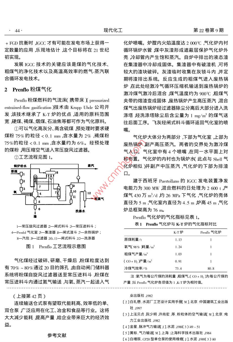 第22卷第9期現(xiàn)代化工ep. 20022002年9月Modern Chemical Industry43.采用Prenflo氣化技術(shù)的IGCC流程路文學(xué)亓棟?( 1.水煤漿氣化及煤化工國家工程研究中心滕州277527 2.兗礦魯南化肥廠甲醇分廠滕州277527)摘要Prenflo氣化屬于粉煤氣化技術(shù)與Shell的粉煤氣化技術(shù)相似同屬氣流床氣化工藝整體煤氣化燃?xì)庹羝?lián)合循環(huán)( IGCC)是先進(jìn)的潔凈煤技術(shù)具有廣闊的應(yīng)用前景。介紹了IGCC技術(shù)的起源進(jìn)展、特色重點介紹采用Prenlo煤氣化工藝的IGCC流程。關(guān)鍵詞:氣化發(fā)電粉煤,Prenlo ;CCC中圖分類號:T1Q54文獻(xiàn)標(biāo)識碼:AIGCC technology with Prenflo coal gasification processLU Wen-xue! , QI Dong2( 1.National Research and Engineering Center for Coal Slury Gasification and Coal Chenmicals , Tngzhou 277527 , China ;2. Lunan Fertilizer Plant of Yanzhou Mine Group , Tengzhou 277527 , China )Abstract : Prenlo gasification is a gasification process under pulverized coal similar to Shell gasification pand they are bothfalling into the entrained-bed coal gasification process. IGCC integrated gasifcation combined cycle ) is an advanced clean coaltechnology and ses a wide application prospect. The history progress features of IGCC technology are introduced Prenflo coalgasification process emphasized.Key words : gaifcation ; electricity generation ; pulverized coal ; Prenlo ; IGCC整體煤氣化燃?xì)鈅蒸汽聯(lián)合循環(huán)發(fā)電( IGCC )是上第一個I6CC的示范裝置;1984年建成于美國加從20世紀(jì)70年代發(fā)展起來的潔凈煤發(fā)電技術(shù),它州Daggett的CoolWater電站,則是世界上公認(rèn)的試是使煤在氣化爐中氣化為中熱值或低熱值煤氣然運行成功的ICCC裝置;此外在美國路易斯安那州后通過凈化處理供到燃?xì)鈤蒸汽聯(lián)合循環(huán)的發(fā)電機Dow化工廠內(nèi)的IGCC示范裝置( LGTI)則進(jìn)一步組中去燃燒做功。它實際上是在燃?xì)鈅蒸汽聯(lián)合循證明了ICCC作為-種新的潔凈煤發(fā)電方式的實用環(huán)發(fā)電的基礎(chǔ)上疊加煤的氣化和凈化設(shè)備使煤變價值。成人造的干凈煤氣進(jìn)而在燃?xì)?蒸汽聯(lián)合循環(huán)發(fā)電②快速提高IGCC性能階段的設(shè)備中實現(xiàn)煤的潔凈發(fā)電目的。ICCC以常規(guī)的20世紀(jì)90年代開始,人們競相建立IGCC的示燒油(或天然氣)的燃?xì)?蒸汽聯(lián)合循環(huán)的發(fā)電機組范電站進(jìn)行設(shè)備和系統(tǒng)的優(yōu)化,以實現(xiàn)其商業(yè)性示為基礎(chǔ),目前,這種發(fā)電機組已相當(dāng)成熟。在開發(fā)范的目標(biāo)。在美國的6個示范工程中,有采用以氧ICCC時人們的注意力將主要放在煤的氣化技術(shù)和氣為氣化劑,水煤漿為供煤方式的噴流床氣化爐粗煤氣的除灰脫硫等凈化技術(shù)上。( Texaco爐和Ddextec爐) ,有以空氣鼓風(fēng)干法供煤的流化床氣化爐( KRW爐和U-Gas爐);在歐洲則側(cè)1 IGCC 技術(shù)簡介重于開發(fā)以氧氣為氣化劑干法供煤的噴流床氣化,IGCC作為一種先進(jìn)的潔凈煤發(fā)電技術(shù)經(jīng)歷了爐較著名的是Shell 爐和Prenflo 氣化爐,本文將重以下3個發(fā)展階段:點介紹采用Prenflo煤氣化工藝的IGCC技術(shù)。①概念性驗證階段③大幅度降低比投資費用和發(fā)電成本的階段1972年在德國Lugen的斯第克電站投運了世界只有ICCC的比投資費用和發(fā)電成本能夠和PC現(xiàn)代化工第22卷第9期+FCD抗衡時,IGCC才有可能在發(fā)電市場上獲得一化爐噴嘴。爐膛內(nèi)火焰溫度達(dá)2 000°C,氣化爐內(nèi)襯定數(shù)量的應(yīng)用,樂觀地估計,這個目標(biāo)將在21世紀(jì)循環(huán)鍋爐水管煤中灰渣形成遮蔽層保護(hù)氣化爐外初實現(xiàn)。殼冷卻管內(nèi)產(chǎn)生飽和蒸汽。自爐中排出的液態(tài)渣發(fā)展ICCC技術(shù)的關(guān)鍵應(yīng)該是煤的氣化技術(shù)、在集渣器中冷卻成固體。集渣器中有破渣機,可將粗煤氣的凈化技術(shù)以及高溫高效率的燃?xì)鈅蒸汽聯(lián)較大的渣塊破碎。灰渣臨時收集在灰鎖斗內(nèi),并定合循環(huán)發(fā)電技術(shù)。期將渣排出系統(tǒng)。反應(yīng)生成的粗煤氣進(jìn)入廢熱鍋爐在此處經(jīng)激冷氣循環(huán)壓縮機輸送到廢熱鍋爐的2 Prenflo 粉煤氣化激冷煤氣激冷后混合煤氣溫度約為900C粗煤氣Prenflo 粉煤燃料的氣流床(攜帶床X pressrized夾帶的熔渣變成固體廢熱鍋爐產(chǎn)生高壓蒸汽混合entrained- flow gasification )技術(shù)由Krupp Uhde公司開煤氣出廢熱鍋爐經(jīng)過濾器除塵分離后大部分進(jìn)入洗發(fā)該技術(shù)繼承了K-T爐的優(yōu)點適用的原料范圍滌塔經(jīng)洗滌塔除塵后含塵量為1 mg/m2的煤氣送寬硬煤、褐煤、煙煤、石油焦等都可作為氣化原料。往后面工序。飛灰經(jīng)閘式料 斗循環(huán)返回氣化室的噴①可以氣化高灰分、高含硫煤預(yù)處理時要求硬嘴。煤粉75%的粒徑<0.1 mm,含水量為2% ,褐煤粉氣化爐大體分為兩部分,下部為氣化室上部為75%的粒徑<0.1 mm含水量約為6%。經(jīng)預(yù)處理廢熱鍋爐副產(chǎn)高壓蒸汽。兩者的交界處為激冷煤的煤粉用壓縮空氣送入常壓旋風(fēng)過濾器。氣入口。氣化室中有4個噴嘴在同一水平面上對②工藝流程見圖1。稱布置。氣化爐的內(nèi)襯也為鍋爐水(此點與Shell氣鍋爐蛤水蒸汽化爐相似)并副產(chǎn)中壓蒸汽,氣化爐的下部為排渣粉燃01P8口。02建于西班牙Puetollano 的IGCC發(fā)電裝置凈發(fā)電能力為300 MW混合