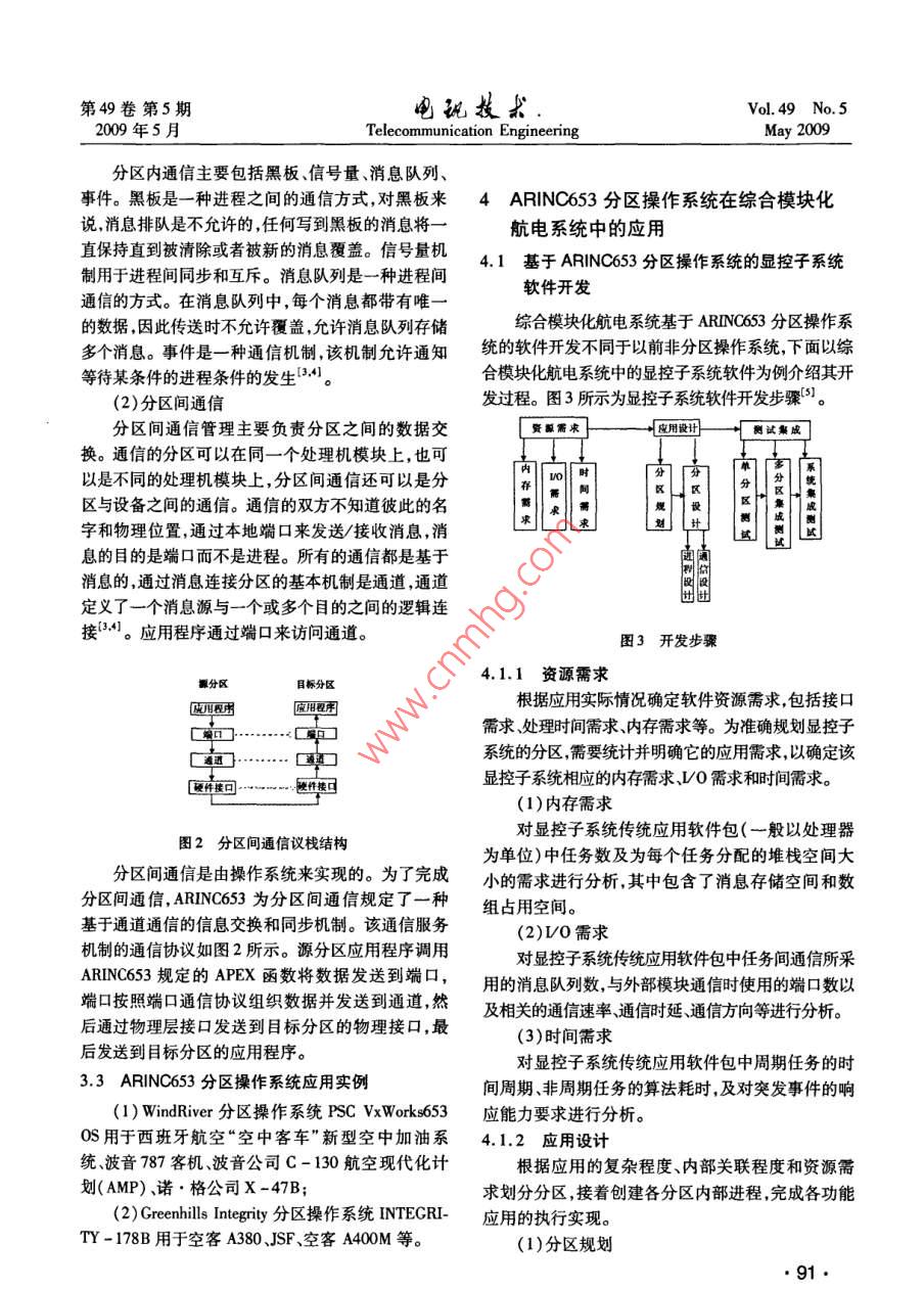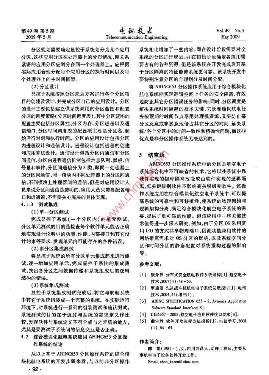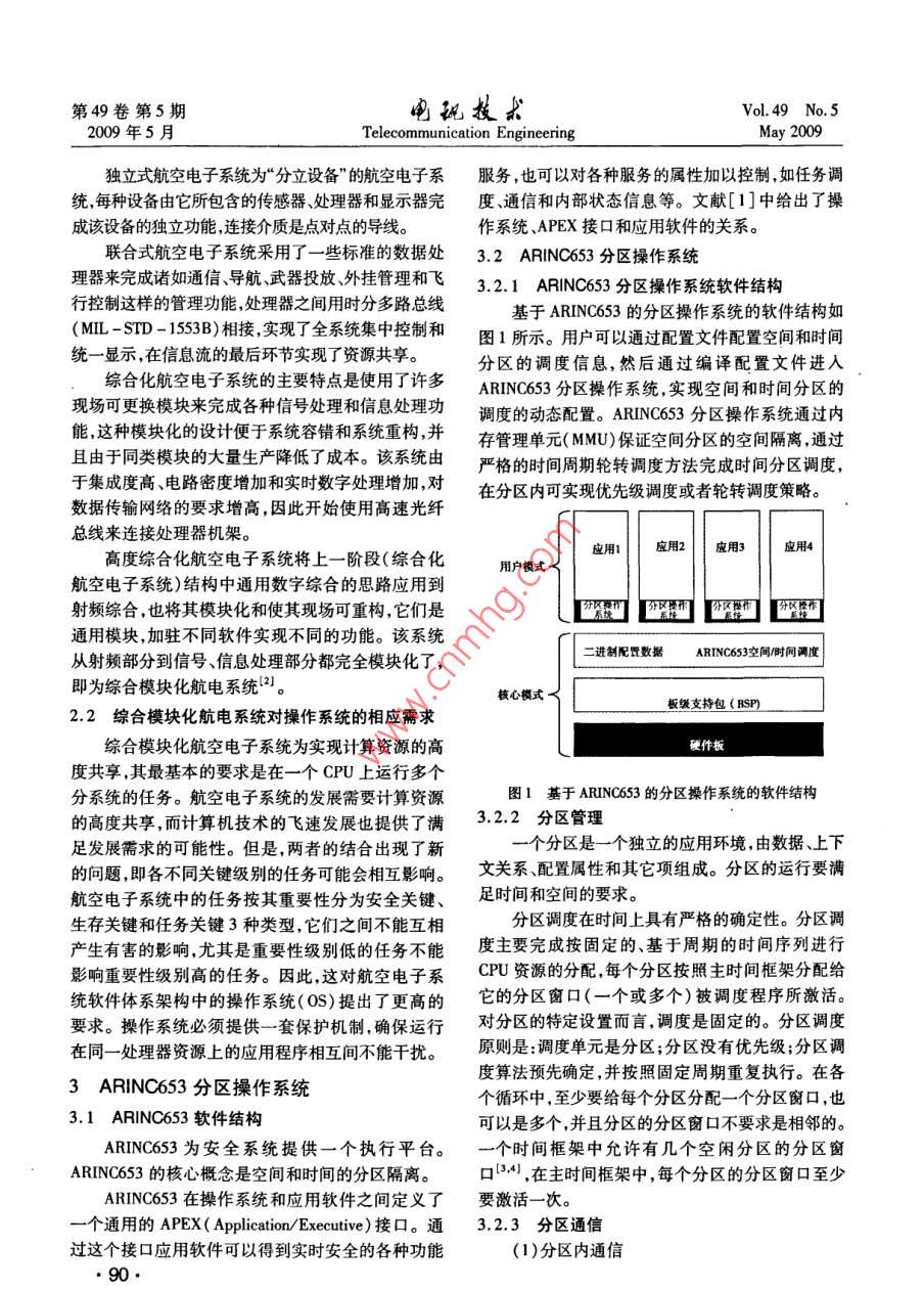 第49卷第5期電玩技款Vol 49 No 52009年5月Telecommunication EngineeringMay 2009文章編號:1001-893X(20)05-0089-04ARINC653分區(qū)操作系統(tǒng)在綜合模塊化航空電子系統(tǒng)中的應(yīng)用陳娟(中國西南電子技術(shù)研究所,成都610036)摘要:航空電子系統(tǒng)的綜合模塊化發(fā)展對軟件系統(tǒng)提出了更高的要求。介紹了基于 ARINC653軟件規(guī)范的分區(qū)操作系統(tǒng)的原理、綜合模塊化航電系統(tǒng)的特點和需求,以該系統(tǒng)中顯控子系統(tǒng)軟件的設(shè)計為例,說明了 ARINC653分區(qū)操作系統(tǒng)在綜合模塊化航電系統(tǒng)中的應(yīng)用價值關(guān)鍵詞:綜合模塊化航電系統(tǒng); ARINC653分區(qū)操作系統(tǒng);顯控子系統(tǒng);開發(fā)步驟中圖分類號:TP316;V241文獻標識碼:Adoi:10.3969/jisa.100-893x.2009.05.22Application of ARINC653 Partition Operation System inIntegrated Modular Avionics( IMA)SystemCHEN JuanSouthwest China Institute of Electronic Technology, Chengdu 610036, China)Abstract: The avionics systems development of integrated modular puts a higher requirement to the softsystem. This paper introduces the theory of the partition operation system based on ARINC653 softwarespecification and the characteristic and requirement of the integrated modular avionics( IMA) system. Ittakes the software design of display control subsystem as example to show the practical value of ARINc653partition operation system in IMA systemKey words: integrated modular avionics( IMA)system; ARINC653 partition operation system; display con-trol subsystem; development process可重用性、高可靠性以及高安全性得到了充分的保1引言證,滿足了IMA系統(tǒng)要求本文在介紹綜合模塊化航電系統(tǒng)的特點和需求隨著微電子技術(shù)計算機技術(shù)、航空技術(shù)的迅猛以及基于 ArINc653軟件規(guī)范的分區(qū)操作系統(tǒng)的原發(fā)展新一代航空電子系統(tǒng)正向開放式、綜合化、模塊理的基礎(chǔ)上,以該系統(tǒng)中顯控子系統(tǒng)的設(shè)計為例,說化的方向發(fā)展,已邁入綜合模塊化航空電子系統(tǒng)(In明了ARNC653分區(qū)操作系統(tǒng)在綜合模塊化航電系tegrated Modular Avionics,IMA)階段。作為航電系統(tǒng)統(tǒng)中的應(yīng)用的重要部分,軟件系統(tǒng)的開放性、可維護性、可重用性、高可靠性和高安全性是實現(xiàn)IMA的必要條件。2綜合模塊化航空電子系統(tǒng)Arinc53是針對航電系統(tǒng)數(shù)據(jù)綜合化要求提2.1航空電子系統(tǒng)體系結(jié)構(gòu)的發(fā)展出來的應(yīng)用程序接口規(guī)范。該規(guī)范定義了標準的航空電子體系結(jié)構(gòu)從20世紀60年代演變到今API和系統(tǒng)服務(wù),即APEX層,把應(yīng)用程序和操作系天,期間的幾個關(guān)鍵結(jié)構(gòu)包括獨立式航空電子系統(tǒng)、統(tǒng)隔離。還要求通過時間分區(qū)、空間分區(qū)以保證不聯(lián)合式航空電子系統(tǒng)綜合化航空電子系統(tǒng),以及高同應(yīng)用的隔離,因此,該規(guī)范使得軟件的可移植性、度綜合化航空電子系統(tǒng)。收稿日期:2009-03-09;修回日期:2009-05-0789第49卷第5期玩技求200年5月Telecommunication EngineeringMay 2009獨立式航空電子系統(tǒng)為“分立設(shè)備”的航空電子系服務(wù),也可以對各種服務(wù)的屬性加以控制,如任務(wù)調(diào)每種設(shè)備由它所包含的傳感器、處理器和顯示器完度、通信和內(nèi)部狀態(tài)信息等。文獻[1]中給出了操成該設(shè)備的獨立功能,連接介質(zhì)是點對點的導(dǎo)線。作系統(tǒng)、APEX接口和應(yīng)用軟件的關(guān)系。聯(lián)合式航空電子系統(tǒng)采用了一些標準的數(shù)據(jù)處3.2AR|NC653分區(qū)操作系統(tǒng)理器來完成諸如通信導(dǎo)航武器投放、外掛管理和飛3.2.1ARNC653分區(qū)操作系統(tǒng)軟件結(jié)構(gòu)行控制這樣的管理功能,處理器之間用時分多路總線基于 ARINC653的分區(qū)操作系統(tǒng)的軟件結(jié)構(gòu)如(ML-SD-1538)相接實現(xiàn)了全系統(tǒng)集中控制和圖1所示。用戶可以通過配置文件配置空間和時間統(tǒng)一顯示,在信息流的最后環(huán)節(jié)實現(xiàn)了資源共享。分區(qū)的調(diào)度信息,然后通過編譯配置文件進入綜合化航空電子系統(tǒng)的主要特點是使用了許多 ARINC53分區(qū)操作系統(tǒng),實現(xiàn)空間和時間分區(qū)的現(xiàn)場可更換模塊來完成各種信號處理和信息處理功調(diào)度的動態(tài)配置。ARNC653分區(qū)操作系統(tǒng)通過內(nèi)能這種模塊化的設(shè)計便于系統(tǒng)容錯和系統(tǒng)重構(gòu),并存管理單元(MMU)保證空間分區(qū)的空間隔離通過且由于同類模塊的大量生產(chǎn)降低了成本。該系統(tǒng)由嚴格的時間周期輪轉(zhuǎn)調(diào)度方法完成時間分區(qū)調(diào)度于集成度高、電降密度增加和實時數(shù)字處理增加,對在分區(qū)內(nèi)可實現(xiàn)優(yōu)先級調(diào)度或者輪轉(zhuǎn)調(diào)度策略。數(shù)據(jù)傳輸網(wǎng)絡(luò)的要求增高,因此開始使用高速光纖總線來連接處理器機架。應(yīng)用2應(yīng)用高度綜合化航空電子系統(tǒng)將上一階段(綜合化用戶模式航空電子系統(tǒng))結(jié)構(gòu)中通用數(shù)字綜合的思路應(yīng)用到射頻綜合,也將其模塊化和使其現(xiàn)場可重構(gòu),它們是[【暫【通用模塊,加駐不同軟件實現(xiàn)不同的功能。該系統(tǒng)從射頻部分到信號、信息處理部分都完全模