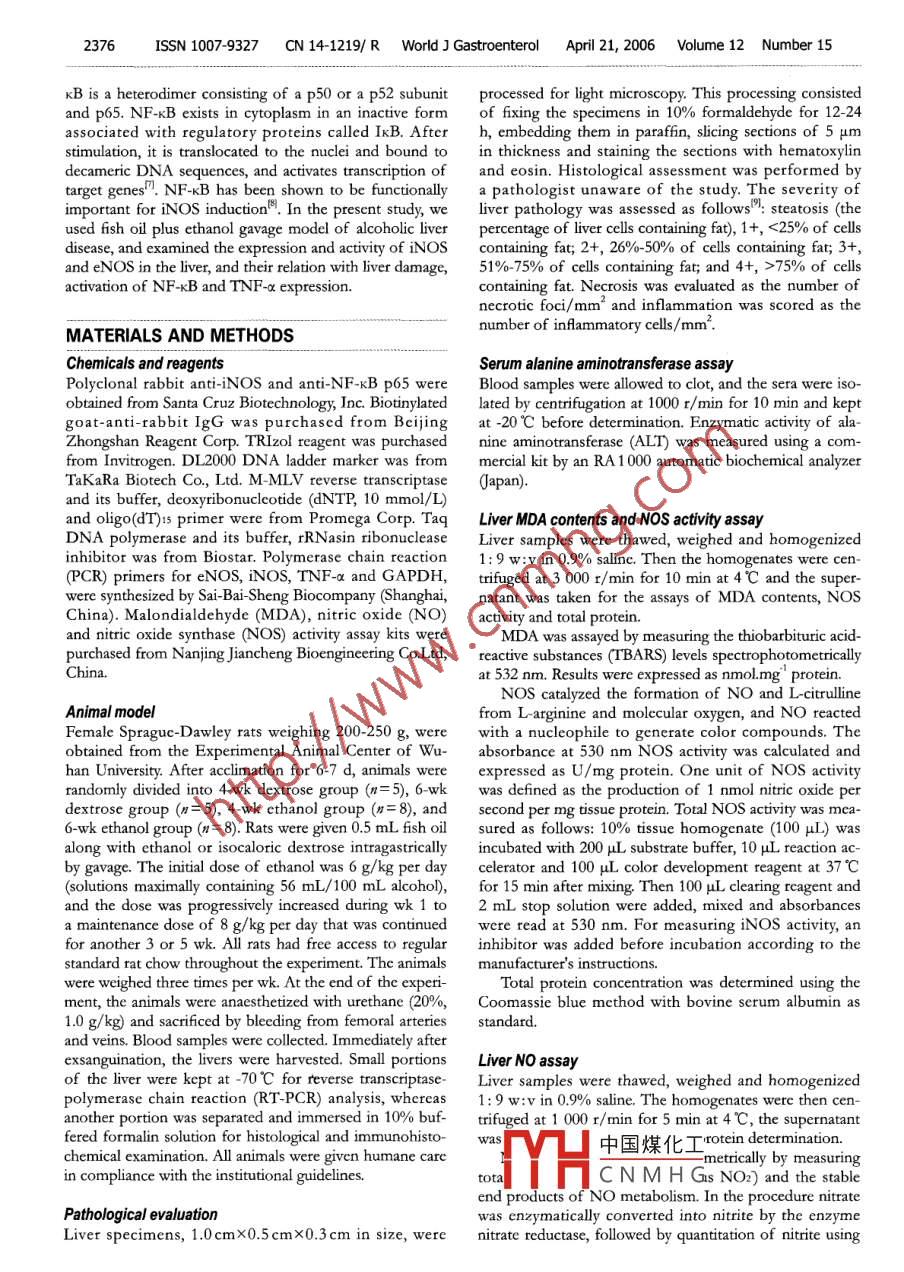 PO Box 2345, Beijing 100023, ChinaI Gastroenterol 2006 April 21; 12(15): 2375-238wig@wjgnet.come2006 The wJG Press. All rights reservedBASIC RESEARCHExpression and activity of inducible nitric oxide synthaseand endothelial nitric oxide synthase correlate with ethanol-induced liver injuryGuang-Jin Yuan, Xiao-Rong Zhou, Zuo-Jiong Gong, Pin Zhang, Xiao-Mei Sun, Shi-Hua ZhengGuang-Jin Yuan, Xiao-Rong Zhou, Zuo-Jiong Gong, Pin expression eNOs activity is reduced, but its mRNA exZhang, Xiao-Mei Sun, Shi-Hua Zheng, Department of pression is not affectedInfectious Diseases, Renmin Hospital of Wuhan University,Wuhan 430060, Hubei Province, China@2006 The WJG Press. All rights reserved.Correspondence to: Dr. Zuo-Jiong Gong, Department ofInfectious Diseases, Renmin Hospital of Wuhan University, Key words: Alcoholic liver disease; Inducible nitric ox-Wuhan430060,HubeiProvinceChinazjgong(@163.comTelephone:+86-27-88041919-8385ax:+86-27-8042292ide synthase; Endothelial nitric oxide synthase; NuclearReceived: 2005-09-1Accepted: 2005-10-26factor-KBYuan G], Zhou XR, Gong Z, Zhang P, Sun XM, Zheng SH.Expression and activity of inducible nitric oxide synthaseAbstractand endothelial nitric oxide synthase correlate with ethanol-induced liver injury. World J Gastroenterol 2006: 12(15AIM: To study the expression and activity of inducible 2375-2381nitric oxide synthase(iNOS) and endothelial nitric oxidesynthase(enos)inratswithethanol-inducedliverinjuryhttp://www.wjgnet.com/1007-9327/12/2375.aspand their relation with liver damage activation of nuclearfactor-kB(NF-KB)and tumor necrosis factor-a(TNF-aexpression in the liver.INTRODUCTIONMETHODS: Female Sprague-Dawley rats were givenfish oil(0.5 mL)along with ethanol or isocaloric dextrose Nitric oxide (NO)has been recognized as an importantdaily via gastrogavage for 4 or 6 wk. Liver injury was mediator of physiological and pathophysiologicalassessed using serum alanine aminotransferase(ALT) processes. It is produced by at least two isoforms ofctivity and pathological analysis. Liver malondialdehyde nitric oxide synthase (NOS)in the liver, such as eNOSwere determined. NF-KB p65, iNOS, eNOS and TNF-a constitutive isoform and plays an important roleneMDA), nitric oxide contents, iNOS and eNOS activity and INOS, eNOS is a Ca"-and calmodulin-dependdprotein or mRNA expression in the liver were detected vasorelaxation, whereas iNOS is not a constitutive enzymeby immunohistochemistry or reverse transcriptase-poly- and its expression may be induced by stimuli such asmerase chain reaction(RT-PCR)lipopolysaccharide or proin flammatory cytokinesRESULTS: Chronic ethanol gavage for 4 wk causeThe role of NO in alcohol-induced liver injury stillremains controversial. Nanji et aP reported that argininesteatosis, inflammation and necrosis in the liver, and a substrate for NO, can significantly attenuate ethanolelevated serum ALT activity. Prolonged ethanol ad- induced liver injury. Treatment with N-nitro-L-arginineministration (6 wk) enhanced the liver damage. These methyl ester(L-NAME), a nonselective NOS inhibitor,responses were accompanied with increased lipid peroxidation, NO contents, iNOS activity and reduced eNos enhances alcohol-induced liver injury in the Tsukamoto-ctivity. NF-KB p65, iNOs and TNF-a protein or mRNAFrench enteral rat modelA. However, iNoS knockout miceexpression were markedly induced after chronic etha- or wild-type mice treated with N-(3-aminomethyl) benzylnol gavage, whereas eNOS mRNA expression remained acetamidine(1400W), a highly selective iNOS inhibitorunchanged. The enhanced iNOS activity and expression are protected against liver damage caused by alcohol slwere positively correlated with the liver damage, espe-Uzun et alo showed that L-NAME might produce acially the necro-inflammation, activation of NF-KB, andethanelinduced liver damageTNF-a mRNA expression中國(guó)煤化工 quitous transcriptionfactoCNMHle in regulation ofCONCLUSION: iNOS expression and activity are in inflomposed of homo-duced in the liver after chronic ethanol exposure in rats, and hetero-dimers of five members of the rel family,which are correlated with the liver damage, especially including NF-KB1(p50), NF-KB2(P52),Rel A (p65), Relthe necroinflammation, activation of NF-kB and TNF-a B, and Rel c. the most prevalent activated form of Nf-www.wjgnet.comISSN 1007-9327 CN 14-1219/R World J Gastroenterol April 21, 2006 Volume 12 Number 15B is a heterodimer consisting of a p50 or a p52 subunit processed for light microscopy. This processing consistedand p65. NF-KB exists in cytoplasm in an inactive form of fixing the specimens in 10% formaldehyde for 12-24associated with regulatory proteins called IxB. After h, embedding them in paraffin, slicing sections of 5 umstimulation, it is translocated to the nuclei and bound to in thickness and staining the sections with hematoxylindecameric DNA sequences, and activates transcription of and eosin. Histological assessment was performed bytarget genes". NF-KB has been shown to be functionally a pathologist unaware of the study. The severity ofimportant for iNOS induction. In the present study, we liver pathology was assessed as follows": steatosis(thedisease, and examined the expression and activity of inos percentage of liver cells containing fat), 1+, <25% of cellsused fish oil plus ethanol gavage model of alcoholic liverontaining fat; 2+, 26%0-50% of cells containing far; 3+,and eNOS in the liver, and their relation with liver damage, 51%0-75% of cells containing fat; and 4+, >75% of cellsactivation of NF-KB and TNF-a expression.containing fat. Necrosis was evaluated as the number ofnecrotic foci/ mm and inflammation was scored as theMATERIALS AND METHODSnumber of in fammatory cells/ mmChemicals and reagentsSerum alanine aminotransferase assPolyclonal rabbit anti-iNOS and anti-NF-KB p65 were Blood samples were allowed to clot, and the sera were iso-obtained from Santa Cruz Biotechnology, Inc. Biotinylated lated by centrifugation at 1000 r/