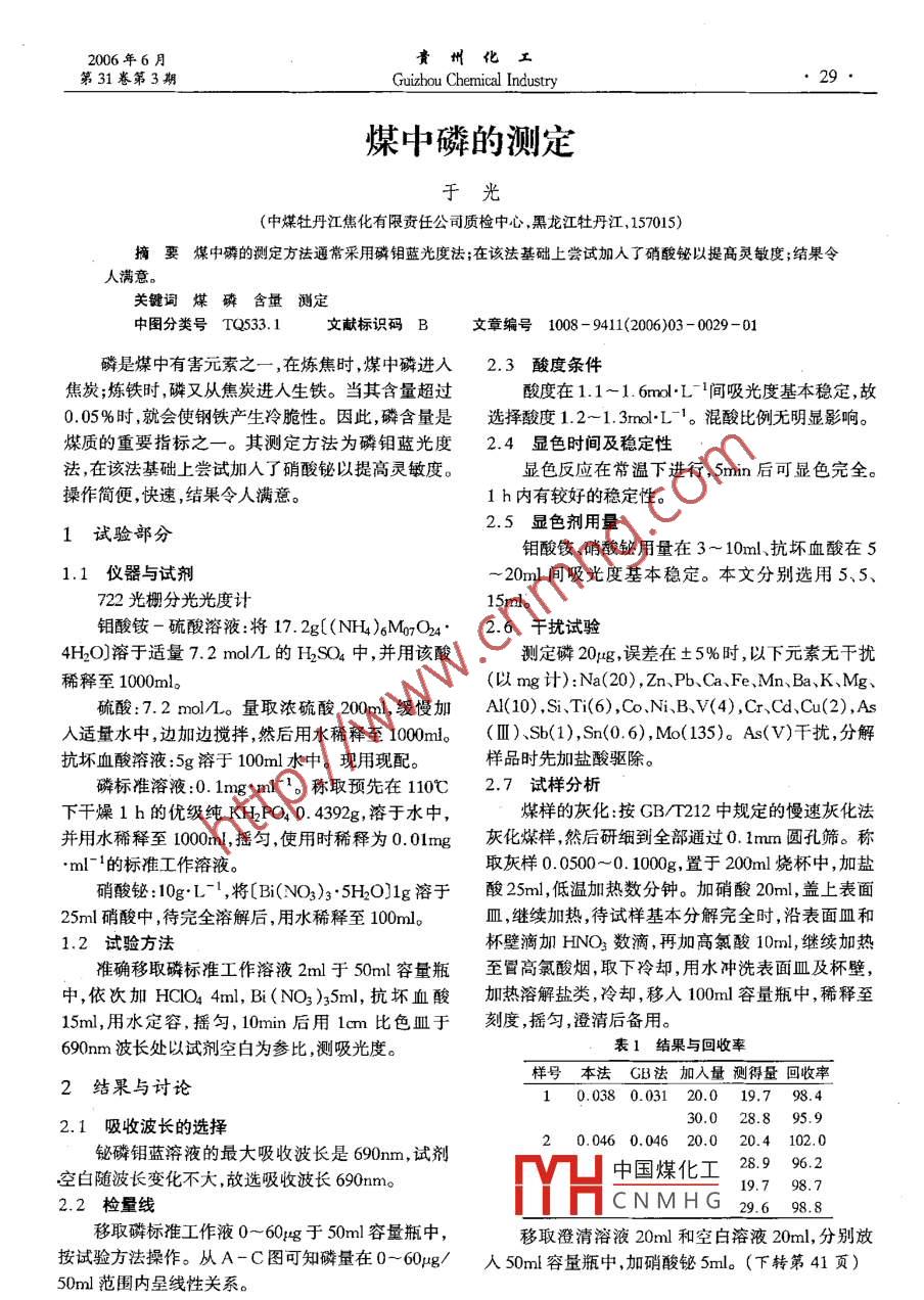 2006年6 月州化工第31卷第3期Guizhou Chemical Industry煤中磷的測定于光(中煤牡丹江焦化有限責(zé)任公司質(zhì)檢中心,黑龍江牡丹江,157015)摘要煤中磷的測定方法通常采用磷鉬藍(lán)光度法;在該法基礎(chǔ)上嘗試加入了硝酸鉍以提高靈敏度;結(jié)果令人滿意。關(guān)鍵詞煤磷含量測定中圖分類號TQ533. 1文獻(xiàn)標(biāo)識碼B文章編號1008-9411(2006)03 - 0029-01磷是煤中有害元素之- -,在煉焦時,煤中磷進(jìn)入2.3酸度 條件焦炭;煉鐵時,磷又從焦炭進(jìn)人生鐵。當(dāng)其含量超過酸度在1.1~ 1.6mol.L-1間吸光度基本穩(wěn)定,故0.05%時,就會使鋼鐵產(chǎn)生冷脆性。因此,磷含量是選擇酸度1.2~1. 3mol.L- 1?;焖岜壤裏o明顯影響。煤質(zhì)的重要指標(biāo)之一。其測定方法為磷鉬藍(lán)光度2.4顯色時間及穩(wěn)定性法,在該法基礎(chǔ)上嘗試加入了硝酸鉍以提高靈敏度。顯色反應(yīng)在常溫下進(jìn)行,5min后可顯色完全。操作簡便,快速,結(jié)果令人滿意。1 h內(nèi)有較好的穩(wěn)定性。2.5顯色劑用量1試驗部分鉬酸銨、硝酸鉍用量在3~10ml、抗壞血酸在51.1儀器 與試劑~ 20ml間吸光度基本穩(wěn)定。本文分別選用5、5、722光柵分光光度計15ml。鉬酸銨-硫酸溶液:將17. 2g[(NH4)6M7O24.2.6干 擾試驗4H2O]溶于適量7.2 mol/L的H2SO4中,并用該酸測定磷20g,誤差在土5%時,以下元素?zé)o干擾稀釋至1000ml。(以mg計):Na(20) ,Zn、Pb、Ca、Fe、Mn、Ba.K、Mg、硫酸:7.2mol/L。量取濃硫酸200ml,緩慢加Al(10) , Si、Ti(6) ,Co、Ni、B、V(4) ,Gr、Cd、Cu(2),As入適量水中,邊加邊攪拌,然后用水稀釋至1000ml。(I )、Sb(1),Sn(O.6),Mo(135)。As(V)干擾, 分解抗壞血酸溶液:5g溶于100ml水中。現(xiàn)用現(xiàn)配。樣品時先加鹽酸驅(qū)除。磷標(biāo)準(zhǔn)溶液:0.1mg. ml~'。稱取預(yù)先在110C2.7試樣分析下干燥1 h的優(yōu)級純KHPO4 0. 4392g,溶于水中,煤樣的灰化:按GB/T212中規(guī)定的慢速灰化法并用水稀釋至1000ml,搖勻,使用時稀釋為0.01mg灰化煤樣,然后研細(xì)到全部通過0.1mm圓孔篩。稱'ml-1的標(biāo)準(zhǔn)工作溶液。取灰樣0.0500~0. 1000g,置于200ml燒杯中,加鹽硝酸鉍:10g:L-1 ,將[Bi(NO3)3.5H2O]1g溶于酸25ml,低溫加熱數(shù)分鐘。加硝酸20ml, 蓋上表面25ml硝酸中,待完全溶解后,用水稀釋至100ml。皿,繼續(xù)加熱,待試樣基本分解完全時,沿表面皿和1.2試驗方法杯壁滴加HNO3數(shù)滴,再加高氣酸10ml,繼續(xù)加熱準(zhǔn)確移取磷標(biāo)準(zhǔn)工作溶液2ml于50ml容量瓶至冒高氯酸煙,取下冷卻,用水沖洗表面皿及杯壁,中,依次加HCIO44ml,Bi(NO3)35ml,抗壞血酸.加熱溶解鹽類,冷卻,移入100ml容量瓶中,稀釋至15ml,用水定容,搖勻, 10min后用1cm比色皿于刻度,搖勻,澄清后備用。690nm波長處以試劑空白為參比,測吸光度。表1結(jié)果與回收率樣號本法GB法加入量測得量回收率2結(jié)果與討論0.038 0.031 20.0 19.7 98.430.0 28.8 95.92.1吸 收波長的選擇2 0.046 0.046 20.0 20.4 102.0鉍磷鋁藍(lán)溶液的最大吸收波長是690nm,試劑中國煤化工28.9 96.2空白隨波長變化不大,故選吸收波長690nm。19.7 98. 72.2檢量線MHCNMHG 29.6 98.8移取磷標(biāo)準(zhǔn)工作液0~ 60pg于50ml容量瓶中,移取澄清溶液20ml和空白溶液20ml,分別放按試驗方法操作。從A-C圖可知磷量在0~60ug/人 50ml容量瓶中,加硝酸鉍5mlo (下轉(zhuǎn)第41頁)50ml范圍內(nèi)呈線性關(guān)系。2006 年6月白澤雙:煤化工發(fā)展淺見第31卷第3期41●參考文獻(xiàn)(收稿日期2006-03-17)1劉方斌. 煤化工:開啟石油替代之門.中國化工報,2005年作者簡介5月25日(8)白澤雙, 1987年畢業(yè)于貴州工學(xué)院化工系,化工工藝高2劉穎隆.聚乙烯醇維綸工業(yè)數(shù)據(jù)手冊.重慶:川儀印刷公級工程師,現(xiàn)任貴州水晶化工股份有限公司副總經(jīng)理。曾在司,1998,82 ~84行業(yè)科技期刊上發(fā)表多篇論文。Views on the Development of Coal Chemical IndustryBai Zheshuang(Guizhou Crystal Organic Chemical Group Co. ,Ltd. ,Qingzhen, Guizhou 551402)Abstract: Through the analysis of resource situation,some suggestions such as conditions, fields , approachesand proposal for the development of caol chemical industry were given.Key words:Chemical processing of coal; coal; techique; resource(上接第29頁)以下同試驗方法。由測得吸光度在準(zhǔn)出版社,2004檢量線上計算磷的濃度,用下式計算出煤中磷的含邵令婀主編.分析化學(xué).北京:高等教育出版社,1989量。3楊金和,陳文敏,段去龍.煤炭化驗手冊.北京:煤炭出版社,2004,391Pad = ml/20mvX Aad(收稿日期2006-02-22)本法加回收率為95. 9% ~ 102. 0% ,相對標(biāo)準(zhǔn)偏差為1.2% ~3.7%。于光,女,1971 年生, 1992年畢業(yè)于牡丹江大學(xué)化學(xué)分析專業(yè),2005年畢業(yè)于北京外國語學(xué)院英語專業(yè),1993年1中華 人民共和國國家標(biāo)準(zhǔn)GBT216 - 2003.北京:中國標(biāo)至今就職于牡丹江市煤氣公司,現(xiàn)任職技術(shù)質(zhì)量管理中心主任,工程師。Determination of Phosphorus Content in Coal by SpectrophotometryYu Guang(Product Quality Inspection Center ,Sino - coal Maodanjiang Coking Co. ,Ltd. ,Maodanjiang Heilngjiang 157000)Abstract: The author discussed the improvement on the determination of phosphorus contents by addition ofbismuth nitrate in ammonium molybdophosphate to improve the sensibilty , the results was satisfied.Key words: Phosphorus;coal; content; determination(上接第32頁)究。楊再波(1976- ),男,碩士;從事天然產(chǎn)物及煙草化學(xué)研Application of the Principal Factor Method Analysis the Flue - curedTobacco of Chemical Co