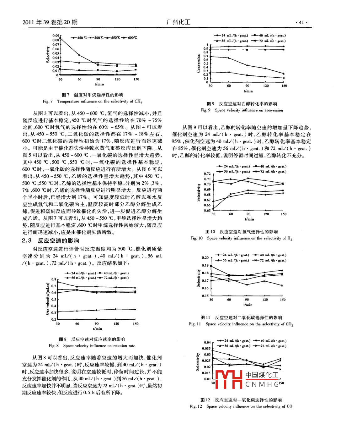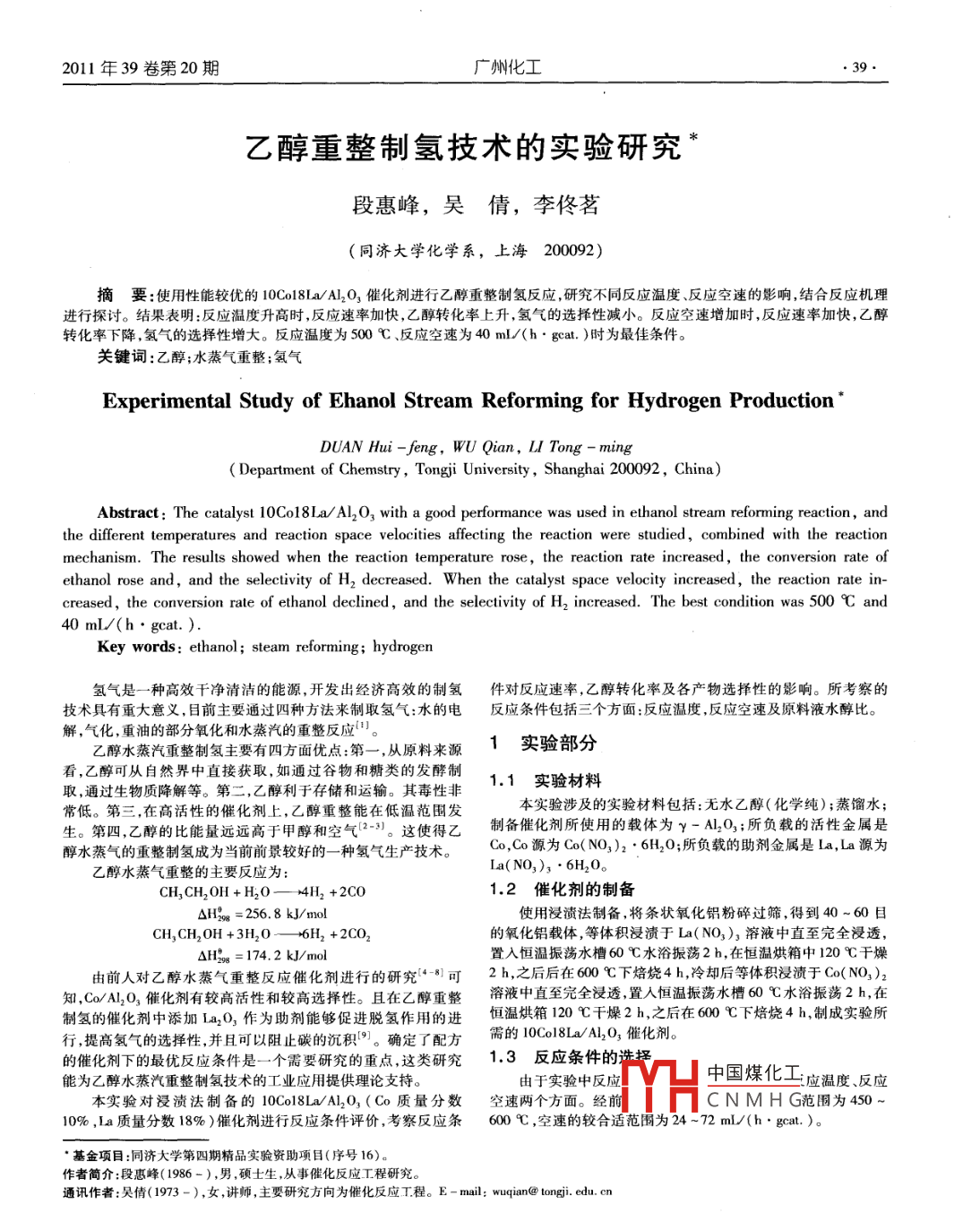 2011年39卷第20期廣州化工乙醇重整制氫技術(shù)的實驗研究段惠峰,吳倩,李佟茗(同濟大學(xué)化學(xué)系,上海200092)摘要:使用性能較優(yōu)的10Col8La/A2O3催化劑進行乙醇重整制氫反應(yīng),研究不同反應(yīng)溫度、反應(yīng)空速的影響,結(jié)合反應(yīng)機理進行探討。結(jié)果表明:反應(yīng)溫度升高時,反應(yīng)速率加快,乙醇轉(zhuǎn)化率上升,氫氣的選擇性減小。反應(yīng)空速增加時,反應(yīng)速率加快,乙醇轉(zhuǎn)化率下降,氫氣的選擇性增大。反應(yīng)溫度為500℃、反應(yīng)空速為40mL/(h·gat.)時為最佳條件。關(guān)鍵詞:乙醇;水蒸氣重整;氫氣Experimental Study of Ehanol Stream Reforming for Hydrogen ProductionDUAN Hui-feng, wU Qian, LI Tong-mingDepartment of Chemstry, Tongji University, Shanghai 200092, China)Abstract: The catalyst 10Col8La/Al,O, with a good performance was used in ethanol stream reforming reaction, andthe different temperatures and reaction space velocities affecting the reaction were studied, combined with the reactionmechanism. The results showed when the reaction temperature rose, the reaction rate increased, the conversion rate ofethanol rose and, and the selectivity of H2 decreased. When the catalyst space velocity increased, the reaction rate inreased, the conversion rate of ethanol declined, and the selectivity of H increased. The best condition was 500C and40m/(h·gcat.)Key words: ethanol; steam reforming; hydrogen氫氣是一種高效干凈清潔的能源,開發(fā)出經(jīng)濟高效的制氫件對反應(yīng)速率,乙醇轉(zhuǎn)化率及各產(chǎn)物選擇性的影響。所考察的技術(shù)具有重大意義,目前主要通過四種方法來制取氫氣:水的電反應(yīng)條件包括三個方面:反應(yīng)溫度,反應(yīng)空速及原料液水醇比解,氣化,重油的部分氧化和水蒸汽的重整反乙醇水蒸汽重整制氫主要有四方面優(yōu)點:第一,從原料來源1實驗部分看,乙醇可從自然界中直接獲取,如通過谷物和糖類的發(fā)酵制取,通過生物質(zhì)降解等。第二,乙醇利于存儲和運輸。其毒性非1.1實驗材料常低。第三,在高活性的催化劑上,乙醇重整能在低溫范圍發(fā)本實驗涉及的實驗材料包括:無水乙醇(化學(xué)純);蒸餾水;生。第四,乙醇的比能量遠遠高于甲醇和空氣2。這使得乙制備催化劑所使用的載體為y-A2O3;所負載的活性金屬是醇水蒸氣的重整制氫成為當(dāng)前前景較好的一種氫氣生產(chǎn)技術(shù)。Co,Co源為Co(NO3)2·6H2O;所負載的助劑金屬是La,La源為乙醇水蒸氣重整的主要反應(yīng)為a(NO3)3·6H2O。CH, CH2 OH +H2O-NH2+2C01.2催化劑的制備△H29=256.8kJ/mol使用浸漬法制備,將條狀氧化鋁粉碎過篩,得到40~60目CH, CH, OH +3H20-+,+2CO2的氣化鋁載體,等體積浸漬于La(NO3)3溶液中直至完全浸透△H29s=174.2kJ/mol置入恒溫振蕩水槽60℃水浴振蕩2h,在恒溫烘箱中120℃干燥由前人對乙醇水蒸氣重整反應(yīng)催化劑進行的研究可2h,之后后在60℃下焙燒4h冷卻后等體積浸漬于co(NO3)2知,Co/A1O3催化劑有較高活性和較高選擇性。且在乙醇重整溶液中直至完全浸透,置入恒溫振蕩水槽60℃水浴振蕩2h,在制氫的催化劑中添加Ia2O3作為助劑能夠促進脫氫作用的進恒溫烘箱120℃干燥2h,之后在60℃下焙燒4h,制成實驗所行提高氫氣的選擇性,并且可以阻止碳的沉積”。確定了配方需的10co8a/Al2O3催化劑。的催化劑下的最優(yōu)反應(yīng)條件是一個需要研究的重點,這類研究1.3反應(yīng)條件的講擇能為乙醇水蒸汽重整制氫技術(shù)的工業(yè)應(yīng)用提供理論支持。由于實驗中反應(yīng)中國煤化工應(yīng)溫度、反應(yīng)本實驗對浸漬法制備的10C8La/Al2O3(Co質(zhì)量分數(shù)空速兩個方面。經(jīng)CNMHG范圍為45010%,Ia質(zhì)量分數(shù)18%)催化劑進行反應(yīng)條件評價,考察反應(yīng)條600℃,空速的較合適范圍為24-72m/(h·gcat.)基金項目:同濟大學(xué)第四期精品實驗資助項目(序號16)。作者簡介:段惠峰(1986-),男,碩士生,從事催化反應(yīng)工程研究。通訊作者:吳倩(1973-),女,講師,主要研究方向為催化反應(yīng)T程。E-mail:wuqian@#edu.cn廣州化工2011年39卷第20期1.4評價方法與手段從圖2可以看出,從450~550℃,乙醇的轉(zhuǎn)化率呈升高趨使用連續(xù)流固定床反應(yīng)器在常壓下進行反應(yīng),原料液為體勢,并在反應(yīng)中基本保持穩(wěn)定550℃時轉(zhuǎn)化率達到0%以上。積比為1:1的乙醇水溶液,催化劑用量為0.15g。使用皂沫流說明高溫有利于正反應(yīng)的進行。600℃時初始轉(zhuǎn)化率接近量計測量尾氣流速。使用上海天美科學(xué)儀器有限公司的色相色90%,但隨著反應(yīng)進行進行,轉(zhuǎn)化率迅速下降,應(yīng)由催化劑失活譜儀進行組分定性和定量檢測,使用色譜柱為Tx-01柱和導(dǎo)致。Porapak-Q柱,Tdx-01柱用于檢測氫氣, Porapak-Q柱用于分450℃一500℃550℃-600℃離檢測二氧化碳、一氧化碳、乙烯、甲烷等氣相產(chǎn)物以及水、乙醇等液相物質(zhì)由于乙醇水蒸氣重整反應(yīng)的產(chǎn)物比較復(fù)雜,我們采用三種卡方式來表示反應(yīng)條件的影響:①乙醇的轉(zhuǎn)化率;②氣相產(chǎn)物中各組分的選擇性;③用產(chǎn)氣速率代表反應(yīng)速率。轉(zhuǎn)化率=總共流經(jīng)反應(yīng)段的乙醇摩爾數(shù)×109%選擇性=產(chǎn)物中單一組分的摩爾數(shù)×10%圖3溫度對氫氣選擇性的影響2實驗結(jié)果和討論Fig 3 Temperature influence on the selectivity of H2450℃500℃+550℃-600℃2.1反應(yīng)產(chǎn)物分布通過