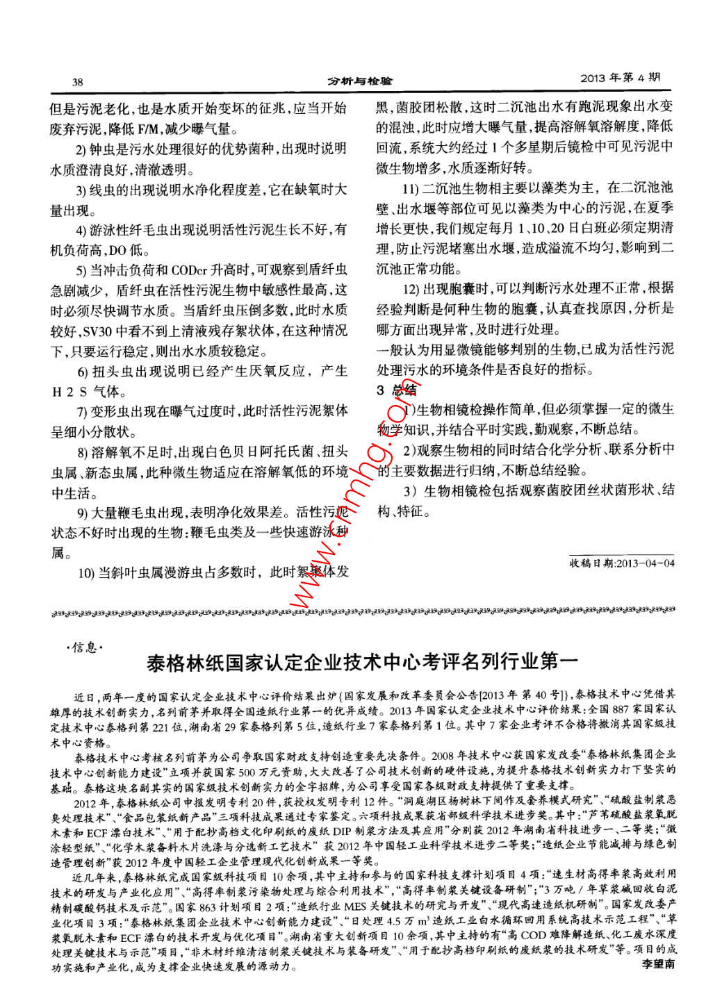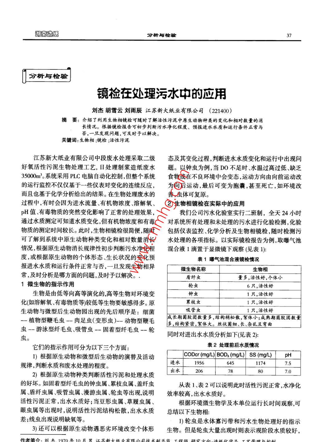 分析與檢驗分析與檢驗鏡檢在處理污水中的應用劉杰胡雪云劉雨辰江蘇新大紙業(yè)有限公司(221400)摘要:介紹了利用生物相鏡檢可隨時了解活性污泥中原生動物種類的變化和相對數(shù)量的消長情況。根據(jù)鏡檢報告可初步判斷污水凈化程度、預報進水水質(zhì)和運行條件正常與否,一旦發(fā)現(xiàn)問題,可及時予以解決。關(guān)鍵詞:生物相;鏡檢;活性污泥江蘇新大紙業(yè)有限公司中段廢水處理采取二級態(tài)及其變化過程,判斷進水水質(zhì)變化和運行中出現(xiàn)問好氧活性污泥生物處理工藝,日處理制漿造紙廢水題。以鐘蟲為例,當DO不足時、水溫過高過低、缺乏3500mn3系統(tǒng)采用PLC電腦自動化控制但整個系統(tǒng)食物或在不良環(huán)境中會變態(tài),運動方向由向前運動改的運行監(jiān)控不僅僅基于一些儀表對變化的連續(xù)反應,為向后運動最后可變?yōu)榘?甚至死亡,如環(huán)境改而且也基于化學分析給出的結(jié)果。在生物處理廢水的善,蟲體可復原。過程中,有時會因為進水流量、有機物濃度、溶解氧、2生物相鏡檢在實際中的應用pH值、有毒物質(zhì)的突然變化影響了正常的處理效果我們公司污水化驗室實行二班制,全天24小時通過水質(zhì)測定可知道水質(zhì)變化,但有機物濃度和有毒對系統(tǒng)所有處理和未處理的污水進行化驗檢測,化驗物質(zhì)的測定時間較長。此時,生物相鏡檢很簡便隨時包括儀表監(jiān)控化學分析及生物相鏡檢隨時檢測污可了解到系統(tǒng)中原生動物種類變化和相對數(shù)量消長水處理的各項指標。以實際鏡檢報告為例,取曝氣池情況根據(jù)原生動物消長規(guī)律性初步判斷污水凈化程混合液1滴置于顯微鏡下觀察(見表1)度,或根據(jù)原生動物的個體形態(tài)生長狀況的變化預表1曝氣池混合液鏡檢情況報進水水質(zhì)和運行條件正常與否,一旦發(fā)現(xiàn)生物相異□微生物名稱生物相常,及時分析是哪方面的問題,及時予以解決盾纖蟲量多,活性好,個體小1微生物的指示作用輪蟲6只,活性好生物是由低等向高等演化的高等生物對環(huán)境變鐘蟲1只,活性好化(如溶解氧、有毒物質(zhì)等)較低等生物要敏感得多。原累枝蟲1只,活性好生動物與微型后生動物園出現(xiàn)的先后順序是:細菌吸管蟲1只,活性好成長期菌膠田數(shù)量多,結(jié)構(gòu)稍松散,絮體小;成熟期茵膠團數(shù)量植物型鞭毛蟲一-肉足蟲(變形蟲)-動物型鞭毛多,結(jié)構(gòu)緊密,絮體大。絲狀菌細、長、雜亂且彎曲蟲-游泳型纖毛蟲、吸管蟲一固著型纖毛蟲—輪蟲。同時對進出水水質(zhì)分析如下見表2它們的指示作用可分為以下三個方面:表2處理前后水質(zhì)情況1)根據(jù)原生動物和微型后生動物的演替及活動進水1956CODcr(mg/L)BOD,(mg/L) ss(mg/) pH規(guī)律,判斷水質(zhì)和廢水處理的程度。6451174出水2)根據(jù)原生動物種類判斷活性污泥和處理水質(zhì)7.0的好壞。如固著型纖毛蟲的鐘蟲屬、累枝蟲屬、蓋纖蟲從表1、表2可以說明此時活性污泥正常,水凈化屬、盾纖蟲屬、吸管蟲屬、漫游蟲屬、輪蟲等出現(xiàn)說明效率較高,出水水質(zhì)好?;钚晕勰嗾?出水水質(zhì)好;當豆形蟲屬、草履蟲屬、根據(jù)環(huán)境微生物學及本單位運行長時間觀察可眼蟲屬等出現(xiàn)時,說明活性污泥結(jié)構(gòu)松散,出水水質(zhì)總結(jié)以下生物相差;線蟲出現(xiàn)說明缺氧等1)輪蟲是水體寡污帶和污水生物處理好的指示3還可以根據(jù)原生動物遇惡劣環(huán)境改變個體形生物。但是輪蟲大量出現(xiàn)時則表示現(xiàn)階段水質(zhì)較好,分析與檢驗2013年第4期但是污泥老化,也是水質(zhì)開始變壞的征兆,應當開始黑,菌膠團松散,這時二沉池出水有跑泥現(xiàn)象出水變廢棄污泥,降低FM,減少曝氣量。的混濁,此時應增大曝氣量,提高溶解氧溶解度,降低2)鐘蟲是污水處理很好的優(yōu)勢菌種,出現(xiàn)時說明回流系統(tǒng)大約經(jīng)過1個多星期后鏡檢中可見污泥中水質(zhì)澄清良好,清澈透明。微生物增多,水質(zhì)逐漸好轉(zhuǎn)。3)線蟲的出現(xiàn)說明水凈化程度差它在缺氧時大11)二沉池生物相主要以藻類為主,在二沉池池量出現(xiàn)。壁、出水堰等部位可見以藻類為中心的污泥,在夏季4)游泳性纖毛蟲出現(xiàn)說明活性污泥生長不好,有增長更快我們規(guī)定每月1、10、20日白班必須定期清機負荷高,DO低。理,防止污泥堵塞出水堰,造成溢流不均勻影響到二5)當沖擊負荷和CODr升高時,可觀察到盾纖蟲沉池正常功能。急劇減少,盾纖蟲在活性污泥生物中敏感性最高,這12)出現(xiàn)胞囊時,可以判斷污水處理不正常,根據(jù)時必須盡快調(diào)節(jié)水質(zhì)。當盾纖蟲壓倒多數(shù)此時水質(zhì)經(jīng)驗判斷是何種生物的胞囊認真查找原因,分析是較好,V30中看不到上清液殘存絮狀體,在這種情況哪方面出現(xiàn)異常,及時進行處理。下,只要運行穩(wěn)定,則出水水質(zhì)較穩(wěn)定。一般認為用顯微鏡能夠判別的生物已成為活性污泥H425扭頭蟲出現(xiàn)說明已經(jīng)產(chǎn)生厭氧反應,產(chǎn)生處理污水的環(huán)境條件是否良好的指標。S氣體3總結(jié)7)變形蟲出現(xiàn)在曝氣過度時,此時活性污泥絮體1)生物相鏡檢操作簡單,但必須掌握一定的微生呈細小分散狀物學知識,并結(jié)合平時實踐勤觀察,不斷總結(jié)。8)溶