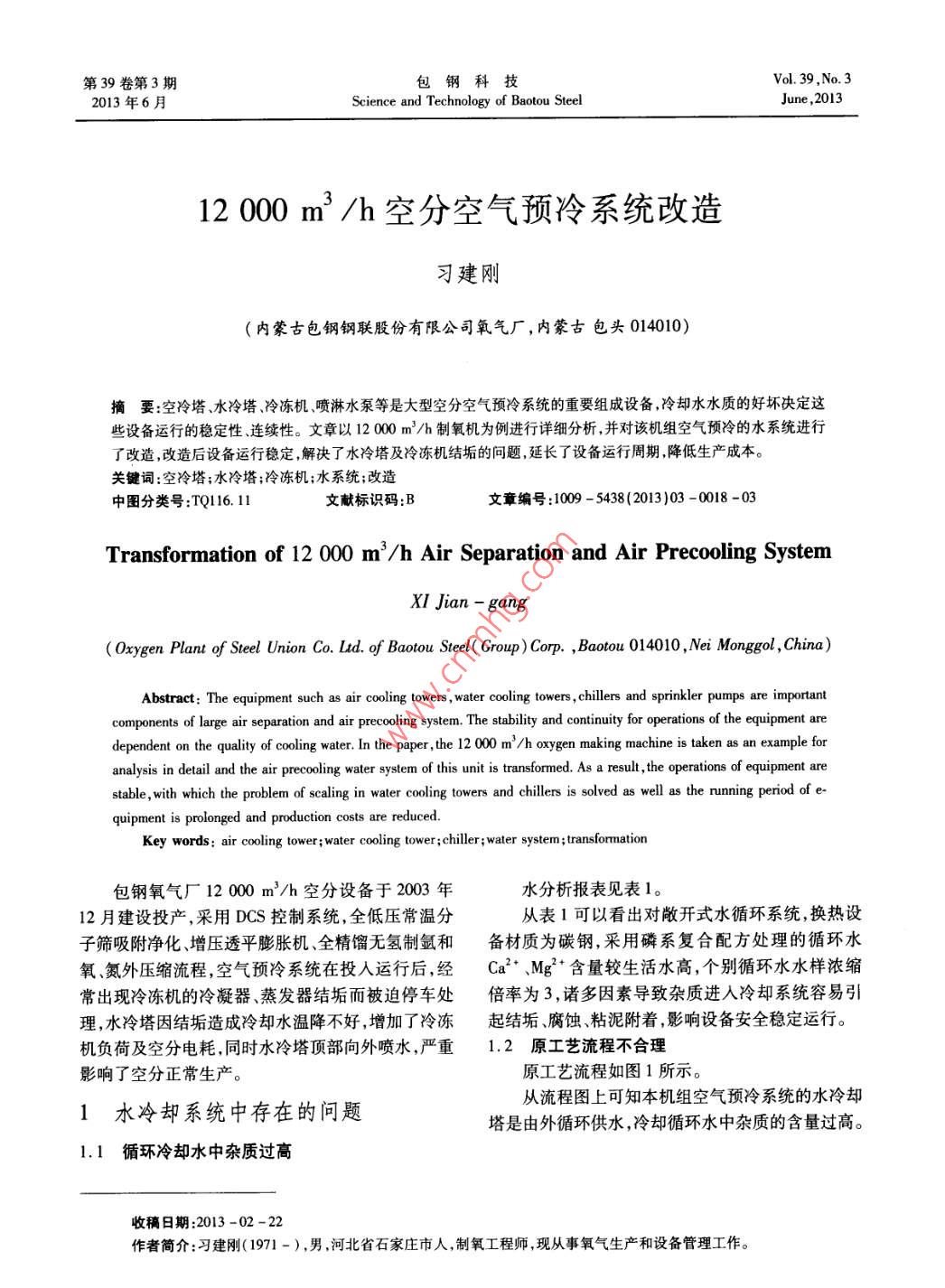 第39卷第3期包鋼科技Vol 39. No. 32013年6月Science and Technology of Baotou SteelJune, 201312000m3/h空分空氣預(yù)冷系統(tǒng)改造習(xí)建剛(內(nèi)蒙古包鋼鋼聯(lián)股份有限公司氧氣廠,內(nèi)蒙古包頭014010)摘要:空冷塔、水冷塔、冷凍機噴淋水泵等是大型空分空氣預(yù)冷系統(tǒng)的重要組成設(shè)備,冷卻水水質(zhì)的好壞決定這些設(shè)備運行的穩(wěn)定性連續(xù)性。文章以120m3/h制氧機為例進行詳細分析,并對該機組空氣預(yù)冷的水系統(tǒng)進行了改造,改造后設(shè)備運行穩(wěn)定解決了水冷塔及冷凍機結(jié)垢的問題,延長了設(shè)備運行周期降低生產(chǎn)成本。關(guān)鍵詞;空冷塔;水冷塔;冷凍機;水系統(tǒng);改造中圖分類號:TQ116.11文獻標識碼:文章編號:1009-5438(2013)03-0018-0Transformation of 12 000 m/h Air Separation and Air Precooling Systemtan-gangOxygen Plant of Steel Union Co. Ltd. of Baotou Steel( Group )Corp . Baotou 014010, Nei Monggol, China)Abstract: The equipment such as air cooling towers, water cooling towers, chillers and sprinkler pumps are importantcomponents of large air separation and air precooling system. The stability and continuity for operations of the equipment ardependent on the quality of cooling water. In the paper, the 12 000 m/h oxygen making machine is taken as an example foranalysis in detail and the air precooling water system of this unit is transformed. As a result, the operations of equipment arestable, with which the problem of scaling in water cooling towers and chillers is solved as well as the running period ofquipment is prolonged and production costs are reducedKey woooling tower; water cooling tower; chiller; water system; transformation包鋼氧氣廠12000m3/h空分設(shè)備于2003年水分析報表見表112月建設(shè)投產(chǎn),采用DCS控制系統(tǒng),全低壓常溫分從表1可以看出對敞開式水循環(huán)系統(tǒng),換熱設(shè)子篩吸附凈化、增壓透平膨脹機、全精餾無氫制氬和備材質(zhì)為碳鋼,采用磷系復(fù)合配方處理的循環(huán)水氧氮外壓縮流程,空氣預(yù)冷系統(tǒng)在投入運行后,經(jīng)Ca2、Mg2含量較生活水高,個別循環(huán)水水樣濃縮常出現(xiàn)冷凍機的冷凝器、蒸發(fā)器結(jié)垢而被迫停車處倍率為3,諸多因素導(dǎo)致雜質(zhì)進入冷卻系統(tǒng)容易引理,水冷塔因結(jié)垢造成冷卻水溫降不好,增加了冷凍起結(jié)垢、腐蝕、粘泥附著,影響設(shè)備安全穩(wěn)定運行。機負荷及空分電耗,同時水冷塔頂部向外噴水,嚴重1.2原工藝流程不合理影響了空分正常生產(chǎn)。原工藝流程如圖1所示。1水冷卻系統(tǒng)中存在的問題從流程圖上可知本機組空氣預(yù)冷系統(tǒng)的水冷卻塔是由外循環(huán)供水,冷卻循環(huán)水中雜質(zhì)的含量過高1.1循環(huán)冷卻水中雜質(zhì)過高收稿日期:2013作者簡介:習(xí)建剛(1971-),男,河北省石家莊市人,制氧工程師現(xiàn)從事氧氣生產(chǎn)和設(shè)備管理工作。第3期12000m3/h空分空氣預(yù)冷系統(tǒng)改造19表1水分析報表堿度硬度水類pH值濁度電導(dǎo)/(mg·L-1)/(mg·L-)/(m·L1)/(mg·L-1)/(mg·L-1)/(mg·L-)/(mg·L-1)/(mg·L-)(ws·cm-1)生活水4.553.43.891436.87.40l88113.4703860.1l1.5251.2210.28.10.428l.2173.1108.17.820.32.51000288.5263.20.3274.1276.6160.7115.90.32.2770v冒sIo911160s101圖1改造前水冷卻系統(tǒng)流程冷卻循環(huán)水在水冷塔和冷凍機是個降溫過程,且也會造成分子篩過早失效不得不提前更換分子篩而溫度與水中雜質(zhì)的最大飽和含量有關(guān),水在降溫從而增加成本在達到15℃時制氧機組就得立即停的過程中水中雜質(zhì)不停地析出,長時間會造成水冷車清掃冷凍機的蒸發(fā)器、冷凝器,從而影響公司生產(chǎn)卻塔冷凍機結(jié)垢,因而造成了制氧機組被迫停2)因低溫循環(huán)水走冷凍機蒸發(fā)器管外側(cè),結(jié)車檢修。垢后只能采取酸洗處理,而蒸發(fā)器底部水垢淤泥無2造成的危害法靠酸洗或水沖洗清除,酸洗后效果不好。冷凍機在運轉(zhuǎn)了4年左右后,其蒸發(fā)器底部水垢和淤泥大2.1冷凍機結(jié)垢的危害量沉積無法清除,已不能正常使用,因此,2007年又(1)冷凍機蒸發(fā)器冷凝器,在運行半年就結(jié)垢新購進一臺冷凍機來保生產(chǎn)嚴重。冷凍水溫度無法降到工藝要求范圍。而冷卻2.2水冷塔結(jié)垢造成的危害水要求控制在7~10℃,當水溫升高到10℃以上時,水冷塔在運行時就會有結(jié)垢生成,結(jié)垢到一定使出空冷塔空氣溫度過高空氣帶水增多造成分子篩程度時水出水冷塔溫度增高2,造成冷凍機負荷負荷增大,長時間運行可造成分子篩不能完全清除水增大,電耗增加,而且還會造成水冷塔頂部噴水,使分、二氧化碳、乙炔等碳氫化合物使水分、二氧化碳、水塔耗水增加。到冬天水冷塔周圍全部結(jié)上冰給乙炔等碳氫化合物在板式中凍結(jié)造成事故擴大。而生產(chǎn)維護帶來困難、同時存在安全隱患。水冷塔結(jié)包鋼科技第39卷垢不嚴重時可酸洗處理,嚴重時需要更換全部填料流程。水冷塔的上水是水塔的循環(huán)水,由循環(huán)水泵環(huán),每更換一次填料環(huán)需要費用50萬元。2007年加壓后提供的,循環(huán)水的水質(zhì)從表1的水分析表可因結(jié)垢嚴重全部將填料環(huán)更換。看出水中鈣、鎂氯等離子及雜質(zhì)過多。因鈣鎂氯3原因分析等離子及雜質(zhì)的飽和含量和溫度有關(guān),水中鈣、鎂、氯等離子及雜質(zhì)隨著循環(huán)水溫度的降低而析