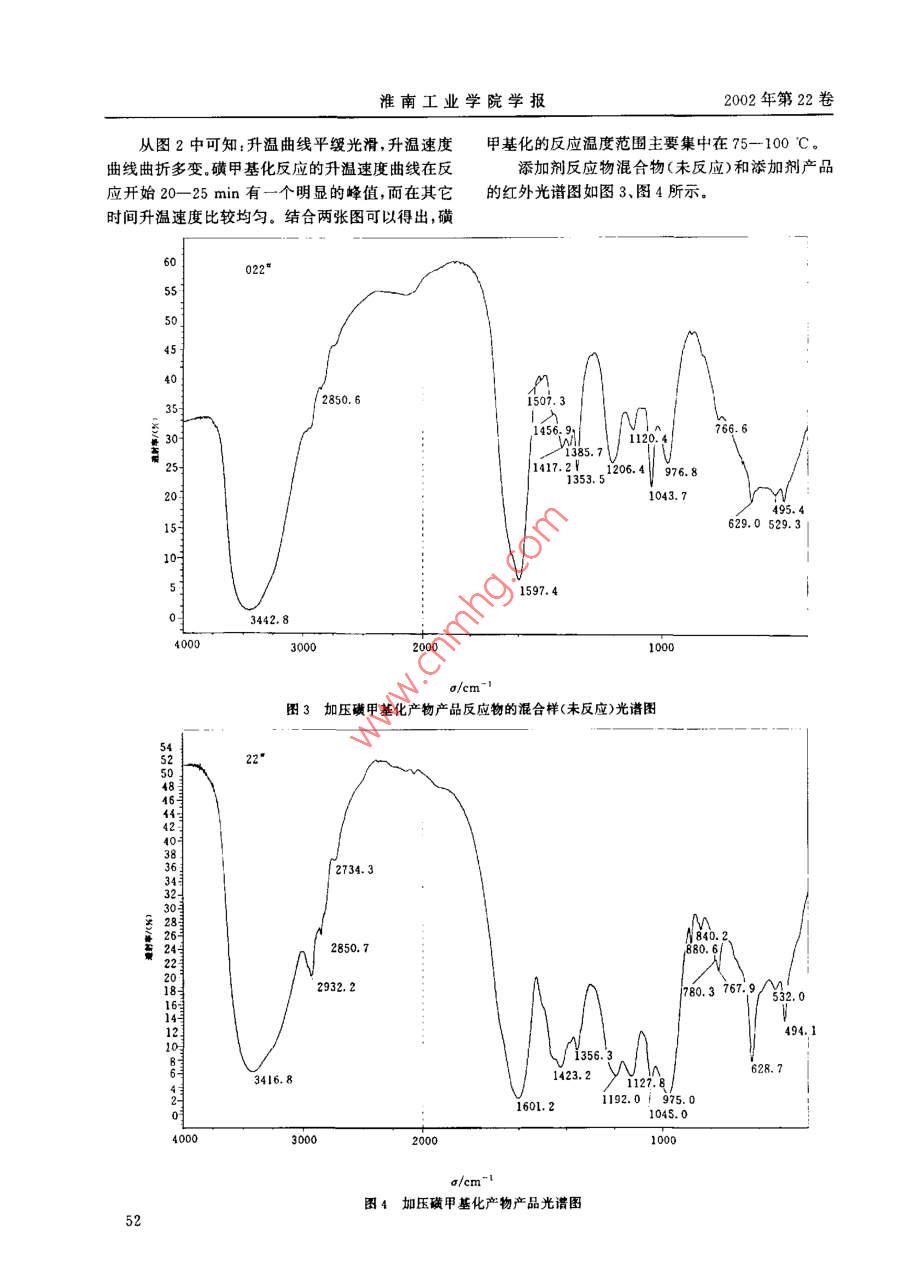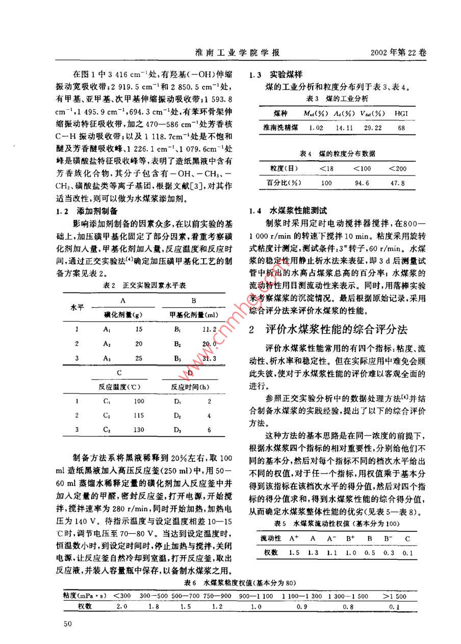 第22卷第2期淮南工業(yè)學(xué)院學(xué)報Vol 22 NO2002年6月JOURNAL. OF HUAINAN INSTITUTE OF TECHNOLOGYJUN.2002造紙黑液制備水煤漿添加劑的研究張宏偉,張保林蔡燕,李寒旭(安徽理工大學(xué)化學(xué)工程系,安徽淮南232001)摘要:通過正交實驗法,對造紙黑液加壓磺甲基化制備水煤漿添加劑進(jìn)行了研究,數(shù)挹分析得出的優(yōu)工藝條件是:100ml黑液(濃度20%),磺化劑15g,甲基化劑20ml,反應(yīng)溫度100C,時間6h,同時提出了一種新的評價水煤漿性能的方法。關(guān)鍵詞:水煤漿;添加劑;造紙黑液中圖分類號:TQ351.9文獻(xiàn)標(biāo)識碼:A文章編號:1671-0932(2002)020049-05水煤漿作為潔凈煤技術(shù)重要分支在我國近兩制取水煤漿的成本,又可為造紙黑液的綜合利用開年有了很大發(fā)展,但由于添加劑價格的原因,水煤辟一條新的途徑。漿的發(fā)展卻不時受到制約1。為此,該技術(shù)的關(guān)鍵已經(jīng)集中在添加劑的來源問題上1實驗原料及方法造紙黑液是我國主要環(huán)境污染之一,其有機污1.1合成原料染負(fù)荷量占全部造紙廢水污染負(fù)荷量的90%以實驗所用黑液為堿法黑液,其基本性質(zhì)及特征上。本文采用加壓磺甲基化法,將黑液中的有效組成如表1和圖1所示。成分經(jīng)適當(dāng)處理后,成為水煤漿添加劑,既可降低表1造紙黑液性質(zhì)參數(shù)表液種類密度(g·m-)pH值固含量(%)腐植酸(%)木質(zhì)素(%)聚糖(%)安徽造紙廠l.942.3623.3680. 3285052919.53416.01593.81黑液紅外譜圖收稿日期:2001-09-24基金項目:安徽省“九五”科技項目(9912005)作者簡介張宏偉(1975-),男,江蘇豐縣人,在讀碩士,專業(yè)方向:潔凈煤技術(shù)淮南工業(yè)學(xué)院學(xué)報02年第22卷在圖1中3416cm-處,有羥基(-OH)伸縮1.3實驗煤樣振動寬吸收帶;2919.5cm和2850.5cm處,煤的工業(yè)分析和粒度分布列于表3、表4。有甲基、亞甲基、次甲基伸編振動吸收帶;1593.8表3煤的工業(yè)分析cm-,1495.9cm-1,694.3cm-1處,有苯環(huán)骨架伸煤種M,〔%)A4(%Va(%)HGI縮振動特征吸收帶,加之470—586cm處芳香核準(zhǔn)南洗精煤1.0214.1129.2268CH振動吸收帶;以及1118.7cm-1處是不飽和醚及芳香醚吸收峰、1226.1cm-'、1079.6cm-1處表4煤的粒度分布數(shù)據(jù)峰是磺酸鹽特征吸收峰等,表明了造紙黑液中含有芳香族化合物,其分子包含有-OH、一CH2粒度(目)100<20CH2、磺酸鹽類等離子基團(tuán),根據(jù)文獻(xiàn)[3],對其作百分比(%)10094.647.8適當(dāng)改性,則可以做為水煤漿添加劑1.2添加劑制備1.4水煤漿性能測試影響添加劑制備的因素眾多,在以前實驗的基制漿時采用定時電動攪拌器攪拌,在800礎(chǔ)上,加壓磺甲基化固定了部分因素,著重考察磺1000r/min的轉(zhuǎn)速下攪拌10min。粘度采用旋轉(zhuǎn)化劑加入量,甲基化劑加入量,反應(yīng)溫度和反應(yīng)時式粘度計測定,測試條件:3“轉(zhuǎn)子,60r/min。水煤間,通過正交實驗法確定加壓磺甲基化工藝的制漿的穩(wěn)定性用靜止析水法來表征,即3d后測量試備方案見表2。管中析出的水高占煤漿總高的百分率;水煤漿的表2正交實驗因素水平表流動特性用目測流動性來表示。同時,用落棒實驗B來考察煤漿的沉淀情況。最后根據(jù)原始記錄,采用水平磺化劑量(g)甲基化劑量(m)綜合評分法來評價水煤漿的性能。11.22評價水煤漿性能的綜合評分法評價水煤漿性能常用的有四個指標(biāo):粘度、流23B31.3動性析水率和穩(wěn)定性。但在實際應(yīng)用中難免會顧D此失彼,使對于水煤漿性能的評價難以客觀全面的反應(yīng)溫度(℃)反應(yīng)時間(h)進(jìn)行。參照正交實驗分析中的數(shù)據(jù)處理方法并結(jié)ccc115DDD合制備水煤漿的實踐經(jīng)驗,提出了以下的綜合評價方法這種方法的基本思路是在同一濃度的前提下,根據(jù)水煤漿四個指標(biāo)的相對重要性,分別給他們不制備方法系將黑液稀釋到20%左右,取100同的基本分,然后對每個指標(biāo)不同的檔次水平給出m造紙黑液加入高壓反應(yīng)釜(250m)中,用50-不同的權(quán)值,對于任一個指標(biāo)用權(quán)值乘于基本分60ml蒸餾水稀釋定量的磺化劑加人反應(yīng)釜中并得到該指標(biāo)在該檔次水平的得分值然后對四個指加入定量的甲醛,密封反應(yīng)釜,打開電源,開始攪標(biāo)的得分值求和得到水煤漿性能的綜合得分值拌,攪拌速率為28r/mn,同時開始加熱,加熱電從而確定水煤漿整體性能的優(yōu)劣(見表5—表8)壓為140V。待指示溫度與設(shè)定溫度相差10-15表5水煤漿流動性權(quán)值(基本分為100C時,調(diào)節(jié)電壓至7080V。當(dāng)達(dá)到設(shè)定溫度時流動性A+AA-B+BB-C恒溫數(shù)小時,到設(shè)定時間時,停止加熱與攪拌,關(guān)閉電源讓反應(yīng)釜自然冷卻到室溫,打開反應(yīng)釜,取出權(quán)數(shù)1.51.31.11.00.50.30.1反應(yīng)液,并裝人容量瓶中保存,以備制水煤漿之用表6水煤漿粘度權(quán)值(基本分為80)粘度(mPa·s)<300300-500500-700750-900900-1001100-13001300-1500>1500權(quán)數(shù)張宏偉,等造紙黑液制備水煤漿添加劑的研究第2期3實驗結(jié)果與討論進(jìn)行的。正交實驗的結(jié)果如表9所示。表7水煤漿沉淀情況權(quán)值(基本分為60)3.I工藝的優(yōu)化分析淀情況無沉淀軟沉淀較硬沉淀硬沉淀工藝優(yōu)化是針對各添加劑產(chǎn)品在用量為權(quán)數(shù)L.2l.00.50.10.7%(漿基)時,制得的濃度為67%的水煤漿性能表8水煤漿析水率權(quán)值(基本分為40)析水率/(%)0-1.01.0-2