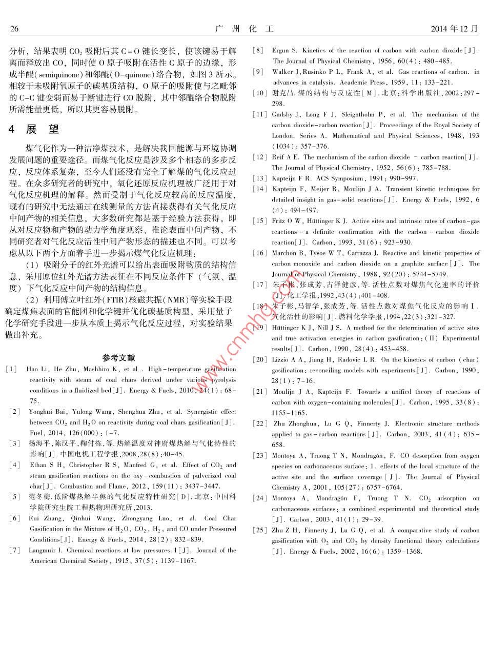 第42卷第23期廣州化工 Vol. 42 No.232014年12月 Guangzhou Chemical IndustryDec.2014煤氣化反應(yīng)機(jī)理研究進(jìn)展許凱,徐齊勝,余岳溪,劉亞明,李德波(廣東電網(wǎng)有限責(zé)任公司電力科學(xué)研究院,廣東廣州510080)摘要:論述了目前國內(nèi)外煤氣化反應(yīng)機(jī)理的研究現(xiàn)狀,對氧化-還原反應(yīng)機(jī)理進(jìn)行了闡述,分析了影響氣化反應(yīng)速率的因素。列舉了通過實(shí)驗(yàn)方法對氣化反應(yīng)活性中間產(chǎn)物進(jìn)行的研究,指出了碳氧絡(luò)合物的可能存在形態(tài)。進(jìn)而通過量子化學(xué)理論對氣化反應(yīng)機(jī)理研究做出了補(bǔ)充,闡述了氣化反應(yīng)進(jìn)程。最后對煤氣化反應(yīng)機(jī)理的進(jìn)一步研究方向進(jìn)行了展望。關(guān)鍵詞:煤氣化;反應(yīng)機(jī)理;氧化-還原反應(yīng);量子化學(xué)中圖分類號:TQ54文獻(xiàn)標(biāo)志碼:A文章編號:1001-9677(2014023-0024-03 Research Progress on the Reaction Mechanism of Coal Gasification XU Kai, XU Qi-sheng, YU Yue-xi, LIU Ya-ming, LI De-bo (Electric Power Research Institute of Guangdong Power Grid Corporation, Guangdong Guangzhou 510080, China) Abstract: The research status of reaction mechanism of coal gasification was summarized and the redox reaction mechanism was elaborated. The structure of active oxidation state intermediates was discussed in detail through experimental research. By means of quantum chemistry theory research, the process of gasification was pointed out, as a supplemental instruction for the experimental research Finally, the further research work on coal gasification mechanism needing to be done was put forward Key words: coal gasification; reaction mechanism; redox reaction; quantum chemistry煤氣化是以煤基為能源的化工系統(tǒng)中最重要的核心技術(shù)和形成的復(fù)合物。過渡態(tài)理論認(rèn)為該碳氧活性絡(luò)合物原子間的距關(guān)鍵設(shè)備。目前,研究者們已對C-CO2C-H2O和C-O2-離比正?;瘜W(xué)鍵大活化絡(luò)合物的鍵比正常鍵弱,但其仍能像H2O等氣化反應(yīng)做了大量的研究工作。人們發(fā)現(xiàn)煤氣化反應(yīng)活正常分子一樣進(jìn)行平動、轉(zhuǎn)動和有限制地振動性受多種因素的影響,主要包括煤種的煤階,顯微組分的含眾多學(xué)者的研究表明,CO對于上述氣化反應(yīng)有明顯的抑量,制焦條件和氣化條件,如溫度、壓力和升溫速率等因素。制作用。 Gadsby等認(rèn)CO會吸附在碳表面從而抑制了反應(yīng)而在眾多的影響因素中,如何找到合適的反應(yīng)條件工藝水平(3)的進(jìn)行(式(4))并占據(jù)CO2的吸附位阻礙其吸附Reif以達(dá)到人們生產(chǎn)所需目的,對氣化反應(yīng)機(jī)理的揭示就顯得尤為則 Gadsby等的實(shí)驗(yàn)數(shù)據(jù)重新進(jìn)行分析并得出CO的抑制作用重要,這不僅可以為煤氣化反應(yīng)動力學(xué)的研究及氣化模型的建體現(xiàn)在抑制了可逆反應(yīng)(1)的發(fā)生,原因在于CO吸附的速率立提供參考,也是進(jìn)一步探究更為復(fù)雜的煤催化氣化反應(yīng)機(jī)理遠(yuǎn)遠(yuǎn)小于反應(yīng)(1)的逆反應(yīng)速率。的先決條件。(4)1氧化還原反應(yīng)機(jī)理 Ergun等則指出隨著溫度的增高,反應(yīng)(1)的化學(xué)反應(yīng)平衡常數(shù)有明顯的增高,反應(yīng)速率加快,這就意味著碳表面吸附對于煤等含碳原料的氣化反應(yīng)過程, Langmuir在191年的活性位增多。而由于氣化反應(yīng)和煤焦表面的活性位含量成正首先提出了一種氧化-還原反應(yīng)機(jī)理,這一理論也被眾多的研比,所以溫度增高對氣化反應(yīng)促進(jìn)作用是顯而易見的。C-H2O氣化過程中碳表面首先會吸附氧形成碳氧復(fù)合物C(0),2氣化反應(yīng)中間產(chǎn)物的實(shí)驗(yàn)研究然后C(O)分解為和CO和C,該分解反應(yīng)速率決定了氣化反從上面的研究中可以看出,活性位C和碳氧復(fù)合物C(O)應(yīng)的快慢:k在氣化過程中起著重要的作用,但是氣化劑的化學(xué)吸附過程是(1)個多步反應(yīng),這一現(xiàn)象發(fā)生在各向異性的含碳原料表面使得該 ki C,+()+H,(2)過程表現(xiàn)的更為復(fù)雜。顯然,在該過程中仍然有三個方面的問 k2題值得思考: C(O)+CO(3)(1)在氣化過程中,這些活性位的數(shù)量是否是不變的;反應(yīng)式中C表示碳表面的空位,一個潛在的可以吸附含氧氣化氣的反應(yīng)汗性位C(0)剛反應(yīng)過程由化學(xué)附氧后(2)這些活性位的種類只有一種還是有多種;1)形成的碳氧怎物C(0)日有一種還是有名種第42卷第23期許凱,等:煤氣化反應(yīng)機(jī)理研究進(jìn)展25然而,受制于氣化反應(yīng)較高的反應(yīng)溫度,很難通過在線測的脫附過程,碳基質(zhì)選取為含有限苯環(huán)結(jié)構(gòu)的單層石墨結(jié)構(gòu),量直接獲得有關(guān)碳氧復(fù)合物的相關(guān)信息,有關(guān)這些問題的研以頂位上未飽和的C原子為吸附活性位,而周圍其他未飽和的13-14]究,現(xiàn)實(shí)的情況是許多學(xué)者采用暫態(tài)反應(yīng)(K)-或者程序C原子進(jìn)行加氫飽和處理。文章探討了含碳原料可能存在的三升溫脫附(TPD)實(shí)驗(yàn)作為一種行之有效的研究手段對碳氧種不同種類的吸附活性位構(gòu)型(鋸齒形( zigzag)、扶手椅形復(fù)合物性質(zhì)進(jìn)行間接測量。(armchair)、尖端形(tip),其結(jié)構(gòu)如圖2所示)和含有不同數(shù)華東理工大學(xué)的朱子彬等7-18采用暫態(tài)