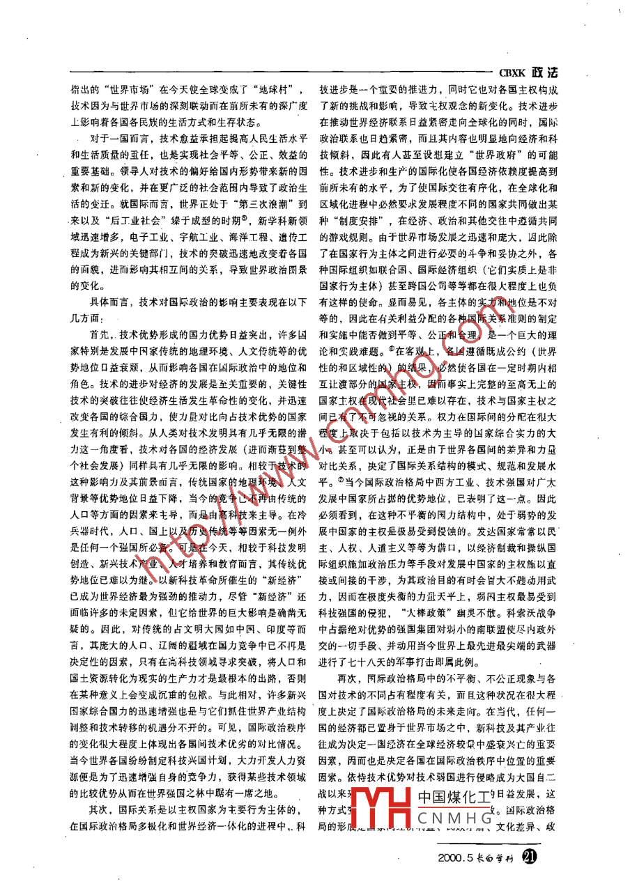 政法CBXK技術(shù)與國際政治段志超(中共天津市委黨??蒲刑?天津300191)要]國際政治的產(chǎn)生和發(fā)展在某種意義上正是由人類技術(shù)進(jìn)步所導(dǎo)致。技術(shù)有特定而鮮明的文化背景,蘊(yùn)涵著豐窗的人文價(jià)值取向,它在全球化過程中已成為主導(dǎo)性因素,它在世界范圈內(nèi)的發(fā)展和變動(dòng)必然引發(fā)國際政治關(guān)系的諸多變化,成為當(dāng)代最引人注目的現(xiàn)象。.[關(guān)鍵詞]技術(shù);全球化;國際政治|中圖分類號(hào)JD5[文獻(xiàn)標(biāo)識(shí)碼]A[文章編號(hào)]1003- 5478(2000)050 - 20- 03國際政治”的發(fā)生和發(fā)展依賴人類征服自然從而駕馭科學(xué) 技術(shù)的發(fā)展而逐漸發(fā)展起來的,二者之間基本上是自身的能力的增強(qiáng),當(dāng)人類處于生產(chǎn)生活水平極為低下- -種正相關(guān)關(guān)系,而且正呈現(xiàn)出日益強(qiáng)勁之勢(shì)。的年代,自身拘圓于自然環(huán)境的相互隔離,是無所謂政狹義的技術(shù)以器材、器械為自己的物質(zhì)基礎(chǔ),以技治交流和溝通的。只有當(dāng)人類在特定的歷史階段形成術(shù)原理 、技術(shù)資料等等為非物質(zhì)表現(xiàn)形態(tài)。從表面上了以國家形態(tài)為首要標(biāo)志的制度體系和相應(yīng)的文化系看,技術(shù)似乎只是一種為達(dá)到人類特定目的而出現(xiàn)和發(fā)統(tǒng),國際政治的發(fā)生才有可能。但是,民族國家的形成展起 來的輔助乎段或工具體系,在本質(zhì)上它是中性的,并不意味著國際政治的自發(fā)發(fā)生,全球意義上的國際政但現(xiàn)實(shí)情況表明, 這不足以解釋技術(shù)對(duì)現(xiàn)代生活帶來的治則更是一個(gè)漫長的社會(huì)歷史發(fā)展過程。一個(gè)最基本的巨 大沖擊和深刻影響。事實(shí)上,技術(shù)的發(fā)展與整體的文前提是,只有相應(yīng)的技術(shù)發(fā)明克服了地域上的阻隔,才化背景息息相關(guān), 因而深深地帶有特定的文化烙印。技能有各國對(duì)彼此自然地理、人文背景的了解,才能有國術(shù)已成為- 種負(fù)載價(jià)值的具有高度可操作性的手段,技與國之間的經(jīng)濟(jì)、文化和政治交往(這種交往可能是和術(shù) 中性論已被現(xiàn)代生活的現(xiàn)實(shí)情況所否定。技術(shù)價(jià)值論平的,也可能是暴力的)?!盀槭裁词澜鐨v史應(yīng)從 1500表明, 技術(shù)是倫理、政治與文化的集合體,它用自身的年開始? ...回答是,1500年以前, 人類基本上生活特 質(zhì)無時(shí)無刻不蘊(yùn)含和體現(xiàn)若人類的各種物質(zhì)的和精神在彼此隔絕的地區(qū)中。各種族集團(tuán)實(shí)際上以與世隔絕的的深刻意義。 在某種意義上來說,技術(shù)不僅體現(xiàn)了技術(shù)方式散居各地,直到1500年前后,各種族集團(tuán)之間才判斷, 而且也體現(xiàn)了更廣泛的社會(huì)價(jià)值和那些設(shè)計(jì)和使第一次有了直接的交往。...因 此,1500年是人類歷用它的人的各 種利益。正如斯塔迪梅爾所盲: ...脫史上的一個(gè)亞要較折點(diǎn)。..實(shí)際上,嚴(yán)格的全球意義離了它的人類背景, 技術(shù)就不可能得到完整意義上的理上的世界歷史直到開倫布、達(dá).伽馬和麥哲倫進(jìn)行遠(yuǎn)航解。 人類社會(huì)并不是一個(gè)裝暫文化上中性的人造物的包探險(xiǎn)時(shí)才開始。在這以前,只有各民族的相對(duì)平等的歷裹, 那些設(shè)計(jì)、接收和維持技術(shù)的人的價(jià)值與世界觀、史,而沒有一部統(tǒng)-的歷史?!焙且姡湔氖澜鐨v 聰明與恐蠢、傾向與既得利益必將體現(xiàn)在技術(shù)的身史是伴隨著人類掌握了航海的知識(shí)及技術(shù)之后才發(fā)生和上。 ”●正因?yàn)榧夹g(shù)具有倫理、政治與文化價(jià)值的可承發(fā)展的,在此之前的人類歷史總是受限于- -定范圍內(nèi),載性, 故而技術(shù)的影響就不僅表現(xiàn)在器物層面上,而且并未獲得全球性的意義,國際政治同樣也是如此,因也深人精神 文化的底層潛移歌化地形響著人們,促成意此,國際政治的發(fā)生是以科技的突破為原動(dòng)力的??萍甲R(shí)形 態(tài)的演變。因此技術(shù)因素是全方位地滲透入從經(jīng)濟(jì)進(jìn)步對(duì)國際政治的影響具有時(shí)代性,不同的歷史時(shí)期有基 礎(chǔ)到中國煤化工的。隨潛經(jīng)濟(jì)全不同的表現(xiàn)形式,現(xiàn)代意義上的國際政治是伴隨著現(xiàn)代球化的YHC N M H G百四十多年前就?長的學(xué)刊200.5CBXK政法指出的“世界市場(chǎng)”在今天使全球變成了“ 地球村”技進(jìn)步是一個(gè)重嬰的推進(jìn)力,同時(shí)它也對(duì)各國主權(quán)構(gòu)成技術(shù)因?yàn)榕c世界市場(chǎng)的深刻聯(lián)動(dòng)而在前所未有的深廣度了 新的挑戰(zhàn)和影響,導(dǎo)致主權(quán)觀念的新變化。技術(shù)進(jìn)步上影響著各國各民族的生活方式和生存狀態(tài)。在推動(dòng)世界經(jīng)濟(jì)聯(lián)系日益緊密走向全球化的同時(shí),國際對(duì)于一國而言,技術(shù)愈益承擔(dān)起提高人民生活水平政治聯(lián)系也 日趨緊密,而且其內(nèi)容也明顯地向經(jīng)濟(jì)和科和生活質(zhì)量的重任,也是實(shí)現(xiàn)社會(huì)平等、公正、效益的技傾斜, 因此有人甚至設(shè)想建立“ 世界政府”的可能重要基礎(chǔ)。領(lǐng)導(dǎo)人