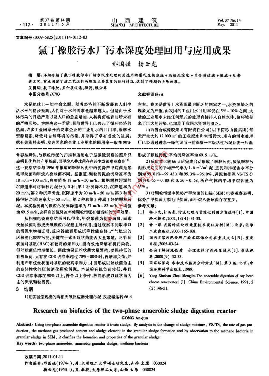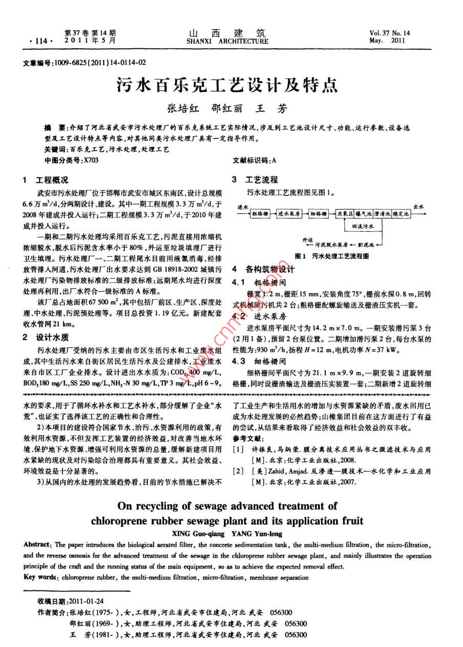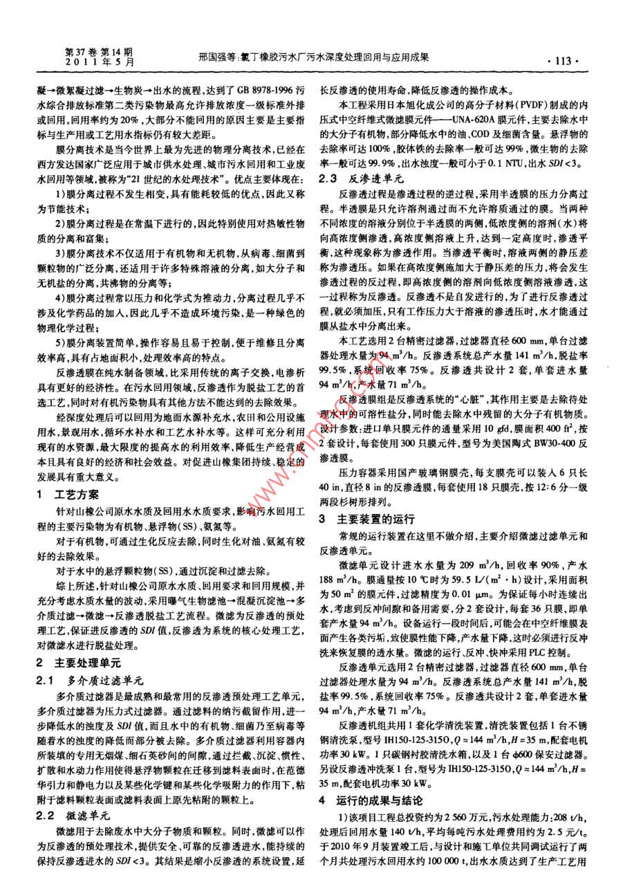第37卷第14Vol, 37 No. 14112·201HANXI ARCHITECTURE文章編號:1009-6825(2011)14-0112-03氯丁橡膠污水廠污水深度處理回用與應(yīng)用成果邢國強楊云龍摘要:詳細介紹了氟丁橡膠污水廠污水度處理回用選用的曝氣生物濾池+混凝沉淀池+多介質(zhì)過濾+微濾+反滲透工藝,重點闌述了該工藝運行原理及主要裝置的運行情況,達到了預(yù)期的去除效果。關(guān)鍵詞:氯丁橡膠,多介質(zhì)過濾,微濾,膜分高中圖分類號:X703文獻標(biāo)識碼:A水是地球上一切生命之源。隨著經(jīng)濟的不斷發(fā)展和人們生左右。我國是世界上水資源最為匱乏的國家之一,水資源缺乏的活水平的穩(wěn)步提高,人們對于水的需求量越來越大。但是由于水現(xiàn)象尤為嚴重而我國的工業(yè)用水回用率僅在5%-10%之間,大體污染的日趨嚴重以及人口的急劇增加,人類將面臨著前所未有量的工業(yè)用水未經(jīng)任何形式的處理直接排入自然水體,給環(huán)境帶的嚴峻形勢。為解決這一矛盾,目前世界上已興起了循環(huán)經(jīng)濟的來了巨大的污染,也加劇了我國水資源的匱乏。熱潮許多工業(yè)國家開始要求企業(yè)的工業(yè)用水的回用率,緩解水山西省合成橡膠集團有限責(zé)任公司(以下簡稱山橡集團)每資源緊張降低對自然環(huán)境的污染,并取得了卓有成效的進展。天產(chǎn)生大約1200m3的工業(yè)廢水和生活污水,現(xiàn)有的污水處理據(jù)有關(guān)資料表明發(fā)達國家的企業(yè)工業(yè)用水的回用率一般在90%廠已經(jīng)通過進水→曝氣調(diào)節(jié)→前混凝→三級活性污泥系統(tǒng)→后混常容易辨認故顆粒污泥的掃描和透射電子顯微鏡觀察的照片只形成了顆粒污泥,平均沉降速率為695m/h表明其優(yōu)勢的產(chǎn)甲烷菌而甲烷八疊球菌存在甚少或很難觀察到“。2)反應(yīng)器運轉(zhuǎn)66d后完成啟動形成了顆粒污泥厭氧顆粒污這一觀察結(jié)果與1996年報道的顆粒污泥中的優(yōu)勢產(chǎn)甲烷蔭是票泥形成期間的平均產(chǎn)氣率為1.6m3/m3泥,進泥和排泥含水率分毛甲烷菌和甲烷八疊球菌不同。據(jù)報道,顆粒污泥的沉降速率為別為9901%-9.43%和953%~960%,進泥和排泥ⅤSTS分18m/h-100m/h,典型值在18mh-50m/h。根據(jù)顆粒污泥的別為0.65-0.80和056-0.58,所產(chǎn)氣體的平均甲烷含量為沉降速率可將顆粒污泥分為3種:第1種沉降不好,沉降速率為65%。20m/h;第2種沉降滿意沉降速率為20m/h~50m/h;第3種沉3)對顆粒污泥中優(yōu)勢產(chǎn)甲烷菌的掃描(SEM)電鏡觀察表明,降很好,沉降速率大于50mh。第2種和第3種屬于好的顆粒污優(yōu)勢產(chǎn)甲烷菌為鬃毛甲烷菌,而甲烷八疊球菌存在甚少。泥。本實驗測得的顆粒污泥沉降速率為57m/h-82m/h,平均值參考文獻為65m/h,這樣高的沉降速率使顆粒污泥有相當(dāng)好的沉降效果。[l]楊小文,杜英豪.污泥處理與賚源化利用方案選擇[門].中國從掃描電鏡觀察結(jié)果可以得出,甲烷鬃菌為優(yōu)勢菌屬,而索給水排水,2002,18(4):31-33氏絲狀菌對形成厭氧顆粒污泥起主導(dǎo)作用,通過觀察不同取樣口[2]甘一萍我國污泥處理處重技術(shù)現(xiàn)狀分析[M].北京:化學(xué)的污泥生物相證明,反應(yīng)器能否形成沉降性能良好、產(chǎn)氣穩(wěn)定的工業(yè)出版社,2003:165168厭氧消化顆粒污泥,關(guān)鍵在于索氏絲狀菌能否大量繁殖。盡管絲[3]國內(nèi)首家污泥處理廠渝水環(huán)保公司在重慶成立[N].重慶狀菌對基質(zhì)(HAC)有較高的親和力,能有效地降解有機污染物日報,2005-03-24.但絲狀菌倍增期很長。因此為保證絲狀菌大量繁殖,要保持低的[4]全面了解污泥性質(zhì)合理選擇污泥處置技術(shù)[門]桑德視有機負荷只有在COD去除率超過70%~80%時,再增加負荷,并界,2000(9):323利用產(chǎn)甲烷絲狀菌對基質(zhì)的較高親和力才能形成以絲狀菌為主[5]國家環(huán)保局,水和廢水監(jiān)測分析方法[M].第3版.北京:中的良好性狀的厭氧消化顆粒污泥。本試驗有機負荷較低,并且國環(huán)境科學(xué)出版社,1989COD去除率都在90%以上,符合以上條件故能形成以絲狀菌為[6] Yang xiushan, Zhou Mengjin. The anaerobic digestion of soy bean主的厭氧顆粒污泥。cheese wastewater[ J ]. China Environmental Science, 1991, 23結(jié)語(2):46511)用實驗室規(guī)模的兩相厭氧反應(yīng)器處理污泥,反應(yīng)器運轉(zhuǎn)66dResearch on biofacies of the two-phase anaerobic sludge digestion reactorGONG An-junAbstract Using two-phase anaerobic digestion reactor it treats sludge. By analysis to the change of sludge moisture, VS/TS, the rate of gasduction, the methane gas produced content and sludge element in the granular sludge formation and by observation to the methane bactgranular sludge in SEM, it clarifies the formation and properties of the granular sludgeKey words: two-phase anaerobic, anaerobic granular sludge, methane bacteria收稿日期:2011-01-11作者簡介:那國強(19714-),男,太原理工大學(xué)碩士研究生,山西太原030044楊云龍(1953-),男,教授,太原理工大學(xué),山西太原0300431第1邢國強等氯丁橡膠污水廠污水深度處理回用與應(yīng)用成果113凝→微絮凝過濾→生物炭→出水的流程,達到了GB8978-199污長反滲透的使用壽命降低反滲透的操作成本。水綜合排放標(biāo)準第二類污染物最高允許排放濃度一級標(biāo)準外排本工程采用日本旭化成公司的高分子材料(PVDF)制成的內(nèi)或回用,回用率約為20%,大部分不能回用的原因主要是主要指壓式中空纖維式微
