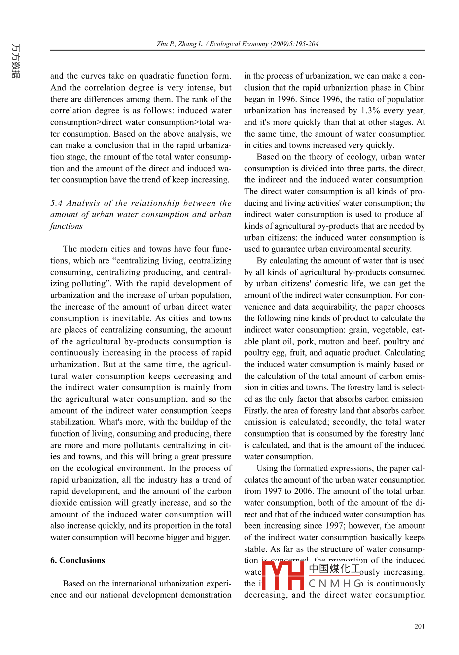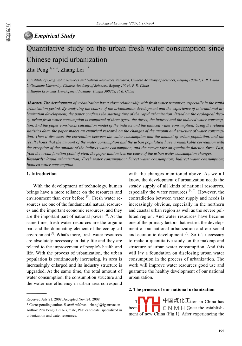 Ecological Economy (2009)5:195-204器) Empirical StudyQuantitative study on the urban fresh water consumption sinceChinese rapid urbanizationZhu Peng 1,2.3, Zhang Lei 1”1. Instiute of Geographic Sciences and Natural Resources Research, Chinese Academy of Sciences, Beijing 100101, P. R. China2. Graduate Universit, Chinese Academy of Sciences, Bejing 10049, P. R. China3. Tianjin Economic Development Institute, Tianjin 300202, P. R. ChinaAbstract: The development of urbanization has a close relationship with fresh water resources, especially in the rapidurbaniation period. By analyzing the course of the urbanization development and the experience of international ur-banizcation development, the paper confirms the starting time of the rapid urbanization. Based on the ecological theo-ry, urban fresh water consumption is composed of three types: the direct, the indirect cand the induced water consump-tion. And the paper constructs calculation model of the indireet and the induced water consumption. Using the relatedstatistics data, the paper makes an empirical research on the changes of the camount and structure of water consump-tion. Then it discusses the correlation between the water consumption and the amount of urban population, and theresult shows that the amount of the water consumption and the urban population have a remarkable correlation withthe exception of the amount of the indirect water consumption, and the curves take on quadratic function form. Last,from the urban fiunction point of view, the paper anatomizes the cause of the urban water consumption changes.Keywords: Rapid urbanization; Fresh water consumption; Direct water consumption; Indirect water consumption;Induced water consumption1. Introductionwith the changes mentioned above. As we allknow, the development of urbanization needs theWith the development of technology, human steady supply of all kinds of national resources,beings have a more reliance on the resources and especially the water resources 45. However, theenvironment than ever before . Fresh water re- contradiction between water supply and needs issources are one of the fundamental natural resourc-increasingly obvious, especially in the northernes and the important economic resources, and they and coastal urban region as well as the severe pol-are the important part of national powerl21. At the luted region. And water resources have becomesame time, fresh water resources are the organicone of the primary factors that restrict the develop-part and the dominating element of the ecological ment of our national urbanization and our socialenvironment. What's more, fresh water resourcesand economic development 0. So it's necessaryare absolutely necessary in daily life and they are to make a quantitative study on the makeup andrelated to the improvement of people's health andstructure of urban water consumption. And thislife. With the process of urbanization, the urban will lay a foundation on disclosing urban waterpopulation is continuously increasing, its area isconsumption in the process of urbanization. Theincreasingly enlarged and its industry structure is work will improve water resources good use andupgraded. At the same time, the total amount of guarantee the healthy development of our nationalwater consumption, the consumption structure andurbanization.the water use efficiency in urban area correspond2. The process of our national urbanizationReceived July 21, 2008; Acepted Nov. 24, 2008中國(guó)煤化工tion in China has* Corresponding author. E-mail addres: zhangl@igsnrr.ac.cnbeen:YHC N M H Gnce the establish-Author: Zhu Peng (1981- ), male, PhD candidate, specialized inurbanization and water resources.ment of new China (Fig.1). After experiencing theZhu P, Zhang L. / Ecological Economy (2009)5:195-204temporary healthy development period, the devel-in 1996. Since 1996, the total amount of wateropment has been basically suspended from 1960consumption in China hasn't changed a lot, butto 1980, and the urban population increased verythe amount of urban water consumption has in-slowly. Most scholars take a view that our countrycreased very quickly. From urban domestic waterbelongs to under-urbanization compared with oth-consumption, we can see clearly that the amounter developing countries 7, and they explained theof water consumption has continuously increasedphenomenon based on the household registration(Fig.2). From 1997 to 2006, the amount of urbansystem and the urban-rural dual system [8,9]. Butdomestic water consumption increased by 15,000the urbanization has obviously stepped up sincemillion cubic meters that was from 24,700 mil-1996, and the urbanization ratio reached 30.48%lion cubic meters to 39,800 million cubic meters.in 1996. Since 1996, the urbanization ratio has in-And the trending curve basically takes on linearitycreased by 1 .3% every year, and it reached 43.9%increase. In conclusion, the urban water consump-in 2006. At the same time, the urban populationtion in China has changed remarkably. Along withreached more than 570 million.the rapid urbanization, the population concentratesBased on the international experience andin cities and towns, which leads to the urban waterour domestic development demonstration on thesupply pressure and urban water shortage there””.process of urbanization (10), we can make sure thatAnd so it's necessary to make a quantitative studythe rapid urbanization phase in our country beganon the urban fresh water consumption.Rspid deweloping stage3. Analysis of the composition of7000050urban fresh water consumption45in the process of urbanization60000085000035Based on the previous view-4000030point, besides ecological water25.3000020use, human water use mainly in-2000015cludes agricultural, industrial and10旨domestic water use, and they al-100000t.1.MM........most take a half proportion of allthe available water resources1952 19571960 1962 1965 1970 1975 1980 1985 1990 1996 2001 2006yearAnd urban water consumpt