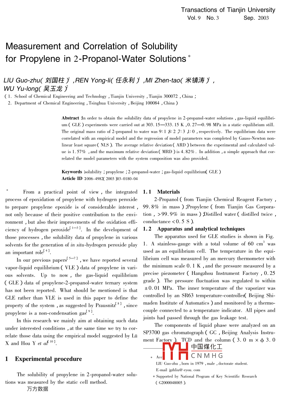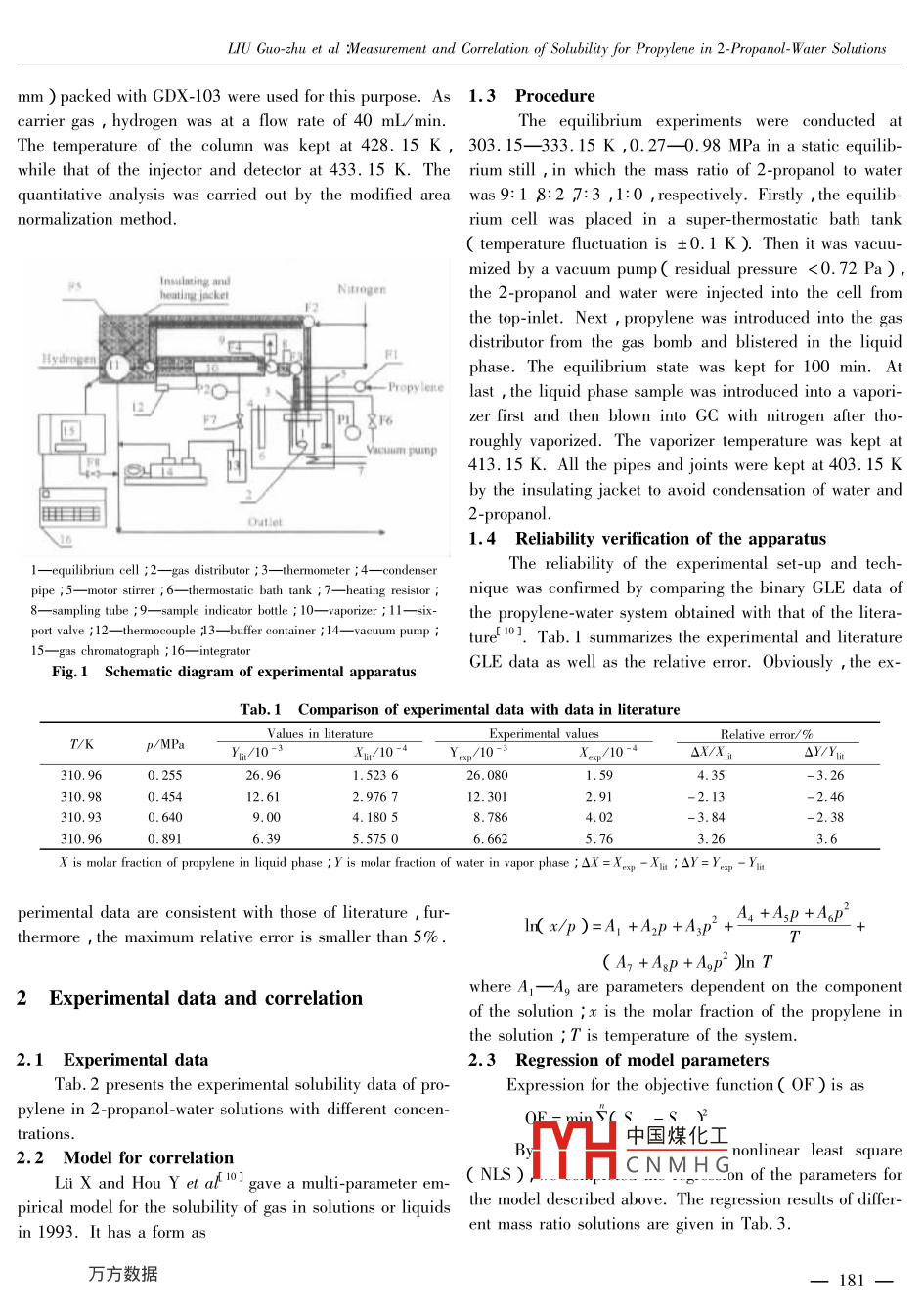 Transactions of Tianjin UniversityVol.9 No. 3Sep.2003Measurement and Correlation of Solubilityfor Propylene in 2-Propanol-Water SolutionsLIU Guo-zhu(劉國(guó)柱) ,REN Yong-li(任永利) ,MI Zhen-tao(米鎮(zhèn)濤) ,WU Yu-long(吳玉龍尸( 1. School of Chemical Engineering and Technology ,Tianjin University , Tianjin 300072 ,China ;2. Department of Chemical Engineering , Tsinghua University , Beijing 100084 , China )Abstract :In order to obtain the solubility data of propylene in 2-propanol-water solutions , gas-liquid equilibri-um( GLE ) experiments were carried out at 303. 15- 333.15 K ,0.27- -0. 98 MPa in a static equilibrium sillThe original mass ratio of 2-propanol to water was 9:18:2 7:3 1:0 ,respectively. The equilibrium data werecorrelated with an empirical model and the regression of model parameters was completed by Gauss-Newton non-linear least square( NLS ). The average relative deviation( ARD ) between the experimental and calculated val-ue is 1. 57% , and the maximum relative deviation( MRD ) is 4. 82%. In addition ,a simple approach that cor-related the model parameters with the system composition was also provided.Keywords solubility ; propylene ; 2-propanol- water ; gas-liquid equilibriun( GLE )Article ID :1006-4982( 2003 )03-0180-04From a practical point of view ,the integrated 1.1 Materialsprocess of epoxidation of propylene with hydrogen peroxide2- Propanol ( from Tianjin Chemical Reagent Factoryto prepare propylene epoxide is of considerable interest ,99. 8% in mass ) ;Propylene ( from Tianjin Gas Corpora-not only because of their positive contribution to the envi- tion ,>99. 9% in mass ) ;Distilled water( distilled twice ,ronment , but also their improvements of the oxidation effi-conductance<0.5 S ).ciency of hydrogen peroxide 1-31. In the development of 1.2 Apparatus and analytical techniquesthose processes , the solubility data of propylene in variousThe apparatus used for GLE studies is shown in Fig.solvents for the generation of in situ-hydrogen peroxide play 1. A stainless-gauge with a total volume of 60 cm3 wasan important role + '.used as an equilibrium cell. The temperature in the equi-In our previous papers一, we have reported severallibrium cell was measured by an mercury thermometer withvapor-liquid equilibrium( VLE ) data of propylene in vari-the minimum scale0. 1 K , and the pressure measured by aus solvents. Up to now , the gas-liquid equilibriumprecise piezometer ( Hangzhou Instrument Factory , 0.25( GLE ) data of propylene 2-propanol-water ternary systemgrade ). The pressure fluctuation was regulated to withinhas not been reported. What should be mentioned is that+0.01 MPa. The inner temperature of the vaporizer wasGLE rather than VLE is used in this paper to define thecontrolled by an SR63 temperature-controller( Beijing Shi-property of the system , as suggested by Prausnitzt 81 ,since .maden Institute of Automatics ) and monitored by a thermo-couple connected to a temperature indicator. All pipes andpropylene is a non-condensation gas 9 ]In this research we mainly aim at obtaining such datajoints had passed through the gas leakage test.The components of liquid phase were analyzed on anunder interested conditions , at the same time we try to cor-SP3700 gas chromatograph( GC , Beijing Analysis Instru-relate those data using the empirical model suggested by LiimentFactory).TCDandthecolumn(3.0mxφ3.0X and Hou Y et at10].中國(guó)煤化工1 Experimental procedureAcc |MHCNMHGLIU Guo-zhu , born in 1979 , male , doctorate student.E-mail gzhliu@ eyou. comThe solubility of propylene in 2-propanol-water solu-* Supported by National Program of Key Scientific Researchtions was measured by the static cell method.( G2000048005 ).LIU Guo-zhuu et al :Measurement and Correlation of Solubility for Propylene in 2-Propanol- Water Solutionsmm ) packed with GDX-103 were used for this purpose. As 1.3 Procedurecarrier gas , hydrogen was at a flow rate of 40 mL/ min.The equilibrium experiments were conducted atThe temperature of the column was kept at 428. 15 K,303.15- -33.15 K ,0.27- -0.98 MPa in a static equilib-while that of the injector and detector at 433. 15 K. The rium still , in which the mass ratio of 2-propanol to waterquantitative analysis was carried out by the modifed area was9:1 8:2 7:3 ,1:0 , respectively. Firstly , the equilib-normalization method.rium cell was placed in a super-thermostatic bath tank( temperature fluctuation is +0.1 K ). Then it was vacuu-mized by a vacuum pump ( residual pressure <0. 72 Pa ) ,heatlneiectelNitrngenthe 2-propanol and water were injected into the cell fromthe top-inlet. Next , propylene was introduced into the gasdistributor from the gas bomband blistered in the liquidFHydrogen11phase. The equilibrium state was kept for 100 min. At- Phopylerelast , the liquid phase sample was introduced into a vapori-口常zer first and then blown into GC with nitrogen after thVecum pumproughly vaporized. The vaporizer temperature was kept at413.15 K. All the pipes and joints were kept at 403.15 Kby the insulating jacket to avoid condensation of water and用1手|Oatlet ,2- -propanol.1.4 Reliability verification of the apparatusThe reliability of the experimental set-up and tech-1- -equilibrium cell ;2- -gas distributor ; 3- -thermometer ;4- -condenserpipe ;5- -motor stirer ;6- -thermostatic bath tank ; 7- -heating resistor ; .nique was confirmed by comparing the binary GLE data of8- -sampling tube ;9- -sample indicator bottle ; 10- -vaporizer ;11- -six-the propylene-water system obtained with that of the litera-port valve ;12- -thermocouple ;13- buffer container ;14- -vacuum pump ;ture' 10]. Tab. 1 summarizes the experimental and literature15- -gas chromatograph ;16- -integratorGLE data as well as the relative error. Obviously , the ex-Fig. 1 Schematic diagram of experimental apparatusTab.1 Comparison of experimental data with data in literatureValues in literatureExperimental valuesRelative error/%T/Fp/MPaY12/10-3Xx:/10-4 Yexp /1