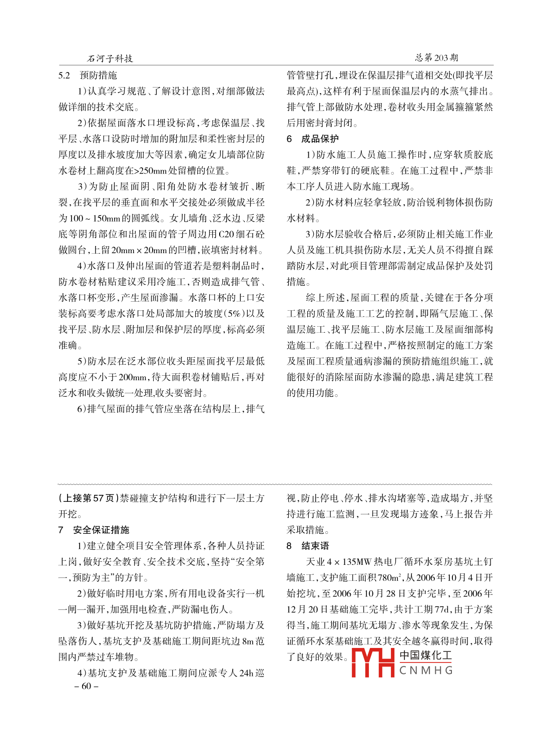 石河子科技總第203期天業(yè)熱電廠循環(huán)水泵房基坑土釘墻支護(hù)施工(石河子市泰安建筑工程有限公司,石河子市, 832000) 劉光英摘要新疆天業(yè)(集團(tuán))有限公司 4x 135MW自備熱電廠循環(huán)水泵房工程,地下埋深部分較深,為-8.1m。在基礎(chǔ)施工期間,為保證滿足勘察、設(shè)計(jì)規(guī)范及施工規(guī)范,首先要了解地下水文情況,編制切實(shí)可行的基坑土釘墻支護(hù)施工方案、質(zhì)量及安全保證措施,才能順利完成循環(huán)水泵房基坑施工。關(guān)鍵詞基坑;土釘墻;支護(hù)中圖分類號(hào):TU74文獻(xiàn)標(biāo)識(shí)碼:B3.1降水排水 .文章編號(hào):1008-0899(2012)06-0056-03施工前先要降水,采用井點(diǎn)降水、集水明排方案,避免土體處于飽和狀態(tài),有效減少或消除作用1工程概況 .于面層的靜水壓力。在基坑四角距坑邊線5.5m處天業(yè)4x 135MW熱電廠循環(huán)水泵房位于石河共設(shè)四個(gè)降水井,采用鋼管砸人土中,管壁鉆小孔子清泉集境內(nèi)。該工程長(zhǎng)25.27m,寬2.7m,其中地透水,管深25m,管內(nèi)水泵流量不小于120m/h。井下部分埋深為-8.1m,基礎(chǔ)為鋼筋砼箱形基礎(chǔ)。南、點(diǎn)降水位至少達(dá)-8.7m以下。距坑邊8m處挖寬北向各距建筑物15m有一座85m高鋼筋砼冷卻.1m深1m管溝,并適當(dāng)設(shè)坡,溝內(nèi)鋪設(shè)膜進(jìn)行隔水,塔。工程地處瑪納斯河流域沖擊扇,地下水位較防滲膜應(yīng)高壓低進(jìn)行搭接,搭長(zhǎng)不少于3m,防止水高,地下土質(zhì)不好,地質(zhì)情況復(fù)雜。滲人坑內(nèi)。抽水要持續(xù)進(jìn)行。備雙電源和至少1臺(tái)2地質(zhì)水文情況及基坑開(kāi)挖考慮的因素備用泵。抽水開(kāi)始至基礎(chǔ)施工完的時(shí)段,要專人2.1 地質(zhì)水文情況24h巡視,防止停抽或水溢出溝外,滲人坑內(nèi)造成邊本工程所處位置地質(zhì)情況復(fù)雜,地下水位埋坡坍塌。深-3.0m,水量大,局部有泉眼等,地質(zhì)勘察報(bào)告顯3.2 分層開(kāi)挖示土層由上向下分布情況為2.1.1耕土層士0.000~水位降至-8.7m后,進(jìn)行基坑開(kāi)挖,共分四層進(jìn)- 0.6m。行,每層約2.2m深,開(kāi)挖- -層,土釘支護(hù)一層,在未(1)粉質(zhì)黏土層- 0.6~ -3.1m。完成上一層作業(yè)面土釘支護(hù)且噴射混凝土面層未(2)圓礫層(戈壁層)-3.1m及其以下(局部夾扎達(dá)到設(shè)計(jì)強(qiáng)度的70%以前,不得進(jìn)行下一層土方開(kāi)流沙)。挖,采用履帶式挖機(jī)開(kāi)挖,8T自卸車將土方運(yùn)至坑2.2基坑開(kāi)挖 考慮的因素邊100m以外,除專用行車坡道外,其它坑邊8m范(1)基坑較深,防止塌方。圍內(nèi)嚴(yán)禁行車、堆物,開(kāi)挖范圍嚴(yán)格按1:03進(jìn)行放(2)旁邊高大建筑物基礎(chǔ)的穩(wěn)定。坡,邊挖邊用鐵鍬進(jìn)行修坡處理,將松動(dòng)及不合坡(3)基坑要降水,便于施工。度要求土方削除。(4)防止基礎(chǔ)施工階段箱基上浮。3.3分層 支護(hù)因此基坑施工較困難,經(jīng)甲級(jí)資質(zhì)的新疆城鄉(xiāng)3.3.1 扎土釘巖土勘察研究院設(shè)計(jì)計(jì)算,決定對(duì)基坑施工進(jìn)行土邊坡修整完畢,沿坑邊分段搭設(shè)操作架體,高釘墻支護(hù)。度與土釘位置適中國(guó)煤化工人坑壁;3施工方案土釘穿越粉沙層:MHCN M H G圓礫層(戈- 56石河子科技第3期2012年6月壁層)時(shí)長(zhǎng)度不少于5m,土釘水平夾角為15φ;土3)土釘位置偏差:士100mm;釘采用φ48、壁厚4.25mm鋼管,長(zhǎng)4 ~ 7.5m不等,4)鉆孔傾斜度:土1mm;管壁設(shè)梅花孔,孔間距250mm~300mm,扎入土中5)漿體強(qiáng)度達(dá)到設(shè)計(jì)要求;部分應(yīng)先砸扁。6)土釘墻面厚度:士10mm;3.3.2注漿7 )墻體強(qiáng)度達(dá)到設(shè)計(jì)要求。土釘置人土層后高壓注漿,注漿材料采用水泥5資源配置漿,內(nèi)摻適量微膨脹劑,水泥漿強(qiáng)度等級(jí)M10,水灰5.1 施工機(jī)具比0.5,注至鋼管中漿滿為止,并用止?jié){塞將外露管空壓機(jī)1臺(tái), 65KW;砼噴射機(jī)1臺(tái),7KW;注漿端塞牢。機(jī)1臺(tái),4KW;攪拌機(jī)1臺(tái),4KW;電焊機(jī)1臺(tái),3.3.3掛網(wǎng)22KW;備用發(fā)電機(jī);水泵5臺(tái);挖掘機(jī)1臺(tái);自卸車4網(wǎng)片采用市場(chǎng)成品鋼網(wǎng)片,掛于土釘上,網(wǎng)面兩。外用2φ12鋼筋與土釘縱橫焊接相連,并于坑頂每5.2材料準(zhǔn)備6m匯集于一點(diǎn),掛牢在豎向錨樁上,豎向錨樁距坑32.5#硅酸鹽水泥; φ 12鋼筋;中粗砂;膨脹劑;邊7m,材料與土釘同,鋼筋與鋼網(wǎng)片用扎絲綁牢。φ48鋼管; - 10鋼板。網(wǎng)片間采用搭接方式,搭長(zhǎng)300mm,并用綁扎絲扎5.3勞動(dòng)力牢,網(wǎng)與坡面間用墊塊支擋,使兩者間距不小于項(xiàng)目經(jīng)理1人;主任工程師1人;施工員1人;質(zhì).40mm。檢員1人;材料員1人;安全員1人;電工2人;巡檢3.3.4噴漿人員4人;勞務(wù)工15人。坡面面層采用M10噴射水泥沙漿。要求按比6質(zhì)量保證措 施例配制,拌好的料放置時(shí)間不得超過(guò)20min,噴槍口1)按要求配置完整的質(zhì)量管理體系和勞務(wù)班距坑壁0.6~ 1m,射流垂直于壁面,自上而下一次噴組,做好技術(shù)交底工作,明確施工工藝和質(zhì)量標(biāo)準(zhǔn)。成,接茬應(yīng)斜交搭接,長(zhǎng)度不少于20em,接縫處噴射2)選用合格的材料,水泥、砂子、鋼管、鋼筋等前應(yīng)清除浮漿、屑,并噴少量水潤(rùn)濕。必須復(fù)試合格才允許使用。3.3.5養(yǎng) 護(hù)3)釘(錨)桿的長(