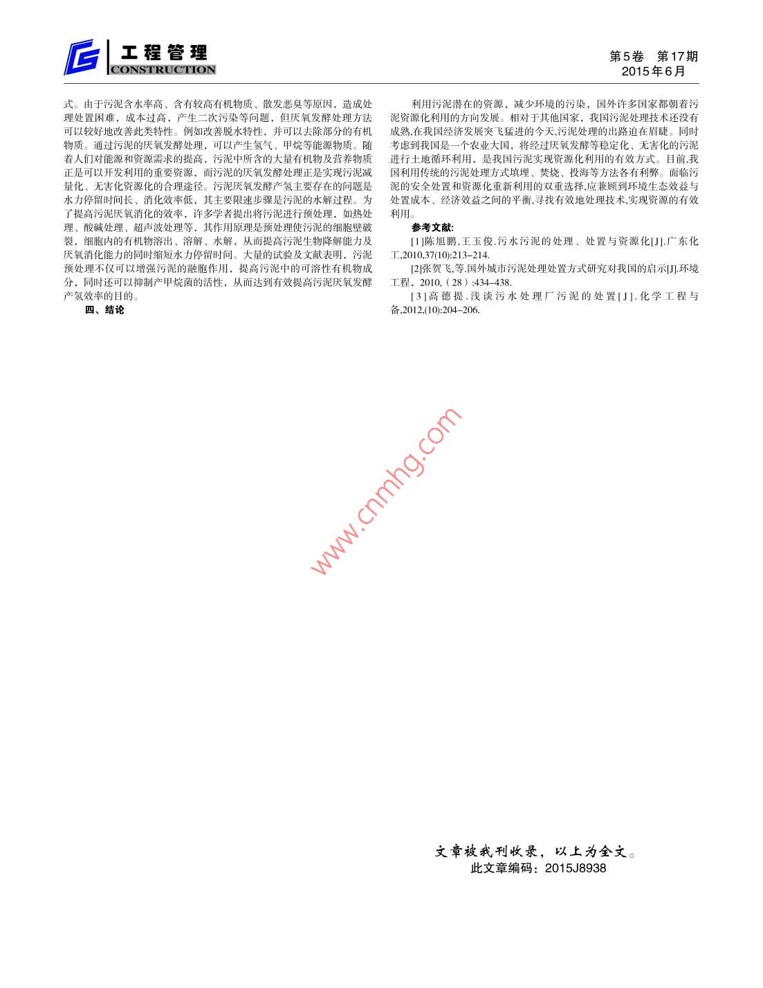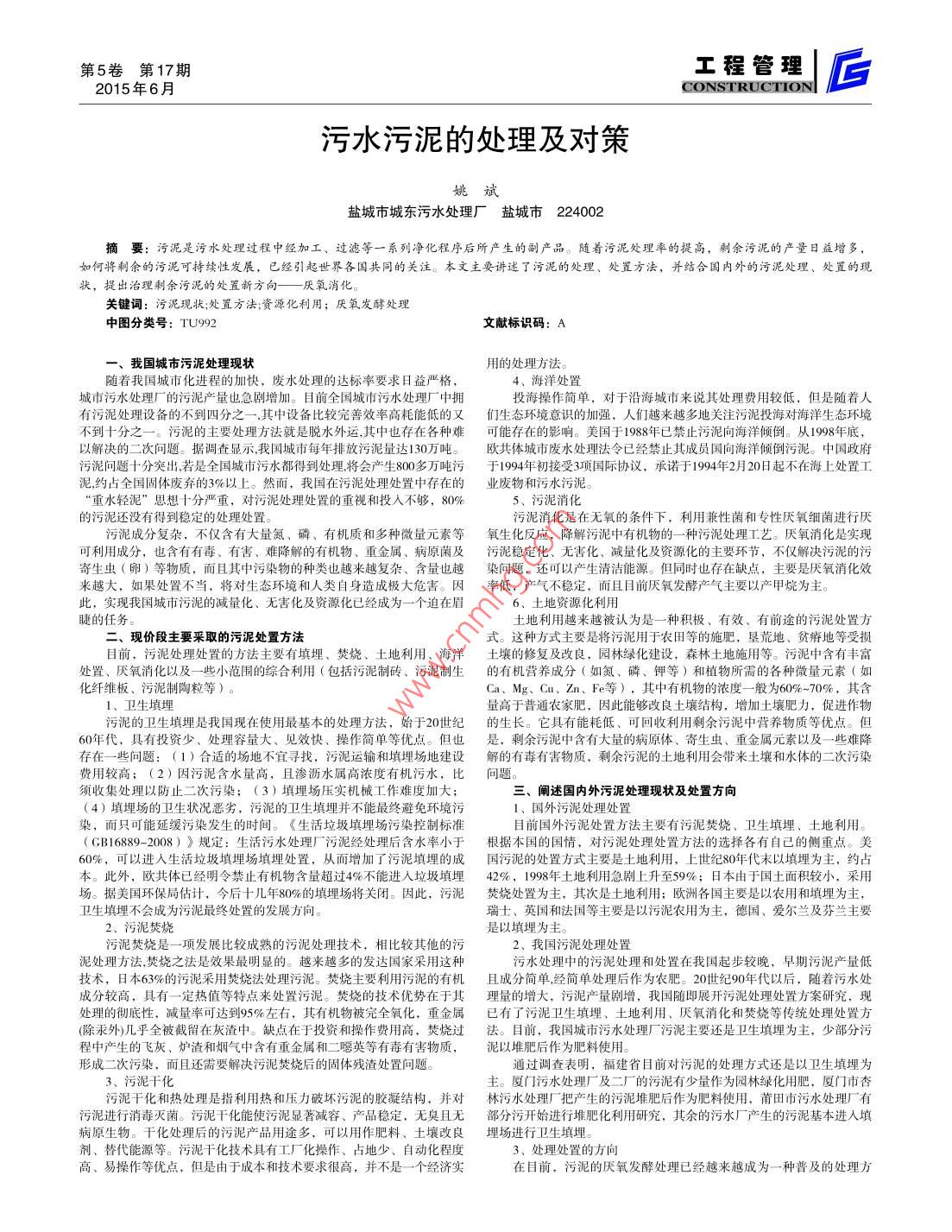 第5卷第17期工程管理2015年6月CONSTRUCTION污水污泥的處理及對策鹽城市城東污水處理廠鹽城市224002摘要:污泥是污水處理過程中經(jīng)加工、過濾等一系列凈侻程序后所產(chǎn)生的嗣產(chǎn)品。隨著污泥處理率的禔高,剩佘污泥的產(chǎn)量日益增多如何將剩余的污泥可持續(xù)性發(fā)展,已經(jīng)引起世界各國共同的關注。本文主要講述了污泥的處理、處置方法,并結合國內外的污泥處理、處置的現(xiàn)提出治理剩佘污泥的處置新方向——厭氧消化。關鍵詞:污泥現(xiàn)狀;處置方法;資源化利用;厭氧發(fā)酵處理中圖分類號:TU992文獻標識碼:A、我國城市污泥處理現(xiàn)狀用的處理方法隨著我國城市化進程的加快,廢水處理的達標率要求日益嚴格4、海洋處置城市污水處理廠的污泥產(chǎn)量也急劇增加。目前全國城市污水處理廠中擁投海操作簡單,對于沿海城市來說其處理費用較低,但是隨著人有污泥處理設備的不到四分之一,其中設備比較完善效率高耗能低的又們生態(tài)環(huán)境意識的加強,人們越來越多地關注污泥投海對海洋生態(tài)環(huán)境不到十分之一。污泥的主要處理方法就是脫水外運,其中也存在各種難可能存在的影響。美國于1988年已禁止污泥向海洋傾倒。從1998年底,以解決的二次問題。據(jù)調査顯示我囯城市每年排放污泥量達130萬噸。歐共體城市廢水處理法令已經(jīng)鍫止其成員國向海洋傾倒污泥。中國政府污泥問題十分突出若是全國城市污水都得到處理將會產(chǎn)生800多萬噸污于1994年初接受3項國際協(xié)議,承諾于1994年2月20日起不在海上處置工泥約占全國固體廢棄的3%以上。然而,我國在污泥處理處置中存在的業(yè)廢物和污水污泥“重水輕泥”思想十分嚴重,對污泥處理處置的重視和投入不夠,80%5、污泥消化污泥還沒有得到穩(wěn)定的處理處置。污泥消化是在無氧的條件下,利用兼性菌和專性厭氧細菌進行厭污泥成分復雜,不僅含有大量氮、磷、有機質和多種微量元素等氧生化反應,降解污泥中有機物的一種污泥處理工藝。厭氧消化是實現(xiàn)可利用成分,也含有有毒、有害、難降解的有機物、重金屬、病原菌及污泥穩(wěn)定化、無害化、減量化及資源化的主要環(huán)節(jié),不僅解決污泥的污寄生蟲(卵)等物質,而且其中污染物的種類也越來越復雜、含量也越染問題,還可以產(chǎn)生清潔能源。但同時也存在缺點,主要是厭氧消化效來越大,如果處置不當,將對生態(tài)環(huán)境和人類自身造成極大危害。率低,產(chǎn)氣不穩(wěn)定,而且目前厭氧發(fā)酵產(chǎn)氣主要以產(chǎn)甲烷為主此,實現(xiàn)我國城市污泥的減量化、無害化及資源化已經(jīng)成為一個迫在眉6、土地資源化利用睫的任務。土地利用越來越被認為是一種積極、有效、有前途的污泥處置方二、現(xiàn)價段主要采取的污泥處置方法式。這種方式主要是將污泥用于農(nóng)田等的施肥,墾荒地、貧瘠地等受損目前,污泥處理處置的方法主要有填埋、焚燒、土地利用、海洋土壤的修復及改良,園林綠化建設,森林土地施用等。污泥中含有豐富處置、厭氧消化以及一些小范圍的綜合利用(包括污泥制磚、污泥制生的有機營養(yǎng)成分(如氮、磷、鉀等)和植物所需的各種微量元素(如化纖維板、污泥制陶粒等)Ca、Mg、Cu、Zn、Fe等),其中有機物的濃度一般為60%-70%,其含1、衛(wèi)生填埋量高于普通農(nóng)家肥,因此能夠改良土壤結構,增加土壤肥力,促進作物污泥的衛(wèi)生填埋是我國現(xiàn)在使用最基本的處理方法,始于20世紀的生長。它具有能耗低、可回收利用剩余污泥中營養(yǎng)物質等優(yōu)點。但60年代,具有投資少、處理容量大、見效快、操作簡單等優(yōu)點。但也是,剩余污泥中含有大量的病原體、寄生蟲、重金屬元素以及一些難降存在一些問題:(1)合適的場地不宜尋找,污泥運輸和填埋場地建設解的有毒有害物質,剩余污泥的土地利用會帶來土壤和水體的二次污染費用較高;(2)因污泥含水量高,且滲瀝水屬高濃度有機污水,比問題須收集處理以防止二次污染;(3)填埋場壓實機械工作難度加大三、闡述國內外污泥處理現(xiàn)狀及處置方向(4)填埋場的衛(wèi)生狀況惡劣,污泥的衛(wèi)生填埋并不能最終避免環(huán)境污1、國外污泥處理處置染,而只可能延緩污染發(fā)生的時間。《生活垃圾填埋場污染控制標準目前國外污泥處置方法主要有污泥焚燒、衛(wèi)生填埋、土地利用。(GB1689-2008)》規(guī)定:生活污水處理廠污泥經(jīng)處理后含水率小于根據(jù)本國的國情,對污泥處理處置方法的選擇各有自己的側重點。美60%,可以進入生活垃圾填埋場填埋處置,從而增加了污泥填埋的成國污泥的處置方式主要是土地利用,上世紀80年代末以填埋為主,約占本。此外,歐共體已經(jīng)明令禁止有機物含量超過4%不能進入垃圾填埋42%,1998年土地利用急劇上升至59%;日本由于國土面積較小,采用場。據(jù)美國環(huán)保局估計,今后十幾年80%的填埋場將關閉。因此,污泥焚燒處置為主,其次是土地利用:歐洲各國主要是以農(nóng)用和填埋為主衛(wèi)生填埋不會成為污泥最終處置的發(fā)展方向。瑞士、英國和法國等主要是以污泥農(nóng)用為主,德國、愛爾蘭及芬蘭主要2、污泥焚燒是以填埋為主污泥焚燒是一項發(fā)展比較成熟的污泥處理技術,相比較其他的污2