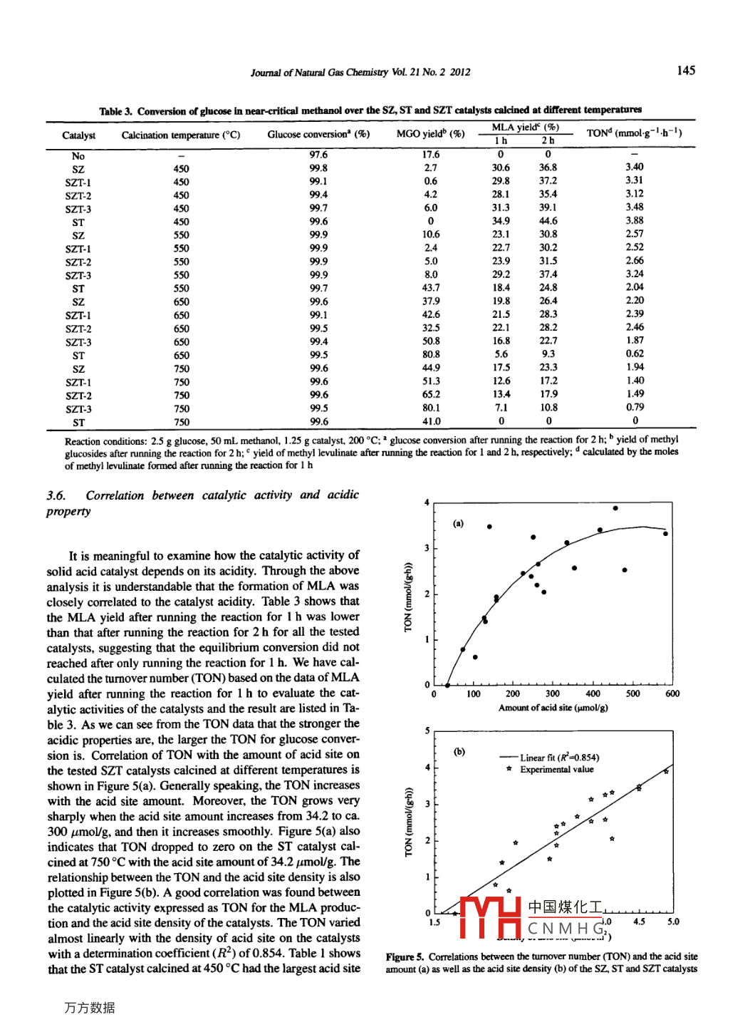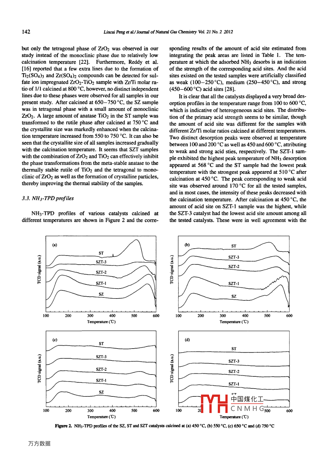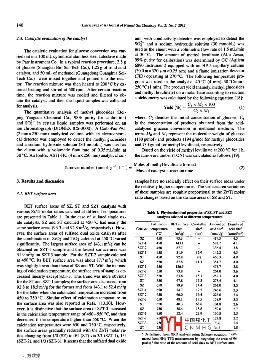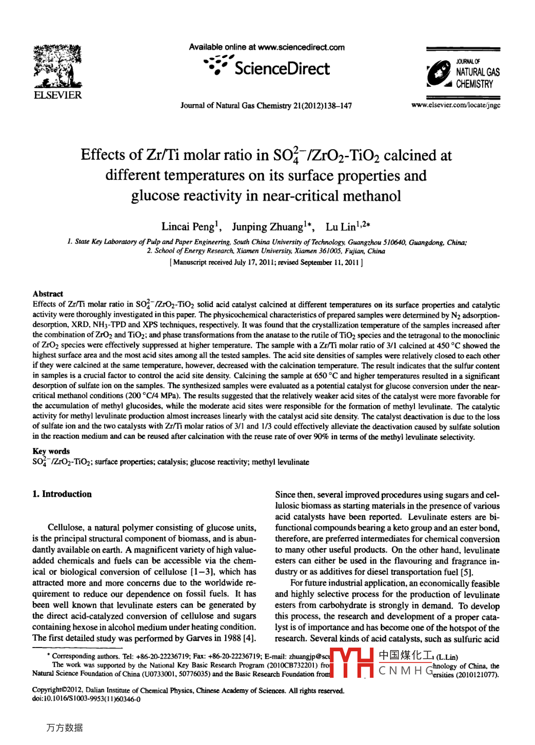 Available online at www.sciencedirect.comJOURULFScienceDirectNATURALGASCHEMISTRYEL SEVIERJournal of Natural Gas Chermistry 21(2012)138 -147www.elsevier.com/locate/jngcEffects of Zt/Ti molar ratio in SO2- /ZrO2-TiO2 calcined atdifferent temperatures on its surface properties andglucose reactivity in near-critical methanolLincai Peng',Junping Zhuangl*,Lu Lin1,2*1. State Key Laboratory of Pulp and Paper Engineering, South China University of Technology, Guangzhou 510640, Guangdong, China;2. School of Energy Research, Xiamen Universiy,Xiamen3611005, Fujian, China[Manuscript received July 17, 2011; revised September 11, 2011]Effects 0f Zr/Ti molar ratio in so2- /ZrO2-TiO2 solid acid catalyst calcined at different temperatures on its surface properties and catalyticactivity were thoroughly investigated in this paper. The physicochemical characteristics of prepared samples were determined by N2 adsorption-desorption, XRD, NH3-TPD and XPS techniques, respectively. It was found that the crysallization temperature of the samples increased afterthe combination of ZrO2 and TiO2; and phase transformations from the anatase to the ruile of TiO2 species and the tetragonal to the monoclinicof Zr02 species were efcively suppressed at higher temperature. The sample with a Zzr/Ti molar ratio of 3/1 calcined at 450 °C showed thehighest surface area and the most acid sites among all the tested samples. The acid site densities of samples were relatively closed to each otherif they were calcined at the same temperature, however, decreased with the calcination temperature. The result indicates that the sulfur contentin samples is a cucial factor to control the acid site density. Calcining the sample at 650。C and higher temperatures resulted in a sigificantdesorption of sulfate ion on the samples. The synthesized samples were evaluated as a potential catalyst for glucose conversion under the near-critical methanol conditions (200°C/4 MPa). The results suggested that the relatively weaker acid sites of the catalyst were more favorable forthe accumulation of methyl glucosides, while the moderate acid sites were responsible for the formation of methyl levulinate. The catalyticactivity for methyl levulinate production almost increases linearly with the catalyst acid sice density. The catalyst deactivation is due to the lossof sulfate ion and the two catalysts with Zr/Ti molar ratios of 3/1 and 1/3 could efectively alviate the deactivation caused by sulfate solutionin the reaction medium and can be reused after calcination with the reuse rate of over 90% in terms of the methyl levulinate selectivity.Key wordsso2- /ZrO2-TiO2; surface properties; catalysis; glucose reactivity; methyl levulinate1. IntroductionSince then, several improved procedures using sugars and cel-lulosic biomass as starting materials in the presence of variousacid catalysts have been reported. Levulinate esters are bi-Cellulose, a natural polymer consisting of glucose units,functional compounds bearing a keto group and an ester bond,is the principal structural component of biomass, and is abun-therefore, are preferred intermediates for chemical conversiondantly available on earth. A magnificent variety of high value-to many other useful products. On the other hand, levulinateadded chemicals and fuels can be accessible via the chem-esters can either be used in the flavouring and fragrance in-ical or biological conversion of cellulose [1- 3), which hasdustry or as additives for diesel transportation fuel [5].attracted more and more concerms due to the worldwide re-For future industrial application, an economically feasiblequirement to reduce our dependence on fossil fuels. It hasand highly selective process for the production of levulinatebeen well known that levulinate esters can be generated byesters from carbohydrate is strongly in demand. To developthe direct acid-catalyzed conversion of cellulose and sugarsthis process, the research and development of a proper cata-containing hexose in alcohol medium under heating condition.lyst is of importance and has become one of the hotspot of theThe first detailed study was performed by Garves in 1988 [4].research. Several kinds of acid catalysts, such as sulfuric acid●Crresponding authors. Te: +6-22236719; Fax: +86 20 26719;7 E-mail: zhuangjp@sc中國(guó)煤化工(L.Lin)The work was suppored by the National Key Basic Research Program (2010CB732201) froCNMH(-hnology of China, theNatural Science Foundation of China (U0733001, 50776035) and the Basic Research Foundation fromMHPersities (2010121077).CopyrightO2012, Dalian Instioute of Chemical Physics, Chincse Academy of Sciences. AlI rights reserved.doi:10.1016/S 1003-9953(11)60346-0.Joumal of Natural Gas Chemistry Vol. 21 No.2 2012139[4-6], p-toluenesulfonic acid [4], mixed-acid (for example,to adjust the pH value between 9 and 10 via magnetic stir-a combination of In(OTf)3 and PTSA [7]) and sulfonic acid-ring for 1 h, and then the mixed solution was aged at roomfunctionalized ionic liquids [8] were employed in this study,temperature for 24 h. The obtained precipitate was filteredand they have exhibited good catalytic performances. Un-and washed thoroughly with de-ionized water until no chlo-fortunately, these catalysts suffer from some of the unavoid-ride ion was left and then was dried at 60 °C for 48 h. The :able disadvantages, such as equipment corrosion, side reactiondried precipitate was powdered below 80 mesh, and then wasfrom the inter -molecular dehydration of alcohol which wasimpregnated with a 0.5 mol/L H2SO4 solution with a solu-used as reaction medium, separation and recycling problems,tion/solid ratio of 15 mUg and stirred at 500 rpm for 1h. Theenvironmental pollution, and/or high cost. In light of theseresulting precipitated solid was filtered, subsequently dried atproblems, the development of novel and environmentally be-110°C for 12 h and calcined at different temperatures rangingnign catalysts with high activity is expected.from 