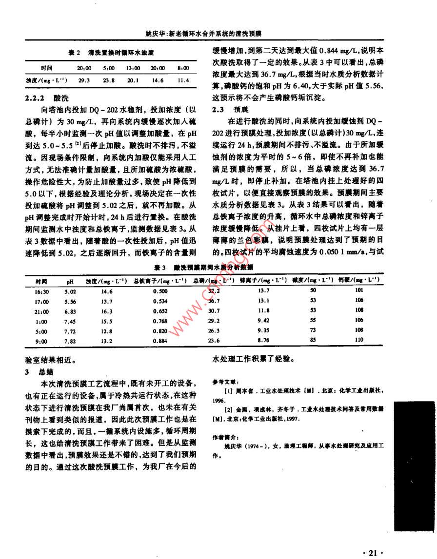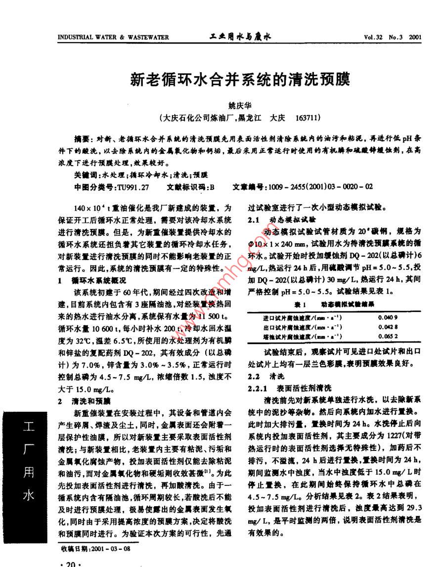 INDUSTRIAL WATER & WASTEWATER工業(yè)用水與廈水Vol.32 No.3 2001新老循環(huán)水合并系統(tǒng)的清洗預(yù)膜姚慶華(大慶石化公司煉油廠,黑龍江大慶163711)摘要:對新、老循環(huán)水合并系統(tǒng)的清洗預(yù)膜先用表面活性劑清除系統(tǒng)內(nèi)的油污和粘泥,再進(jìn)行低pH條件下的酸洗,以去除系統(tǒng)內(nèi)的金屬氧化物和鈣垢,最后采用正常運(yùn)行時使用的有機(jī)膦和硫酸鋅堰蝕劑,在高濃度下進(jìn)行預(yù)膜處理,效果較好。關(guān)鍵詞:水處理;循環(huán)冷卻水;清洗;預(yù)膜中圖分類號:TU991.27文獻(xiàn)標(biāo)識碼:B文章編號: 1009 - 2455(2001)03- 0020- 02140x 10*t重油催化是我廠新建成的裝量,為過試驗(yàn)室進(jìn)行了一次小型動態(tài)模擬試驗(yàn)。保證開工后循環(huán)水正常處理,需要對該冷卻水系統(tǒng)2.1 動態(tài)模擬試驗(yàn)進(jìn)行清洗預(yù)膜。但是,為新重催裝提供冷卻水的動態(tài)模擬試驗(yàn)試管材質(zhì)為20'碳鋼,規(guī)格為循環(huán)水系統(tǒng)還擔(dān)負(fù)薯其它裝f的循環(huán)冷卻水任務(wù),φ10x 1 x 240 mm,試驗(yàn)用水為待清洗預(yù)膜系統(tǒng)的循對新裝量進(jìn)行清洗預(yù)膜的同時不能影響老裝的正環(huán)水。試驗(yàn)開始時投加鹱蝕劑DQ - 202(以總碘計(jì))6常運(yùn)行。因此,系統(tǒng)的清洗預(yù)膜有- -定的特殊性。mg/L,熱運(yùn)行24 h后,用硫殿調(diào)節(jié)pH=5.0~5.5,投1循環(huán)水累統(tǒng)概況加DQ- 202(以總磷計(jì)) 30 mg/L,熱運(yùn)行24 h,其間該系統(tǒng)初建于60年代,期間經(jīng)過四次改造和增嚴(yán)格控制pH=5.0-5.5。試驗(yàn)結(jié)果見表1。建,目前系統(tǒng)內(nèi)包含有3座隔油池,對經(jīng)裝t換熱回動志橫擬試瞼結(jié)果來的熱水進(jìn)行油水分離,系統(tǒng)保有水為11 500 t。進(jìn)口試片腐蝕速度/(m1)0.040 9循環(huán)水量10 600 t,每小時補(bǔ)水200 t,冷卻水回水溫出口試片腐蝕速度/(ma.s"')0.0428度為32C ,溫差6.5C,所使用的水處理劑為有機(jī)膦塔袍試片腐蝕度/(mm.s1)0.065 2和鋅鹽的復(fù)配藥劑DQ- 202,其有效成分(以總磷試驗(yàn)結(jié)束后,觀寨試片可見進(jìn)口處試片和出口計(jì))為7.0%,鋅含量為3.0% ~3.5%,正常運(yùn)行時處試片上均有一層蘭色彩膜,表明預(yù)膜效果良好。控制總磷為4.5-7.5 mg/L, 濃緒倍數(shù)1.5,濁度不2.2 清洗大于15.0 mg/L。2.2.1表面活性劑清洗2清洗和預(yù)膜清洗前先對新系統(tǒng)單獨(dú)進(jìn)行水洗,以去除新系新重催裝在安裝過程中,其設(shè)備和管道內(nèi)會統(tǒng)中的泥沙等雜物。然后向系統(tǒng)內(nèi)加水進(jìn)行換。工產(chǎn)生碎屑、焊渣及塵土,同時,金屬表面還會附著-一此時加大排污量, 換時間為 24ho水洗停止后向?qū)颖Wo(hù)性油膜,所以對新裝1主要采取表面活性劑系統(tǒng)內(nèi)投加表面活性劑,其主要成分為1227(對帶清洗;與新裝相比,老裝內(nèi)主要有粘泥、污垢和熱運(yùn)行時的表面活性劑選擇無特殊性),加藥后不金屬氧化腐蝕產(chǎn)物,投加表面活性劑僅能去除粘泥排污,不溢流,24 h后進(jìn)行換,換時間為24h,用和油污,而對金屬氧化物和硬垢則收效甚微"。為此期間監(jiān)測水中獨(dú)度, 當(dāng)水中獨(dú)度低于15.0 mg/L時先投加表面活性劑進(jìn)行清洗,再加酸清洗。由于一停止置換,在此期間始終保持循環(huán)水中總磷在水循系統(tǒng)內(nèi)含有隔油池,循環(huán)周期較長,若酸洗后不能4.5~7.5 mg/L。分析結(jié)果見表2。表2結(jié)果表明,及時進(jìn)行預(yù)膜處理,極易使露出的金屬表面發(fā)生氧投 加表面活性劑進(jìn)行清洗后,濁度最高達(dá)到29.3化,同時由于采用提高濃度的預(yù)膜方案,決定將酸洗mg/ L,是平時監(jiān)測的兩倍,說明表面活性劑清冼是和預(yù)膜同時進(jìn)行。為驗(yàn)證本次方案的可行性,先通有效果的。收稿日期:2001-03-08,20.姚慶華:新老循環(huán)水合并系統(tǒng)的清洗預(yù)膜表2清冼置換時衢環(huán)水濁度緩饅增加,到第二天達(dá)到最大值0.844 mg/L,說明本次酸洗取得了一定的效果。從表3中可以看出,總磷時間20:00 5:00 13:00 20:008:00濃度最大達(dá)到36.7 mg/L,根據(jù)當(dāng)時水質(zhì)分析數(shù)據(jù)計(jì)濁度/(mg'L")29.323.820.114.611.4算,磷酸鈣的飽和pH為6.40,大于實(shí)際pH值5.56,2.2.2酸洗這預(yù)示將不會產(chǎn)生磷酸鈣垢沉淀。向塔池內(nèi)投加DQ- 202水穩(wěn)劑,投加依度(以2.3 預(yù)膜總磷計(jì))為30 mg/L,再向系統(tǒng)內(nèi)緩慢逐次加人硫在進(jìn)行酸洗的同時,向系統(tǒng)內(nèi)投加縵蝕劑DQ-酸,每半小時監(jiān)測~次pH值以調(diào)整加酸量,在pH202進(jìn)行預(yù)膜處理,投加依度(以總磷計(jì))30 mg/L,連到達(dá)5.0-5.5口)后停止加酸。酸洗時不排污,不溢續(xù)運(yùn)行24 h,預(yù)膜期間不排污、不溢流。由于所加緩流。因現(xiàn)場條件限制,向系統(tǒng)內(nèi)加酸僅能采用人工蝕劑的濃度為平時的5~6倍,即使不再補(bǔ)加也能方式,無法準(zhǔn)確計(jì)量加酸量,且所加硫酸為濃硫酸,滿足預(yù)膜的需要,所以,當(dāng)總磷濃度達(dá)到36.7操作危險性大,為防止加酸過多,致使pH降低到mg/L時,即停止補(bǔ)加。在塔池內(nèi)掛上處理好的四5.0以下,根據(jù)經(jīng)驗(yàn)及理論分析,現(xiàn)場決定在一次性枚試片,以便直接觀察預(yù)膜的效果。預(yù)膜期間主要投加硫酸將pH調(diào)整到5.02之后,就不再加酸。