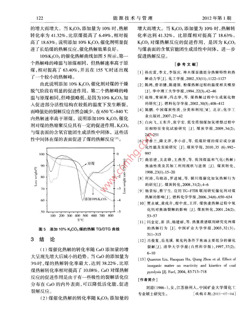 120能源技術(shù)與管理2012年第1期doi:10.3969/j.sn. 1672- 9943.2012.01.047新疆伊寧長焰煤催化熱解行為的熱重研究劉瓊,吳國光,孟獻梁,田 靖,胡長娥(中國礦業(yè)大學(xué)化工學(xué)院,煤炭加工與高效潔凈利用教育部重點實驗室,江蘇徐州221116)[摘要]通過熱重分析技術(shù)研究了CaO和K2CO,在不同添加量下對新疆伊寧長焰煤催化熱解行為的影響。實驗結(jié)果表明,當CaO的添加量為3%時,煤的熱解轉(zhuǎn)化率最大,達到38.22%,比原煤相對提高了10.08%,CaO對煤熱解反應(yīng)的促進作用是由于有極性的裂解活化位分布在CaO的內(nèi)外表面,可以降低活化能,促進裂解反應(yīng);當K2CO3添加量為10%時,熱解轉(zhuǎn)化率為41.32%, 比原煤相對提高了18.63%, K2CO,對煤熱解反應(yīng)的促進作用,主要是由于K2CO,與煤表面的含氧官能團生成活性中間體的原因。[關(guān)鍵詞]長焰煤;催化熱解;熱重 分析[中圖分類號] TQ530.2 [文獻標識碼] B [文章編號] 1672-9943(2012)01 -0120-030引言1實驗部分煤的熱解特性一直以來就是人們研究的焦實驗所用的原料煤為伊寧長焰煤,經(jīng)過分選、點,從微觀角度的巖相顯微組分的熱解反應(yīng)性研破碎、篩分得到粒度小于0.2 mm空氣干燥基煤究到各種小型實驗臺架熱解生成物研究,已經(jīng)獲樣,其工業(yè)分析和元素分析結(jié)果如表1所示。實驗得了煤熱解的基本規(guī)律[1-3)。在我國,低階煤不僅所用的催化劑為CaO和K2CO,它們都為分析純。資源豐富,而且揮發(fā)分含量高。通過對低階煤催化煤樣制備過程中采用機械混合法,同時按照Ca原熱解,可以獲得大量的有用原料,避免了直接燃燒子和K原子的質(zhì)量與空氣干燥基煤樣的質(zhì)量比帶來的污染和資源浪費。低階煤的催化熱解具有是1%、3%、5%、7%.10%向原煤中添加CaO和重要的意義,可以加快低階煤的熱解速度,降低低K2CO,混合均勻,并存于密閉玻璃容器中。階煤的熱解溫度,提高低階煤的熱解轉(zhuǎn)化率,提高表1工業(yè)分析和元素分析%低階煤的目標產(chǎn)物產(chǎn)率148]。人們發(fā)現(xiàn)對煤進行熱工業(yè)分析元素分析解氣化時,一些礦物質(zhì)或添加的一- 些無機物對熱MAVuFCUCrHuNuOu Su解氣化具有明顯的催化作用。楊景標用熱重紅外10.23 8.03 41.19 58.81 77.05 5.21 0.79 16.24 0.65聯(lián)用技術(shù)研究了4種催化劑對褐煤和煙煤的催化熱重分析實驗采用德國Netzsch公司STA熱解效果,得出的結(jié)論分別是Ni的催化效果大于409熱重分析儀。實驗條件:試驗煤樣約10 mg,以Fe~Ca大于K和Ca~ Fe的催化效果大于Ni大惰性氣體N2為氣氛,流量為100mL/min,升溫速于K9。賈永斌等研究了添加不同的CaO時煤在率為30 C/min,溫升范圍為30 C~840 C。熱解器中的催化效果,發(fā)現(xiàn)不同的CaO都能增加2結(jié)果與討論各種煤氣的產(chǎn)量(!10。在煤化學(xué)領(lǐng)域,熱重分析法(TG)得到了廣泛2.1 原煤熱解特性分析的應(yīng)用。熱重分析法是利用熱天平在程序控制溫原煤在N2下的熱解失重曲線(TG)和失重速度的條件下,測量物質(zhì)的質(zhì)量與溫度的關(guān)系的一率曲線(DTG )如圖1所示。從熱解失重曲線(TG)種熱分析技術(shù),主要優(yōu)點有儀器操作簡便,準確度可以得出,伊寧長焰煤的熱解隨溫度的升高而不高,靈敏快速,以及試樣微量化等四。斷加深,原煤的熱解轉(zhuǎn)化率達到了34.83%。其中,本文通過熱重實驗研究了兩種催化劑CaO室溫至300 C區(qū)間稱為干燥脫氣階段,主要是脫和K2CO3在不同添加量下對新疆伊寧長焰煤催化水,脫除吸附的氣體,如N2和CH4等以及脫側(cè)鏈熱解行為的影響,從而獲得對新疆伊寧長焰煤熱羧基反應(yīng)釋放出部分小分子物質(zhì)。原煤第-一個熱解具有優(yōu)良催化效果的催化劑。解峰的峰溫為75 C,熱解速率是1.5%/min。從圖2012年第1期劉瓊,等新疆伊寧長焰煤催化熱解行為的熱重研究1211中可以看出300C~600C內(nèi)為長焰煤的活潑熱3%Ca0的催化熱解曲線如圖3所示。添加分解階段,以解聚和分解為主,生成大量的揮發(fā)物3%CaO煤樣的第一- 個熱解峰的峰溫與原煤幾乎(煤氣和焦油),煤氣的成分主要是氣態(tài)烴,還有熱相同,但峰溫處的熱解速率與原煤相比,提高約解水、一氧化碳和二二氧化碳。由TG曲線可知此階1%/min。由圖中可明顯看出在干燥脫氣階段,熱段煤樣質(zhì)量迅速下降,熱解轉(zhuǎn)化率達到23.49%。解更加深入。添加3%CaO煤樣的第二個熱解峰的由DTG曲線可以看出,原煤第二個熱解峰的峰溫峰溫與原煤相同,但峰值略低。峰值略低的原因是為462.6 C ,熱解速率是4.00%/min。600 C~840 C3%CaO加入后促使部分活性結(jié)構(gòu)在較低的溫度階段內(nèi)主要發(fā)生煤分子間的熱縮聚反應(yīng),析出的下即發(fā)生斷裂,而峰值處的裂解反應(yīng)自然會減少。焦油量極少,揮發(fā)物主要是煤氣, 700 C后煤氣的由DTG曲線可知添加3%CaO煤樣的第三個熱解主要成分是氫氣。從DTG曲線可以看出熱縮聚階峰的峰值為2.00%/min,該峰是二次脫氣的一部段的熱解峰幾乎被拉平- -般, 說明此階段的熱解分,而原煤對應(yīng)的峰似乎被拉平- -樣,這說明添加反應(yīng)不明顯。3%Ca0后,煤樣的熱解速率得到提高,該處的熱解程度加深。CaO 對長焰煤熱解反應(yīng)的促進作用10to是由于有極性的裂解活化位分布在CaO的內(nèi)外表面,可以降低活化能,促進裂解反應(yīng)叫。of\DTG看80-100070-T,原煤50100 200300400500 600 700 8007T/C添加3%Ca0圖1原煤在氮氣下