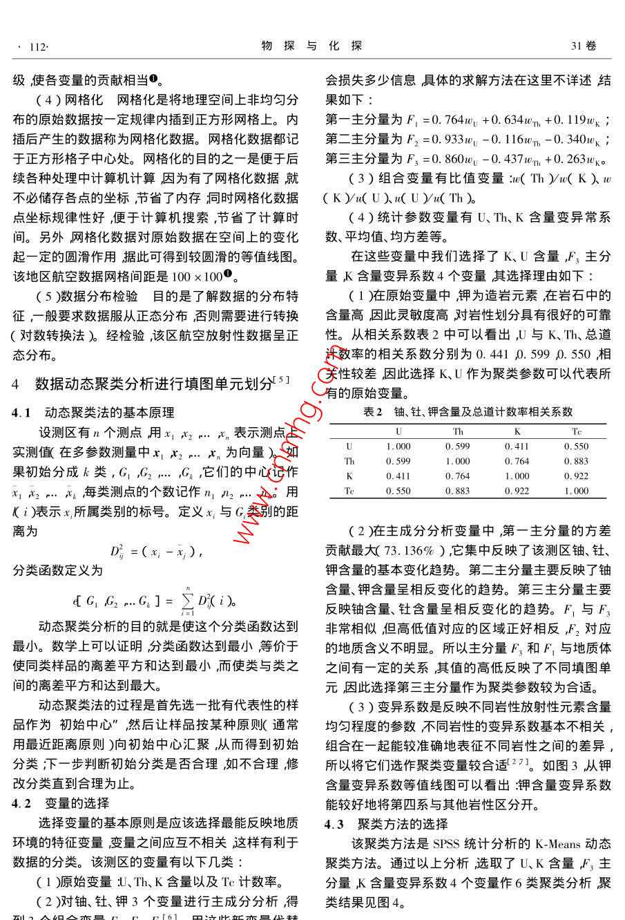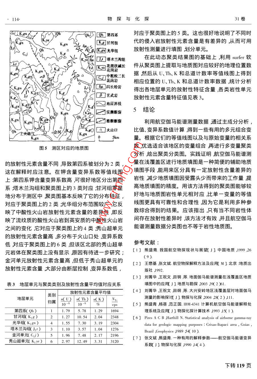 第31卷第2期物探與化探2007年4月GEOPHYSICAL geoCHeMICal eXPlorationApr.2007航空伽馬能譜測(cè)量在淺覆蓋區(qū)地質(zhì)填圖單元?jiǎng)澐种械膽?yīng)用陳樹(shù)軍劉菁華王祝文〔吉林大學(xué)地球探測(cè)科學(xué)與技術(shù)學(xué)院吉林長(zhǎng)春130026)摘要不同巖性的巖石其放射性元素U、Th和K的含量不同即使是同一巖性的巖石由于成因不同形成年代不同地質(zhì)演化過(guò)程不同其放射性元素含量也不同。筆者根據(jù)放射性元素在巖石中分布的這個(gè)特點(diǎn)利用航空伽馬能譜測(cè)量數(shù)據(jù)采用多元統(tǒng)計(jì)分析方法對(duì)航空伽馬能譜測(cè)量數(shù)據(jù)進(jìn)行分析并作出動(dòng)態(tài)聚類圖然后再與已有的地質(zhì)圖對(duì)比分析各種巖性放射性元素U、h和K的含量為該地區(qū)進(jìn)行下一步地質(zhì)工作提供依據(jù)。關(guān)鍵詞航空伽馬能譜變異系數(shù)主成分分析動(dòng)態(tài)聚類中圖分類號(hào):P631.6文獻(xiàn)標(biāo)識(shí)碼:A文章編號(hào):1000-891820072-0110-05早在1958年我國(guó)就開(kāi)始探索利用航空放射性為基巖。該區(qū)出露的地層單元主要為:①第四系測(cè)量資料進(jìn)行巖性地質(zhì)填圖。20世紀(jì)80年代后期(h)坡積裙、沖積扇和河漫灘。②白堊系甘河組地礦部門組織的物探在1:5萬(wàn)區(qū)域調(diào)查中應(yīng)用”(Kg)巖性以基性一中基性火山熔巖為主其次為的專題研究項(xiàng)目成果進(jìn)一步顯示了航空放射性測(cè)基性—中基性火山碎屑巖主要為氣孔狀玄武巖、氣量資料在巖性、構(gòu)造填圖中的作用?!逼呶濉搴桶丝仔尤薁畲职矌r、粗安質(zhì)火山角礫巖、凝灰?guī)r;3白五”期間地質(zhì)礦產(chǎn)部設(shè)立1:5萬(wàn)區(qū)域地質(zhì)調(diào)查中堊系光華組(K1sn)巖性較復(fù)雜主要為一套酸性遙感、物探、化探應(yīng)用方法研究″項(xiàng)目使得航空伽火山巖系其上部主要為英安質(zhì)角礫凝灰?guī)r、熔結(jié)凝馬能譜測(cè)量資料解釋方法、地質(zhì)填圖和礦產(chǎn)預(yù)測(cè)方灰?guī)r、英安巖,下部主要為流紋質(zhì)角礫凝灰?guī)r、火山法以及應(yīng)用效果得到了進(jìn)一步歸納和充實(shí)解釋方角礫巖、熔結(jié)凝灰?guī)r④侏羅系塔木蘭溝組J4)主法進(jìn)一步完善。新一輪國(guó)土資源調(diào)查再一次提要為氣孔狀粗安巖、粗安巖、粗安質(zhì)角礫凝灰?guī)r出對(duì)特殊地質(zhì)景觀區(qū)進(jìn)行地質(zhì)填圖研究2。該區(qū)出露的巖漿巖為早石炭金河單元(Cj)由于航空伽馬能譜測(cè)量具有可跨越任何陸面,中粗粒二長(zhǎng)花崗巖2早白堊系秀山超單元(Kye)其φ0%的響應(yīng)來(lái)自地表25cm深度的范圍(稱為花斑狀堿長(zhǎng)正長(zhǎng)巖A25層)能夠快速取得大面積的伽馬能譜測(cè)量數(shù)據(jù)編制多種特征參數(shù)圖件為研究測(cè)區(qū)的地質(zhì)構(gòu)造在淺覆蓋區(qū)進(jìn)行巖性填圖或單元?jiǎng)澐值母窦?、主要巖性分布、預(yù)測(cè)找礦遠(yuǎn)景地段和正確合理依據(jù)地部署地質(zhì)礦產(chǎn)調(diào)查工作提供重要依據(jù)。放射性伽馬能譜測(cè)量進(jìn)行地質(zhì)填圖的主要依據(jù)筆者以實(shí)測(cè)的航空伽馬能譜數(shù)據(jù)在淺覆蓋區(qū)進(jìn)是不同的巖性。同一種巖性的巖石若成因不同形行巖性單元?jiǎng)澐诌_(dá)到定量確定巖性邊界的目的。成年代不同地質(zhì)演化過(guò)程不同其放射性元素U、1研究區(qū)地質(zhì)背景3Th、K的含量也不同。所以可以通過(guò)放射性能譜測(cè)量得到的放射性元素U、Th、K的含量來(lái)區(qū)分不同的測(cè)區(qū)為阿龍山圖幅的西南角,面積為1007巖性或填圖單元。如表1列出了該測(cè)區(qū)主要巖性地km2為淺覆蓋區(qū)。淺覆蓋層表現(xiàn)為腐植土層加殘面放射性能譜測(cè)量U、Th、K的含量從表中可知巖坡積碎石層厚度為0.5-1m同部地段可達(dá)3m性的放射性元素含量有較大差別所以可以通過(guò)放以上。表凨A層)植被較發(fā)育厚度一般在10~20射性伽馬能譜測(cè)量區(qū)分不同的巖性cm其下為B層,般厚度為0.3m左右B層下面但在淺覆蓋層上進(jìn)行放射性能譜測(cè)量其含量2期陳樹(shù)軍等航空伽馬能譜測(cè)量在淺覆蓋區(qū)地質(zhì)填圖單元?jiǎng)澐种械膽?yīng)用表1測(cè)區(qū)部分巖性的地面放射性測(cè)量鈾、釷、鉀元素含量3人地層巖性U) uTh)uk粗安巖14.85甘河組氣孔狀杏仁玄武粗安巖3.1216.464.61ea1英安巖英安質(zhì)角礫凝灰?guī)r3.092557.0英安質(zhì)凝灰?guī)r3.6123.086.76英安質(zhì)角礫晶屑凝灰?guī)r5.318.34.7光華組英安質(zhì)巖屑凝灰?guī)r3.02.65.17英安質(zhì)熔結(jié)凝灰?guī)r流紋巖31.15.89攻質(zhì)凝灰?guī)r流紋質(zhì)巖屑凝灰?guī)r22.65.17流紋質(zhì)熔結(jié)凝灰?guī)r42.62流紋質(zhì)角礫凝灰?guī)r4.126.226.41塔木蘭氣孔狀杏仁玄武巖1.57547429溝組杏仁玄武巖T CK,ga K gnl K , gI玄武粗安巖3.74引自文靚3]1一第四系2—光華組為一套酸性火山巖3一甘河組,為基性中基性火山熔巖;—塔木蘭溝組為粗安巖,玄武巖為主“一金變化是否仍能反映基巖的這種區(qū)別為此我們做了河單元為中粗粒二長(zhǎng)花崗巖地表覆蓋層與基巖層放射性能譜測(cè)量?jī)烧叩姆派鋱D2航空伽馬譜測(cè)量U、Th、K及總道計(jì)數(shù)率值與地質(zhì)性元素含量顯著正相關(guān)相關(guān)系數(sh