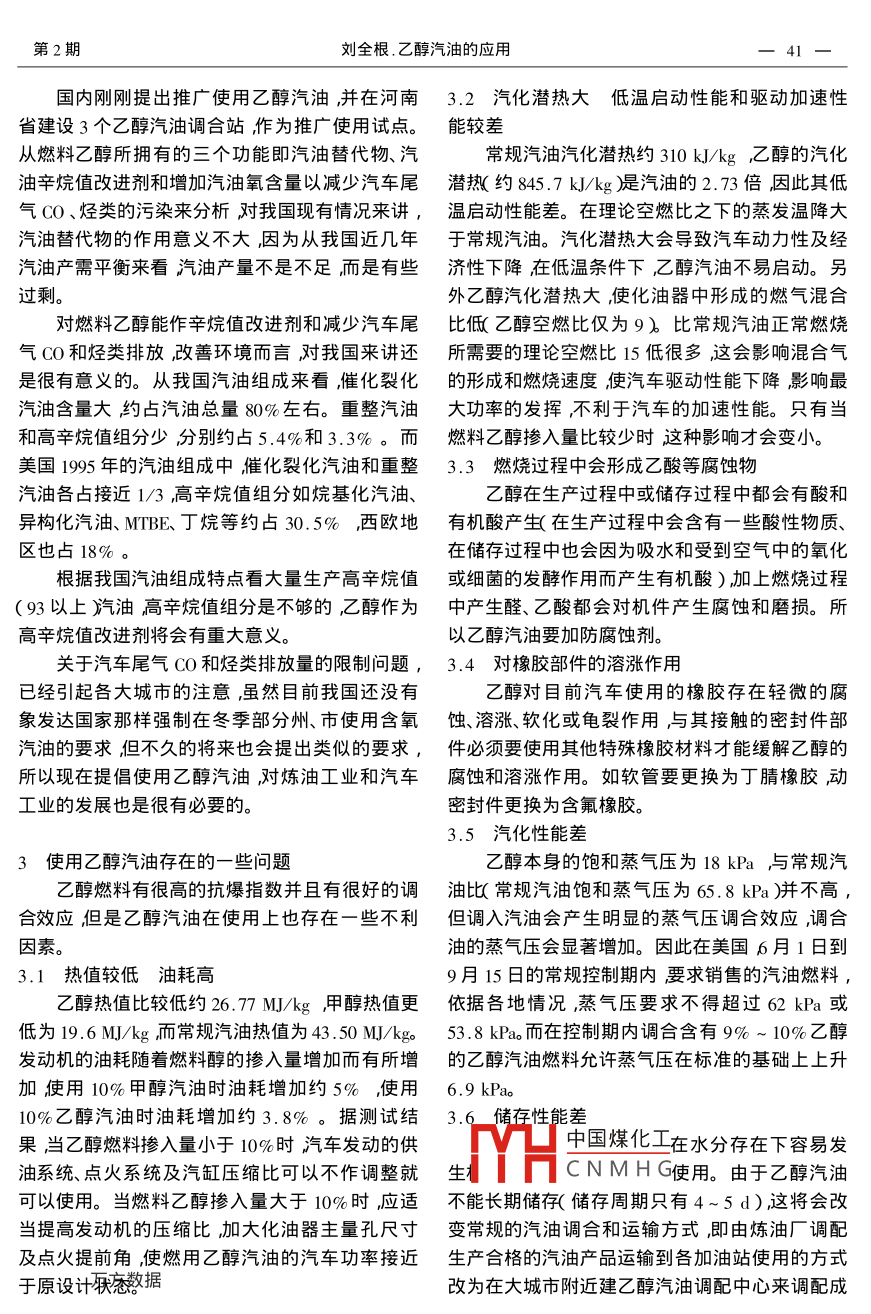 煉油設(shè)計(jì)2002年2月PETROLEUM REFINERY ENGINEERING第32卷第2期晶添雜乙醇汽油的應(yīng)用劉全根中國(guó)石化咨詢公改北京市10009摘要燃料乙醇是一種富含氧氧質(zhì)量含量33%)高辛烷儐RON為1ν9舶汽油調(diào)合組分。在國(guó)外曾以汽油替代物、辛烷值改進(jìn)劑和增加汽油氧含量三大作用添加到汽油中。國(guó)內(nèi)剛剛提岀乙醇汽油使用問(wèn)題。使用乙醇汽油有很多優(yōu)點(diǎn)但也存在一些如親水、油耗高、啟動(dòng)性能差、對(duì)橡膠部件溶漲、汽化性能差和經(jīng)濟(jì)性差等缺點(diǎn)特別是用糧食生產(chǎn)燃料乙醇按汽油價(jià)岀售存在經(jīng)濟(jì)性差問(wèn)題。探討了乙醇汽油補(bǔ)貼的方案僅供有關(guān)部門在制定乙醇汽油補(bǔ)貼政策時(shí)參考。主題詞乙醇汽油料應(yīng)用經(jīng)濟(jì)分析近年來(lái)我國(guó)糧食生產(chǎn)連年豐收糧食有了較產(chǎn)品溫度有關(guān)溫度越低耐水性越差,一般在溫大的剩余。國(guó)家為了支持農(nóng)業(yè)發(fā)展考慮用剩余度-34~15℃時(shí),耐水量從0.2%到0.5%也就糧轉(zhuǎn)化成乙醇進(jìn)一步利用,提岀生產(chǎn)乙醇汽油是說(shuō)常溫下水含量0.5%時(shí),乙醇汽油就會(huì)發(fā)生問(wèn)題。相分離。在汽車油箱里發(fā)生相分離就會(huì)影響汽車正常使用。所以乙醇汽油要嚴(yán)防系統(tǒng)帶水。1燃料乙醇的性能用糧食作原料的燃料乙醇生產(chǎn)工藝與食用乙2國(guó)內(nèi)外燃料乙醇應(yīng)用情況醇基本相同唯一的區(qū)別是食用乙醇要求乙醇體國(guó)外汽油中添加燃料乙醇始于20世紀(jì)70年積含量95%要求控制雜醇的含量,般要經(jīng)脫雜代后期當(dāng)時(shí)美國(guó)燃料乙醇的產(chǎn)量已經(jīng)達(dá)到4.18醇工序。但燃料乙醇要求醇的體積含量在∞.8%Mt/a。一直到20世紀(jì)80年代初燃料乙醇僅作為以上,一般都在食用乙醇的基礎(chǔ)上進(jìn)一步脫水控汽油替代物加入到汽油中以增加汽油產(chǎn)量滿足制水的體積含量達(dá)到1%以下為了區(qū)別于食用乙市場(chǎng)需要。80年代后期在燃料市場(chǎng)中的乙醇的醇燃料乙醇一般都摻兌5%體積含量左右的變性主要作用開(kāi)始變?yōu)樾镣橹蹈倪M(jìn)劑和替代汽油中的劑變性劑一般為無(wú)鉛汽油或無(wú)鉛的烴類其餾程四乙基鉛以作為改善環(huán)境污染的產(chǎn)品來(lái)使用。在汽油范圍之內(nèi)直到90年代初羨國(guó)一些州為了減少汽車尾國(guó)內(nèi)外研究結(jié)果證明乙醇是很好的辛烷值改氣排放的CO氣體在強(qiáng)制推行含氧燃料計(jì)劃中開(kāi)進(jìn)劑可以替代四乙基鉛或MIBE烷基化油等來(lái)始使用乙醇和其它含氧化合物。提高汽油辛烷值。目前美國(guó)約有18個(gè)州在使用新配方汽油般汽油發(fā)動(dòng)機(jī)在不作大的改動(dòng)的情況下,新配方汽油的用量約占全美國(guó)汽油消耗量350允許調(diào)入燃料乙醇的最大量為10%這時(shí)乙醇汽Mt/a的1/3。其中約有85%的新配方汽油使用油總的氧含量在3.5%左右。如果允許發(fā)動(dòng)機(jī)有MBE大約8%的新配方汽油使用燃料乙醇其中較大的改動(dòng)或用特種乙醇發(fā)動(dòng)機(jī)也有將純的乙大多數(shù)地區(qū)含氧汽油或新配方汽油的燃料乙醇體醇或接近于純的乙醇作燃料使用的。如國(guó)外有積中國(guó)煤化工區(qū)燃料乙醇體積含量FA8(85%的變性乙醇和15%的汽油的調(diào)合物廂為CNMHGEd100的燃料汽車。乙醇的另一個(gè)特點(diǎn)是親水性能以任何比例收稿日期2001-08-20。作者簡(jiǎn)介:高級(jí)工程師原中國(guó)石化咨詢公司煉油處處長(zhǎng)與水混合乙醇汽油還具有吸水性長(zhǎng)期儲(chǔ)存會(huì)使1%65年畢業(yè)于北京石油學(xué)院煉制系曾從事設(shè)計(jì)以及煉油發(fā)水的含量增且乙醇汽油相分離的耐水性和展規(guī)劃、項(xiàng)目評(píng)估和咨詢工作第2期劉全根,乙醇汽油的應(yīng)用41國(guó)內(nèi)剛剛提岀推廣使用乙醇汽油,并在河南3.2汽化澘熱大低溫啟動(dòng)性能和驅(qū)動(dòng)加速性省建設(shè)3個(gè)乙醇汽油調(diào)合站作為推廣使用試點(diǎn)。能較差從燃料乙醇所擁有的三個(gè)功能即汽油替代物、汽常規(guī)汽油汽化潛熱約310kJ/kg乙醇的汽化油辛烷值改進(jìn)劑和增加汽油氧含量以減少汽車尾澘熱(約845.7kJ/kg湜汽油的2.73倍因此其低氣CO、烴類的污染來(lái)分析對(duì)我國(guó)現(xiàn)有情況來(lái)講,溫啟動(dòng)性能差。在理論空燃比之下的蒸發(fā)溫降大汽油替代物的作用意乂不大因?yàn)閺奈覈?guó)近幾年于常規(guī)汽油。汽化潛熱大會(huì)導(dǎo)致汽車動(dòng)力性及經(jīng)汽油產(chǎn)需平衡來(lái)看汽油產(chǎn)量不是不足而是有些濟(jì)性下降在低溫條件下乙醇汽油不易啟動(dòng)。另過(guò)剩外乙醇汽化潛熱大,使化油器中形成的燃?xì)饣旌蠈?duì)燃料乙醇能作辛烷值改進(jìn)劑和減少汽車尾比俽乙醇空燃比僅為9)比常規(guī)汽油正常燃燒氣CO和烴類排放改善環(huán)境而言對(duì)我國(guó)來(lái)講還所需要的理論空燃比15低很多這會(huì)影響混合氣是很有意義的。從我國(guó)汽油組成來(lái)看,催化裂化的形成和燃燒速度使汽車驅(qū)動(dòng)性能下降影響最汽油含量大約占汽油總量80%左右。重整汽油大功率的發(fā)揮不利于汽車的加速性能。只有當(dāng)和高辛烷值