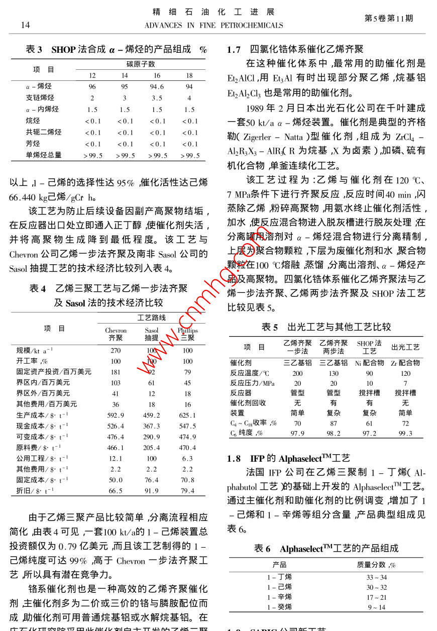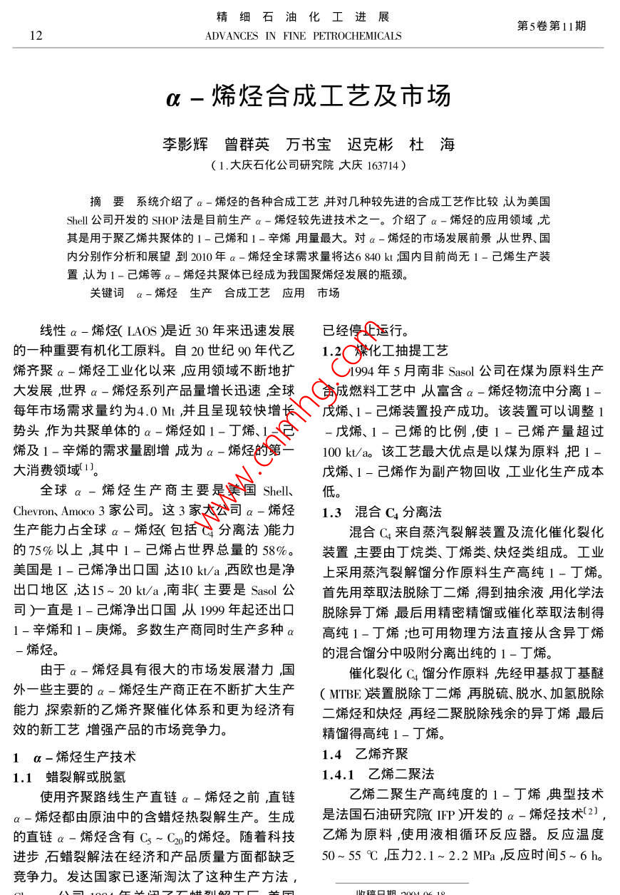 精細(xì)石油化工進(jìn)展第5卷第11期2ADVANCES IN FINE PETROCHEMICALSa-烯烴合成工藝及市場(chǎng)李影輝曾群英萬(wàn)書(shū)寶遲克彬杜海( 1.大慶石化公司研究院大慶163714)摘要系統(tǒng)介紹了a-烯烴的各種合成工藝并對(duì)幾種較先進(jìn)的合成工藝作比較,認(rèn)為美國(guó)Shell公司開(kāi)發(fā)的SHOP法是目前生產(chǎn)a-烯烴較先進(jìn)技術(shù)之一。介紹了a-烯烴的應(yīng)用領(lǐng)域尤其是用于聚乙烯共聚體的1-己烯和1-辛烯用量最大。對(duì)a-烯烴的市場(chǎng)發(fā)展前景,從世界、國(guó)內(nèi)分別作分析和展望到2010年a-烯烴全球需求量將達(dá)6840kt;國(guó)內(nèi)目前尚無(wú)1-己烯生產(chǎn)裝置,認(rèn)為1-己烯等a-烯烴共聚體已經(jīng)成為我國(guó)聚烯烴發(fā)展的瓶頸。關(guān)鍵詞a-烯烴 生產(chǎn)合成工藝應(yīng)用市場(chǎng)線性a-烯烴(LAOS)是近30年來(lái)迅速發(fā)展已經(jīng)停止運(yùn)行。的一種重要有機(jī)化工原料。自20世紀(jì)90年代乙1.2 煤化工抽提工藝烯齊聚a-烯烴工業(yè)化以來(lái),應(yīng)用領(lǐng)域不斷地?cái)U(kuò)1994年5月南非Sasol公司在煤為原料生產(chǎn)大發(fā)展,世界a-烯烴系列產(chǎn)品量增長(zhǎng)迅速,全球合成燃料工藝中,從富含a-烯烴物流中分離1-每年市場(chǎng)需求量約為4.0 Mt ,并且呈現(xiàn)較快增長(zhǎng)戊烯、1-己烯裝置投產(chǎn)成功。該裝置可以調(diào)整1勢(shì)頭,作為共聚單體的a -烯烴如1-丁烯、1-己-戊烯、1-己烯的比例,使1-己烯產(chǎn)量超過(guò)烯及1 -辛烯的需求量劇增成為a -烯烴的第一100 kt/ao該工藝最大優(yōu)點(diǎn)是以煤為原料把1-大消費(fèi)領(lǐng)域(1。戊烯、1-己烯作為副產(chǎn)物回收工業(yè)化生產(chǎn)成本全球a -烯烴生產(chǎn)商主要是美國(guó)Shell、低。Chevron. Amoeco 3家公司。這3家大公司a-烯烴1.3 混合C4分離法生產(chǎn)能力占全球a-烯烴(包括C4分離法)能力混合C4來(lái)自蒸汽裂解裝置及流化催化裂化的75%以上其中1-己烯占世界總量的58%。裝置主要由丁烷類(lèi)、丁烯類(lèi)、炔烴類(lèi)組成。工業(yè)美國(guó)是1-己烯凈出口國(guó)達(dá)10 kt/a ,西歐也是凈上采用蒸汽裂解餾分作原料生產(chǎn)高純1 -丁烯。出口地區(qū),達(dá)15~ 20 kt/a ,南非(主要是Sasol 公.首先用萃取法脫除丁二烯得到抽余液用化學(xué)法司)-直是1-己烯凈出口國(guó)從1999年起還出口脫除異丁烯最后用精密精餾或催化萃取法制得1-辛烯和1-庚烯。多數(shù)生產(chǎn)商同時(shí)生產(chǎn)多種a高純1-丁烯;也可用物理方法直接從含異丁烯-烯烴。的混合餾分中吸附分離出純的1 -丁烯。由于a-烯烴具有很大的市場(chǎng)發(fā)展?jié)摿?國(guó)催化裂化C4餾分作原料先經(jīng)甲基叔丁基醚外一些主要的a-烯烴生產(chǎn)商正在不斷擴(kuò)大生產(chǎn)( MTBE )裝置脫除丁二烯再脫硫、脫水、加氫脫除能力探索新的乙烯齊聚催化體系和更為經(jīng)濟(jì)有二烯烴和炔烴再經(jīng)二聚脫除殘余的異丁烯最后效的新工藝增強(qiáng)產(chǎn)品的市場(chǎng)競(jìng)爭(zhēng)力。精餾得高純1-丁烯。1 a- 烯烴生產(chǎn)技術(shù)1.4乙烯齊聚1.1蠟裂解或脫氫1.4.1 乙烯二聚法使用齊聚路線生產(chǎn)直鏈a-烯烴之前,直鏈乙烯二聚生產(chǎn)高純度的1-丁烯典型技術(shù)a -烯烴都由原油中的含蠟烴熱裂解生產(chǎn)。生成是法國(guó)石油研究院( IFP )開(kāi)發(fā)的a-烯烴技術(shù)(2) ,的直鏈a-烯烴含有Cs~ C2的烯烴。隨著科技乙烯為原料,使用液相循環(huán)反應(yīng)器。反應(yīng)溫度進(jìn)步,石蠟裂解法在經(jīng)濟(jì)和產(chǎn)品質(zhì)量方面都缺乏50~55 C壓力2.1~ 2.2 MPa反應(yīng)時(shí)間5~6 ho競(jìng)爭(zhēng)力。發(fā)達(dá)國(guó)家已逐漸淘汰了這種生產(chǎn)方法,Chevron公司1984年關(guān)閉了石蠟裂解工廠,美國(guó)收稿日期2004-06-18。作者簡(jiǎn)介李影輝,工程師,從事天然氣化工及下游產(chǎn)品Shell公司在歐洲的3個(gè)石蠟裂解工廠至少兩個(gè)開(kāi)發(fā)。2004年11月李影輝等. a-烯烴合成工藝及市場(chǎng)13單程轉(zhuǎn)化率80%~85%,1-丁烯選擇性93%。劑的制備、乙烯-步法齊聚、兩步法鏈增長(zhǎng)和鏈置此工藝于1987年在泰國(guó)實(shí)現(xiàn)工業(yè)化生產(chǎn)裝置生換反應(yīng)和a-烯烴產(chǎn)品分離。產(chǎn)能力3 kt/a ,目前專(zhuān)利許可裝置已有13套總生乙烯兩步法齊聚工藝的主要優(yōu)點(diǎn)是鏈增長(zhǎng)和產(chǎn)能力超過(guò)210 kt/ao鏈置換反應(yīng)分別在兩個(gè)反應(yīng)器中進(jìn)行,便于控制1.4.2 乙烯-步法齊聚產(chǎn)物分布。缺點(diǎn)是反應(yīng)操作條件很苛刻生產(chǎn)安由乙烯-步法齊聚制a-烯烴的裝置,最早全問(wèn)題較突出流程較一步法長(zhǎng) ,設(shè)備投資大。-由美國(guó)Gulf公司1964年在Texas州建成,生產(chǎn)能步法和兩步法產(chǎn)品質(zhì)量比較見(jiàn)表2。力60kt/ao現(xiàn)在Chevron公司采用此方法,并以表2乙烯一 步法和兩步法齊聚產(chǎn)品質(zhì)量比較A( C2Hs》為催化劑鏈增長(zhǎng)反應(yīng)和鏈置換反應(yīng)-產(chǎn)品含量,%步完成。溫度100 C時(shí)的反應(yīng)主要是鏈增長(zhǎng)反項(xiàng)目?jī)刹椒☉?yīng),而在130 C時(shí)置換反應(yīng)大于鏈增長(zhǎng)反應(yīng)。a-烯烴91~9763-97.5Chevron公司產(chǎn)品按正態(tài)分布但可根據(jù)市場(chǎng)需求支鏈烯烴1.6~7.8.1.9~29.1