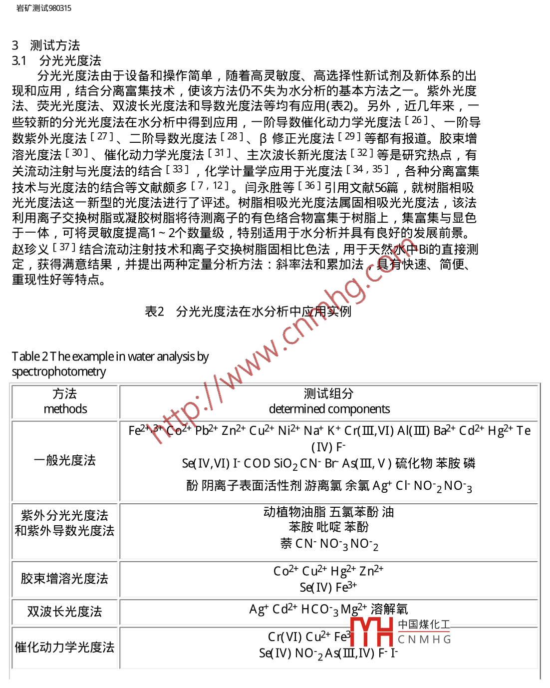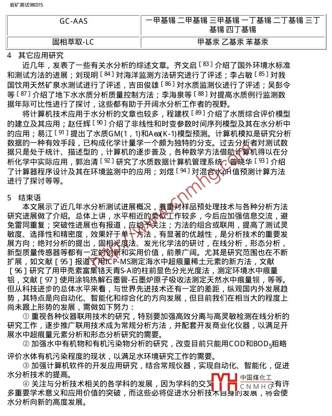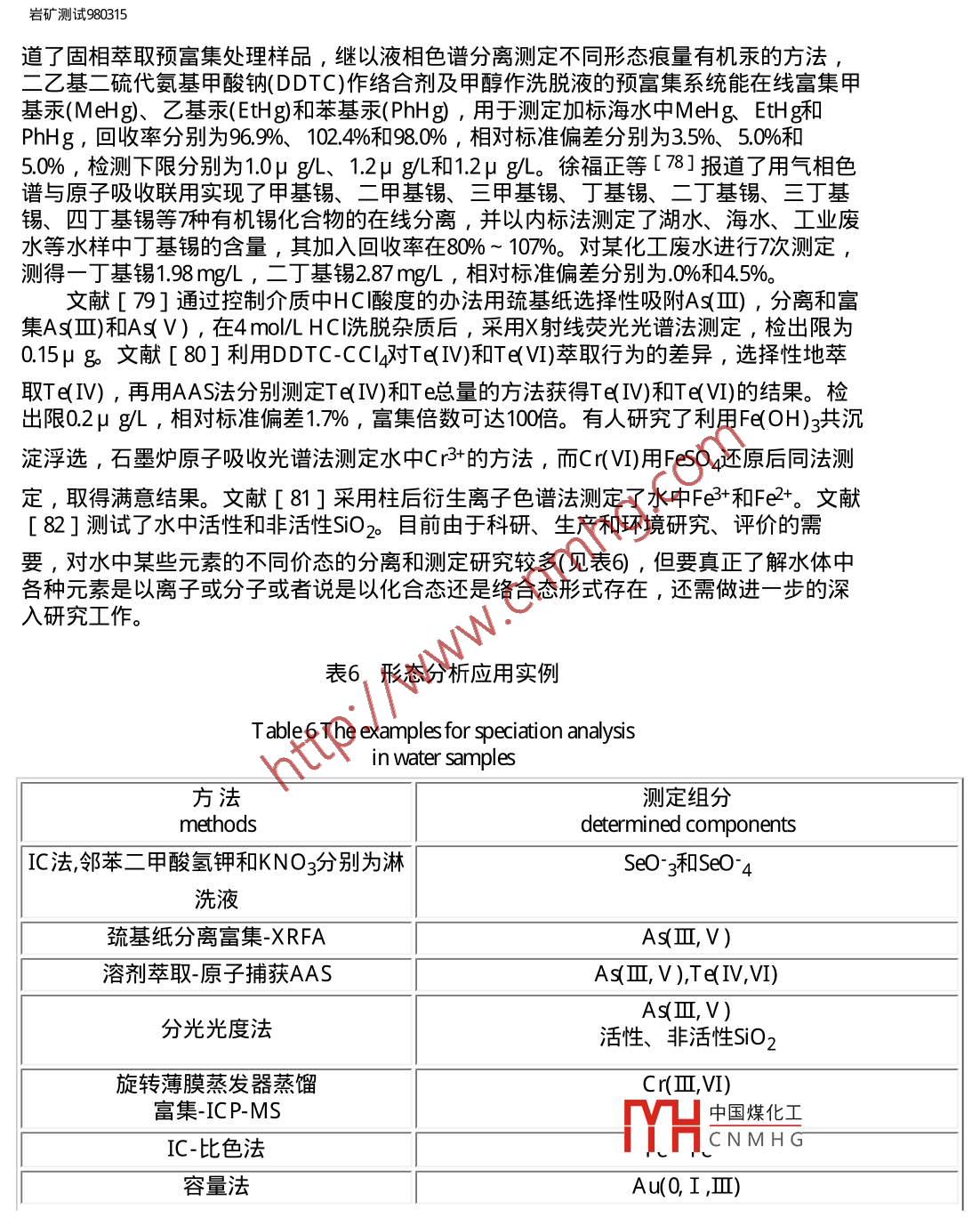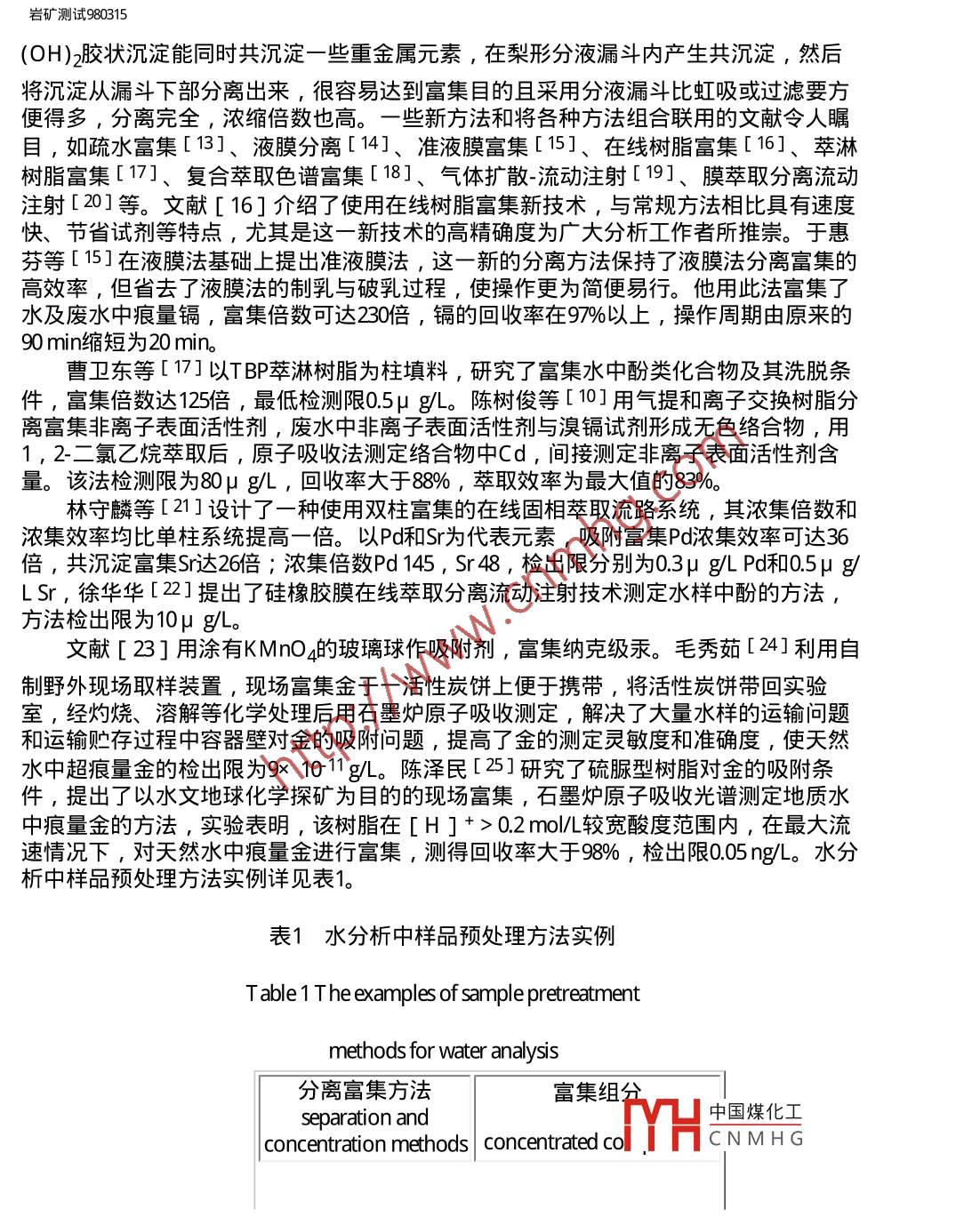 巖礦測試980315用inanto巖礦測試科技期刊WANFANG DATAROCK AND MINERAL ANALYSIS第17卷第3期( 1998年)水分析技術(shù)進(jìn)展王蘇明山西地質(zhì)工程勘察院太原030024王亞平中國地質(zhì)科學(xué)院巖礦測試技術(shù)研究所北京100037摘要綜述了 1992年以來水分析技術(shù)的進(jìn)展,內(nèi)容包括樣品預(yù)處理技術(shù)和測試方法,引用國內(nèi)文獻(xiàn)97篇。關(guān)鍵詞水分析方法 預(yù)處理技術(shù) 綜述1概述水資源制約社會(huì)發(fā)展的重要性已越來越明顯,100多年前,水分析就在分析教科書中自成章節(jié),且歷來是分析化學(xué)研究和應(yīng)用極為活躍的領(lǐng)域之- -。近年來,我國水分析技術(shù)獲得了較顯著的發(fā)展,出現(xiàn)了許多新的分析方法和技術(shù),無論是分離富集手段的多樣性、實(shí)用性,還是元素分析的靈敏度、準(zhǔn)確度和精密度及快速測定方法的建立,都有較大進(jìn)步。以計(jì)算機(jī)應(yīng)用為主要標(biāo)志的信息時(shí)代的到來,促進(jìn)了水分析自動(dòng)檢測技術(shù)的發(fā)展,現(xiàn)代科學(xué)技術(shù)各學(xué)科的互相滲透使水分析不斷拓寬服務(wù)新領(lǐng)域,在地質(zhì)找礦、核能、水質(zhì)評(píng)價(jià)、天然礦泉水評(píng)價(jià)、環(huán)境評(píng)價(jià)等方面均獲得進(jìn)展。例如:熊昭春[ 1]的”水系及其沉積物、殘坡積物中金的價(jià)態(tài)分布研究”為查明地質(zhì)體內(nèi)痕量金各種存在形式,為地質(zhì)找礦、地球化學(xué)、環(huán)境生態(tài)研究提供了豐富可靠的信息,在尋找隱伏金礦床方面成為一種化學(xué)評(píng)價(jià)化探金異常的新手段。當(dāng)然,從國內(nèi)外資料報(bào)道來看, 我們還存在-定的差距。其一是自動(dòng)化分析程度.還低,首先微機(jī)技術(shù)的應(yīng)用研究差距較大,一些常規(guī)分析儀器尚未實(shí)現(xiàn)智能化,流動(dòng)注射、在線分析等方面的應(yīng)用推廠不夠;其二是痕量組分的分離富集技術(shù)深化研究不.夠,一部分元素的檢測下限還滿足不了要求,飲用天然礦泉水中指標(biāo)元素和部分痕量指標(biāo)元素的測定結(jié)果波動(dòng)較大,不穩(wěn)定, 缺少仲裁分析方法;其三是水中價(jià)態(tài)分析技術(shù)研究甚少;其四是水中痕量有機(jī)物質(zhì)的測定技術(shù)研究不夠。本文僅對1992年以來發(fā)表的有關(guān)研究文章加以綜述。2樣品預(yù)處理技術(shù)在水分析中常常要將待測離子富集并與其共存的干擾組分分離開,這種分離有時(shí)可借助適宜的測試技術(shù)的選擇性、靈敏度的提高,但更多的還具廣聲7的街霞花弋來解決。文獻(xiàn)報(bào)道的水中痕量元素的分離富集方法主要有:共沉淀HCNMHG濃縮[4]、離子交換[5]、活性炭吸附[6]、 有機(jī)試劑萃取[7]、泡沫塑料富集18,9]、絡(luò)合萃取[10]、巰基棉富集[11]、黃原脂棉富集[12]等。如宋家銓[2]根據(jù)Mgfle/// Vqkykcsy980315.htm (第1/ 16頁) 201023-23 12:52:48,巖礦測試980315(OH)2膠狀沉淀能同時(shí)共沉淀一些重金屬元素,在梨形分液漏斗內(nèi)產(chǎn)生共沉淀,然后將沉淀從漏斗下部分離出來,很容易達(dá)到富集目的且采用分液漏斗比虹吸或過濾要方便得多,分離完全,濃縮倍數(shù)也高。一些新方法和將各種方法組合聯(lián)用的文獻(xiàn)令人矚目,如疏水富集[13]、液膜分離[14]、準(zhǔn)液膜富集[15]、在線樹脂富集[16]、 萃淋樹脂富集[17]、復(fù)合萃取色譜富集[18]、氣體擴(kuò)散流動(dòng)注射[19]、膜萃取分離流動(dòng)注射[20]等。文獻(xiàn)[16]介紹了使用在線樹脂富集新技術(shù),與常規(guī)方法相比具有速度快、節(jié)省試劑等特點(diǎn),尤其是這-新技術(shù)的高精確度為廣大分析工作者所推崇。于惠芬等[15]在液膜法基礎(chǔ)上提出準(zhǔn)液膜法,這--新的分離方法保持了液膜法分離富集的高效率,但省去了液膜法的制乳與破乳過程,使操作更為簡便易行。他用此法富集了水及廢水中痕量鎘,富集倍數(shù)可達(dá)230倍,鎘的回收率在97%以上,操作周期由原來的90 min縮短為20 min。,曹衛(wèi)東等[ 17]以T BP萃淋樹脂為柱填料,研究了富集水中酚類化合物及其洗脫條件,富集倍數(shù)達(dá)125倍, 最低檢測限0.5μ g/L。陳樹俊等[ 10]用氣提和離子交換樹脂分離富集非離子表面活性劑,廢水中非離子表面活性劑與溴鎘試劑形成無色絡(luò)合物,用1 , 2-二氯乙烷萃取后,原子吸收法測定絡(luò)合物中Cd ,間接測定非離子表面活性劑含量。該法檢測限為80μ g/L ,回收率大于88% ,萃取效率為最大值的83%。林守麟等[21]設(shè)計(jì)了一種使用雙柱富集的在線固相萃取流路系統(tǒng),其濃集倍數(shù)和濃集效率均比單柱系統(tǒng)提高-倍。以Pd和Sr為代表元素,吸附富集Pd濃集效率可達(dá)36倍,共沉淀富集Sr達(dá)26倍;濃集倍數(shù)Pd 145 , Sr 48 ,檢出限分別為0.3μ g/L Pd和0.5μ g/LSr ,徐華華[22]提出了硅橡膠膜在線萃取分離流動(dòng)注射技術(shù)測定水樣中酚的方法,方法檢出限為10μ g/L。文獻(xiàn)[23]用涂有KMnOa的玻璃球作吸附劑,富集納克級(jí)汞。毛秀茹[24]利用自制野外現(xiàn)場取樣裝置,現(xiàn)場富集金于一活性炭餅.上便于攜帶,將活性炭餅帶回實(shí)驗(yàn)室,經(jīng)灼燒、溶解等化學(xué)處理后用石墨爐原子吸收測定,解決了大量水樣的運(yùn)輸問題和運(yùn)輸貯存過程中容器壁對金的