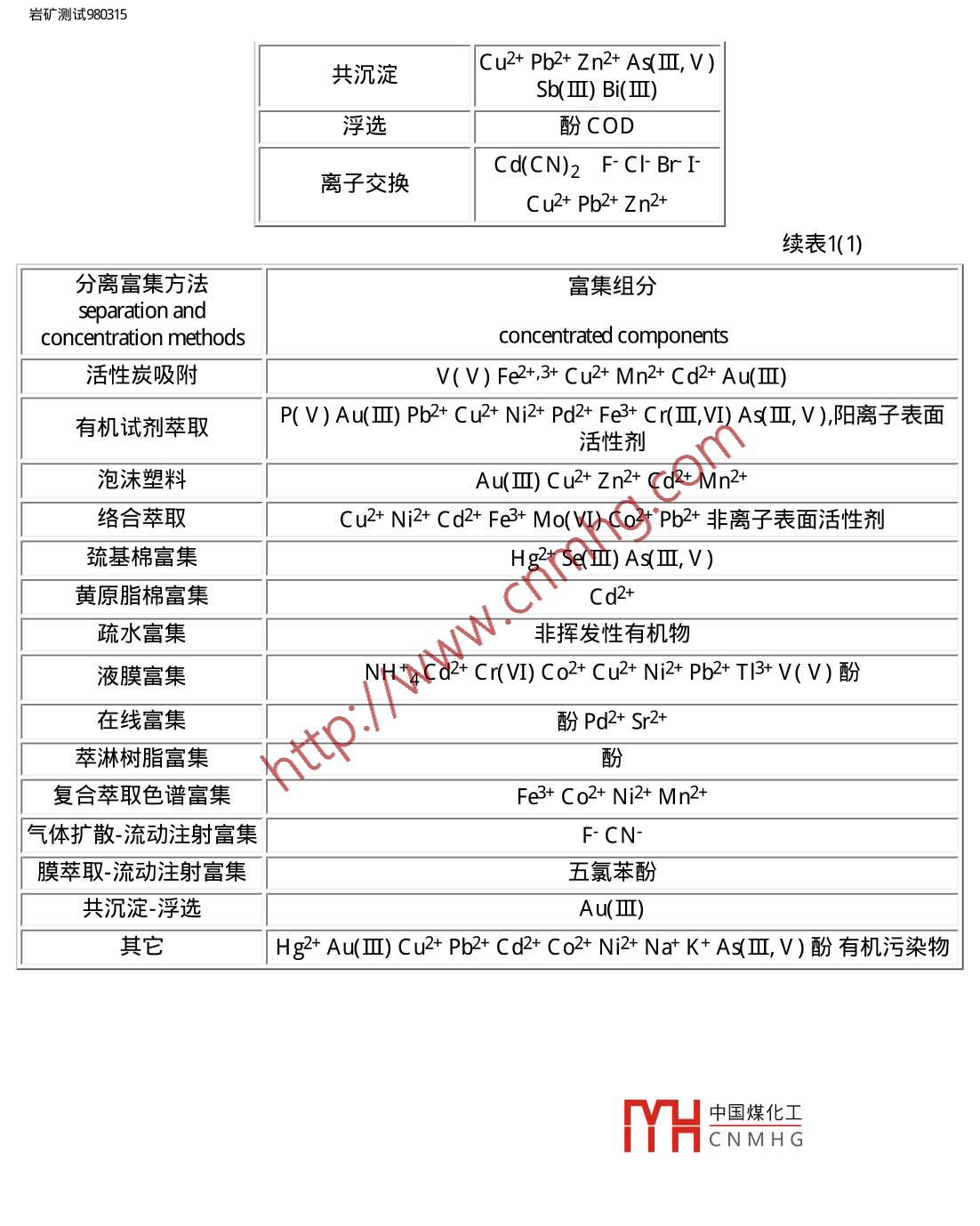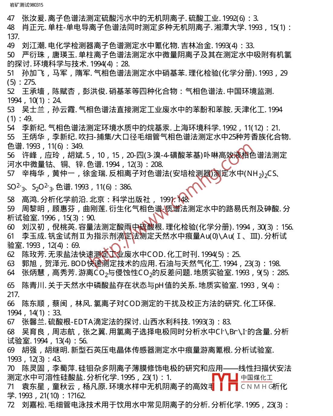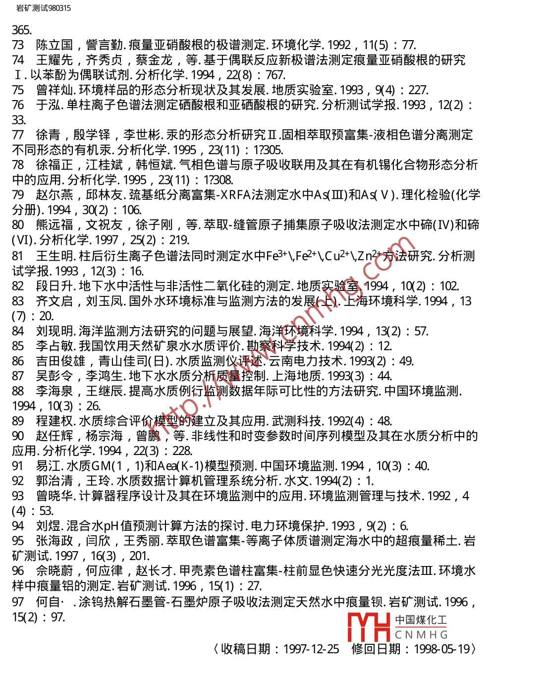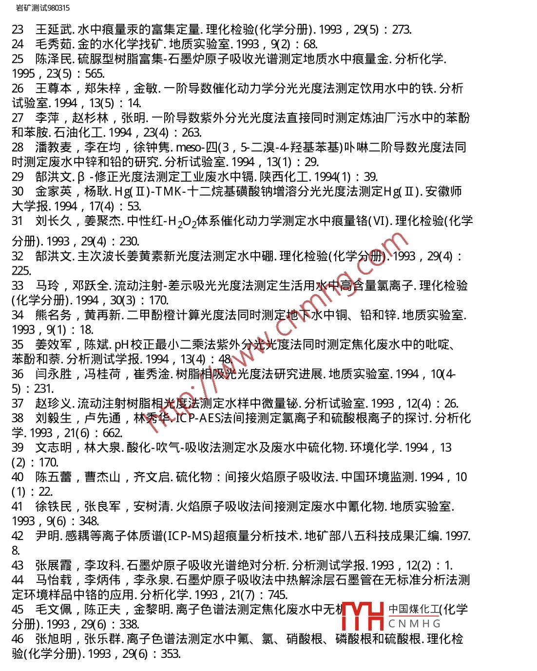 巖礦測試980315用inanto巖礦測試科技期刊WANFANG DATAROCK AND MINERAL ANALYSIS第17卷第3期( 1998年)水分析技術(shù)進(jìn)展王蘇明山西地質(zhì)工程勘察院太原030024王亞平中國地質(zhì)科學(xué)院巖礦測試技術(shù)研究所北京100037摘要綜述了 1992年以來水分析技術(shù)的進(jìn)展,內(nèi)容包括樣品預(yù)處理技術(shù)和測試方法,引用國內(nèi)文獻(xiàn)97篇。關(guān)鍵詞水分析方法 預(yù)處理技術(shù) 綜述1概述水資源制約社會(huì)發(fā)展的重要性已越來越明顯,100多年前,水分析就在分析教科書中自成章節(jié),且歷來是分析化學(xué)研究和應(yīng)用極為活躍的領(lǐng)域之- -。近年來,我國水分析技術(shù)獲得了較顯著的發(fā)展,出現(xiàn)了許多新的分析方法和技術(shù),無論是分離富集手段的多樣性、實(shí)用性,還是元素分析的靈敏度、準(zhǔn)確度和精密度及快速測定方法的建立,都有較大進(jìn)步。以計(jì)算機(jī)應(yīng)用為主要標(biāo)志的信息時(shí)代的到來,促進(jìn)了水分析自動(dòng)檢測技術(shù)的發(fā)展,現(xiàn)代科學(xué)技術(shù)各學(xué)科的互相滲透使水分析不斷拓寬服務(wù)新領(lǐng)域,在地質(zhì)找礦、核能、水質(zhì)評(píng)價(jià)、天然礦泉水評(píng)價(jià)、環(huán)境評(píng)價(jià)等方面均獲得進(jìn)展。例如:熊昭春[ 1]的”水系及其沉積物、殘坡積物中金的價(jià)態(tài)分布研究”為查明地質(zhì)體內(nèi)痕量金各種存在形式,為地質(zhì)找礦、地球化學(xué)、環(huán)境生態(tài)研究提供了豐富可靠的信息,在尋找隱伏金礦床方面成為一種化學(xué)評(píng)價(jià)化探金異常的新手段。當(dāng)然,從國內(nèi)外資料報(bào)道來看, 我們還存在-定的差距。其一是自動(dòng)化分析程度.還低,首先微機(jī)技術(shù)的應(yīng)用研究差距較大,一些常規(guī)分析儀器尚未實(shí)現(xiàn)智能化,流動(dòng)注射、在線分析等方面的應(yīng)用推廠不夠;其二是痕量組分的分離富集技術(shù)深化研究不.夠,一部分元素的檢測下限還滿足不了要求,飲用天然礦泉水中指標(biāo)元素和部分痕量指標(biāo)元素的測定結(jié)果波動(dòng)較大,不穩(wěn)定, 缺少仲裁分析方法;其三是水中價(jià)態(tài)分析技術(shù)研究甚少;其四是水中痕量有機(jī)物質(zhì)的測定技術(shù)研究不夠。本文僅對1992年以來發(fā)表的有關(guān)研究文章加以綜述。2樣品預(yù)處理技術(shù)在水分析中常常要將待測離子富集并與其共存的干擾組分分離開,這種分離有時(shí)可借助適宜的測試技術(shù)的選擇性、靈敏度的提高,但更多的還具廣聲7的街霞花弋來解決。文獻(xiàn)報(bào)道的水中痕量元素的分離富集方法主要有:共沉淀HCNMHG濃縮[4]、離子交換[5]、活性炭吸附[6]、 有機(jī)試劑萃取[7]、泡沫塑料富集18,9]、絡(luò)合萃取[10]、巰基棉富集[11]、黃原脂棉富集[12]等。如宋家銓[2]根據(jù)Mgfle/// Vqkykcsy980315.htm (第1/ 16頁) 201023-23 12:52:48,巖礦測試980315(OH)2膠狀沉淀能同時(shí)共沉淀一些重金屬元素,在梨形分液漏斗內(nèi)產(chǎn)生共沉淀,然后將沉淀從漏斗下部分離出來,很容易達(dá)到富集目的且采用分液漏斗比虹吸或過濾要方便得多,分離完全,濃縮倍數(shù)也高。一些新方法和將各種方法組合聯(lián)用的文獻(xiàn)令人矚目,如疏水富集[13]、液膜分離[14]、準(zhǔn)液膜富集[15]、在線樹脂富集[16]、 萃淋樹脂富集[17]、復(fù)合萃取色譜富集[18]、氣體擴(kuò)散流動(dòng)注射[19]、膜萃取分離流動(dòng)注射[20]等。文獻(xiàn)[16]介紹了使用在線樹脂富集新技術(shù),與常規(guī)方法相比具有速度快、節(jié)省試劑等特點(diǎn),尤其是這-新技術(shù)的高精確度為廣大分析工作者所推崇。于惠芬等[15]在液膜法基礎(chǔ)上提出準(zhǔn)液膜法,這--新的分離方法保持了液膜法分離富集的高效率,但省去了液膜法的制乳與破乳過程,使操作更為簡便易行。他用此法富集了水及廢水中痕量鎘,富集倍數(shù)可達(dá)230倍,鎘的回收率在97%以上,操作周期由原來的90 min縮短為20 min。,曹衛(wèi)東等[ 17]以T BP萃淋樹脂為柱填料,研究了富集水中酚類化合物及其洗脫條件,富集倍數(shù)達(dá)125倍, 最低檢測限0.5μ g/L。陳樹俊等[ 10]用氣提和離子交換樹脂分離富集非離子表面活性劑,廢水中非離子表面活性劑與溴鎘試劑形成無色絡(luò)合物,用1 , 2-二氯乙烷萃取后,原子吸收法測定絡(luò)合物中Cd ,間接測定非離子表面活性劑含量。該法檢測限為80μ g/L ,回收率大于88% ,萃取效率為最大值的83%。林守麟等[21]設(shè)計(jì)了一種使用雙柱富集的在線固相萃取流路系統(tǒng),其濃集倍數(shù)和濃集效率均比單柱系統(tǒng)提高-倍。以Pd和Sr為代表元素,吸附富集Pd濃集效率可達(dá)36倍,共沉淀富集Sr達(dá)26倍;濃集倍數(shù)Pd 145 , Sr 48 ,檢出限分別為0.3μ g/L Pd和0.5μ g/LSr ,徐華華[22]提出了硅橡膠膜在線萃取分離流動(dòng)注射技術(shù)測定水樣中酚的方法,方法檢出限為10μ g/L。文獻(xiàn)[23]用涂有KMnOa的玻璃球作吸附劑,富集納克級(jí)汞。毛秀茹[24]利用自制野外現(xiàn)場取樣裝置,現(xiàn)場富集金于一活性炭餅.上便于攜帶,將活性炭餅帶回實(shí)驗(yàn)室,經(jīng)灼燒、溶解等化學(xué)處理后用石墨爐原子吸收測定,解決了大量水樣的運(yùn)輸問題和運(yùn)輸貯存過程中容器壁對金的