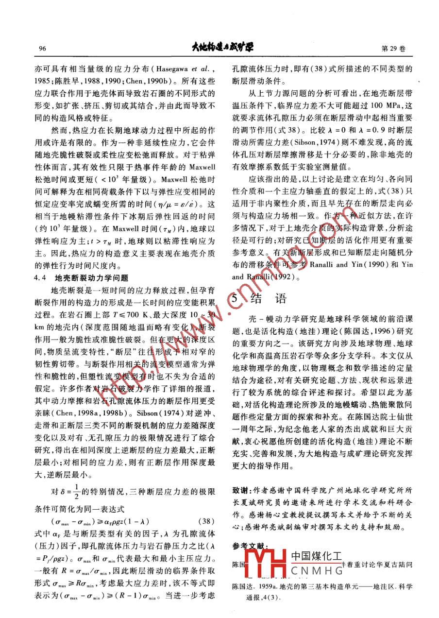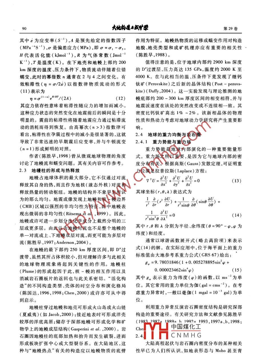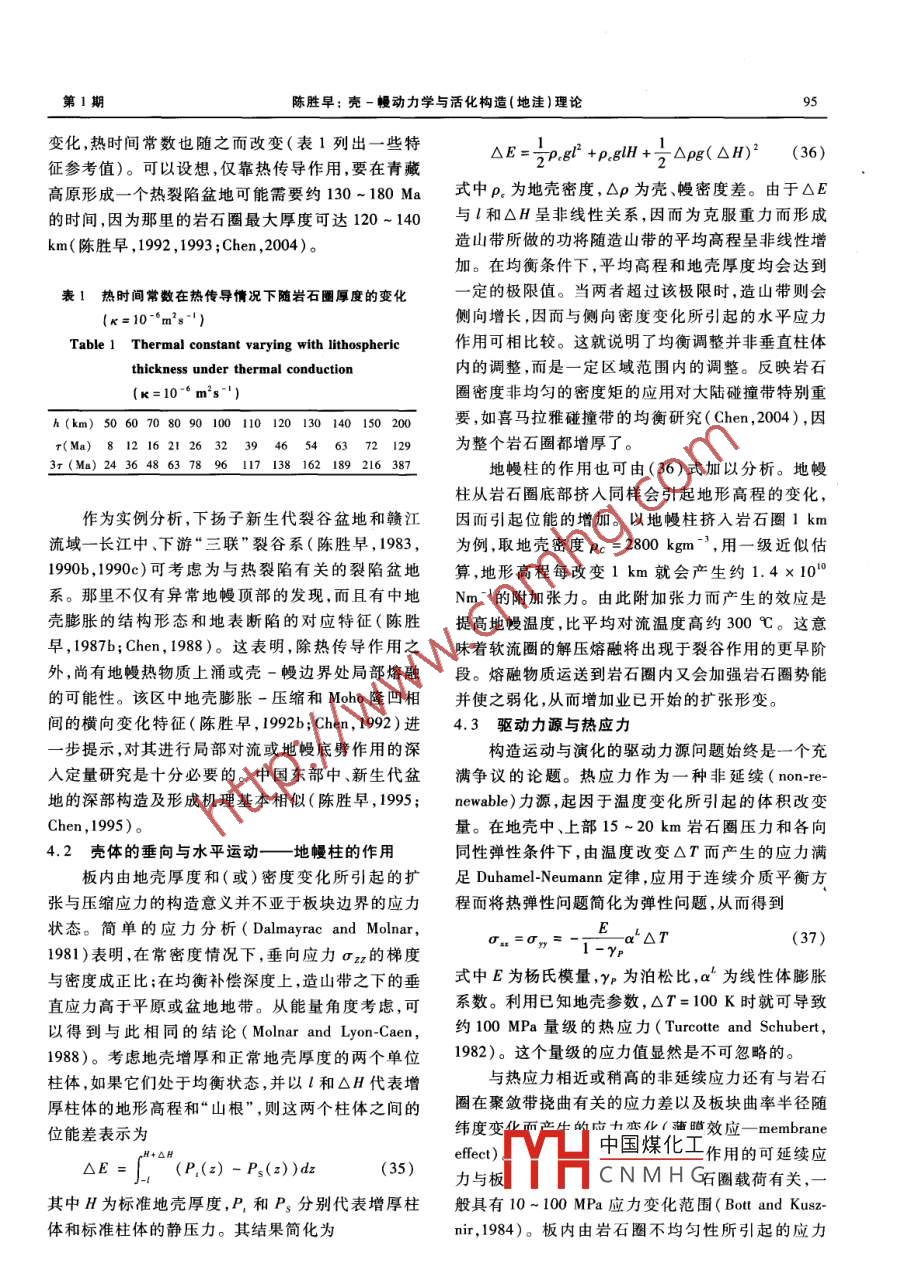 卷( Volume)29,期( Number)1,總(SUM)104頁( Pages)87~98,2005,2(Feb,2005)大地構(gòu)造與成礦學(xué)Geotectonica et Metallog殼-幔動力學(xué)與活化構(gòu)造(地洼)理論陳勝早Geomatrix Consultants, Inc, 2101 Webster St, 12 Floor, Oakland, CA 94612, USA)摘要:殼-幔動力學(xué)是地球內(nèi)部物理學(xué)和大地構(gòu)造演化的重要研究方向之一。本文從地球物理角度出發(fā),以物理概念和數(shù)學(xué)描述相結(jié)合的定量方式,對陳國達(dá)院士生前所創(chuàng)建的活化構(gòu)造(地洼)理論研究中的某些地球深部動力學(xué)冋題進(jìn)行了較系統(tǒng)的綜合評述和探討。主要論題包括巖石圈的性質(zhì)與物理學(xué)、地幔流變學(xué)、重力與均衡理論地球的溫度和熱傳遞,諸如熱傳導(dǎo)、物質(zhì)的物理運(yùn)動所引起的熱傳輸、地球內(nèi)部的熱對流及地幔柱的形成和作用等。作者特別強(qiáng)調(diào)了構(gòu)造演化的定量分析問題,如熱時間常數(shù)、熱應(yīng)力與其它力源、水平運(yùn)動與垂直運(yùn)動的關(guān)系,以及地殼斷裂作用。巖石圈的構(gòu)造作用與演化是與深部熱運(yùn)動有關(guān)的水平(壓縮和擴(kuò)張)應(yīng)力和由地殼厚度差異所導(dǎo)致的垂直應(yīng)力差的共同結(jié)果。熱應(yīng)力的構(gòu)造意義主要表現(xiàn)為短時間尺度的脆性斷裂或柔性應(yīng)變松弛過程。局部對流機(jī)制對活化構(gòu)造(地洼)研究值得重視關(guān)鍵詞:殼-幔動力學(xué);巖石圈物理;地幔流變;重力與均衡;地球溫度與熱傳遞;活化構(gòu)造中圖分類號:P541文獻(xiàn)標(biāo)識碼:A文章編號:1001-1552(2005)0140087-121理論背景化(地洼)構(gòu)造理論的重要內(nèi)核;殼體概念和地幔蠕動,熱能聚散交替說則為活化構(gòu)造理論的兩個重要?;罨瘶?gòu)造( Activated Tectonics)或地洼(Dwa)護(hù)層(陳國達(dá),1996;Chen,2000)。從動力學(xué)的角度出理論是由著名地質(zhì)學(xué)家、中國科學(xué)院院士陳國達(dá)教發(fā)殼體( Crustobody)的形成、演化、時空分布和運(yùn)移授早于20世紀(jì)50年代后期所創(chuàng)建并經(jīng)其后數(shù)十年特征無疑受控于深部動力演化過程。由于殼體構(gòu)造的不斷充實、發(fā)展而形成的一種新的大地構(gòu)造與成的多樣性與復(fù)雜性,試圖以全球構(gòu)造的模式來統(tǒng)一解礦理論(陳國達(dá),1956,1959a,b,c,1996;Chen,釋其形成、演化過程及全球殼體構(gòu)造格局將是相當(dāng)困2000)。其發(fā)展過程基于但又超越了傳統(tǒng)的槽一臺難的。然而,將殼體理解為大的巖石圈層塊構(gòu)造,將理論,解釋了單一槽-臺轉(zhuǎn)化說所難以解釋的地臺其局部或區(qū)域演化過程與熱體制及其演變歷史聯(lián)系“活化”或“地洼”現(xiàn)象、成因及相關(guān)的成礦規(guī)律。在起來,對解決深部動力機(jī)制是十分有益的。從這個意研究方法上,它不僅要解釋板塊構(gòu)造理論所強(qiáng)調(diào)的義上來講現(xiàn)今用于解釋板塊構(gòu)造的地幔對流研究方板塊邊界問題,而且要更多、更深層次地解釋板內(nèi)的法亦可為活化構(gòu)造理論所參考或借鑒。但這并非指構(gòu)造現(xiàn)象、成礦作用與力學(xué)機(jī)制。這就決定了活化全球規(guī)模的地幔對流體系,而是局部對流和熱擴(kuò)散對構(gòu)造理論在本質(zhì)上區(qū)別于板塊構(gòu)造的均勻巖力圈力巨型殼體構(gòu)造的制約和影響。學(xué)假定,對地球深部動力學(xué)提出了新的挑戰(zhàn)陳國達(dá)院土生前對活化構(gòu)造的深部動力機(jī)制研地洼(活化區(qū))概念和地殼動定轉(zhuǎn)化遞進(jìn)說是活究充分把握了問題的本質(zhì),從熱能這一關(guān)鍵論題入中國煤化工收稿日期:20040920作者簡介:陳勝早(1952-),先后獲南京大學(xué)理學(xué)博士學(xué)位和加拿大 Carleton大學(xué)CNMH至博士后(p38-18和加拿大 NSERC博士后研究課題(1988-1991)。曾任 Laurentian大學(xué)物理-天文系( ELRFS)研究員(1991-1995),中國科學(xué)院長沙大地構(gòu)造研究所客座研究員(1993-1998),現(xiàn)在美國加州 Geomatrix Consultants,ln,從事地震學(xué)和地震災(zāi)害評估研究工作88大他虛戰(zhàn)第29卷手,為殼-幔動力學(xué)研究奠定了基礎(chǔ),開辟了新的領(lǐng)巖( Peridotite)的流變學(xué)變化特征來定義的。由于地域。作者認(rèn)為,對殼體構(gòu)造依據(jù)其構(gòu)造類型、演化階幔巖的流變特性在巖石圈底部的一定范圍內(nèi)表現(xiàn)為段和成礦機(jī)理等進(jìn)行分類,采用適當(dāng)?shù)臒釀恿δJ?溫度的連續(xù)函數(shù),在巖石圈和軟流圈之間可能存在以定量分析的方法來完善這一相對復(fù)雜的深部動力個過渡帶,即下部熱邊界層(LTBL)。該熱邊界層模型,對最終實現(xiàn)活化構(gòu)造的熱演化模擬具有極其包含于熱學(xué)上的巖石圈之內(nèi),而排除于力學(xué)上的巖重要的理論和現(xiàn)實意義。石圈之外。上地幔低速層有時出現(xiàn)于100~200km亞洲陸海殼體大地構(gòu)造》一書的出版(陳國達(dá)深度范圍內(nèi),但它不是處處普遍存在的,因而不能作等,1998)展示了活化構(gòu)造理論研究的重大進(jìn)展和確定巖石圈底界的充分判斷標(biāo)志。成就,也揭示了地質(zhì)觀察、地球物理探測和深部構(gòu)造隨著大地測量和地球動力學(xué)的研究進(jìn)展(htp與動力學(xué)相結(jié)合的研究方法的必要性和可行性。為www.ea