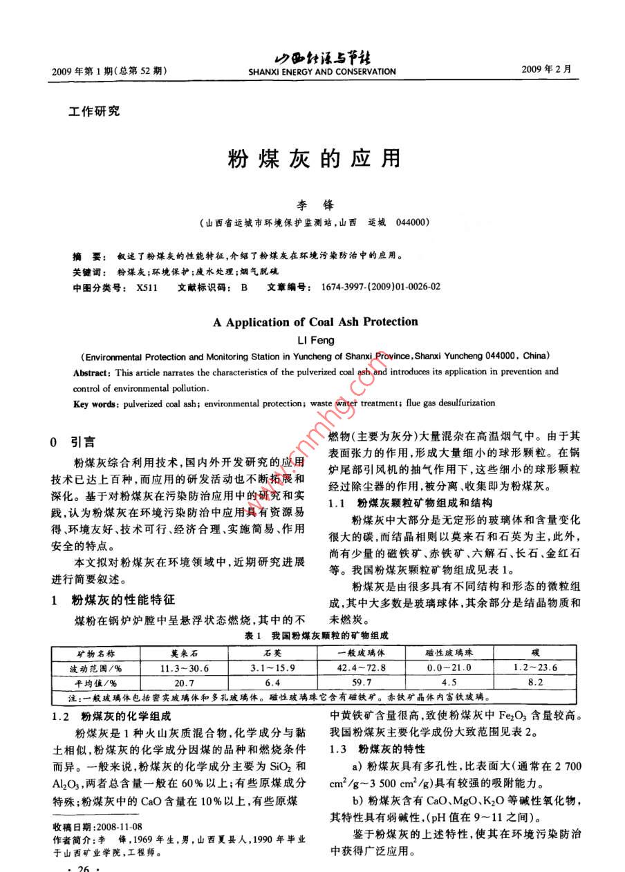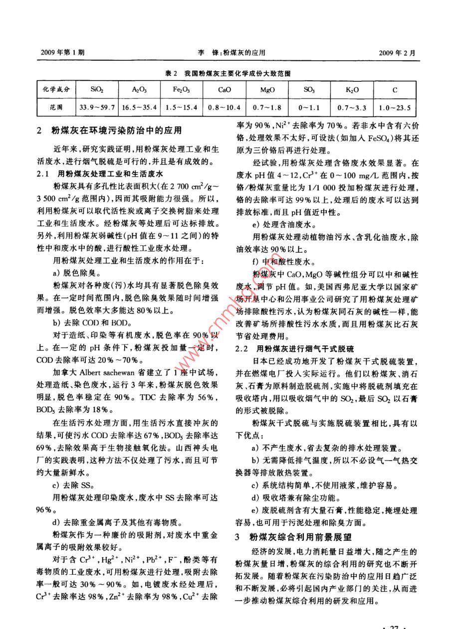 少針與節(jié)琺2009年第1期(總第52期)SHANXI ENERGY AND CONSERVATION2009年2月工作研究粉煤灰的應(yīng)用李鋒(山西省運城市環(huán)境保護監(jiān)測站,山西運城044000摘要:敘逑了粉煤灰的性能特征,介紹了粉煤灰在環(huán)境污染防治中的應(yīng)用。關(guān)鍵詞:粉煤灰;環(huán)境保護;廢水處理;煙氣脫硫中圖分類號:X511文獻標識碼:B文章編號:1674-3997-(2009)01-002602A application of Coal Ash ProtectionLI FengEnvironmental Protection and Monitoring Station in Yuncheng of Shanxi Province, Shanxi Yuncheng 044000, ChinaAbstract: This article narrates the characteristics of the pulverized coal ash and introduces its application in prevention andcontrol of environmental pollutionKey words: pulverized coal ash; environmental protection: waste water treatment: flue gas desulfurization0引言燃物(主要為灰分)大量混雜在高溫?zé)煔庵?。由于其粉煤灰綜合利用技術(shù),國內(nèi)外開發(fā)研究的應(yīng)用表面張力的作用,形成大量細小的球形顆粒。在鍋爐尾部引風(fēng)機的抽氣作用下,這些細小的球形顆粒技術(shù)已達上百種,而應(yīng)用的研發(fā)活動也不斷拓展和經(jīng)過除塵器的作用,被分離、收集即為粉煤灰。深化?;趯Ψ勖夯以谖廴痉乐螒?yīng)用中的研究和實踐,認為粉煤灰在環(huán)境污染防治中應(yīng)用具有資源易1.1粉煤灰顆粒礦物組成和結(jié)構(gòu)得、環(huán)境友好、技術(shù)可行、經(jīng)濟合理、實施簡易、作用粉煤灰中大部分是無定形的玻璃體和含量變化很大的碳,而結(jié)晶相則以莫來石和石英為主,此外,安全的特點。本文擬對粉煤灰在環(huán)境領(lǐng)域中,近期研究進展尚有少量的磁鐵礦、赤鐵礦、六解石、長石、金紅石等。我國粉煤灰顆粒礦物組成見表1。進行簡要敘述。粉煤灰是由很多具有不同結(jié)構(gòu)和形態(tài)的微粒組1粉煤灰的性能特征成,其中大多數(shù)是玻璃球體,其余部分是結(jié)晶物質(zhì)和煤粉在鍋爐爐膛中呈懸浮狀態(tài)燃燒,其中的不未燃炭。表1我國粉煤灰顆粒的礦物組成礦物名稱莢來石石英一般玻璃體磁性玻璃珠波動范國/%3-30.63.1-15.942.4~72.81.2-23.6平均值/%注:一般玻璃體包括密實玻璃體和多孔玻璃體。磁性玻璃珠它含有驢鐵礦。赤鐵礦晶體內(nèi)富鐵玻璃。1.2粉煤灰的化學(xué)組成中黃鐵礦含量很高,致使粉煤灰中Fe2O3含量較高粉煤灰是1種火山灰質(zhì)混合物,化學(xué)成分與黏我國粉煤灰主要化學(xué)成份大致范圍見表2。土相似,粉煤灰的化學(xué)成分因煤的品種和燃燒條件1.3粉煤灰的特性而異。一般來說,粉煤灰的化學(xué)成分主要為SO2和a)粉煤灰具有多孔性,比表面大(通常在2700A2O3,兩者總含量一般在60%以上;有些原煤成分cm2/g~3500cm2/g)具有較強的吸附能特殊;粉煤灰中的CaO含量在10%以上,有些原煤b)粉煤灰含有CaO、MgO、K2O等堿性氧化物,其特性具有弱堿性,(pH值在9-11之間)。收稿日期:200811-08作者簡介:李鋒,1969年生,男,山西夏縣人,1990年畢業(yè)鑒于粉煤灰的上述特性,使其在環(huán)境污染防治于山西礦業(yè)學(xué)院,工程師。中獲得廣泛應(yīng)用2009年第1期李鋒:粉煤灰的應(yīng)用2009年2月表2我國粉煤灰主要化學(xué)成份大致范圍化學(xué)成分Fe2O3MROC范圍339-5716.5-35.41.5-15.40.8-10.40.7~1.80-1.10.7~3.31.0-23.52粉煤灰在環(huán)境污染防治中的應(yīng)用率為90%,N2去除率為70%。若非水中含有六價鉻,處理效果不太好,可設(shè)法(如加入FeSO4)將其還近年來,研究實踐證明,用粉煤灰處理工業(yè)和生原為三價鉻后再進行處理?;顝U水,進行煙氣脫硫是可行的,并且是有成效的經(jīng)試驗,用粉煤灰處理含鉻廢水效果顯著。在2.1用粉煤灰處理工業(yè)和生活廢水廢水pH值4~12,Cr3+在0~100mg范圍內(nèi)按粉煤灰具有多孔性比表面積大(在2700cm2g~鉻粉煤灰重量比為1/1000投加粉煤灰進行處理3500cm2/g范圍內(nèi)),因而其吸附能力很強。所以,鉻的去除率可達99%以上,處理后的廢水可以達到利用粉煤灰可以取代活性炭或離子交換樹脂來處理排放標準,而且pH值近中性。工業(yè)和生活廢水。經(jīng)粉煤灰等處理后可達標排放。e)處理含油廢水。另外,利用粉煤灰弱堿性(pH值在9-11之間)的特用粉煤灰處理動植物油污水、含乳化油廢水,除性中和廢水中的酸,進行酸性工業(yè)廢水處理油效率達90%以上。用粉煤灰處理工業(yè)和生活廢水的作用在于:f)中和酸性廢水。a)脫色除臭。粉煤灰中CaO,MgO等堿性組分可以中和堿性粉煤灰對各種廢(污)水均具有顯著脫色除臭效廢水,調(diào)節(jié)pH值。如,美國西弗尼亞大學(xué)以國家礦果。在一定時間范圍內(nèi),脫色除臭效果隨時間增強場開墾中心和公用事業(yè)公司研究了用粉煤灰處理礦而增強。脫色效率大多能達80%以上。場排除酸性污水,認為粉煤灰同石灰的堿性一樣,能b)去除COD和BOD。改善礦場所排酸性污水水質(zhì),而且用粉煤灰比石灰對于造紙、印染等有機廢水,脫色率在90%以節(jié)省處理費用。上。在一定的pH條件下,粉煤灰投加量一定時,2.2用粉煤灰進行煙氣干式脫硫COD去除率可達20%~70%。日本已經(jīng)成功地開發(fā)了粉煤灰干式脫硫裝置加拿大 Albert sachewan省建立了1座中試場,并在燃煤電廠投入實際運行。他們以粉煤灰、消石處理造紙、染色廢水,運行3年來粉煤灰脫色效果灰、石青為原料制造脫硫劑,實施中將脫硫劑填充在明顯,脫色率穩(wěn)定在90%。TDC去除率為56%,吸收塔內(nèi),