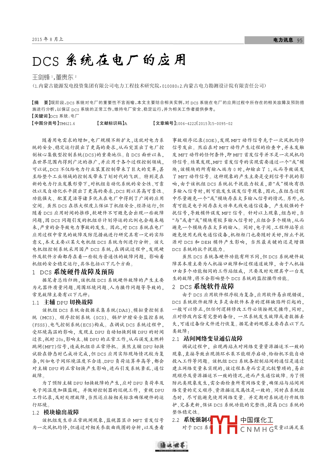 2015年8月上電力訊息DCS糸統(tǒng)在電廠的應(yīng)用王劍鋒-,董貴東(1.內(nèi)蒙古能源發(fā)電投資集團(tuán)有限公司電力工程技術(shù)研究院,010080;2.內(nèi)蒙古電力勘測(cè)設(shè)計(jì)院有限責(zé)任公司)要】現(xiàn)階段,DCS系統(tǒng)對(duì)電廠的重要性不言而喻,本文主要結(jié)合相關(guān)實(shí)例,對(duì)Dcs系統(tǒng)在電廠的應(yīng)用過(guò)程中所存在的相關(guān)故障及預(yù)防措行分析,以保證DCs系統(tǒng)的正常工作,維持電廠安全、穩(wěn)定運(yùn)行,并為相關(guān)工作者提供參考?!娟P(guān)鍵詞】Dcs系統(tǒng);電廠【中圖分類號(hào)】M621.6【文獻(xiàn)標(biāo)識(shí)碼】A【文章編號(hào)】006-4222015)15-0095-02隨著用電需求的増加,電廠規(guī)模不斷擴(kuò)大,這就對(duì)電力系事故順序記錄(S○E),發(fā)現(xiàn)№T動(dòng)作信號(hào)先于一次風(fēng)機(jī)均停統(tǒng)的安全、穩(wěn)定運(yùn)行提出了更高的要求,從而突顯出了電廠控信號(hào)發(fā)出。然后在對(duì)MFT動(dòng)作產(chǎn)生過(guò)程的檢查中,并未發(fā)觸制核心集散型控制系統(tǒng)(DcS)的重要地位。自DcS面世以來(lái),發(fā)MFT動(dòng)作的任何條件,即MFT首發(fā)信號(hào)并不是一次風(fēng)杌均在世界范圍內(nèi)得到廣泛的推廣,并應(yīng)用于各個(gè)過(guò)程控制領(lǐng)域,停信號(hào)。結(jié)果發(fā)現(xiàn),MFT首發(fā)信號(hào)的實(shí)現(xiàn)需要通過(guò)一個(gè)“或”??梢哉f(shuō),DCs不僅給電力行業(yè)裝置控制帶來(lái)了巨大的變革,甚塊,該模塊的所有輸入端為0時(shí),卻輸出了1,從而導(dǎo)致誤發(fā)至給整個(gè)工業(yè)領(lǐng)域的控制及帶來(lái)了劃時(shí)代的飛躍。特別是在了MFT動(dòng)作信號(hào)。這種現(xiàn)象的產(chǎn)生主要是受到信號(hào)干擾的影新的電力行業(yè)發(fā)展形勢(shì)下,對(duì)機(jī)組自動(dòng)化系統(tǒng)的安全性、可靠響,由于該機(jī)組DCS系統(tǒng)抗干擾能力較差,若“或”模塊有很性以及自動(dòng)化水平提出了更高的要求,DCS則以其高可靠性、多輸入信號(hào)時(shí),則可能發(fā)生誤發(fā)信號(hào)現(xiàn)象,因此,在組態(tài)過(guò)程功能強(qiáng)大、配置靈活等諸多優(yōu)點(diǎn)在電廠中得到了廣闊的應(yīng)用中盡量避免一個(gè)“或”模塊奪在太多輸入信號(hào)的情況。另外,也空間。雖然DCS在很大程度上保證了機(jī)組安全、經(jīng)濟(jì)運(yùn)行,但有可能是電子間存在大功率無(wú)線電通信設(shè)備,產(chǎn)生較強(qiáng)的干隨著υCS應(yīng)用時(shí)間的推移,軟硬件不可避免會(huì)岀現(xiàn)一些故障擾信號(hào),導(dǎo)致模件誤發(fā)Mη信號(hào)。針對(duì)以上現(xiàn)象,組態(tài)時(shí),當(dāng)問(wèn)題,因DCS問(wèn)題引發(fā)的機(jī)組非計(jì)劃停運(yùn)的比例也會(huì)越來(lái)越“與”或者“或”模塊有較多輸入信號(hào)時(shí),應(yīng)組合多個(gè)模塊,從而來(lái),嚴(yán)重的會(huì)導(dǎo)致電力事故的發(fā)生。因此,對(duì)DCs系統(tǒng)在電廠避免一個(gè)模塊存在太多的輸入。同時(shí),電子間、工程師站等應(yīng)應(yīng)用過(guò)程中常見(jiàn)的故障及防范措施進(jìn)行研究具有一定的實(shí)際避免使用無(wú)線電通信設(shè)備,機(jī)柜粔門也要隨時(shí)關(guān)好,防止干擾意義,本文主要以某火電機(jī)組DS系統(tǒng)為例進(jìn)行分析。該火源對(duì)DcS和DEH模件產(chǎn)生影響,當(dāng)然最關(guān)鍵的還是増強(qiáng)電杌組控制系統(tǒng)采用國(guó)產(chǎn)DCS系統(tǒng),在調(diào)試過(guò)程中,發(fā)現(xiàn)硬DcS系統(tǒng)的抗干擾能力。件及軟件方面都存在著一些較為普通性的故障問(wèn)題,影響著雖然DCS系統(tǒng)各硬件功能有所不同,但DcS系統(tǒng)硬件故機(jī)組的安全穩(wěn)定運(yùn)行,具體包括以下幾個(gè)方面。障其本質(zhì)主要為人機(jī)接口故障和過(guò)程通道故障,由于人機(jī)接1DcS系統(tǒng)硬件故障及預(yù)防口由多個(gè)功能相同的工作站組成,只要及時(shí)處理其中一臺(tái)發(fā)據(jù)筆者總結(jié)歸納,該機(jī)組DCs系統(tǒng)硬件故障的產(chǎn)生主要生的故障,將不會(huì)影響整個(gè)DCs系統(tǒng)的監(jiān)控操作功能。為元器件質(zhì)量問(wèn)題、周圍環(huán)境問(wèn)為操作問(wèn)題等導(dǎo)致的,2DCS系統(tǒng)軟件故障常見(jiàn)故障主要有以下幾種由于DcS應(yīng)用軟件程序較為復(fù)雜,應(yīng)用軟件易出現(xiàn)錯(cuò)誤1.1主輔DPU切換故障DCS系統(tǒng)軟件故障大多是由軟件本身的邏輯缺陷所引起的該機(jī)組υCS系統(tǒng)由敏據(jù)采集系統(tǒng)(υΔs)、模擬量控制系。般可以修正,但任何邏韡修改工作必須按規(guī)定操作,同時(shí),統(tǒng)(MCS)、順序控制系統(tǒng)(S℃sS)、鍋爐爐膛安全監(jiān)控系統(tǒng)應(yīng)對(duì)修改內(nèi)容冇完整的備份,一旦系統(tǒng)發(fā)生故障或者數(shù)據(jù)丟(FSsS、電氣控制系統(tǒng)(ECS)構(gòu)成。在調(diào)試DCS系統(tǒng)過(guò)程中,失,可通過(guò)備份文件進(jìn)行恢復(fù)。據(jù)筆者的觀察主要存在以下幾受環(huán)境高溫的影響,發(fā)現(xiàn)主DU自動(dòng)切換到輔DpU的時(shí)間類故障:過(guò)長(zhǎng),耗時(shí)20s,影響主、輔DU的正常工作,從而誤發(fā)主燃料2.1站間網(wǎng)絡(luò)變量通信故障跳閘(№T)