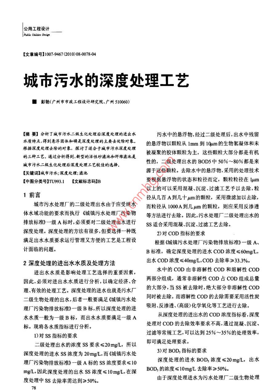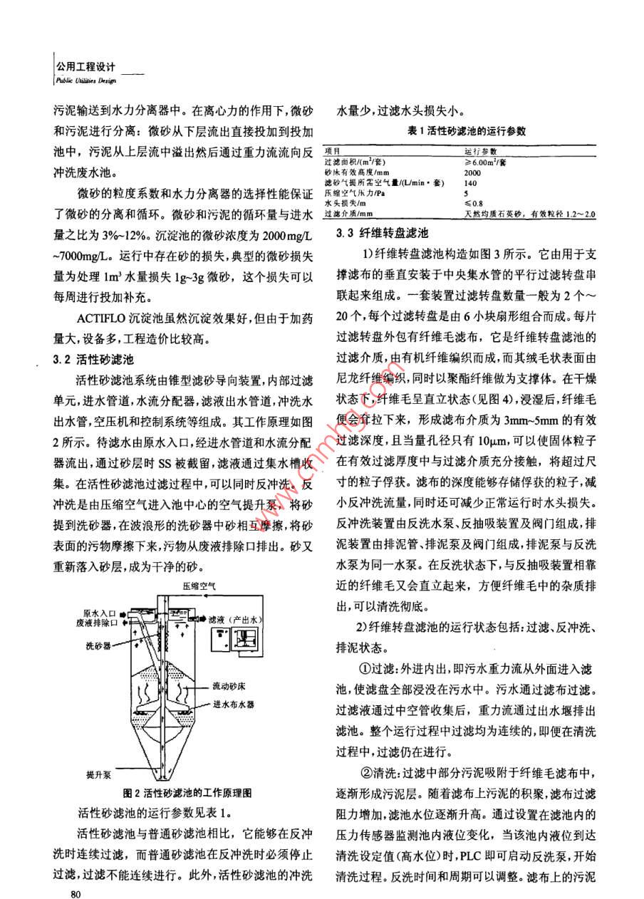 公用工程設(shè)計(jì)【文章編號】1007-9467(2010)08007804城市污水的深度處理工藝■彭勃(廣州市市政工程設(shè)計(jì)研究院,廣州510060)【摘要】分析了城市污水二級生化處理后深度處理的進(jìn)出水污水中的懸浮物,經(jīng)過二級處理后,出水中殘留水質(zhì)特點(diǎn),得到懸澤因體和深度處理的主要去處除對象。的懸浮物以顆粒從1m到1Qm的生物絮凝體和未根據(jù)深度處理去除的對象,探討了適合于城市污水深度處理被凝聚的膠體顆粒為主,這些顆粒大部分都是有機(jī)的三種工藝。通過分析得到,新型的活性砂濾池和纖維濾池是城市污水二級生化處理后深度處理工藝較佳的選擇性的,二級處理出水的BOD5中50%~80%都是來【關(guān)鍵詞】城市污水;深度處理;濾池源于這些顆粒。去除水中的懸浮物,采用的處理技術(shù)【中圖分類號】TU993.1【文獻(xiàn)標(biāo)志碼】B要根據(jù)懸浮物的狀態(tài)和粒徑而定,顆粒粒徑在ψm以上的可以采用混凝、沉淀、過濾工藝予以去除,粒前言徑從幾百A到幾十m的顆粒,采用微濾加以去除城市污水處理廠的二級處理出水由于應(yīng)受納水而粒徑從100A到幾m的顆粒,則應(yīng)采用反滲透體水域功能的要求而執(zhí)行《城鎮(zhèn)污水處理廠污染物等方法進(jìn)行去除。因此,污水處理廠二級處理出水的排放標(biāo)準(zhǔn)》一級A標(biāo)時(shí),必須要對二級處理出水進(jìn)行ss適合采用混凝沉淀過濾工藝去除深度處理。深度處理的方法有很多,但要選擇一種既2)對COD指標(biāo)的要求滿足出水水質(zhì)要求運(yùn)行管理又方便的工藝是工程設(shè)根據(jù)《城鎮(zhèn)污水處理廠污染物排放標(biāo)準(zhǔn)》一級計(jì)面臨的問題。B標(biāo)準(zhǔn),確定深度處理的進(jìn)水COD濃度≤60mgL,2深度處理的進(jìn)出水水質(zhì)及處理方法出水COD濃度≤40mgL,COD去除率≥33.3%進(jìn)出水水質(zhì)是影響處理工藝選擇的重要因素水中的COD由非溶解性COD和溶解性COD因此,必須對進(jìn)出水水質(zhì)進(jìn)行分析,以確定經(jīng)濟(jì)、合兩部分組成,通常非溶解性COD占COD組成總量理、有效的處理工藝。深度處理的進(jìn)水也就是污水廠的大部分,當(dāng)Ss被去除時(shí),絕大部分非溶解性CoD二級生物處理的出水,后者一般要滿足城鎮(zhèn)污水處同時(shí)被去除。而溶解性COD的去除需要采用活性炭理廠污染物排放標(biāo)準(zhǔn)》一級B標(biāo),所以深度處理的進(jìn)吸附、反滲透、(高級)化學(xué)氧化等工藝進(jìn)行去除。水水質(zhì)一般為一級B標(biāo),而出水水質(zhì)要滿足一級A從深度處理的進(jìn)出水的COD濃度指標(biāo)看,深度標(biāo)?,F(xiàn)將各水質(zhì)指標(biāo)進(jìn)行分析處理對COD的去除效率要求不高,通過混凝、沉淀、1)對SS指標(biāo)的要求過濾等常規(guī)工藝,可以達(dá)到25%~35%的處理效率二級處理出水的濃度S要求≤20mgL,所以即可滿足處理要求度處理的進(jìn)水SS濃度為20mg/L,而《城鎮(zhèn)污水處3)對BOD3指標(biāo)的要求理廠污染物排放標(biāo)準(zhǔn)》一級A標(biāo)的SS濃度要求≤10深度處理的進(jìn)水BOD3濃度≤20mgL,出水mgL,因此深度處理的出水Ss濃度≤10mgL,在深BOD,的濃度≤10mgL去除率≥50%度處理中SS去除率需達(dá)到≥50%由于深度處理進(jìn)水為污水處理廠二級生物處理公用工程設(shè)計(jì)Public Utilities Deion出水,所以水中的BOD3有一部分是由于SS的存在減了沉淀池的占地面積。它包括混凝、微砂投加絮而產(chǎn)生的,在深度處理中伴隨物理化學(xué)過程對SS進(jìn)凝(熟化)、高速斜管沉淀、微砂循環(huán)和污泥排放幾個(gè)行去除時(shí),將對水中BOD3產(chǎn)生一定的去除過程。深度處理對SS的去除為10mg,其中Ss為065×10=6.5mgL,對應(yīng)的BODu=142×6.5=水力旋轉(zhuǎn)923mgL(排放污泥中ⅤSS所需得BODu通常為vSS的142倍),對應(yīng)去除的BOD3=068×9,23=滑清水628mgL。通過去除Ss而去除的BOD濃度值為62.8%。因此,如果采用物理化學(xué)法,則在去除SS的注冷成熟過程中可以滿足BOD550%的去除率。聚合物沉淀4)對總N指標(biāo)的要求圖1快速斜板沉淀池的工作原理圖根據(jù)《城鎮(zhèn)污水處理廠污染物排放標(biāo)準(zhǔn)》1)混凝(GB18918-2002)要求,深度處理進(jìn)水的總N液度≤凝過程在 ACTIFLO前部的混凝池中進(jìn)行,混20mgL,出水N度≤15mgL,去除率≥25%凝反應(yīng)是整個(gè)處理系統(tǒng)的關(guān)鍵步驟,混凝劑投加后由于執(zhí)行的排放標(biāo)準(zhǔn)對N、P有嚴(yán)格要求,污水不但去除S,而且與污水中的P反應(yīng)形成沉淀去除處理廠二級生物處理工藝一般都采用生物脫氮除磷P,BOD或COD隨著Ss的去除而去除。工藝,對總N有很好的處理效果,另外,若采用投加2)微砂投加混凝劑的物化處理則可以去除部分總N,深度處理該工藝投加粒徑在125μm-150um的微砂并不部分可以不再單獨(dú)考慮對總N的去除。斷循環(huán)更新,以提供大的接觸面積而強(qiáng)化絮凝,并起5)對總P的指標(biāo)要求壓載作用以提高絮體沉淀的速度。二級生物處理一般能將總P濃度降至1.0mgL3)絮凝但要達(dá)到0.5mgL的要求,需采用化學(xué)輔助法。深度絮凝是一種物理機(jī)械過程在這一過程中,由于處理進(jìn)水的總P濃度≤1mgL,出水總P濃度≤0.5物理攪拌作用和分子間的作用力使絮凝體增大以利mgL,去除率≥50%,深度處理可以采用化學(xué)法除于沉淀。投加陰離子高分子助