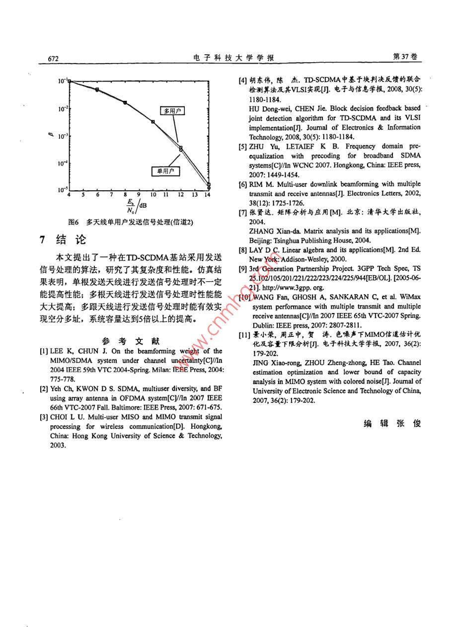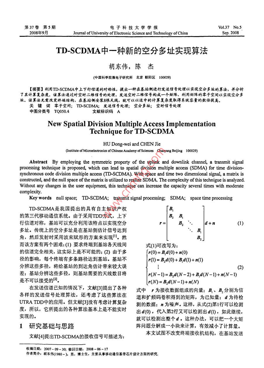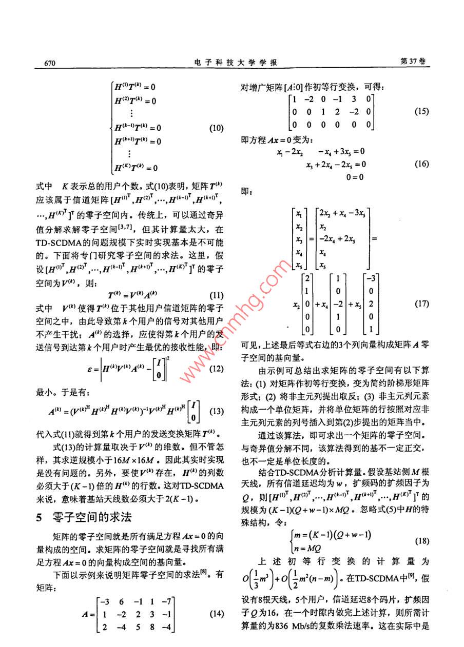 第37卷第5期電子科技大學(xué)學(xué)報(bào)VoL 37 No 5Joumal of University of Electronic Science and Technology of ChinaSep.2008TD- SCDMA中一種新的空分多址實(shí)現(xiàn)算法胡東偉,陳杰中國科學(xué)院微電子研究所北京朝陽區(qū)10009)【摘要】利用TD- SCDMA中上下行信道的對(duì)稱性,提出一種在基站側(cè)進(jìn)行發(fā)送信號(hào)處理以實(shí)現(xiàn)空分多址的算法,并分析址,該算法無改變終端結(jié)構(gòu),在基站側(cè)安裝8根天線,就可以以適中的計(jì)算復(fù)雜度取得系統(tǒng)容量的數(shù)倍祿莉?qū)崿F(xiàn)空分多了其計(jì)算復(fù)雜度,該算法通過對(duì)空時(shí)二維信號(hào)的處理,發(fā)迷空時(shí)二維信號(hào)構(gòu)成一個(gè)矩陣,利用矩陣的零子空間以鍵詞零于空間; TD-SCDMA.;發(fā)送信號(hào)處理;空分多址;空時(shí)信號(hào)處理中圖分類號(hào)TQ050.4文獻(xiàn)標(biāo)識(shí)碼ANew Spatial Division Multiple access ImplementationTechnique for TD-SCDMAHU Dong-wei and CHEN Jie(Institute of Microelectronics of Chinese Academy of Sciences Chaoyang Beijing 100029)Abstract By employing the symmetric property of the uplink and downlink channel, a transmit signalprocessing technique is proposed, which can lead to spatial division multiple access(SDMA)for time division-synchronous code division multiple access(TD-SCDMA). With space and time two dimensional signal, a matrix isconstructed, and the null space of the matrix is utilized to realize SDMA. The complexity of this technigue is analyzedwithout any changes in the user equipment, this technique can increase the capacity several times with moderateKey words null space; TD-SCDMA; transmit signal processing; SDMA; space time processingTD-SCDMA是我國提出的具有自主知識(shí)產(chǎn)權(quán)B1的第三代移動(dòng)通信系統(tǒng)。由于采用TDD方式,上下B、B行信道對(duì)稱,基站可以充分利用該特點(diǎn)以實(shí)現(xiàn)空分B2d+n多址。傳統(tǒng)上的空分多址是在基站側(cè)估計(jì)信號(hào)達(dá)到B角,然后發(fā)射時(shí)采用波束賦形的方案來實(shí)現(xiàn)然而該方案有兩個(gè)困難:(1)要求終端到基站各天線間式(1)可改寫為的信道完全相關(guān),這實(shí)際上是不可能的;(2)由于多r(0)=B4(0)+m(0)徑的影響,每個(gè)終端有多條路徑達(dá)到基站。基站不r()=B2d(0)+B4(1)+m(1)分辨這些多徑,將給基站的到達(dá)角估計(jì)帶來較大誤差;基站分辨這些多徑,則基站需要的天線數(shù)目將(N-1)=B2d(N-2)+B1d(N-1)+m(N-1)是不可以接受的r(N)=B2d(N-1)+n(N)在發(fā)送信道已知的情況下,文獻(xiàn)3提出了各種式中r為接收數(shù)據(jù)組成的向量;B1、B2分別為信各樣的發(fā)送信號(hào)處理算法,還考慮了這些算法在道和擴(kuò)頻碼卷積得到的矩陣,為已知量;d為待檢UTRA TDDI中的應(yīng)用。但文獻(xiàn)]沒有考慮計(jì)算復(fù)雜測的數(shù)據(jù);m為噪聲。這樣,從式(2)第1行可以檢測度,所以,它所提出的各種算法基本上是不能實(shí)時(shí)出d(O),代入第2行又可以檢測出d(),如此繼續(xù),實(shí)現(xiàn)的。就可以檢測出整個(gè)d。這種辦法,可以把一個(gè)大矩1研究基礎(chǔ)與思路陣問題分解成一小塊來計(jì)算,有效減小了計(jì)算量。文獻(xiàn)[4提出 TD-SCDMA的接收信號(hào)可描述為:本文試圖不改變終端接收機(jī)結(jié)構(gòu),在基站發(fā)送收稿日期;2007-09-30,修回日期:2008-0-17作者簡介;胡東偉(1980-),男,博士生,主要從事移動(dòng)通信基帶芯片設(shè)計(jì)方面的研究第5期胡東偉等: TD-SCDMA中一種新的空分多址實(shí)現(xiàn)算法端作信號(hào)處理,來優(yōu)化終端接收,實(shí)現(xiàn)空分復(fù)用,式中()"為 Hermitian轉(zhuǎn)置。有效提高系統(tǒng)容量。本文在文獻(xiàn)B]提出的理論框架討論:(1)由于式(7)中H只表示一個(gè)用戶的信之下完成,但與文獻(xiàn)[3]相比,不同處有:道,只對(duì)一個(gè)用戶最優(yōu)化。這意味著該時(shí)隙內(nèi)所有(1)發(fā)射信號(hào)處理以式(2)中的一個(gè)小塊為基本碼道都分配給同一個(gè)用戶單位,而不是如文獻(xiàn)]中以一個(gè)時(shí)隙為處理單位;(2)式(7的計(jì)算復(fù)雜度主要集中在矩陣求逆(2)試圖保持接收機(jī)結(jié)構(gòu)不變,優(yōu)化接收機(jī)性上,對(duì) TD-SCDMA中的一個(gè)小塊,其大小為16×16,能,而不是簡化接收機(jī)結(jié)構(gòu);實(shí)時(shí)實(shí)現(xiàn)是沒有問題的。而如果對(duì)整個(gè)時(shí)隙處理,3)在實(shí)現(xiàn)空分多址時(shí),本文的系統(tǒng)是一個(gè)多輸求逆規(guī)模將達(dá)到848×848,其計(jì)算量是不可以接入單輸出系統(tǒng),文獻(xiàn)3中是一個(gè)多輸入多輸出系統(tǒng);受的(4)分析了計(jì)算復(fù)雜度,找到了一種低復(fù)雜度的(3)式(7表示對(duì)發(fā)送信號(hào)作時(shí)間上的預(yù)均衡。計(jì)算零子空間的算法,而文獻(xiàn)[3]中所提算法未考慮計(jì)算復(fù)雜度,基本上是不可能實(shí)時(shí)實(shí)現(xiàn)的。3多發(fā)射天線單用戶的發(fā)射信號(hào)處理2單發(fā)射天線單用戶的發(fā)射信號(hào)處理考慮基站側(cè)裝有M根天線,第m根天線與終端間的信道卷積矩陣記為Hn,相應(yīng)的發(fā)送信號(hào)變換由于上下行信道的對(duì)稱性,假設(shè)下行發(fā)射前下矩陣為Tm行信道已知。終端接收機(jī)結(jié)構(gòu)不變,則式()給出了H=[H1,H2,…,HM]接收機(jī)所利用的信號(hào)模型??紤]其中第k小塊r(k)=B2d(-1)+Bd(k)+n(k)(3)T-[xr,