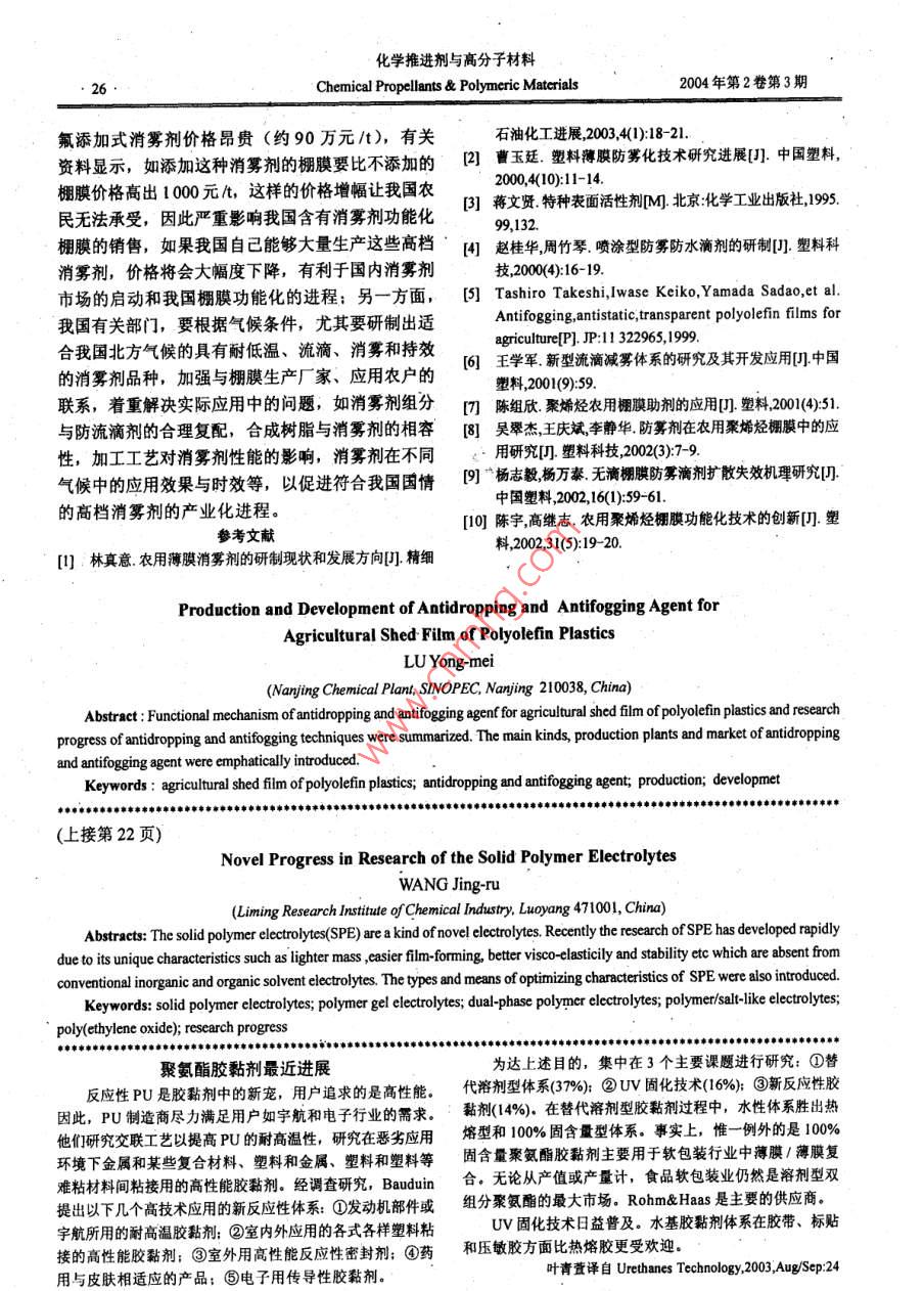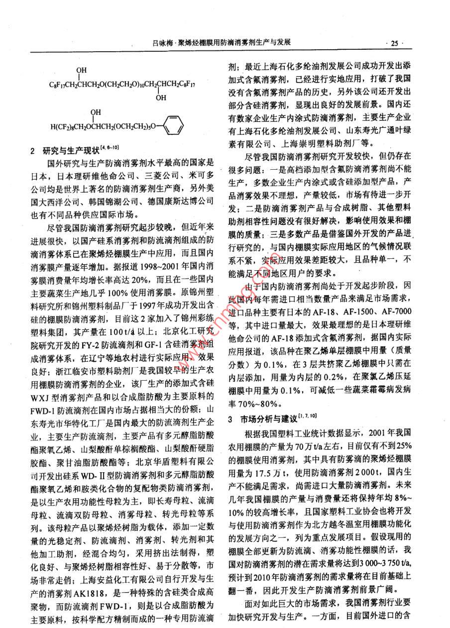 化學(xué)推進(jìn)劑與高分子材料2004年第2卷第3期Chemical Propellants & Polymeric Materials23.聚烯烴棚膜用防滴消霧劑生產(chǎn)與發(fā)展呂詠梅(中石化南京化工廠,江蘇南京210038)摘要: 概述聚烯烴農(nóng)用棚膜的防滴消霧劑作用機(jī)理和防滴、防霧化技術(shù)的研究進(jìn)展,重點(diǎn)介紹防滴消霧劑的主要品種、生產(chǎn)廠家及市場。關(guān)鍵詞:聚烯烴農(nóng)用棚膜:防滴消霧劑;生產(chǎn);發(fā)展中圖分類號(hào): TQ325.1文獻(xiàn)標(biāo)識(shí)碼:A 文章編號(hào): 12-29191004030023.0404我國作為一個(gè)13億人口的發(fā)展中國家,農(nóng)業(yè)是有親水性的膜。消霧劑按使用方法可分為2大類:國民經(jīng)濟(jì)的基礎(chǔ),隨著高效農(nóng)業(yè)的發(fā)展,對塑料棚一是內(nèi)涂式,將具有消霧效果的助劑直接噴涂在棚膜的需求量巨大,2001 年我國塑料農(nóng)膜產(chǎn)量約為70膜表面, 操作簡單,但黏合不好會(huì)影響使用效果:萬t,我國農(nóng)膜的生產(chǎn)量和使用量均位居世界第一二是添加式, 與許多塑料助劑-一樣, 在塑料聚合或位,占國內(nèi)塑料總產(chǎn)量12%,高于世界平均水平,棚膜壓延時(shí)添加進(jìn)去, 許多高檔高效消霧劑屬于該農(nóng)膜覆蓋裁培已經(jīng)在全國范圍內(nèi)推廣使用,近年來類型。無論內(nèi)涂式或添加式,防滴消霧劑必須具有由于牲畜越冬棚膜、儲(chǔ)存飼料膜及日光溫室膜需求典型的表面活性劑特征,能夠改善聚合物薄膜表面迅速增長,農(nóng)膜工業(yè)發(fā)展?jié)摿薮?。?dāng)塑料薄膜表親水性的親水基團(tuán)和能夠使防滴消霧劑分子附著在面溫度達(dá)到露點(diǎn)以下時(shí),空氣中的水氣達(dá)到飽和或膜面的疏水基團(tuán),因此防滴消霧劑組成主要是具有過飽和時(shí)就會(huì)在其表面凝結(jié)成水滴而霧化。霧滴的高表面活性的特殊表面活性劑,主要有含氟、硅或存在會(huì)導(dǎo)致透光率明顯下降,影響植物光合作用及含氨、磷、硼等表面活性劑。這些表面活性劑作正常生長:另外水氣在棚內(nèi)層冷凝成水滴,滴落為防滴消霧劑使用,必須兼具較高的熱穩(wěn)定性及與在瓜果蔬菜上,使農(nóng)作物發(fā)生糜爛或病菌滋生,因其他助劑的配伍性,可與其他助劑協(xié)同使用,且不此防滴消霧劑應(yīng)運(yùn)而生。目前國內(nèi)消霧劑市場尚處影響薄膜的其他性質(zhì)。于起步和推廣階段,隨著我國農(nóng)業(yè)持續(xù)穩(wěn)定發(fā)展,目前國內(nèi)外主要使用的內(nèi)涂式防滴消霧劑有如對高效消霧功能化農(nóng)膜的需求日益增加,因此棚膜下3大類:一是siO2水合物硅乳膠和Al2O3水合物防滴消霧劑前景廣闊,亟待發(fā)展"。鋁乳膠,加入具有防滴消霧作用的非離子或陰離子1性能與分類[I-.)表面活性劑、交聯(lián)劑、催化劑、消泡劑等,按一消霧劑在作用機(jī)理上,主要是可降低棚膜上表定比例配制成的復(fù)合物。這些無機(jī)型噴涂式防滴消面張力,使棚膜內(nèi)表面水層變薄,水滴沿著棚膜的霧劑成本低、應(yīng)用廣,不但可用于農(nóng)用塑料薄膜, .自然傾斜角度流向棚底,故又稱流滴劑。 消霧劑以還可用于玻璃和其他 塑料制品中。二是由糖苷型非島狀存在于流滴層內(nèi),不僅使棚膜水層變薄,而且離子表面活性劑與一般陽離子表面活性劑復(fù)合而可防止薄膜附近水蒸氣達(dá)到過飽和狀態(tài),以控制霧成,具有成膜、消霧、防流滴能力。成膜組分是氣的產(chǎn)生。用具有適當(dāng)相對分子質(zhì)量的聚合物,如聚乙烯或聚防滴消霧劑一般是由多種酯化物復(fù)配而成的化丙烯、少量助劑、溶劑按比例復(fù)配而成。該類內(nèi)合物,這些化合物由親水基和疏水基組成。在塑料涂式防 滴消霧劑具有消霧性能好、流滴期長的特薄膜中添加防滴消霧劑后,防滴消霧劑的分子運(yùn)動(dòng)點(diǎn),通常根據(jù)不同噴涂工藝、被噴涂物表面的性質(zhì)可通過塑料內(nèi)部的非結(jié)晶區(qū)域逐漸遷移到薄膜表面及對消霧、流滴期的要求,可配制出系列化的內(nèi)涂定向排列,親水基自動(dòng)排列在薄膜外側(cè),靠向空氣式防滴消霧劑,以適應(yīng)不同的要求。三是聚醚磺酸的一方,而疏水基則自動(dòng)排列在薄膜內(nèi)側(cè),形成具鹽和聚甲 基丙烯酸乙二醇葡萄糖酯加入少量助劑與收稿日期: 2003-12-12作者簡介:呂詠梅(1969-),女,工學(xué)學(xué)士,化工I程師,1992年畢業(yè)于南京化工大學(xué)高分子材料專業(yè),曾公開發(fā)表論文40篇, -直從事精細(xì)化學(xué)品的研究與開發(fā)。E-mail: ncplc@163 com化學(xué)推進(jìn)劑與高分子材料●24Chemical Propellants & Polymeric Materials2004年第2卷第3期溶劑復(fù)配而成。第1種結(jié)構(gòu)的硅表面活性劑為Si-OC型,因硅氧鍵添加式防滴消霧劑又分為防流滴劑和消霧劑2不穩(wěn)定,容易在酸性溶液中水解;第2種結(jié)構(gòu)的硅大類,按化學(xué)結(jié)構(gòu)和性能分,防流滴劑主要有3表面活性劑為 Si-C型,結(jié)構(gòu)穩(wěn)定,不易水解。聚類,消霧劑也有3類。硅氧烷主鏈由-Si0-構(gòu)成,不具有親水性,與聚防流滴劑主要品種有:一是多元醇脂肪酸酯烯烴有 良好的相容性,在主鏈上引入聚氧乙烯鏈類,該類產(chǎn)品主要包括山梨糖醇、山梨糖醇酐、甘段,增強(qiáng)了硅氧烷的親水性。聚氧乙烯遇水形成氫油及甘油醚的中長鏈脂肪酸酯化合物,一