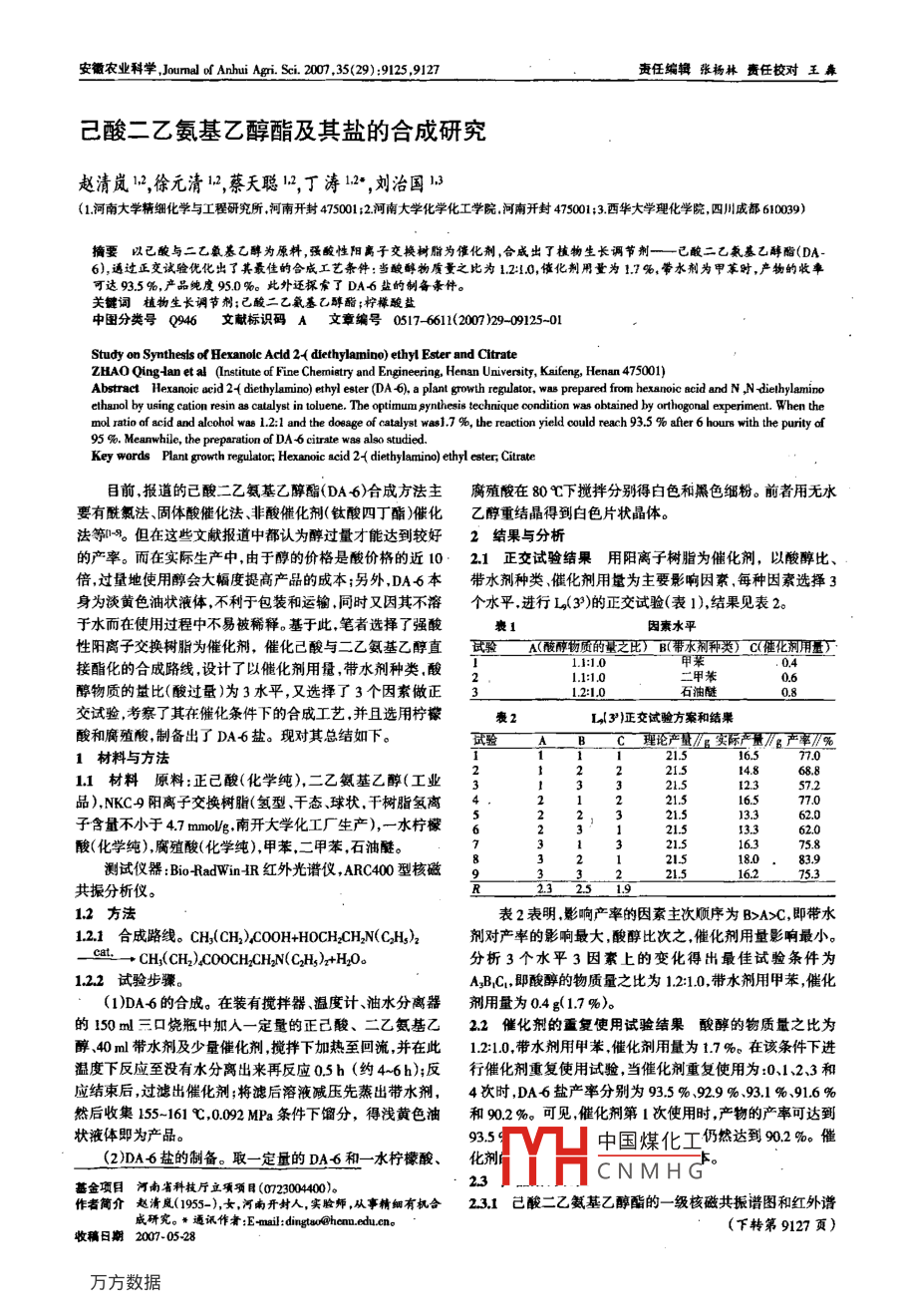 安徵農(nóng)業(yè)科學, Joumal of Anhui Agri.Sci.2007,35(29):9125,927疲任編輯張楊林責任校對王轟己酸二乙氨基乙醇酯及其鹽的合成研究趙清嵐12,徐元清1,蔡天聰12,丁濤12,劉治國3(1河南大學精細化學與工程研究所河南開封475001;2河南大學化學化工學院河南開封475001;3西華大學理化學院四川成都610039)摘要以己酸與二乙氨基乙醇為原料,強酸性陽離子交換樹脂為催化劑,合成出了植物生長調(diào)節(jié)劑—一己酸二乙氯基乙酶酯(DA-6),通過正交試驗優(yōu)化出了其最佳的合成工藝條件:當酸醇物質(zhì)量之比為12:1.0,催化判用量為17%,管水劑為甲革時,產(chǎn)物的收可達935%,產(chǎn)品純度950%。此外還探索了DA6鹽的制備條件。關鍵詞植物生長調(diào)節(jié)劑;己酸二乙氬基U醇酯;檸樺酸鹽中圖分類號Q946文獻標識碼A文章編號0517-6611(200)29-09125-01Study on Synthesis of Hexanole Add 2 diethylamino)ethyl Ester and CitrateZHAO QingHan et al (Institute of Fine Chemiatry and Engineering, Henan University, Kaifeng, Henan 47500Abstract Hexanoic acid 2 diethylamino)ethyl ester(DA-6), a plant growth regulator, was prepared from hexanoic acid and NN diethylaminoethanol by using cation resin as catalyst in toluene. The optimum synthesis technique condition was obtained by orthogonal experiment. When themol ratio of acid and alcohol was 1.2: 1 and the dosage of catalyst was1. 7 % the reaction yield could reach 93. 5 after 6 hours with the purity of959. Meanwhile, the preparation of Da 6 citrate was also studiedKey words Plant growth regulator: Hexanoic acid 2 diethylamino)ethyl ester; Citrate目前報道的己酸二乙氨基乙醇酯(DA6)合成方法主腐殖酸在80℃下攪拌分別得白色和黑色細粉。前者用無水要有酰氯法、固體酸催化法、非酸催化劑(鈦酸四丁酯)催化乙醇重結晶得到白色片狀晶體法等但在這些文獻報道中都認為醇過量才能達到較好2結果與分析的產(chǎn)率。而在實際生產(chǎn)中,由于醇的價格是酸價格的近10·2.1正交試驗結果用陽離子樹脂為催化劑,以酸醇比、倍,過量地使用醇會大幅度提高產(chǎn)品的成本;另外,DA6本帶水劑種類催化劑用量為主要影響因素每種因素選擇3身為淡黃色油狀液體,不利于包裝和運輸同時又因其不溶個水平進行L(3)的正交試驗(表1),結果見表2。于水而在使用過程中不易被稀釋?;诖?筆者選擇了強酸因素水平性陽離子交換樹脂為催化劑,催化己酸與二乙氨基乙醇直試驗A(酸醇物質(zhì)的鼙之比)(帶水劑種類)c催化河用量接酯化的合成路線,設計了以催化劑用量,帶水劑種類,酸醇物質(zhì)的量比(酸過量)為3水平,又選擇了3個因素做正21.1:10二甲苯1.210交試驗考察了其在催化條件下的合成工藝,并且選用檸檬L3)正交試驗方案和結果酸和腐殖酸制備出了DA6鹽?,F(xiàn)對其總結如下。試驗AC理論產(chǎn)量/B實際產(chǎn)量/B產(chǎn)率∥%1材料與方法L1材料原料:正己酸(化學純)二乙氨基乙醇(工業(yè)3148品),NKC陽離子交換樹脂(氫型、干態(tài)、球狀,干樹脂氫離子含量不小于47mmog南開大學化工廠生產(chǎn)),一水檸檬酸(化學純)腐殖酸(化學純)甲苯,二甲苯石油醚567211336221.521.5180測試儀器:Bio. Radwin扭R紅外光譜儀,ARC400型核磁162共振分析儀。12方法表2表明,影響產(chǎn)率的因素主次順序為B>A>C,即帶水121合成路線。CH3(CH1)COOH+ HOCH-CH,N(CH3)2劑對產(chǎn)率的影響最大酸醇比次之催化劑用量影響最小。-caL.CH,(CH).CoocH CH N(CH)+H Oo分析3個水平3因素上的變化得出最佳試驗條件為122試驗步驟。A3BC,即酸醇的物質(zhì)量之比為12:1.0.帶水劑用甲苯催化(1)DA6的合成。在裝有攪拌器、溫度計、油水分離器劑用量為04g(17%)。的150m三口燒瓶中加入一定量的正己酸、二乙氨基乙22催化劑的重復使用試驗結果酸醇的物質(zhì)量之比為醇、40ml帶水劑及少量催化劑攪拌下加熱至回流,并在此12:1.0,帶水劑用甲苯催化劑用量為17%。在該條件下進溫度下反應至沒有水分離出來再反應05b(約4~6h);反行催化劑重復使用試驗,當催化劑重復使用為:0、123和應結束后,過濾出催化劑;將濾后溶液減壓先蒸出帶水劑,4次時,DA6鹽產(chǎn)率分別為935%929%931%916%然后收集155-1611℃,0092MPa條件下餾分,得淺黃色油和902%??梢?催化劑第1次使用時,產(chǎn)物的產(chǎn)率可達到狀液體即為產(chǎn)品。935V凵中國煤化工仍然達到902%。催(2IA6鹽的制備。取一定量的DA6和一水檸檬酸、化劑CNMH甚金項目河南省科技廳立項項目(0723004400)。作者簡介趙清(195-),★,河南開封人,實膾師,從事精細有機合23.1已酸二乙氨基乙醇酯的一級核磁共振譜圖和紅外譜成研究?!巴ㄓ嵶髡?Eil:dingtao@henn,edu.cn(下轉第9127頁收稿日期2007-052835暮29期魄玉利等光合蛔蒿幾種培養(yǎng)方式的比較隨著反應器的放大,光照會減弱,攪拌不充分,對營養(yǎng)的吸23鹽度對光合細菌生長的影響圖4表明,分別用淡水收變?nèi)跤绊懥斯夂霞毦纳L。圖2表明在相同培養(yǎng)條30‰和60%鹽度的海水配制培養(yǎng)基,接種,3000kx,28℃件下,10L玻璃光照發(fā)酵罐與40L光合生物反應器相比,的培養(yǎng)箱中培養(yǎng),記錄5d后的生長情況。該菌株不僅能在生長速率差不多。發(fā)酵罐的價格非常昂貴,放大困難,需要淡水中和海水中生長、繁殖,而且都生長得很好,擴大了該的動力費用也比較高;而新式玻璃反應器的成本非常低廉,菌的應用范圍操作簡便培養(yǎng)密度高,可達到最大密度,且耗費的成本大21「一一淡水大降低,從而為采用新式光生物反應器進行光合細菌的產(chǎn
