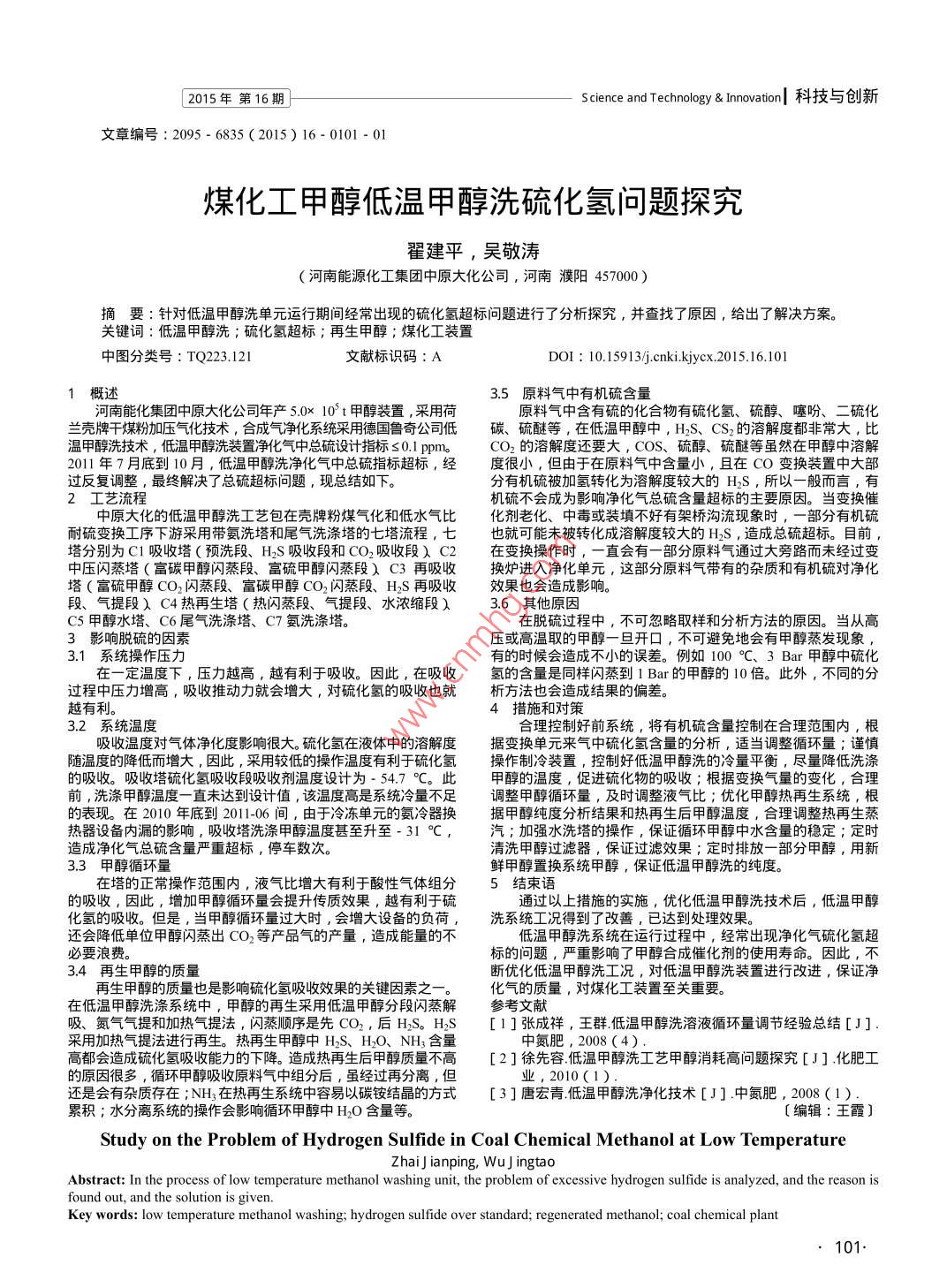 煤化工甲醇低溫甲醇洗硫化氫問題探究