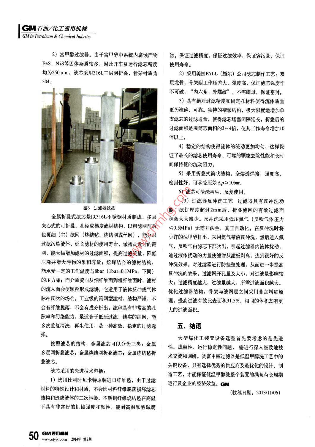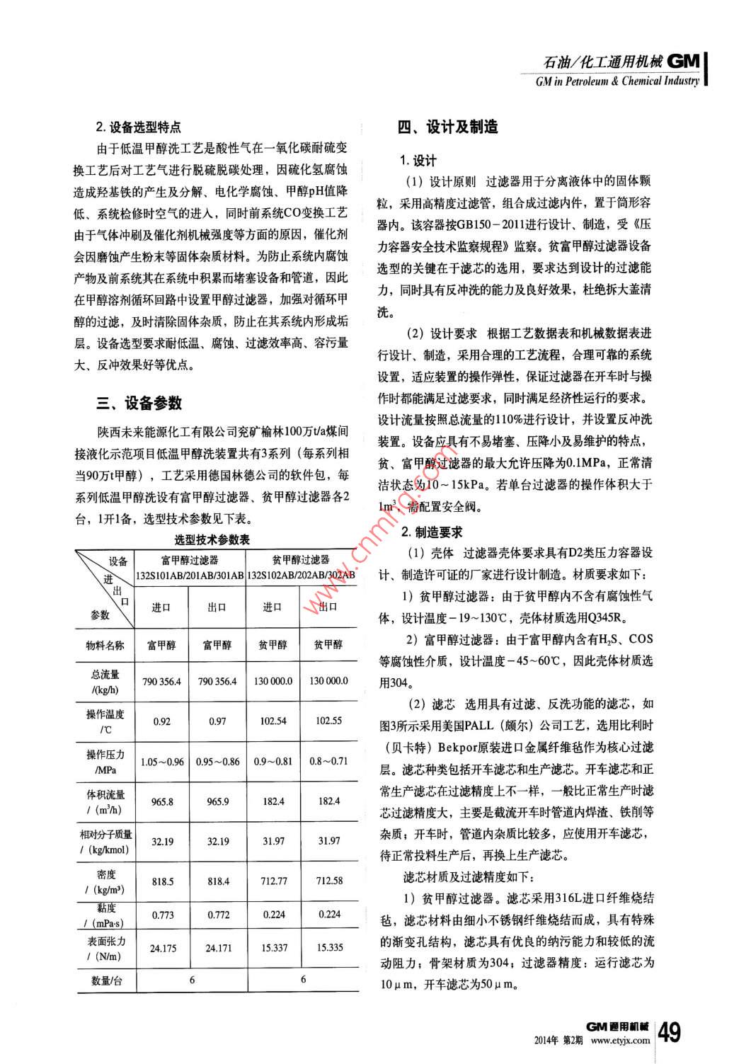 cM石油/化工通用機(jī)械GM in Petroleum Chemical industny低溫甲醇洗工藝貧富甲醇過(guò)濾器設(shè)計(jì)及制造要點(diǎn)陜西未來(lái)能源化工有限公司(榆林719000)趙月剛侯翔耀蔣兵【摘要】基于低溫甲醇洗工藝中的腐蝕、堵塞,提出了貧富甲醇過(guò)濾器設(shè)計(jì)及制造要點(diǎn)【關(guān)鍵詞】低溫甲醇洗H2S腐蝕貧富甲醇過(guò)濾器參數(shù)設(shè)計(jì)制造、前言貧富甲醇過(guò)濾器是低溫甲醇洗工藝中的關(guān)鍵設(shè)備,如圖1、圖2所示,該設(shè)備的正常運(yùn)行將有效解決低溫甲醇洗系統(tǒng)中的運(yùn)行瓶頸腐蝕、堵塞,確保整個(gè)裝置的滿負(fù)荷長(zhǎng)周期運(yùn)行及企業(yè)的經(jīng)濟(jì)效益。圖2貧甲醇過(guò)濾器二、固體雜質(zhì)產(chǎn)生1.工藝技術(shù)特點(diǎn)低溫甲醇洗工藝是采用物理吸收法的一種酸性氣體凈化工藝,吸收能力大,氣體凈化度高,選擇性好,能耗低。該工藝使用以冷甲醇作為吸收溶劑,利用甲醇在-60℃左右的低溫下對(duì)原料氣中CO2、H2S、COS吸收溶解度極大的優(yōu)良特性,采用一步法脫除原料氣中的酸性氣體,其典型工藝是采用塔流程,脫碳、脫硫分圖1富甲醇過(guò)濾器上下塔脫除,在一個(gè)塔內(nèi)完成48GM畫(huà)用顏?zhàn)Hwww.etyx.con2014年第2期石油/化工通用機(jī)械GMGM in petroleum& Chemical industry2.設(shè)備選型特點(diǎn)四、設(shè)計(jì)及制造由于低溫甲醇洗工藝是酸性氣在一氧化碳耐硫變換工藝后對(duì)工藝氣進(jìn)行脫硫脫碳處理,因硫化氫腐蝕1.設(shè)計(jì)(1)設(shè)計(jì)原則過(guò)濾器用于分離液體中的固體顆造成羥基鐵的產(chǎn)生及分解、電化學(xué)腐蝕、甲醇pH值降低、系統(tǒng)檢修時(shí)空氣的進(jìn)入,同時(shí)前系統(tǒng)CO變換工藝粒,采用高精度過(guò)濾管,組合成過(guò)濾內(nèi)件,置于筒形容由于氣體沖刷及催化劑機(jī)械強(qiáng)度等方面的原因,催化劑器內(nèi)。該容器按GB|50-201進(jìn)行設(shè)計(jì)、制造,受《壓會(huì)因磨蝕產(chǎn)生粉末等固體雜質(zhì)材料。為防止系統(tǒng)內(nèi)腐蝕力容器安全技術(shù)監(jiān)察規(guī)程》監(jiān)察。貧富甲醇過(guò)濾器設(shè)備產(chǎn)物及前系統(tǒng)其在系統(tǒng)中積累而堵塞設(shè)備和管道,因此選型的關(guān)鍵在于濾芯的選用,要求達(dá)到設(shè)計(jì)的過(guò)濾能醇的過(guò)濾,及時(shí)清除固體雜質(zhì),防止在其系統(tǒng)內(nèi)形成垢而句時(shí)具有反沖洗的能力及良好效果,杜絕拆大蓋清層。設(shè)備選型要求耐低溫、腐蝕、過(guò)濾效率高、容污量(2)設(shè)計(jì)要求根據(jù)工藝數(shù)據(jù)表和機(jī)械數(shù)據(jù)表進(jìn)行設(shè)計(jì)、制造,采用合理的工藝流程,合理可靠的系統(tǒng)大、反沖效果好等優(yōu)點(diǎn)。設(shè)置,適應(yīng)裝置的操作彈性,保證過(guò)濾器在開(kāi)車時(shí)與操三、設(shè)備參數(shù)作時(shí)都能滿足過(guò)濾要求,同時(shí)滿足經(jīng)濟(jì)性運(yùn)行的要求。陜西未來(lái)能源化工有限公司兗礦榆林100萬(wàn)ta煤間設(shè)計(jì)流量按照總流量的110%進(jìn)行設(shè)計(jì),并設(shè)置反沖洗裝置。設(shè)備應(yīng)具有不易堵塞、壓降小及易維護(hù)的特點(diǎn)接液化示范項(xiàng)目低溫甲醇洗裝置共有3系列(每系列相貧、富甲醇過(guò)濾器的最大允許壓降為0MPa,正常清當(dāng)90萬(wàn)t甲醇),工藝采用德國(guó)林德公司的軟件包,每潔狀態(tài)為10~15kPa。若單臺(tái)過(guò)濾器的操作體積大于系列低溫甲醇洗設(shè)有富甲醇過(guò)濾器、貧甲醇過(guò)濾器各2lm3,需配置安全閥。臺(tái),1開(kāi)1備,選型技術(shù)參數(shù)見(jiàn)下表。選型技術(shù)參數(shù)表2制造要求設(shè)備富甲醇過(guò)濾器貧甲醇過(guò)濾器(1)殼體過(guò)濾器殼體要求具有D2類壓力容器設(shè)3210AB2 AB30IAB13S0 AB/202AB/302AB計(jì)、制造許可證的廠家進(jìn)行設(shè)計(jì)制造。材質(zhì)要求如下出口1)貧甲醇過(guò)濾器:由于貧甲醇內(nèi)不含有腐蝕性氣參數(shù)進(jìn)口進(jìn)口體,設(shè)計(jì)溫度-19~130℃,殼體材質(zhì)選用Q345R。物料名稱富甲醇富甲醇|貧甲醇貧甲醇2)富甲醇過(guò)濾器:由于富甲醇內(nèi)含有H2sS、COS等腐蝕性介質(zhì),設(shè)計(jì)溫度-45~60℃,因此殼體材質(zhì)選79035479035641300030001304操作溫度(2)濾芯選用具有過(guò)濾、反洗功能的濾芯,如0920.971025410255圖所示采用美國(guó)PALL(頗爾)公司工藝,選用比利時(shí)操作壓力(貝卡特) Bekpor原裝進(jìn)口金屬纖維氈作為核心過(guò)濾105~096095~0:609~0810~071MPa層。濾芯種類包括開(kāi)車濾芯和生產(chǎn)濾芯。開(kāi)車濾芯和正體積流量常生產(chǎn)濾芯在過(guò)濾精度上不一樣,一般比正常生產(chǎn)時(shí)濾/(mh)965.8965918241824芯過(guò)濾精度大,主要是截流開(kāi)車時(shí)管道內(nèi)焊渣、鐵削等相對(duì)分子質(zhì)量321931973197雜質(zhì);開(kāi)車時(shí),管道內(nèi)雜質(zhì)比較多,應(yīng)使用開(kāi)車濾芯/(kg/kmol)待正常投料生產(chǎn)后,再換上生產(chǎn)濾芯。密度81858184712771258濾芯材質(zhì)及過(guò)濾精度如下/ kg/m1)貧甲醇過(guò)濾器。濾芯采用316L進(jìn)口纖維燒結(jié)0.7730.7720.224氈,濾芯材料由細(xì)小不銹鋼纖維燒結(jié)而成,具有特殊表面張力24.17153375.335的漸變孔結(jié)構(gòu),濾芯具有優(yōu)良的