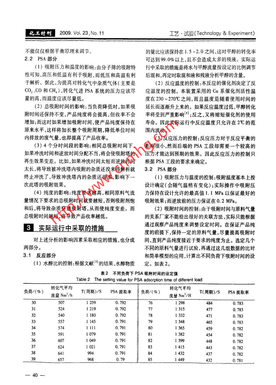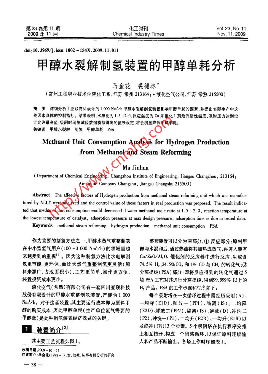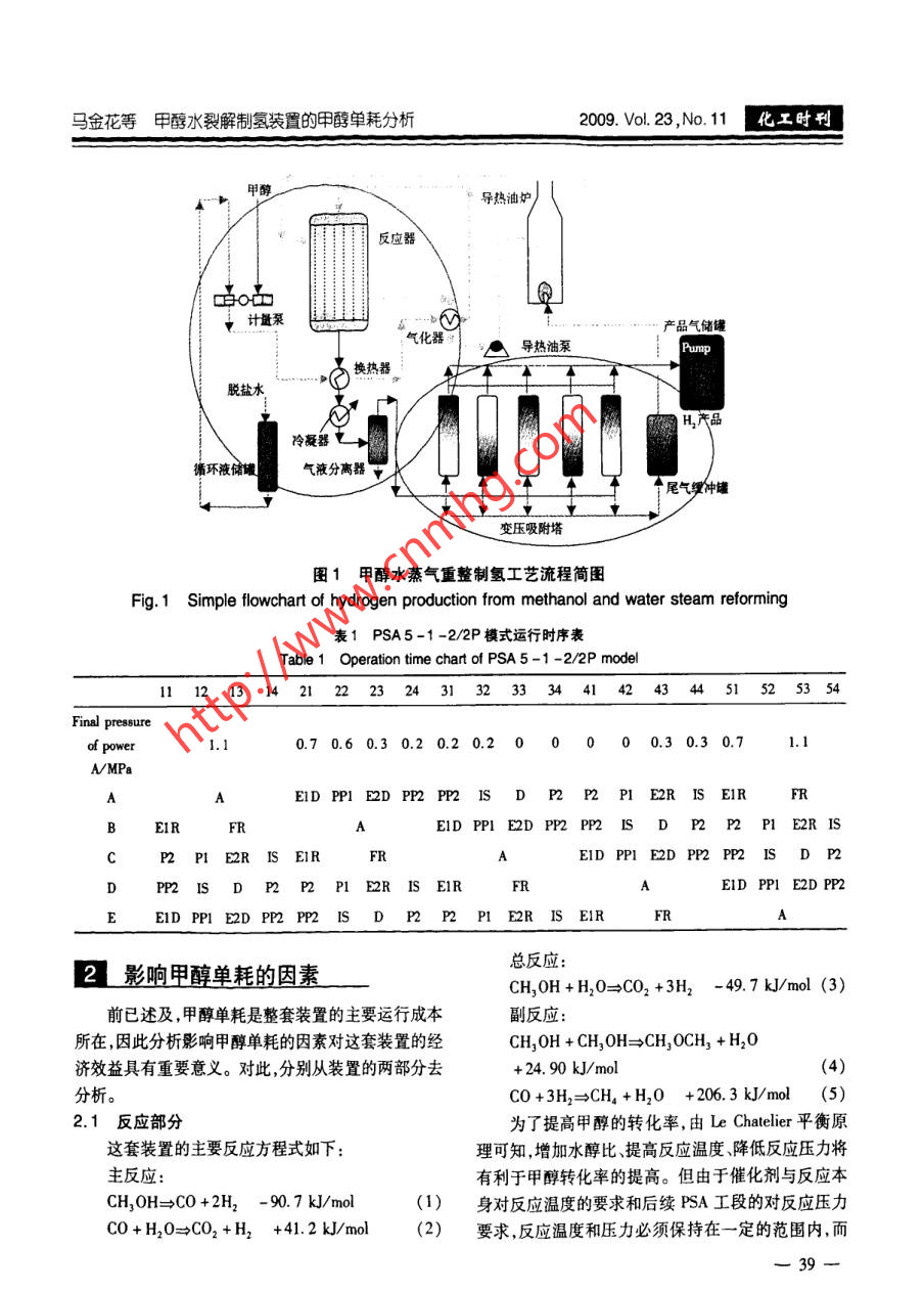 第23卷第11期化工時刊Vol. 23 ,No. 112009年11月Chemical Industry TimesNov. 11. 2009doi:10. 3969/j. issn. 1002 - 154X.2009. 11.011甲醇水裂解制氫裝置的甲醇單耗分析馬金花裘德林"(常州工程職業(yè)技術學院化工系,江蘇常州213164; *液化空氣公司,江蘇常熟215500)摘要詳細分析了亞聯(lián)高科設計的1000Nm'/h甲醇水裂解制氫裝置影響甲醇單耗的因素,并提出實際生產中這些因素具體的控制指標。結果表明:水醇比為1.5 ~2.0,反應溫度為Cu系催化1劑最低活性溫度,吸附壓力達到設計允許最高值,吸附時間按試驗數(shù)據模擬得出的值來設定,將會明顯降低甲醇單耗。關鍵詞甲醇水裂解 制氫甲醇單耗 PSAMethanol Unit Consumption Analysis for Hydrogen Productionfrom Methanol and Steam ReformingMa Jinhua(Department of Chemical Engineering, Changzhou Instute of Engineering, Jiangsu Changzhou, 213164;Air liquid Company Changshu , Jiangsu Changshu 215500)Abstract The affective factors of Hydrogen production from methanol steam reforming unit which was manufac-tured by ALLY were analyzed and the control value of these factors in real production was proposed. The result indica-ted that methanol unit consumption would decreased if water methanol mole ratio at 1.5 ~2. 0, reaction temperature atthe lowest temperature of calalyst, adsorption pressure at max design pressure, adsorption time is due to tested data.Keywords methanol steam reforming hydrogen production methanol unit consumption PSA作為重要的制氫方法之- - ,甲醇水蒸氣重整制氫整套裝置可以分為兩部分,①反應部分:原料甲在中小型氫氣用戶( 100 ~3 000 Nm'/h)的領域里越醇與水混和后,通過熱油將其加熱成蒸氣,再進入裝有來越受到的重視。因為這種制氫方法比水電解制Cu/Zn0/Al203催化劑的反應器中進行反應,生成含氫更節(jié)能、更環(huán)保,而比天然氣重整制氫更靈活(原74. 5% H2、24.5%CO2和1% CO與CH。的轉化氣;②料來源廣,占地面積小),工藝更簡單,操作更方便,分離提純( PSA)部分:即將反應得到的轉化氣通過5裝置投資成本更小。塔PSA工藝對其進行分離提純,得到99.999%以上的液化空氣(常熟)有限公司有-套四川亞聯(lián)科技H2產品。PSA的工作步驟和時序如下:股份有限設計的甲醇水重整制氫裝置,產能為1 000每個吸附塔在- -次循環(huán)過程中需經歷吸附(A)、Nm'/h。對于這套裝置,其主要運行成本即為原料甲一均降(E1D)、順放-(PP1)、隔離(IS)、二均降醇的購買成本,因此甲醇單耗(生產單位氫氣需要的(E2D)、順放二(PP2)、隔離(IS)、逆放(D)、沖洗二甲醇量)是此種制氫裝置經濟效益的關鍵。(P2)、沖洗- -(P1)、二均升( E2R)、一均升(E1R)以及終沖(FR)13個步驟。5個吸附塔在執(zhí)行程序安排1裝置簡介[2]上相互錯開,構成一個閉路循環(huán),以保證原料連續(xù)輸其主要工藝流程如圖1。人和產品不斷輸出。各塔工作時序如表1。收稿日期:2009-10-15作者簡介:馬金花(1978- ),女,助教,從事有機分析的研究馬金花等甲醇水裂解制氫裝置的甲醇單耗分析2009. Vol. 23 ,No. 11化工時刊I甲醇導熱油爐反應器李o品↓計量泵V產品氣儲罐; 氣化器導熱油泵| Pump換熱器脫鹽水冷凝器循環(huán)液儲罐氣液分離器T↑尾氣緩仲罐___ y變壓吸附塔圖1 甲醇水蒸氣重整制氫工藝流程簡圖Fig.1 Simple flowchart of hydrogen production from methanol and water steam reforming表1 PSA5-1 -2/2P模式運行時序表TableOperation time chart of PSA5 -1 -2/2P model1112.131421222:4451525354Final pressureof power1.10.70.60.30.20.20.200000.30.30.7AMPaAEIDPP1E2DPP2PP2ISDP2P2PIE2RISE1RRE1RFREIDPP1E2DPP2PP2ISDP2P2P1E2RISP2 P1 E2R IS E1REIDPPIE2DPP2PP2ISDP2PP2IsDP2P2P1E2RISEIREID PPI E2D PP2E1DPPIE2DPP2PP2ISDP2P2PIE2RISEIR總反應:2L影響甲醇單耗的因素CH,OH +H0→CO2 +3H2 -49.7 kJ/mol (3)前已述及,甲醇單耗是整套裝置的主要運行成本副反應:所在,因此分析影響甲醇單耗的因素對這套裝置的經CH,OH + CH,0H=CHgOCH, +H2O濟效益具有重要意義。對此,分別從裝置的兩部分去+ 24. 90 kJ/mol .(4)分析。CO +3H2→CH。+H20 + 206.3 kJ/mol(5)2.1反應部分為了提高甲醇的轉化率,由Le Chatelier平衡原這套裝置的主要反應方程式如下:理可知,增加水醇比、提高反應溫度、降低反應壓力將主反應:有利于甲醇轉化率的提高。但由于催化劑與反應本CH,OH=→CO +2H2 - 90.7 kJ/mol(1)身對反應溫度的要求和后續(xù)PSA工段的對反應壓力CO +H20=CO2+H2 +41.2 kJ/mol(2)要求,反應溫度和壓力必須保持在一定的范圍內,而一39一化工時刊2009. Vol. 23 ,No.11工藝●試驗《Technology & Experiment》不能僅僅根據平衡原理來調節(jié)。的量比應該保持在1.5 ~2.0之間,這時甲醇的轉化率2.2 PSA部分可達到99.0%以上,且不會造成太多的殘液。實際運(1)吸附壓力和溫度的影響:由分子篩的吸附特行中采取的措施是將水與甲醇流量按設定的比例調節(jié)性可知高壓和低溫有利于吸附.而低壓和高溫有利后混和,再定時取混和液和殘液分析甲醇的含量。于解析。據此,為提高對轉化氣中雜質氣體(主要是(2)反應溫度的控制:本反應的催化劑決定了反CO2、CO和CH.) ,轉化氣進PSA系統(tǒng)的壓力應該盡應溫度的控制。本裝置采用的Cu系催化劑活性溫量的高,而溫度應該盡量低。度在230~2709C之間,而且溫度是隨著使用時間的(2)總吸附時間的影響:當負荷降低時,如果吸延長而逐漸升上來的。如果反應溫度過低,甲醇轉化附時間還保持不變,產品純度將會提高,但收率不會率將受到嚴重影響() ;反之,又將縮短催化劑的使用增加;而這時如果增加吸附時間,使產品純度保持在壽命。因此實際運行中反
