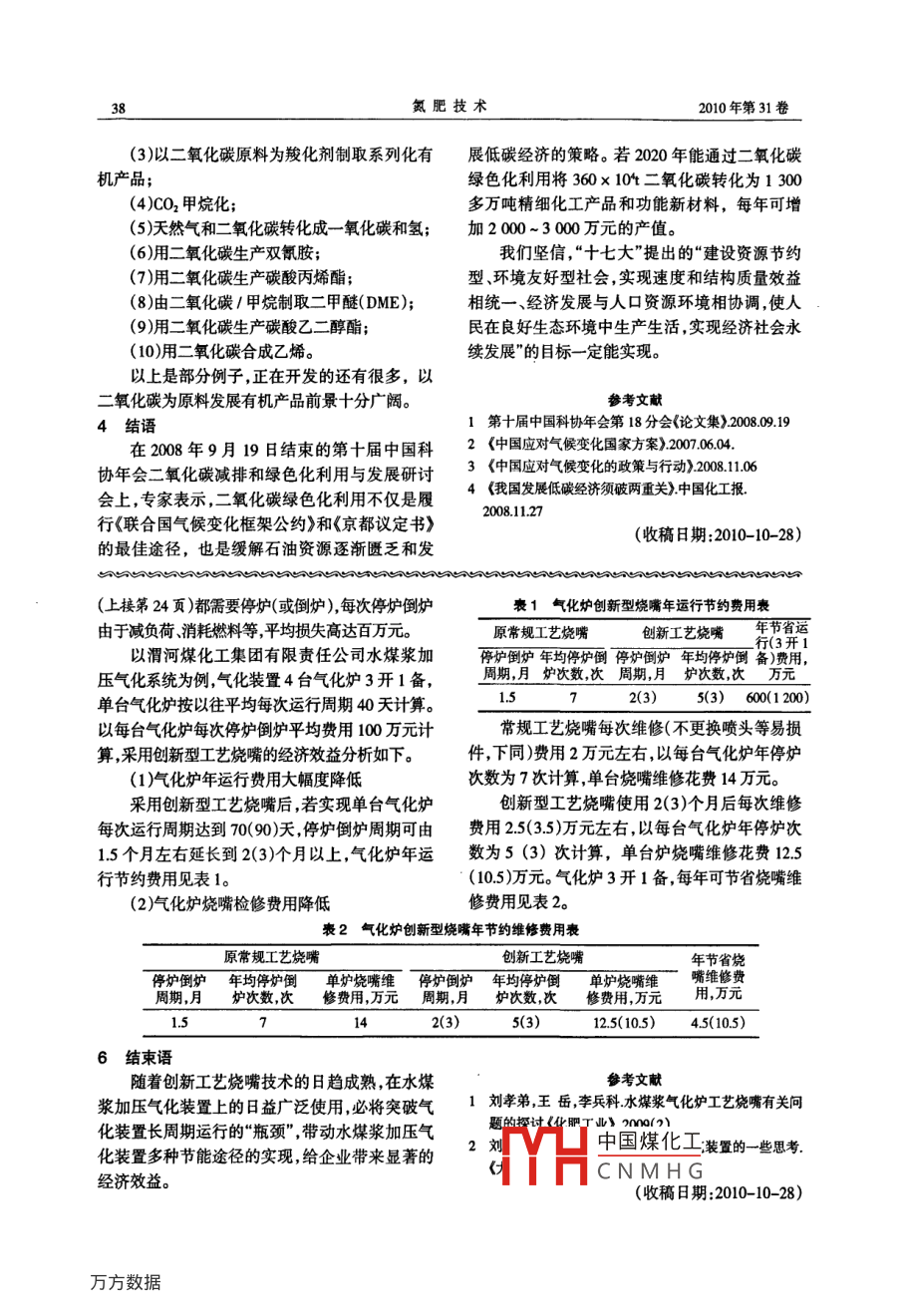 22氨肥技術(shù)2010年第31卷第6期創(chuàng)新氣化爐工藝燒嘴技術(shù)小結(jié)尹潤生李兵科(陜西渭河煤化工集團(tuán)有限責(zé)任公司渭南714000 北京航天動力研究所100076)摘要簡要介紹水煤漿加壓氣化裝置在我國雖然得到越來越廣~泛地應(yīng)用,但尚有很大的節(jié)能潛力可挖。并探討了水煤漿加壓氣化裝置的節(jié)能途徑,結(jié)合該公司氣化裝置的特點,確定了改進(jìn)I藝燒嘴的節(jié)能降耗方案,并分析了可預(yù)期的經(jīng)濟(jì)效益。關(guān)鍵詞水煤漿氣化燒嘴節(jié)能1引言現(xiàn)階段,水煤漿加壓氣化爐的氣化壓力有隨著世界石油、天然氣能源的日益枯竭,尤4.0MMa.6.5MPa和8.5MPa,其配套工藝燒嘴的連其對于我國少油貧氣多煤的能源格局,新型煤化續(xù)運行壽命一般在45 ~ 60天左右。水煤漿加壓工產(chǎn)業(yè)在我國得到了蓬勃發(fā)展,煤氣化是新型煤氣化裝置連續(xù)運行周期相對較短成了節(jié)能降耗化工發(fā)展的重要單元技術(shù),而水煤漿氣化工藝是的主要“瓶頸"。新型煤化工的主流工藝之- -。國內(nèi)大型先進(jìn)煤氣水煤漿加壓氣化裝置實現(xiàn)長周期運行對企化技術(shù)與國外相比雖還有-一定差距,但近年來加業(yè)有著特別的意義,不但能避免因停爐或倒?fàn)t期快了開發(fā)速度?!笆?期間,分別對具有自主知間影響的產(chǎn)量和原料及能源消耗,而且能大大降識產(chǎn)權(quán)的多噴嘴水煤漿氣化、干煤粉氣流床氣化低水煤漿氣化爐生產(chǎn)線運行和維護(hù)費用,給企業(yè)技術(shù)進(jìn)行了工業(yè)示范開發(fā)和放大研究。目前煤制帶來可觀的經(jīng)濟(jì)效益。油項目,煤制甲醇、合成氨、二甲醚等項目在我國從國外和國內(nèi)工業(yè)化裝置上看,在系統(tǒng)設(shè)已蓬勃開展。計.工藝運行、設(shè)備等方面還存在不少問題,影響自從美國德士古公司在重油氣化工藝的基著裝置長周期安全穩(wěn)定滿負(fù)荷運行。礎(chǔ)上開發(fā)出水煤漿加壓氣化工藝技術(shù)以來,因該(1)氣化工藝系統(tǒng)設(shè)計技術(shù)具有煤種適應(yīng)性廣、碳轉(zhuǎn)化率高、氣體質(zhì)量水煤漿加壓氣化裝置用水煤漿和純氧作為好、生產(chǎn)連續(xù)性強(qiáng)、可高壓運行、單爐生產(chǎn)能力原料進(jìn)行加壓燃燒實現(xiàn)氣化,工藝系統(tǒng)設(shè)計對水大、可實現(xiàn)遠(yuǎn)程計算機(jī)控制和最優(yōu)化操作、相對煤漿和純氧的配比、壓力、流量、溫度都有具體的節(jié)能環(huán)保等優(yōu)點,在許多煤藏量大國(尤其是我要求,同時對氣化系統(tǒng)各組成設(shè)備有著嚴(yán)格的技國)得到了廣泛應(yīng)用。國產(chǎn)化的華東理工大學(xué)四術(shù)要求。企業(yè)-般要嚴(yán)格按照氣化工藝系統(tǒng)設(shè)計對沖氣化工藝、西北化工研究院多元料漿氣化工要求,應(yīng)用符合要求的設(shè)備和原料來實現(xiàn)氣化生藝達(dá)力科非熔渣-熔渣分級氣化工藝也在國內(nèi)產(chǎn)的穩(wěn)定運行。煤化工行業(yè)占有了一席之地。水煤漿氣化工藝系統(tǒng)復(fù)雜,由于考慮水煤漿隨著水煤漿加,壓氣化工藝技術(shù)在國內(nèi)應(yīng)用氣化爐生產(chǎn)線安全運行的重要性, - -般不通過改的日益成熟,生產(chǎn)和節(jié)能環(huán)保方面對該技術(shù)的要動氣化工藝配置來實現(xiàn)節(jié)能降耗。但隨著殼牌、求也越來越高,在國產(chǎn)化的基礎(chǔ)上,突破該技術(shù)CSP等干煤粉氣化工藝系統(tǒng)運行的8漸增多,水現(xiàn)有的一些問題和發(fā)展“瓶頸”,探索水煤漿加壓煤漿加壓氣化工藝系統(tǒng)改進(jìn)可以借鑒干煤粉氣化氣化裝置的節(jié)能途徑,將是非常有意義的。工藝系統(tǒng)的許多優(yōu)點,從而實現(xiàn)系統(tǒng)節(jié)能降耗。陜西渭河煤化工集團(tuán)有限責(zé)任公司于1996(2)氣化系統(tǒng)工藝運行年引進(jìn)水煤漿加壓氣化裝置,采用氣化壓力水煤漿加壓氣化系統(tǒng)對煤種、水、氧氣的要6.5MPa、直徑2.8m的氣化爐4臺。其主要特點是.求具中國煤化工作人員的操作氣化壓力高、氣化產(chǎn)品產(chǎn)量大。水平1HCNM H G.2水煤漿加壓氣化裝置 節(jié)能途徑的分析在兒弓地紅o仕時朋正r ,對于工藝系統(tǒng)第6期尹潤生等:創(chuàng)新氣化爐工藝燒嘴技術(shù)小結(jié)23運行,選用性能更佳的煤種、水、氧氣,提升工藝年與北京航天石化技術(shù)裝備工程公司就開始了操作人員的操作水平,制定優(yōu)化的停爐倒?fàn)t周工藝燒嘴方面的合作,已經(jīng)共同研制開發(fā)了十余期,實現(xiàn)氣化參數(shù)的優(yōu)化運行,也是節(jié)能降耗的臺工藝燒嘴。-條途徑。由北京航天石化技術(shù)裝置工程公司研發(fā)的(3)氣化裝置設(shè)備新型工藝燒嘴,首先實現(xiàn)單臺氣化爐每次運行周設(shè)備的技術(shù)水平是保證系統(tǒng)性能的關(guān)鍵,也、 期達(dá)到70~85天,逐步實現(xiàn)每次運行周期達(dá)到是提升系統(tǒng)性能最切實可行的途徑。水煤漿加壓90天以上。氣化裝置由數(shù)量龐大的設(shè)備組成,根據(jù)氣化裝置4創(chuàng)新型工藝燒嘴的特點,可以分析出水煤漿加壓氣化裝置的主要水煤漿氣化工藝燒嘴為三流道式內(nèi)外混合關(guān)鍵設(shè)備。通過對這些主要設(shè)備進(jìn)行改進(jìn),可以霧化形式,外流道和內(nèi)流道輸送高壓氧氣,中流較容易