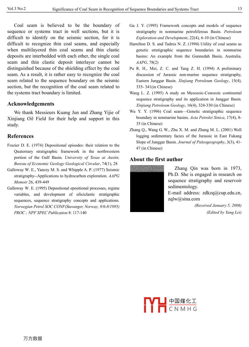 2006Petroleum ScienceVol 3 No. 2Significance of Coal Seam in Recognition of Sequence Boundaries and SystemsTract of the Jurassic in East Fukang Slope, Junggar Basin, Chinahang Qin 2, Zhu Xiaomin" and Song Gan(1. Geosicences Department, China University of Petroleum, Beijing 102249, China)(2. Key Laboratory for Hydrocarbon Accumulation under Ministry of Education,China University of Petroleum, Beijing 102249, China)Abstract: The Jurassic in the East Fukang Slope can be divided into six sequences based on sequence stratigraphy bycombining logging, core and seismic data. The indicators of sequence boundaries include unconformity, coal seams,change of spore and pollen abundance, scour surfaces and base conglomerate, change of logging curve and sedimentaryfacies. How to determine the location of the first flooding surfaces and the maximum flooding surface is the key step todivide the systems tract. There occurred a topographic slope break in the East Fukang Slope when the Jurassic wasdeposited, and therefore we can recognize the location of the first flooding surface and establish the sequencestratigraphic framework with the slope break in the study area. Coal seams regionally distributed are correlatable andisochronic, and record the termination of a depositional event or episode. So, the regional coal seam(more than 60percent coverage)can be used as the genetic stratigraphic sequence boundary, while locally distributed coal seam(lessthan 60 percent coverage)can be used as the systems tract boundary. The thick coal seams distributed regionally in themiddle of the Badaowan Formation and the lower part of the Xishanyao Formation in the study area act as the sequenceboundaries, while the thin and locally distributed coal seam acts as the systems tract boundary, which results in thecorrelation of the division of sequence stratigraphy of the Jurassic to the whole basin where coal seams are developedextensively.Key words: Jurassic, sequence boundary, systems tract, coal seamanalysis of logging, cores and seismic data. Each1. Introductionsequence corresponded with the reflected wave group ofThe east Fukang Slope is located in the east of the J, J, J, J,J", J,K, etc(Fig. 2)(Zhang, et alChangji Sag and on the junction of the middle-south of 2001; Wang, 1995). Furthermore by comparing thesequence divisions, based on the seismic, well loggingin the northeast of the Junggar Basin, Northwest China, and core data, the consistency of the sequencewith an area of about 5,000 square kilometres(Fig. 1). stratigraphic division of the Jurassic, was achieved inWhen the Jurassic was deposited, a huge slope with athe study areanorth-south dip was formed, which consisted of theWucaiwan Sag, front of the Kelameili Mountain2. Identification of sequence boundarypiedmont, the Baijiahai Salient and the east FukangThe key to defining a sequence stratigraphic modelSlope in the narrow sense. Because of the slight in a sedimentary basin is how to recognize the sequenceinfluence of the Yanshan Movement, the traps formed boundaries of the different grades. Based on the wellby tectogenesis were not developed. So it is importanlogging, core and seismic data, the sequence boundariesto conduct a study of the sequence stratigraphy about of different grades are identified by the indication ofthe Jurassic in the East Fukang Slope, so that subtle tectonic movement interface, coal seam, change oftraps might be found(Gu, 1995). The jurassiclithology and lithofacies, unconformity etcomposed of lower series Badaowan Formation J1b) division of the sequence stratigraphy of the East Fukangand Sangonghe Formation ( JIs), middle serieYH中國(guó)煤化工Xishanyao Formation (J2x)and Toutunhe Formation J2t,table sequenceand upper series Qigu Formation (J3a) and Kalazha boundaCNMHGFormation J3)(Pu, et al., 1994)from bottom to top inA sequence is defined as the relatively conformablethe East Fukang Slopeelated in genesis betweenThe jurassic in the study area can be divided into six unconformities or conformities which can be correlatedsequences based on sequence stratigraphy through an with the unconformity. The retlection termination typesPetroleum Science2006indicating the sequence boundary include onlap, Yanshan movement, spread widely and cause extensivedownlap, truncation, toplap, etc. Three unconformities truncations of the underlying formations, whileindicating respectively the tectonic movement of the unconformities that developed locally exist betweenIndosinian(J), I episode(J")and II episode(K)of the other sequences in the Jurassic(Fig 3)o Cai311. Lunan Uplift3. Baijiahai Salient4. Wucaiwan Salient5.Zhangbei Fault andDrape Zonengo7. Santai SalientTai22 o Bei34818.Mountain FrontFault-fold zoneU Study areaO Cai3 1-LocationFig 1 Locationof the East Fukang Slope41942943b2o0keAsszwdudkGKaSSSSiOFig. 2 The sequence stratigraphic division and sequence boundary of the Jurassic in the East Fukang Slope(Section w9241)2)Coal seams distributed regionally are markers for characteristics of reflected wave termination show thatthe construction of a sequence stratigraphic framework. onlap or downlap lies on the top of a reflected waveThe coal seams occurring respectively in the middle group中國(guó)煤化工 seismic section.Forpart of the Badaowan Formation(corresponding to the examplreflected wave group of J 2)and the lower part of on theYHtCNMHGoWnlaps can be founde: .,. Broup(z)of coal seamXishanyao Formation(corresponding to the reflected on the JH8715 seismic section( Fig 3), and a series ofwave group of J ) in the Jurassic are distributed onlaps transferred gradually downwards the basin onextensively and stably, and they were easy to trace and the JH8725 seismic section could be identified on thecorrel乃數(shù)據(jù)the whole Junggar Basiwave group J. Therefore, the main coal seamsVol 3 No. 2Significance of Coal Seam in Recognition of Sequence Boundaries and Systems tract9occurring respectively in the middle part of the reflected wave gr