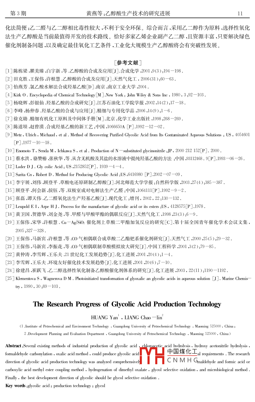 第23卷第3期廣東石油化工學(xué)院學(xué)報(bào)Vol, 23 No 32013年6月Jourmal of Guangdong University of Petrochemical TechnologyJun.2013乙醇酸生產(chǎn)技術(shù)的研究進(jìn)展黃燕,梁朝林(1.廣東石油化工學(xué)院化工與環(huán)境工程學(xué)院,廣東茂名52500g.廣東石油化工學(xué)院發(fā)展規(guī)劃與評(píng)估處,廣東茂名52500摘要:首先概述現(xiàn)有的幾種工業(yè)生產(chǎn)乙醇酸的方法,即氯乙酸水解法、羥基乙氰水解法、甲醛羰基化法、草酸電解法等,雖然能生產(chǎn)乙醇酸,但不符合安全環(huán)保理念;綜合分析了當(dāng)前改進(jìn)乙醇酸生產(chǎn)技術(shù)路線的研究方冋向,如乙二醛氧化法、甲醛與甲酸或甲酸甲酯偶聯(lián)法、草酸二甲酯加氫法、乙二醇選擇性氧化法、微生物法;最后指岀,乙醇酸工業(yè)生產(chǎn)的最佳發(fā)展方向,應(yīng)當(dāng)是以乙二醇為原料選擇性氧化生產(chǎn)乙醇酸關(guān)鍵詞:乙醇酸;生產(chǎn)技術(shù);乙二醇中圖分類號(hào):O623.65文獻(xiàn)標(biāo)識(shí)碼:A文章編號(hào):2095-2562(2013)03-0008-04乙醇酸( Glycollic acid)又稱羥基乙酸、甘醇酸,是最簡(jiǎn)單的α一羥基酸。乙醇酸熔點(diǎn)80℃,沸點(diǎn)l00℃,溶于乙醇、乙酸和水,微溶于乙醚。乙醇酸分子中含有一個(gè)羥基和一個(gè)羧基,它既是一種醇又是一種有機(jī)酸,同時(shí)具有醇和有機(jī)酸的性質(zhì)。乙醇酸是重要的化工產(chǎn)品和有機(jī)合成中間體,廣泛應(yīng)用在個(gè)人護(hù)理產(chǎn)品、黏合劑、染色、金屬清洗、紡織上,特別在醫(yī)學(xué)工程材料和高分子降解材料等許多領(lǐng)域,使得♂醇酸的需求量逐年增加。乙醇酸主要存在于甜菜、甘蔗及未成熟的葡萄汁中,但它含量很低,且和其它物質(zhì)共同存在,很難提純,工業(yè)生產(chǎn)都采用合成法。目前世界上乙醇酸的生產(chǎn)公司為聯(lián)合碳化物公司、日本丸和公司及美國(guó)杜邦公司等。國(guó)內(nèi)乙醇酸的市場(chǎng)需求量大,但尚無大規(guī)模生產(chǎn)的企業(yè),乙醇酸及相關(guān)產(chǎn)品主要依賴進(jìn)口。因此,提高乙醇酸的產(chǎn)量和開發(fā)新的生產(chǎn)技術(shù)路線成為重點(diǎn)的研究課題。1現(xiàn)有乙醇酸的生產(chǎn)技術(shù)1.1氯乙酸水解法Witzemann在碳酸鈣或碳酸鋇作用下采用氯乙酸水解制備乙醇酸,乙醇酸收率可達(dá)88.7%6。但該方法鈣離子或鋇離子的消除要消耗大量的草酸或硫酸,由此導(dǎo)致成本太髙、反應(yīng)時(shí)閫過長(zhǎng)、過濾緩慢、生產(chǎn)周期長(zhǎng),不利于工業(yè)化生產(chǎn)。日本Oska化學(xué)公司用NaOH水溶液水解在100℃處理氯乙酸2h后,再用35%濃鹽酸過濾消除NaCl等固體雜質(zhì),用甲基異丁基酮萃取處理濾液,所得用水反萃取有機(jī)相獲得ξ醇酸水溶液。濃縮后得到88%乙醇酸水溶液產(chǎn)品,乙醇酸純度不低于99.6%。我國(guó)最傳統(tǒng)的乙醇酸生產(chǎn)工藝以氯乙酸為原料,在氫氧化鈉與甲醇存在的條件下,先反應(yīng)得到乙醇酸甲酯再水解得到乙醇酸。該方法乙醇酸收率低,工藝流程長(zhǎng),僅僅適合小規(guī)模生產(chǎn)。楊曉輝等對(duì)氯乙酸氫氧化鈉催化水解來制備乙醇酸進(jìn)行了研究,研究中考察了反應(yīng)時(shí)間、氫氧化鈉的質(zhì)量分?jǐn)?shù)、溫度等對(duì)反應(yīng)的影響。尤其是篩選了反應(yīng)條件,從而有效控制住聚合反應(yīng),使原料中的雜質(zhì)二氯乙酸反應(yīng)生成乙醇酸。研究中對(duì)反應(yīng)過程采用了氣相色譜分析,研究表明乙中國(guó)煤化工氯乙酸水解法工藝流程長(zhǎng)、規(guī)模小、嚴(yán)重腐蝕設(shè)備、增CNMHG、收率低、污染環(huán)境等,因此一定程度上限制了乙醇酸的廣泛使用收稿日期:2012-08-16;修回日期:2013-01作者簡(jiǎn)介:黃燕(1984—),女,江西豐城人,碩士,主要從事精細(xì)化工方面的研究與開發(fā)工作。第3期黃燕等:乙醇酸生產(chǎn)技術(shù)的研究進(jìn)展1.2羥基乙氰水解法以甲醛和氫氰酸(氰化鈉)為原料,在常壓100~10℃、弱酸性條件下,甲醛溶液和氰化鈉溶液反應(yīng)生成乙醇酸鈉鹽,再進(jìn)行酸化反應(yīng)可獲取含有乙醇酸的混合液,最后進(jìn)行分離提純可得到成品。在常壓0?50℃,在弱堿性或弱酸性的條件下,經(jīng)過加氰合成和酸性水解反應(yīng)生成羥基乙腈,而羥基乙腈于酸性條件下水解,在反應(yīng)溫度高于l00℃時(shí),可得到濃度很稀的混合液,然后先用有機(jī)溶劑進(jìn)行萃取,接著用熱水反萃,可獲得乙醇酸的水溶液產(chǎn)品日本三菱化成工業(yè)公司將甲醛和氫氰酸用雙滴加的方式進(jìn)料,然后通過液相反應(yīng)生成羥基乙腈。該方法收率可達(dá)到99.18%,但產(chǎn)品經(jīng)過甲苯共沸蒸餾后,得到純度為99.15%的產(chǎn)品。此類方法生產(chǎn)成本不高,產(chǎn)品質(zhì)量穩(wěn)定缺點(diǎn)在于氫氰酸易揮發(fā),生產(chǎn)安全性低檢修設(shè)備困難華東理工大學(xué)的研究者將97%6HSO與水混合,加熱到120℃,再加入45%羥基乙腈水溶液,回流水解6h,制得乙醇酸水溶液。根據(jù)三辛基胺、二甲基亞砜、二乙基(甲)酮體積比為2:3:5,制得的混合溶劑萃取乙醇酸溶液,接著再用水反萃取有機(jī)相,再減壓蒸餾得到41.6%乙醇酸溶液產(chǎn)品。按羥基乙腈耗量計(jì),乙醇酸收率為97.5%。該工藝簡(jiǎn)單,生產(chǎn)成本低,產(chǎn)品質(z