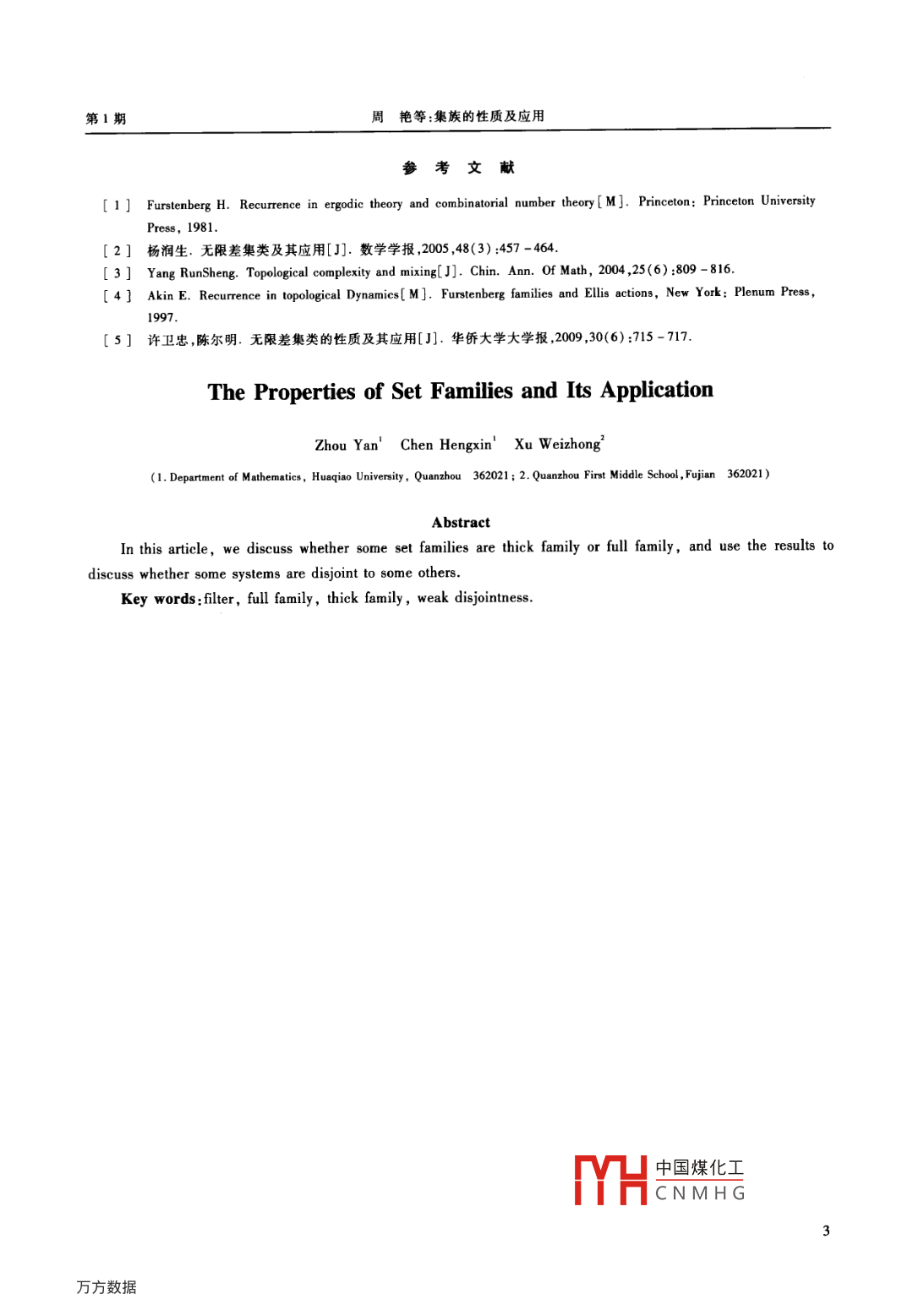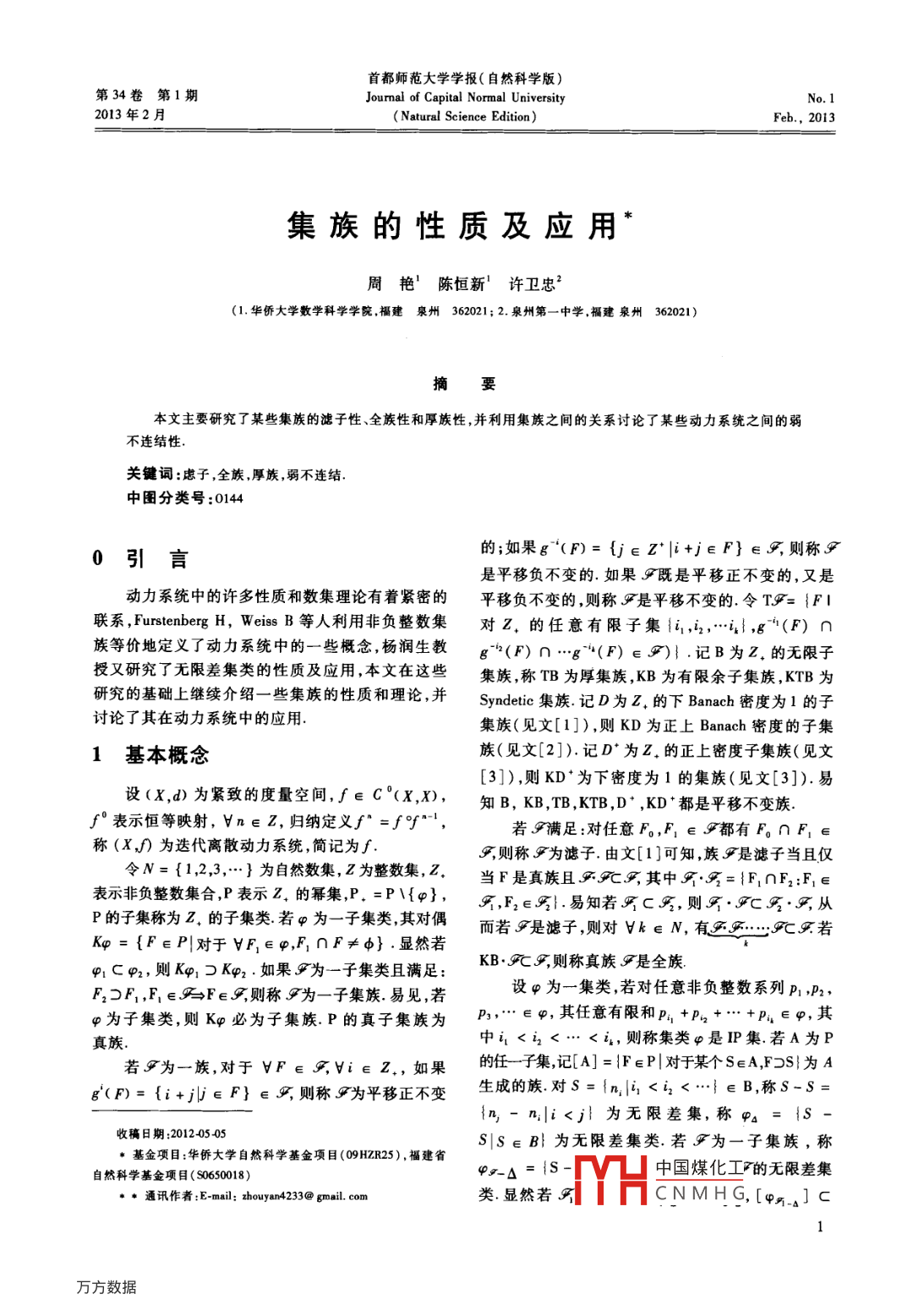 首都師范大學(xué)學(xué)報(自然科學(xué)版)第34卷第1期Journal of Capital Normal University2013年2月Natural Science Edition)Feb.,2013集族的性質(zhì)及應(yīng)用周艷!陳恒新許衛(wèi)忠(1.華僑大學(xué)數(shù)學(xué)科學(xué)學(xué)院,福建泉州362021;2泉州第一中學(xué),福建泉州362021)本文主要研究了某些集族的濾子性、全族性和厚族性,并利用集族之間的關(guān)系討論了某些動力系統(tǒng)之間的弱不連結(jié)性關(guān)鍵詞:慮子,全族厚族,弱不連結(jié)中圖分類號:01440引言的;如果g‘(F)=∈z+j∈F}∈只則稱P是平移負(fù)不變的.如果既是平移正不變的,又是動力系統(tǒng)中的許多性質(zhì)和數(shù)集理論有著緊密的平移負(fù)不變的,則稱是平移不變的令T={F聯(lián)系, Furstenberg H, Weiss B等人利用非負(fù)整數(shù)集對Z,的任意有限子集{i1i,…i,g(F)∩族等價地定義了動力系統(tǒng)中的一些概念楊潤生教g(F)n…g“(F)∈羅)}.記B為Z.的無限子授又研究了無限差集類的性質(zhì)及應(yīng)用本文在這些集族,稱TB為厚集族KB為有限余子集族KTB為研究的基礎(chǔ)上繼續(xù)介紹一些集族的性質(zhì)和理論,并 Syndetie0集族記D為Z,的下 Banach密度為1的子討論了其在動力系統(tǒng)中的應(yīng)用集族(見文[1]),則KD為正上 Banach密度的子集1基本概念族(見文[2]).記D為Z,的正上密度子集族(見文[3]),則KD為下密度為1的集族(見文[3]).易設(shè)(X,d)為緊致的度量空間,∫∈C°(X,X),知B,KB,TB,KTB,D,KD·都是平移不變族f°表示恒等映射,Vn∈Z,歸納定義f”=f%f若9滿足:對任意F0,F1∈都有F∩F1稱(X,為迭代離散動力系統(tǒng),簡記為∫9則稱為濾子.由文[1]可知,族是濾子當(dāng)且僅令N={1,2,3,…}為自然數(shù)集,z為整數(shù)集,Z當(dāng)F是真族且C只其中·={F1∩F2:F1∈表示非負(fù)整數(shù)集合P表示Z,的冪集,P.=P\{甲},,F2E1易知若C,則·C只從P的子集稱為Z,的子集類若甲為一子集類其對偶而若是濾子,則對!k∈N,有…;只若Kq={F∈P對于ⅤF1∈甲,F∩F≠中}·顯然若甲1Cq2,則K13K2如果為一子集類且滿足:KB·死℃∝則稱真族是全族F2F1,F1∈必F∈只則稱夕為一子集族.易見,若設(shè)φ為一集類,若對任意非負(fù)整數(shù)系列p1,P2,p為子集類,則K必為子集族P的真子集族為P,∈,其任意有限和P1+p2+…+P∈甲,其真族中i