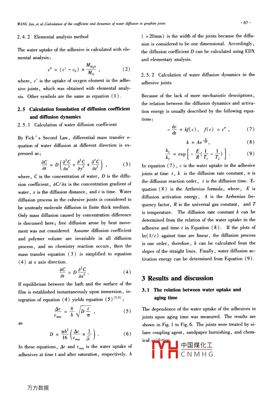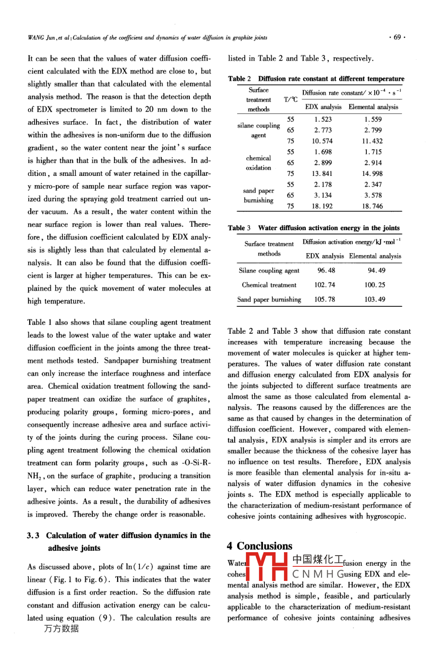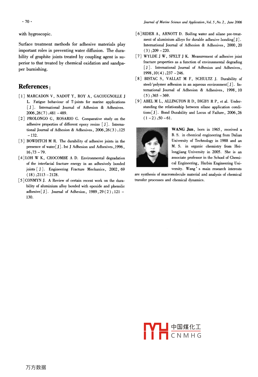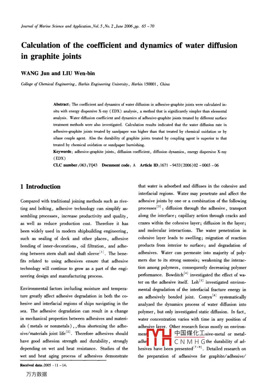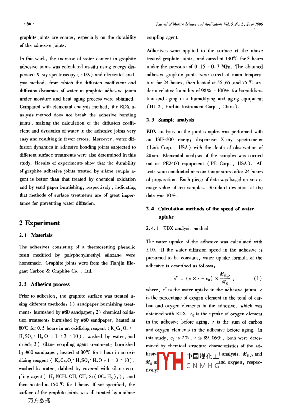 Journal of Marine Science and Applicaion, Vol. 5 ,No. 2 ,June 2006 ,pp.65 -70Calculation of the coefficient and dynamics of water diffusionin graphite jointsWANG Jun and LIU Wen-binCollege of Chemical Engineering , Harbin Eninering Uniersity, Harbin 150001, ChinaAbstract: The coefficient and dynamics of water diffusion in adhesive- graphite joints were calculated in-situ with energy dispersive X-ray ( EDX) analysis, a method that is significantly simpler than elementalanalysis. w ater diffusion cofficient and dynamics of adhesive-graphite joints treated by different surfacetreatment methods were also investigated. Calculation results indicated that the water diffusion rate inadhesive-graphite joints treated by sandpaper was higher than that treated by chemical oxidation or bysilane couple agent. Also the durability of graphite joints treated by coupling agent is superior to thattreated by chemical oxidation or sandpaper burmishing.Keywords: adhesive -graphite joints , difusion coffcient, difusion dynamics, energy dispersive X-ray(EDX)CLC number :063 ;TQ43 Document code: A Article ID:1671 - 9433(2006)02 -0065 -061 Introductionthat water is adsorbed and diffuses in the cohesive andinterfacial regions. Water may penetrate and affect theCompared with traditional joining methods such as rive-adhesive joints by one or a combination of the followingting and bolting, adhesive technology can simplify as-processes'! : diffusion through the adhesive , transportsembling processes, increase productivity and quality ,along the interface ; capillary action through cracks andas well as reduce production cost. Therefore it hascrazes within the cohesive layer; diffusion in the layer;been widely used in modern shipbuilding engineering,and molecular interactions. The water penetration insuch as sealing of deck and other places, adhesivecohesive layer leads to swelling; migration of reactionbonding of inner-decorations, oil filtration, and adhe-products from interior to surface; and degradation ofring between stern shaft and shaft slee. The bene-adhesives. Water can permeate into majority of poly-fits related to using adhesives ensure that adhesivemers due to its strong osmosis; weakening the interac-technology will continue to grow as a part of the engi-tion among polymers,consequently decreasing polymerneering design and manufacturing process.performance. Bowditch4I investigated the effect of wa-ter on the adhesive itself. Loh' 5 J investigated environ-Environmental factors including moisture and tempera-mental degradation of the interfacial fracture energy inture greatly affect adhesive degradation in both the co-n adhesively bonded joint. Comyn 61 systematicallyhesive and interfacial regions of ships navigating in theanalyzed the dynamics process of water diffusion intosea. The adhesive degradation can result in a changepolymer, but only invetigated static diffusion. In fact,in mechanical properties between adhesives and materi-water concentration varies with time in any position ofals ( metals or nonmetals),, thus shortening the adhe- adhesive layer. Other research focus mostly on environ-sive/ 'materials joint life' 21 。Therefore adhesives shouldmen中國煤化工sive-metal or metal-have good adhesion strength and durability, stronglyadhe|YHCNMHGthedurabilityofad-depending on wet and heat resistance. Studies of thehesives have been presented'- 9 . Detailed research onwet and heat aging process of adhesives demonstratethe preparation of adhesives for graphite/ adhesive/Reeved data:2005 -11 -14.●66●Journal of Marine Science and Application , Vol.5 ,No.2 , June 2006graphite joints are scarce, especially on the durabilitycoupling agent.of the adhesive joints.Adhesives were applied to the surface of the aboveIn this work , the increase of water content in graphitetreated graphite joints, and cured at 130C for 3 hoursadhesive joints was calculated in-situ using energy dis-under the pressure of 0.15 ~ 0.3 MPa. The obtainedpersive X-ray spectroscopy ( EDX) and elemental anal-adhesive-graphite joints were cured at room tempera-ysis method, from which the diffusion coefficient andture for 24 hours, then heated at 55 ,65 ,and 75 C un-diffusion dynamics of water in graphite adhesive jointsder a relative humidity of 98% ~ 100% for humidifica-under moisture and heat aging process were obtained.tion and aging in a humidifying and aging equipmentCompared with elemental analysis method, the EDX a-(HL-2, Harbin Instrument Corp.,China).nalysis method does not break the adhesive bondingjoints, making the calculation of the diffusion coeffi-2.3 Sample analysiscient and dynamics of water in the adhesive joints veryEDX analysis on the joint samples was performed witheasy and resulting in fewer errors. Moreover, water dif-an ISIS-300 energy dispersive X -ray spectrometerfusion dynamics in adhesive bonding joints subjected to(Link Corp.,USA) with the depth of observation ofdiferent suface treatments were also determined in this20nm. Elemental analysis of the samples was carriedstudy. Results of experiments show that the durabilityout on PE2400 equipment (PE Corp., USA). Allof graphite adhesive joints treated by silane couple a-tests were conducted at room temperature after 24 hoursgent is better than that treated by chemical oxidationof preparation. Each piece of data was based on an av-and by sand paper bumishing, respectively , indicatingerage value of ten samples. Standard deviation of thethat methods of surface treatments are of great impor-data was 10% .tance for preventing water diffusion.2.4 Calculation methods of the speed of wateruptake2 Experiment2.4. 1 EDX analysis method2.1 MaterialsThe water uptake of the adhesive was caleulated withThe adhesives consisting of a thermosetting phenolicEDX. If the water diffusion speed in the adhesive is .resin modified by polyphenylmethyl siloxane werepresumed to be constant, water uptake formula of thehomemade. Graphite joints were from the Tianjin Ele-adhesive is described 