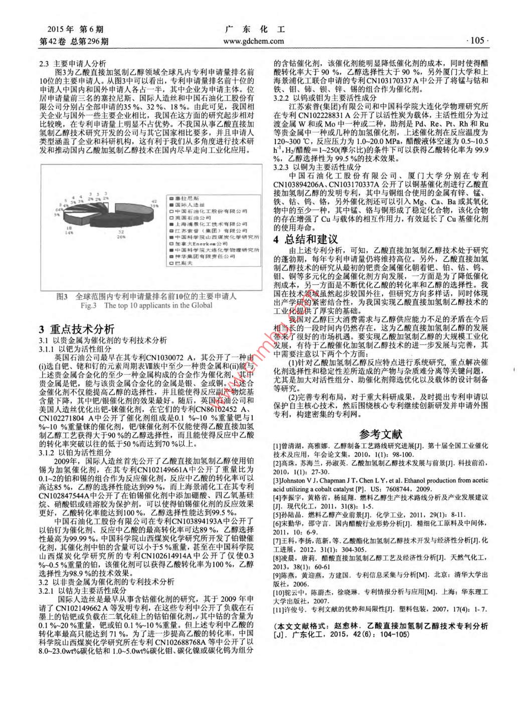東化工2015年第6期104www.gdchem.com第42卷總第296期乙酸直接加氫制乙醇技術(shù)專利分析趙愈林(國家知識產(chǎn)權(quán)局專利局專利審查協(xié)作江蘇中心,江蘇蘇州215000[摘要]對乙酸直接加氫制乙醇技術(shù)領(lǐng)域?qū)@夹g(shù)的國內(nèi)外申請態(tài)勢進行了全面深入的分析,包括專利申請趨勢、主要申請人、申請國家分布、重點專利的分析,以期乙酸直接加氫制乙醇的專利技術(shù)現(xiàn)狀,為我國專利申請人今后確定研發(fā)方向和制定專利保護策略提供了參考。[關(guān)鍵詞]乙酸加氫;乙醇;專利[中圖分類號TQ[文獻標識碼]A[文章編號]10071865(2015)06-0104-02Patent Analysis of Direct Hydrogenation of Acetic Acid to ethaiZhao Yulin(Patent Examination Cooperation Jiangsu Center of the Patent Office, SIPO, Suzhou 215000, China)Abstract: From the full completely analysis of the global patent application in the filed of direct hydrogenation of acetic acid to ethanol, including applicationtendency, the dominated applicant, the producing technology states, the main patents et al, so as to reveal the present status of patents on direct hydrogenation ofacetic acid to ethanol to provide the reference for patent applicant in determining the research direction and making patent protection strategy乙醇是既一種重要的化工原料和有機溶劑,也是一種安全清潔能源,一方面乙醇能夠完全取代傳統(tǒng)的四乙基鉛作為一種汽油防爆劑,另一方面,乙醇還可進一步加工為乙醇汽油,進而最大限度地減少燃燒汽油所導(dǎo)致的環(huán)境污染,因而具有十分廣闊的應(yīng)用前景5。乙酸直接加氫制乙醇是一種煤制乙醇技術(shù),其反應(yīng)的機理是乙酸經(jīng)催化加氫先還原成乙醛,乙醛進一步催化還原得到乙醇。由于乙酸直接加氫制乙醇不僅能解決乙醇生產(chǎn)問題,還能0000有效解決醋酸產(chǎn)能過剩的問題,因而該工藝已成為國內(nèi)外研究的熱點從上世紀八十年代開始,國內(nèi)外的企業(yè)、高等院校和研究所陸續(xù)開展了乙酸直接加氫制乙醇技術(shù)的研究,尤其是該技術(shù)中的催化劑研究,而在最近十年以來,該技術(shù)中催化劑研究的不斷突10專利文獻是能夠反映科學技術(shù)發(fā)展水平動態(tài)的情報文獻1,1982198419851986198719882008200920102011201220132014本文通過對乙酸直接加氫制乙醇中催化劑的相關(guān)專利文獻進行分析梳理,以期揭示該領(lǐng)域的專利技術(shù)現(xiàn)狀,為我國專利申請人今圖1全球范圍內(nèi)以及國內(nèi)專利申請量年度分布圖后確定研發(fā)方向和制定專利保護策略提供了參考。Fig 1 Annual distribution of patent application in the global and in1數(shù)據(jù)收集以國家知識產(chǎn)權(quán)局專利檢索與服務(wù)系統(tǒng)中的 CNABS2.2專利申請的國家分布情結(jié)合的方式進行,涉及的關(guān)鍵詞主要為乙酸、醋酸,涉及的國際由圖2可以看出,美國和中國處于乙酸直接非均相加氫制乙醇技術(shù)專利申請量的前兩位,兩個國家相關(guān)申請量占了世界范圍內(nèi)專利分類號主要為CO7C29149C07c3108,數(shù)據(jù)檢索截止日期86%以上。由此可見中美兩國對能源需求的不斷增加以及加大科為2014年7月9日公開的專利文獻在剔除了噪音后共獲得相關(guān)研投入的大環(huán)境極大的促進了乙酸直接非均相加氫制乙醇技術(shù)的明專利請一般自申請日18個月才能被公布,因而2013-2014年的部分專發(fā)展,通過專利申請進行知識產(chǎn)權(quán)保護的意識也逐漸增強利申請還沒有公開,因此該階段的數(shù)據(jù)尚不完整,涉及這兩年的統(tǒng)計結(jié)果會有些失真。2乙酸直接加氫制備乙醇專利申請情況分析2全球范圍內(nèi)以及國內(nèi)專利申請量年度分布圖1顯示了乙酸直接加氫制乙醇技術(shù)在全球范圍內(nèi)專利申量年度分布圖。從該圖中可以看出乙酸直接非均相加氫制乙醇技中術(shù)專利最早在1982年。在2008年之前,乙酸直接非均相加氫制乙醇技術(shù)處于起步階段,1982-1988年間總共只有9件申請:從2008年至2012年專利申請量迅速上升,到2012年達到了專利申請量最高的53件。造成這一期間專利申請量急劇上升的主要原因有三個中方面:第一,全球金融危機的爆發(fā)倒逼了各市場主體的研發(fā)與創(chuàng)E42%新;第二,乙醇作為可再生液體燃料的代表可以降低對石油資源的依存度并減少溫室氣體和污染物的排放;第三,醋酸產(chǎn)能嚴重過剩,亟需開發(fā)有競爭力的下游產(chǎn)品圖2專利申請國家分布圖Fig.2 The Global technology producing distribution of patent收稿日期]2015-01-26[作者簡介]趙愈林(1986-),男,贛州人,碩士研究生,從事發(fā)明專利實質(zhì)審查工作,2015年第6期廣東化工第42卷總第296期www.gdchem.com10523主要申請人分析的含鈷催化劑,該催化劑能明顯降低催化劑的成本,同時使得醋圖3為乙酸直接加氫制乙醇領(lǐng)域全球凡內(nèi)專利申請量排名前酸轉(zhuǎn)化率大于90%,乙醇選擇性大于90%,另外廈門大學和上10位的主要申請人。從圖3中可以看出,專利申請量排名前十位的海景浦化工聯(lián)合申請的專利CN03170337A中公開了將錳與鉆和申請人中國內(nèi)和國外申請人各占一半,其中企業(yè)為申請主體。位鐵、鉬、鈰、鋇、鋅、錫的組合作為催化劑。322以鎢或鉬為主要活性成分限公司分別占全部申請的35%、32%、18%。由此可見,我國相江蘇索普(集團)有限公司和中國科學院大連化學物理研究所關(guān)