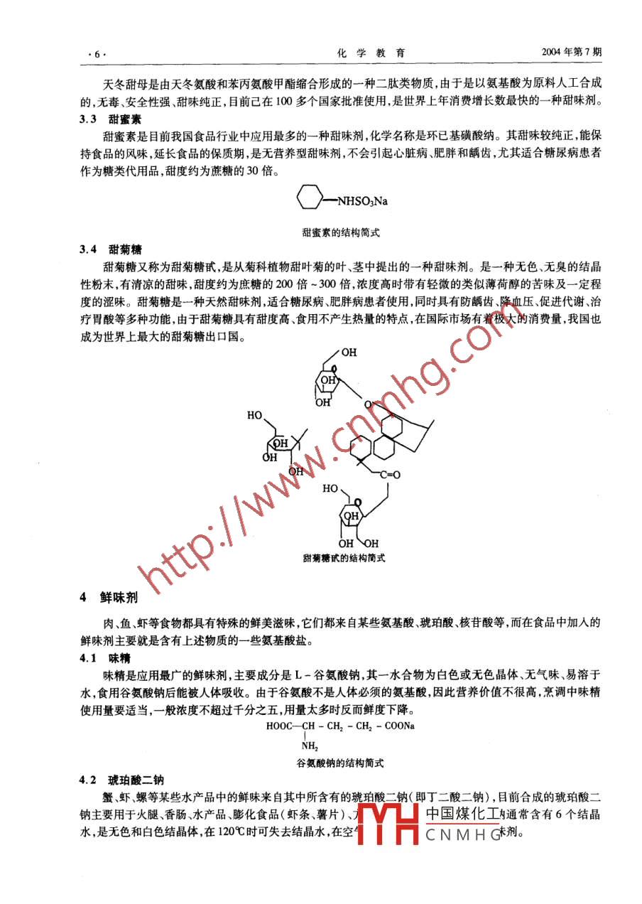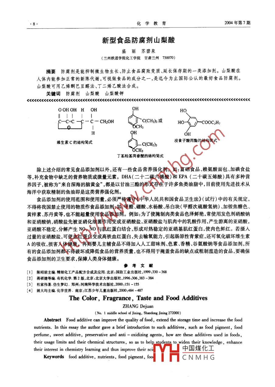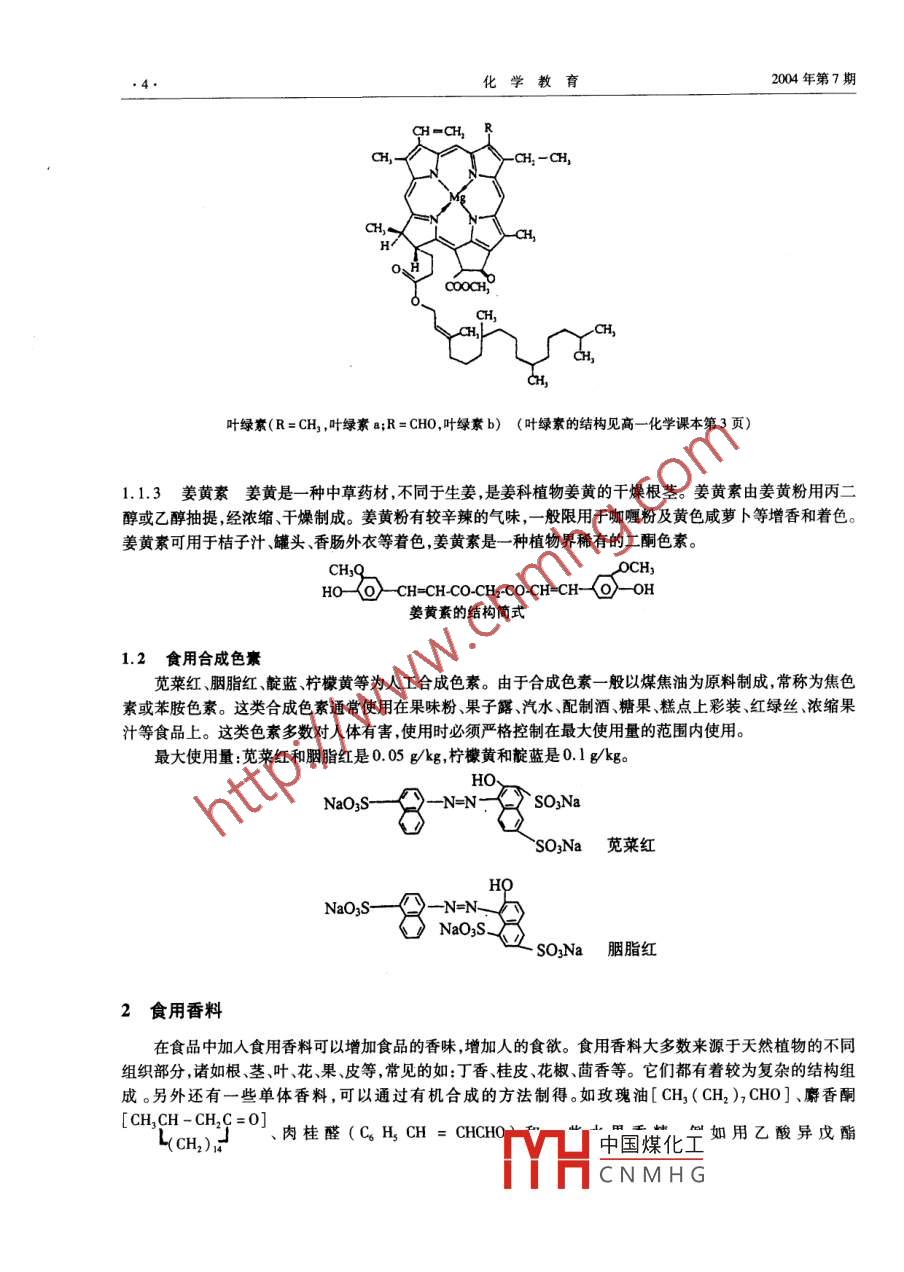 2004年第7期化學教育m知識介編食物的色、香、味與食品添加劑張德娟(山東濟寧第一中學272000摘要食品添加劑可以改善食品的品質(zhì),延長食品的保存期,增加食品的營養(yǎng)成分。 本文介紹了生活中常見的食品添加劑:食品色素、食用香料、甜味劑、鮮味劑、防腐劑和抗氧化劑的性能、使用范圍和化學結構。以便于在化學教學中開闊學生的知識視野,提高學生的學習興趣,全面培養(yǎng)學生的科學素質(zhì)。關鍵詞食品添加劑 營養(yǎng)天然成分 合成物質(zhì)食品添加劑是用于改善食品品質(zhì)(如色、香、味)、延長食品保存期、增加食品營養(yǎng)成分的- -類化學合成或天然物質(zhì)。使用食品添加劑可以使食物增加色澤、香味,使食品的感官性質(zhì)良好;可以防止食品腐敗、變質(zhì),控制食物中微生物的繁殖;可以滿足食品加工工藝的需要,加人增稠劑、漂白劑、色素和抗氧化劑,防止食品在保存過程中變色變味等等"。目前使用的食品添加劑-部分是化學合成方法得到的物質(zhì),另-部分是以動 、植物或微生物代謝產(chǎn)品等為原料分離提取出的天然物質(zhì),也有一部分是從天然物質(zhì)中提取出來經(jīng)過人工加工或半合成的物質(zhì)。根據(jù)《中國人民共和國食品衛(wèi)生法》(試行)第三章,我國允許使用并訂有國家標準的食品添加劑共有:防腐蝕抗氧化劑發(fā)色劑漂白劑酸味劑、凝固劑、疏松劑、增稠劑、消泡劑、甜味劑著色劑、乳化劑、品質(zhì)改良劑、增味劑、保鮮劑、酶制劑、抗結劑、香料等19種。在全日制普通高級中學教科書(試驗修訂本●必修加選修) . 化學.第二冊中,表7-3列出的常見食品添加劑,根據(jù)它們的品種和性能做以下簡單介紹:1食品色素食品色素可以調(diào)節(jié)食品的色澤,改善食品的外觀,提高食品的感官質(zhì)量。食品色素可分為食用天然色素和食用合成色素2大類。1.1食用天然色素常用的天然色素有胡蘿卜素、葉綠素、番茄紅素姜黃素等。1.1.1胡蘿卜素廣泛存在于動植物中,以胡蘿卜、辣椒、南瓜等蔬菜中最多,水果谷類、蛋黃中也存在。胡蘿卜素有3種異構體:a、β、y,其中以β-胡蘿卜素含量最多,它們具有由黃到紅的顏色,屬于多烯色素中的一類,多烯色素中還包括番茄紅素、玉米黃質(zhì)素、葉黃素等。由于動物體內(nèi)的胡蘿卜素可以轉(zhuǎn)化為維生素A,并且是在天然植物中存在,所以是良好的食品色素。β-胡蘿卜素結構簡式番茄紅素結構簡式1.1.2 葉綠素廣泛存在于綠色植物中,可以由植物(如嫩菠菜)、干燥的蠶砂等用酒精或丙酮提取出葉綠素,再經(jīng)過一系列的過濾、皂化除雜、凈化等工藝即可得到天然食用的葉綠素。-般用于豌豆、青豆等綠色植物的罐頭產(chǎn)品著色,也可用于薄荷酒、蛇膽酒等產(chǎn)品的中國煤化工葉綠素a鹽(C.3H2MgN.O,)和葉綠素b鹽( C,5HpMgN4O。)兩組成分[1。TYHCNMHG.4.化學教育2004年第7期CH -CHCH,.CH -CH,CH、Ho、CooCHdh,葉綠素(R = CH, ,葉綠素a;R= CHO,葉綠素b) (葉綠素的結構見高 -化學課本第3頁)1.1.3 姜黃素姜黃是一種中草藥材,不同于生姜,是姜科植物姜黃的干燥根莖。姜黃素由姜黃粉用丙二醇或乙醇抽提,經(jīng)濃縮、干燥制成。姜黃粉有較辛辣的氣味, -般限用于咖喱粉及黃色咸蘿卜等增香和著色。姜黃素可用于桔子汁、罐頭、香腸外衣等著色,姜黃索是- -種植物界稀有的二酮色素。CHq0CH,HO- 4o> -CH=CH-CO-CH2CO-CH=CH--OH姜黃素的結構簡式1.2食用合成色素莧菜紅胭脂紅、靛藍、檸檬黃等為人工合成色素。由于合成色素- -般以煤焦油為原料制成,常稱為焦色素或苯胺色素。這類合成色素通常使用在果味粉、果子露、汽水、配制酒、糖果、糕點上彩裝、紅綠絲、濃縮果汁等食品上。這類色素多數(shù)對人體有害,使用時必須嚴格控制在最大使用量的范圍內(nèi)使用。最大使用量:莧菜紅和胭脂紅是0.05 g/kg,檸檬黃和靛藍是0.1 g/kgoHO.NaOzS-- N=N .SO3NaSOzNa 莧菜紅HONaO3S--N=N-NaOzS_. SOzNa 胭脂紅2食用香料在食品中加入食用香料可以增加食品的香味,增加人的食欲。食用香料大多數(shù)來源于天然植物的不同組織部分,諸如根、莖、葉、花、果、皮等,常見的如:丁香桂皮、花椒、茴香等。它們都有著較為復雜的結構組成。另外還有一些單體香料,可以通過有機合成的方法制得。如玫瑰油[CH,(CH2),CHO]、麝香酮[ CH,CH -CH2C=0]LCH)I 、肉桂醛(CgH, CH = CHCHO中國煤化]!如用乙酸異戊酯YHCNMHG2004年第7期化學教育( CH,COOCHCH2CH.CH3 ).2一甲基丁酸乙酯和-些揮發(fā)性酸按-定比例調(diào)配起來可以得到具有蘋果氣CH,味的香料;而用甲酸異戊酯、反-2,順-4-癸二烯酸乙酯和一些揮發(fā)性的酸可以調(diào)配出梨的氣味;具有紫羅蘭香氣的紫羅蘭酮就是由β一胡蘿卜素經(jīng)氧化斷裂后得到的。有研究人員對燒牛肉散發(fā)出來的香味進行分析,其成分超過360種。其中有44種烷烴、烯烴、30種醇類、41種醛類、32種酮類、22種酸類、23種含硫化合物、23種呋喃、34種吡嗪類、10種噻吩類化合物。將上述-些化合物按比例進行調(diào)配,就可以得到具有牛肉香味的人造牛肉。如果在炸土豆片、炸薯條等膨化食品中添加少許a一噻吩二硫物,就可獲得燒牛肉的香味并帶有洋蔥的香味[3]。四-s-s- sN CsHuIN CH2SH牛肉味的主要化學成分烤羊肉香烤豬肉香a一噻吩二硫物的結構-CH,HsCCH( N cocH,HCH3烤面包香烤堅果香巧克力香烤花生