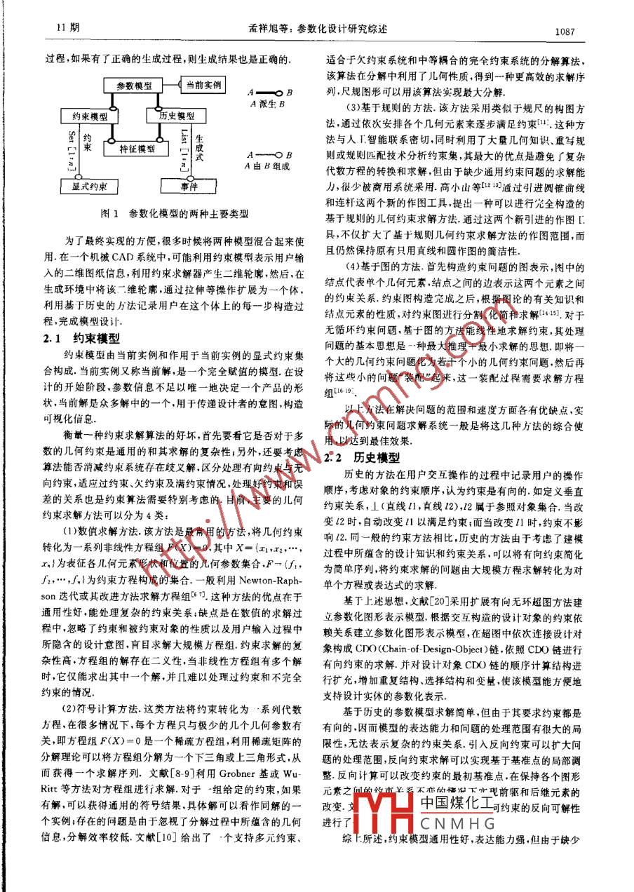 .第14卷第11期計(jì)算機(jī)輔助設(shè)計(jì)與圖形學(xué)學(xué)報(bào)Vol, 14,No. 112002年11月JOURNAL OF COMPUTER AIDED DESIGN & COMPUTER GRAPHICSNov., 2002參數(shù)化設(shè)計(jì)研究孟祥旭徐延寧(山東大學(xué)計(jì)算機(jī)科學(xué)與技術(shù)學(xué)院濟(jì)南250100)摘要參數(shù)化設(shè)計(jì)是提高企北產(chǎn)品設(shè)計(jì)創(chuàng)新能力的關(guān)鍵.從參數(shù)化模型的不同表示方式,相應(yīng)的求解方法,建立模型的交互手段等方面綜述產(chǎn)品參數(shù)化設(shè)計(jì)的研究現(xiàn)狀及未來發(fā)展中箭要解決的問題.重點(diǎn)討論傳統(tǒng)CAD領(lǐng)域所涉及的二維圖紙及三維零件造型等幾何問題的參數(shù)化設(shè)計(jì),并在此基礎(chǔ)上對傳統(tǒng)的參數(shù)化的概念進(jìn)行擴(kuò)展,討論產(chǎn)品全生命周期的參數(shù)化設(shè)計(jì)問題及產(chǎn)品參數(shù)化設(shè)計(jì)的相關(guān)國際標(biāo)準(zhǔn)關(guān)鍵詞參數(shù)化,約束, 歷史,模型,特征中圖法分類號TP391. 72A Survey of the Research Works on Parametric DesignMeng Xiangxu Xu Yanning(School of Computer Science and Technology. Shandong University, Jinan 250100)AbstractParameric design is a key point to enhance enterprises' ability to innovative design of product. Thispaper gives a survey of the current works and problems needed 1o be solved in this field from various aspects, suchas different types of parametric model structure, resolving methods,and interactive ways 10 build models. Tradi-tionally ,only geometric elements in 2D drawing and 3D part modeling are mainly focused on in the parametric designprocess. This paper extends its traditional area . and discusses the parametric design problem for the whole life cycleof product and some related standards.Key words parametric , constraint, history,model , feature數(shù)化修改設(shè)計(jì).1引言目前,參數(shù)化設(shè)計(jì)的研究范圍已由最初的二維圖紙參數(shù)化設(shè)計(jì)發(fā)展到了獲蓋產(chǎn)品的整個(gè)生命周期參數(shù)化設(shè)計(jì),研究最初的CAD系統(tǒng)所構(gòu)造的產(chǎn)品模型都是幾何圖素(點(diǎn)、的對象除了傳統(tǒng)的二維圖紙、=維零件實(shí)體等以外,還包括線、圓等)的簡單堆疊,僅僅描述了設(shè)計(jì)產(chǎn)品的可視形狀,不零部件間的裝配關(guān)系[68],產(chǎn)品特征(],產(chǎn)品變型設(shè)計(jì))等產(chǎn)包含設(shè)計(jì)者的設(shè)計(jì)思想.因而難以對模型進(jìn)行改動,生成新品層次的參數(shù)化表示模型.這使得參數(shù)化自身的含義得到了的產(chǎn)品實(shí)例.參數(shù)化的設(shè)計(jì)方法止是解決這一問題的有效進(jìn)一步的拓寬.這些研究無疑將會進(jìn)--步提高產(chǎn)品的設(shè)計(jì)和途徑.生產(chǎn)效率,同時(shí)也是將來-段時(shí)間的熱點(diǎn)問題.通常,參數(shù)化設(shè)計(jì)是指零件或部件的形狀比較定型,用-組參數(shù)約束該幾何圖形的一組結(jié)構(gòu)尺寸字列,參數(shù)與設(shè)計(jì)2參數(shù)化模型表示對象的控制尺寸有顯式對應(yīng),當(dāng)賦子不同的參數(shù)序列值時(shí),就可驅(qū)動達(dá)到新的目標(biāo)幾何圖形,其設(shè)計(jì)結(jié)果是包含設(shè)計(jì)信參數(shù)化模型有兩種基本形式:基于約束的模型和基于歷息的模型1”.參數(shù)化為產(chǎn)品模型的可變性、可重用性、并行設(shè)史的模型,如圖1所示.基于約束的模型通過在當(dāng)前實(shí)例上計(jì)等提供了手段,使用戶可以利用以前的棋型方便地重建模附加約束的方式描述最終的幾何體的特征,該方法側(cè)重生成型,并可以在遵循原設(shè)計(jì)意圖的情況下方便地改動模型,生的結(jié)果,只要結(jié)果中包含了所需要的幾何特征,則獲得結(jié)果成系列產(chǎn)品,大大提高了生產(chǎn)效率.參數(shù)化概念的引入代表的歷史是無關(guān)緊要的;基于厲史的模型通過按順序描述--個(gè)了設(shè)計(jì)思想上的一次變革,即從避免改動設(shè)計(jì)到鼓勵使用參幾何體的構(gòu)造方法的歷史來構(gòu)造幾何體,該方法側(cè)重生成的原稿收到日期:2002-04-30;修改稿收到日期:2002-06-10.本課題得到國家白中國煤化工秀青年教師教學(xué)科研獎勵計(jì)劃資助.孟祥旭.男,1962年生,博士,教授.博七生導(dǎo)師,主要研究方向?yàn)镃AI!YHC N M H G975年生,博士研究生,上要研兗方向?yàn)镃AD & CG.PDM.11期孟祥旭等:參數(shù)化設(shè)計(jì)研究綜述1087過程,如果有了正確的生成過程,則生成結(jié)果也是正確的.適合f欠約束系統(tǒng)和中等耦合的完全約東系統(tǒng)的分解算法,該算法在分解中利用了兒何性質(zhì),得到一種更高效的求解序C參數(shù)模型]」(當(dāng)前實(shí)例JA-。B列,尺規(guī)圖形可以用該算法實(shí)現(xiàn)最大分解.A源生B(3)基于規(guī)則的方法.該方法采用類似于規(guī)尺的構(gòu)圖方[約束模型歷史模型法,通過依次安排各個(gè)幾何元素來逐步滿足約柬”.這種方漿s特征模型法與人I.智能聯(lián)系密切,同時(shí)利用了大量幾何知識、重寫規(guī)A---。B則或規(guī)則匹配技術(shù)分析約束集,其最大的憂點(diǎn)是避免[復(fù)雜A由B組成代數(shù)方程的轉(zhuǎn)換和求解,但由于缺少通用約束問題的求解能顯式約束力,很少敏商用系統(tǒng)采用高小山等11通過引進(jìn)圓錐曲線和連桿這兩個(gè)新的作圖工具,提出-種可以進(jìn)行完全構(gòu)造