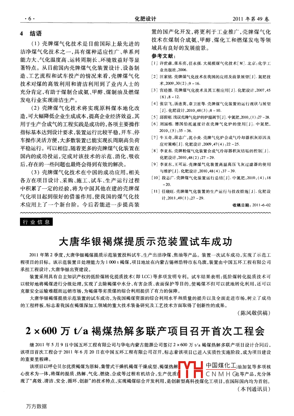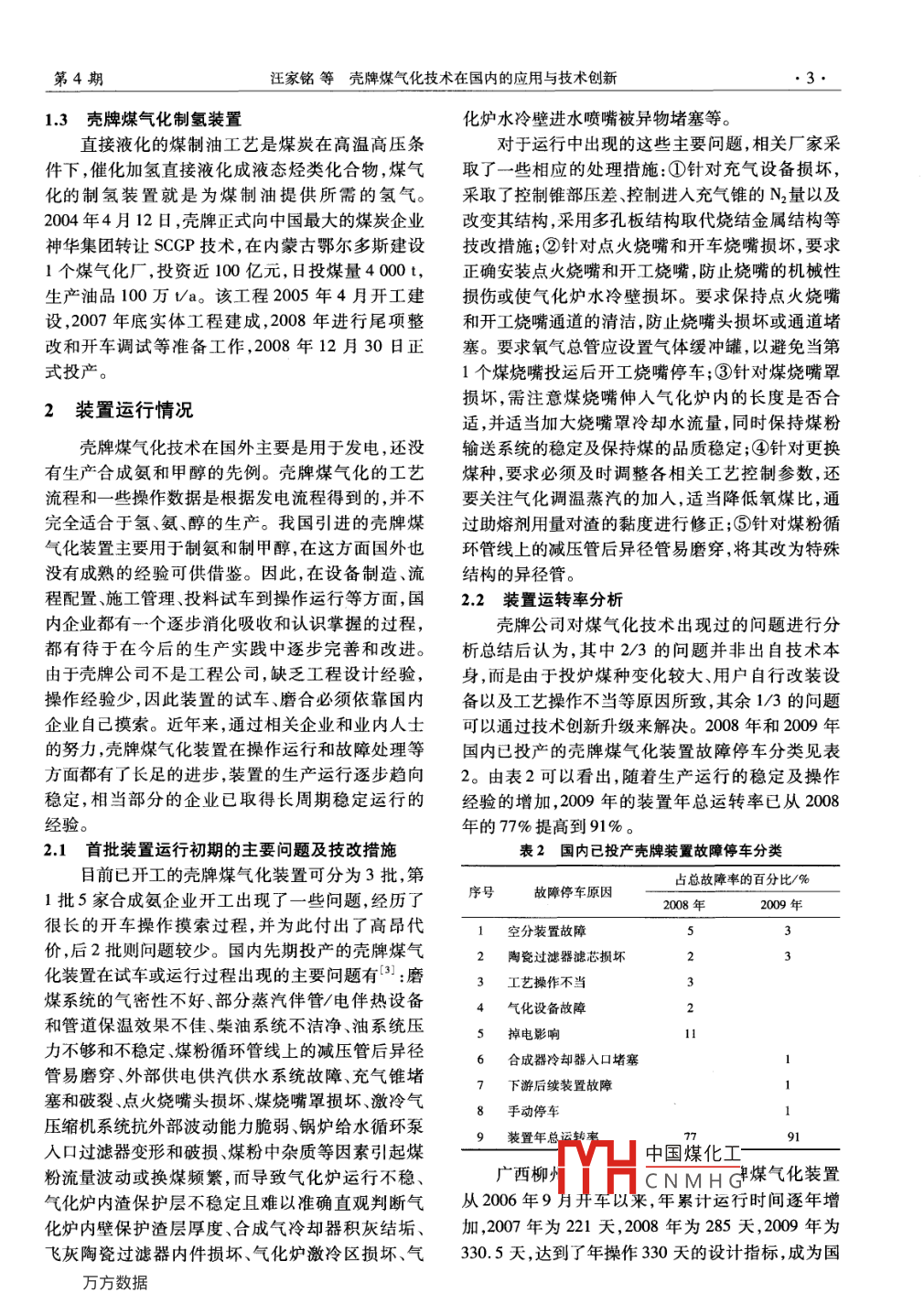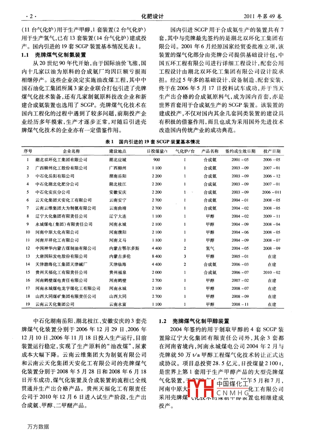 第49卷第4期化肥設(shè)計Aug. 20112011年8月Chemical Fertilizer Design●1●專題綜論殼牌煤氣化技術(shù)在國內(nèi)的應(yīng)用與技術(shù)創(chuàng)新汪家銘,莫洪彪(1.川化集團(tuán)有限責(zé)任公司,四川成都610301; 2.河池化工股份有限公司,廣西河池547007)摘要: 殼牌煤氣化技術(shù)進(jìn)入中國已近10年,隨著其工藝技術(shù)的完善、運(yùn)轉(zhuǎn)經(jīng)驗的積累和操作水平的提高,目前大多數(shù)裝置巳能實現(xiàn)長周期穩(wěn)定運(yùn)行。簡述了國內(nèi)殼牌煤氣化裝置的建設(shè)概況及總體使用情況;分析了裝置運(yùn)行中普遍存在的問題及其原因;總結(jié)了控制氣化爐爐溫、測量粉煤輸送速度等操作經(jīng)驗;介紹了合成氣冷卻器積灰結(jié)垢等故障處理辦法;概述了殼牌煤氣化裝置的技術(shù)創(chuàng)新及進(jìn)展。關(guān)鍵詞:殼牌煤氣化技術(shù);項目建設(shè);運(yùn)行經(jīng)驗;故障處理;技術(shù)創(chuàng)新中圖分類號: TQ545文獻(xiàn)標(biāo)識碼:A 文章編號 :1004 - 8901(2011)04 -0001 -06Both Application Situation and TechnologyInnovation of Shell Coal Gasification Technology in ChinaWANG Jia- ming,MO Hong -biao(1. Sichun Chemical Group Company ld. , Chengdu Sichun 610301 China;2. Hei Chemical Engineering Stock Company Lud. , Heci Guangxi 547007 China)Abstract:There were nearly 10 years since the Shell coal gasifcation technology was imported into China, along with the improvement of its processtechnology , accumulation of operating experience and elevation of the operating level, at present most of plants can already realize long-term stable opera-tion. Author has briely described the construction and general application situations; has analyzed the commonly existing problems in operation of plantsand their causes ; has summarized the operating experience to control the temperature of gasifier and to measure the conveying veloeity of pulverized coal;has introduced the treatment method for fault caused by ash deposition and fouling of the synthetic gas cooler; has briefly described the technology innova-tion and its progresB.Key words : Shell coal gasification technology ; construction of project; operating situation; technology innovation殼牌的石化燃料氣化技術(shù)可以追溯到20世紀(jì)1裝置建設(shè)概況50年代,當(dāng)時開發(fā)了以渣油為原料的殼牌氣化工藝(SGP),隨后于20世紀(jì)70年代初期,在渣油氣化的近10多年來,殼牌公司極力開拓中國市場,推.基礎(chǔ)上,又開發(fā)了殼牌粉煤氣化技術(shù)(SCGP)。該動SCGP用于化工生產(chǎn)。殼牌公司自從2001年6技術(shù)從1972年開始進(jìn)行中試,到2001年在荷蘭正月在中國簽訂第1個技術(shù)轉(zhuǎn)讓協(xié)議以來,至今已陸式投人商業(yè)化運(yùn)行為止,前后共經(jīng)歷了30多年的續(xù)與國內(nèi)17家企業(yè)簽訂了19份技術(shù)轉(zhuǎn)讓協(xié)議。殼牌在全世界已經(jīng)簽訂的26份煤氣化技術(shù)許可合同技術(shù)開發(fā)歷程。殼牌煤氣化技術(shù)是目前世界上較為先進(jìn)的,屬中,中國就超過了三分之二。國內(nèi)從2006年至今已于氣流床氣化的第2代煤氣化技術(shù)[" ,代表著煤氣建成多套合成氨、甲醇、氫氣生產(chǎn)裝置,主要用在大化技術(shù)發(fā)展趨勢,為投煤量2 000 ~3 000 Vd的商業(yè)型化肥企業(yè)進(jìn)行氮肥原料及動力結(jié)構(gòu)調(diào)整的技術(shù)規(guī)模奠定了技術(shù)基礎(chǔ)。該技術(shù)對煤種(特別是高硫改造,以及煤制甲醇和煤制油項目,其中云天化和煤)、粒度具有較大兼容性,具有煤種適應(yīng)性廣、單永城煤電2家企業(yè)是在引進(jìn)殼牌煤氣化裝置順利投產(chǎn)的情況下,再次簽訂技術(shù)轉(zhuǎn)讓協(xié)議,顯示出了該系列能力大氣化溫度高、氣化用氧耗量低、運(yùn)轉(zhuǎn)周技術(shù)在國內(nèi)的良好的發(fā)展勢頭(2]。國內(nèi)目前已簽期長、環(huán)境效益好等技術(shù)優(yōu)勢,與我國的能源資源約引進(jìn)19套SCGP裝置,共23臺氣化爐,其中9的基本國情相適應(yīng)。SCGP生產(chǎn)的合成氣有多種作套裝置(10中國煤化工氨,9套裝置用,可用來制造純氫,生產(chǎn)合成氨、甲醇、含氧化合CNMHG,物,也可以用于制取運(yùn)輸燃油、城市煤氣、合成天然作者簡介:汪家銘(播電視大學(xué)機(jī)械專業(yè),工程師,從事大型引進(jìn)化肥裝備技術(shù)管理以氣及發(fā)電。及化工情報信息等工作?!?.化肥設(shè)計2011年第49卷(11臺氣化爐)用于生產(chǎn)甲醇,1套裝置(2臺氣化爐)國內(nèi)引進(jìn)SCGP用于合成氨生產(chǎn)的裝置共有7用于生產(chǎn)氫氣,已有13套裝置( 14臺氣化爐)建成投套,其中與殼牌最先簽約的是湖北雙環(huán)化工集團(tuán)有產(chǎn)。國內(nèi)引進(jìn)的19套SCGP裝置基本情況見表1。限公司。2001年6月經(jīng)原國家經(jīng)貿(mào)委批準(zhǔn)立項,該1.1 殼牌煤氣化制氨裝置裝置的煤氣化部分由殼牌公司提供基礎(chǔ)設(shè)計包,中從20世紀(jì)90年代開始,由于國際油價飛漲,國國五環(huán)工程有限公司進(jìn)行詳細(xì)工程設(shè)計,配套公用內(nèi)十幾家以油為原料的合成氨廠均因巨額虧損而工程設(shè)計由湖北雙環(huán)化工集團(tuán)有限公司設(shè)計院承相繼停產(chǎn)。這些企業(yè)決定實施油改煤工程,其中中擔(dān)。經(jīng)過5年多的基礎(chǔ)設(shè)計、設(shè)備制造、配套安裝,國石油化工集團(tuán)所屬3家企業(yè)聯(lián)合打包引進(jìn)了殼牌終于在2006年5月17日投料試