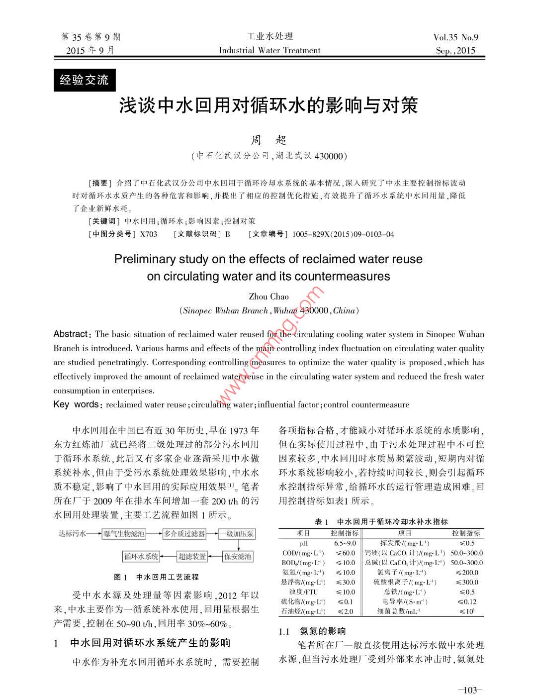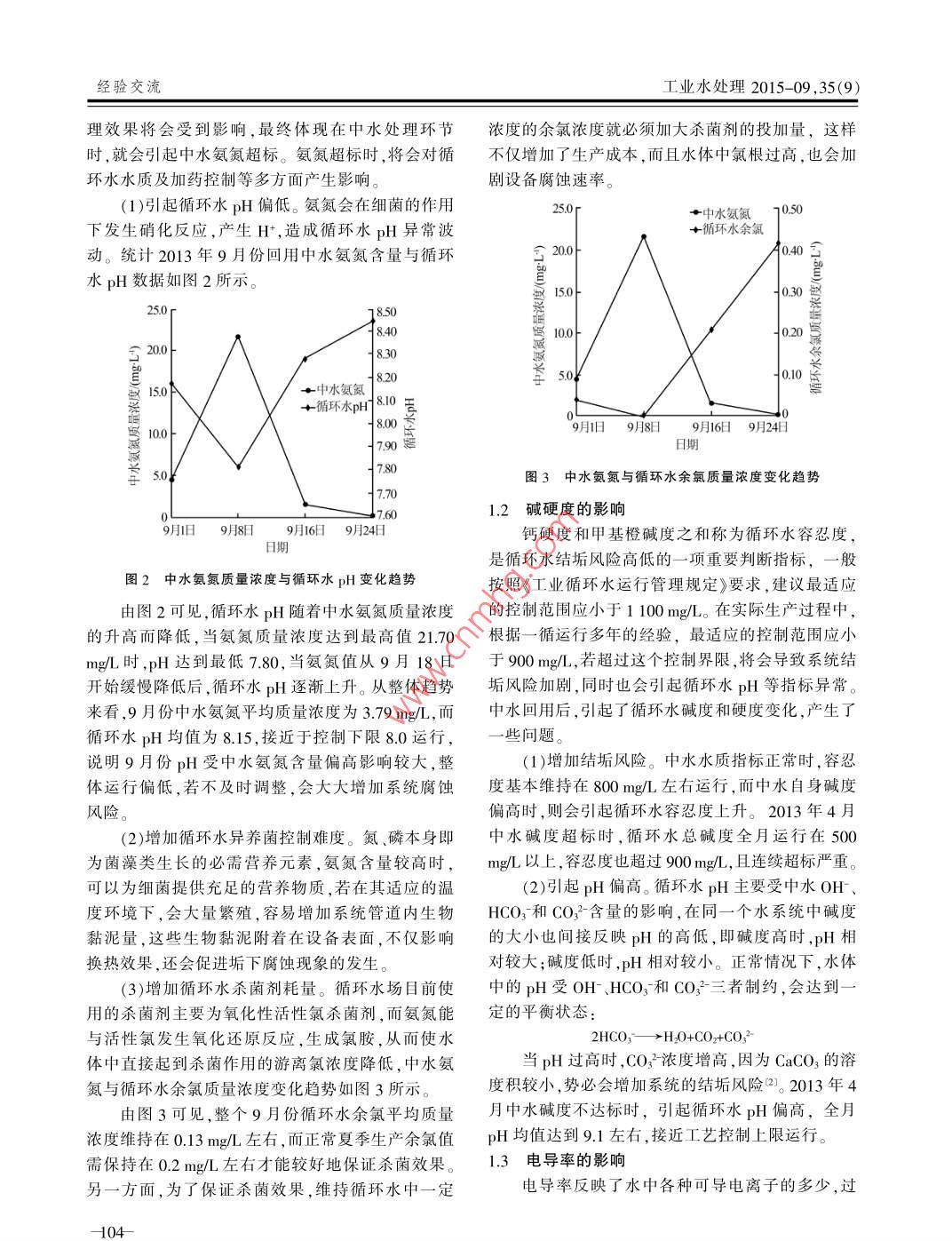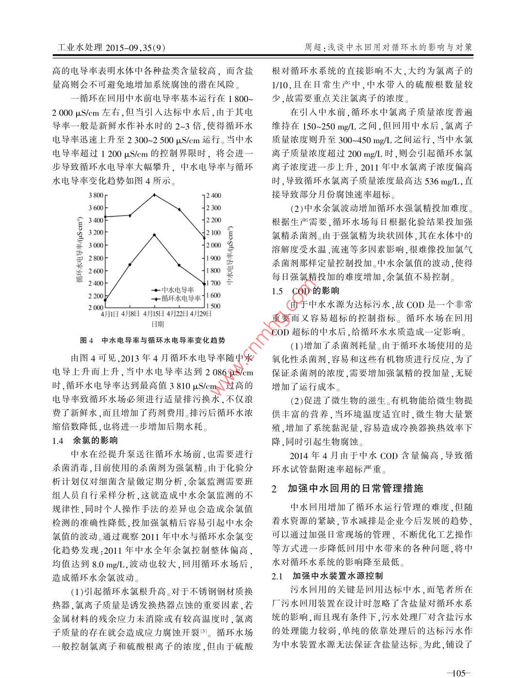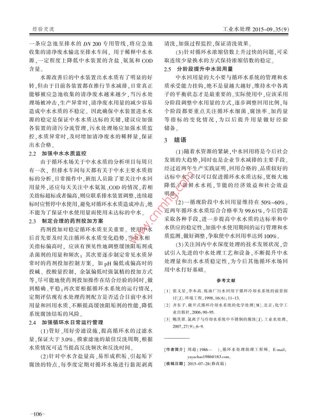 第35卷第9期工業(yè)水處理VoL 35 No 92015年9月Industrial Water Treatment2015經(jīng)驗交流淺談中水回用對循環(huán)水的影響與對策周超(中石化武漢分公司,湖北武漢430000)[摘要]介紹了中石化武漢分公司中水回用于循環(huán)冷卻水系統(tǒng)的基本情況,深入研究了中水主要控制指標(biāo)波動時對循環(huán)水水質(zhì)產(chǎn)生的各種危害和影響,并提出了相應(yīng)的控制優(yōu)化措施,有效提升了循環(huán)水系統(tǒng)中水回用量,降低了企業(yè)新鮮水耗[關(guān)鍵詞]中水回用;循環(huán)水;影響因素;控制對策[中圖分類號]X703[文獻(xiàn)標(biāo)識碼]B[文章編號]1005-829X(2015)09-0103-04Preliminary study on the effects of reclaimed water reuseon circulating water and its countermeasuresSinopec Wuhan branch, Wuhan 430000, China)Abstract: The basic situation of reclaimed water reused for the circulating cooling water system in Sinopec WuhanBranch is introduced. Various harms and effects of the main controlling index fluctuation on circulating water qualityare studied penetratingly. Corresponding controlling measures to optimize the water quality is proposed, which haseffectively improved the amount of reclaimed water reuse in the circulating water system and reduced the fresh waterconsumption in enterprisesKey words: reclaimed water reuse; circulating water; influential factor; control countermeasure中水回用在中國已有近30年歷史,早在1973年各項指標(biāo)合格,才能減小對循環(huán)水系統(tǒng)的水質(zhì)影響,東方紅煉油廠就已經(jīng)將二級處理過的部分污水回用但在實際使用過程中,由于污水處理過程中不可控于循環(huán)水系統(tǒng),此后又有多家企業(yè)逐漸采用中水做因素較多,中水回用時水質(zhì)易頻繁波動,短期內(nèi)對循系統(tǒng)補(bǔ)水,但由于受污水系統(tǒng)處理效果影響,中水水環(huán)水系統(tǒng)影響較小,若持續(xù)時間較長,則會引起循環(huán)質(zhì)不穩(wěn)定,影響了中水回用的實際應(yīng)用效果。筆者水控制指標(biāo)異常,給循環(huán)水的運(yùn)行管理造成困難?;厮趶S于2009年在排水車間增加一套200th的污用控制指標(biāo)如表1所示。水回用處理裝置,主要工藝流程如圖1所示。表1中水回用于循環(huán)冷卻水補(bǔ)水指標(biāo)達(dá)標(biāo)污水一曝氣生物濾池一多介質(zhì)過濾器“級加壓泵控制指標(biāo)控制指標(biāo)H65~9.0揮發(fā)酚/(≤0.5循環(huán)水系統(tǒng)[超濾裝置,保安濾海099160鈣(以CO計)時30300圖1中水回用工藝流程氨氮(mgL)≤100氯離子/(mgL)懸浮物/mg)≤30硫酸根離子(mgl:)≤300受中水水源及處理量等因素影響,2012年以總鐵mgL)米,中水主要作為循系統(tǒng)補(bǔ)水使用,回用量根據(jù)生益(5數(shù)≤0.12產(chǎn)需要,控制在50-90th,回用率30%-60%。1.1氨氮的影響1中水回用對循環(huán)水系統(tǒng)產(chǎn)生的影響筆者所在廠一般直接使用達(dá)標(biāo)污水做中水處理中水作為補(bǔ)充水回用循環(huán)水系統(tǒng)時,需要控制水源,但當(dāng)污水處理廠受到外部來水沖擊時,氨氮處經(jīng)驗交流工業(yè)水處理2015-09,35(9)理效果將會受到影響,最終體現(xiàn)在中水處理環(huán)節(jié)濃度的余氯濃度就必須加大殺菌劑的投加量,這樣時,就會引起中水氨氮超標(biāo)。氨氮超標(biāo)時,將會對循不僅增加了生產(chǎn)成本,而且水體中氯根過高,也會加環(huán)水水質(zhì)及加藥控制等多方面產(chǎn)生影響劇設(shè)備腐蝕速率(1)引起循環(huán)水pH偏低。氨氮會在細(xì)菌的作用中水氨氮下發(fā)生硝化反應(yīng),產(chǎn)生H,造成循環(huán)水pH異常波循環(huán)水余氯動。統(tǒng)計2013年9月份回用中水氨氮含量與循環(huán)200水pH數(shù)據(jù)如圖2所示15.0030020三150中水氨氮+循環(huán)水pH810手9月舊9月89月16日9月24日日期780圖3中水氨氮與循環(huán)水余氯質(zhì)量濃度變化趨勢1.2堿硬度的影響9月舊9月8日9月16日9月24日鈣硬度和甲基橙堿度之和稱為循環(huán)水容忍度是循環(huán)水結(jié)垢風(fēng)險高低的一項重要判斷指標(biāo),一般圖2中水氫氮質(zhì)量濃度與循環(huán)水pH變化趨勢按照《工業(yè)循環(huán)水運(yùn)行管理規(guī)定》要求,建議最適應(yīng)由圖2可見,循環(huán)水pH隨著中水氨氮質(zhì)量濃度的控制范圍應(yīng)小于1100mg/L。在實際生產(chǎn)過程中,的升高而降低,當(dāng)氨氮質(zhì)量濃度達(dá)到最高值21.70根據(jù)一循運(yùn)行多年的經(jīng)驗,最適應(yīng)的控制范圍應(yīng)小mgL時,pH達(dá)到最低780,當(dāng)氨氮值從9月18日于900mg,若超過這個控制界限,將會導(dǎo)致系統(tǒng)結(jié)開始緩慢降低后,循環(huán)水pH逐漸上升。從整體趨勢垢風(fēng)險加劇,同時也會引起循環(huán)水pH等指標(biāo)異常來看,9月份中水氨氮平均質(zhì)量濃度為3.79mg,而中水回用后,引起了循環(huán)水堿度和硬度變化,產(chǎn)生了循環(huán)水pH均值為8.15,接近于控制下限80運(yùn)行,一些問題說明9月份pH受中水氨氮含量偏高影響較大,整(1)增加結(jié)垢風(fēng)險。中水水質(zhì)指標(biāo)正常時,容忍體運(yùn)行偏低,若不及時調(diào)整,會大大增加系統(tǒng)腐蝕度基本維持在800mg/左右運(yùn)行,而中水自身堿度風(fēng)險。偏高時,則會引起循環(huán)水容忍度上升。2013年4月(2)增加循環(huán)水異養(yǎng)菌控制難度。氮、磷本身即中水堿度超標(biāo)時,循環(huán)水總堿度全月運(yùn)行在500為菌藻類生長的必需營