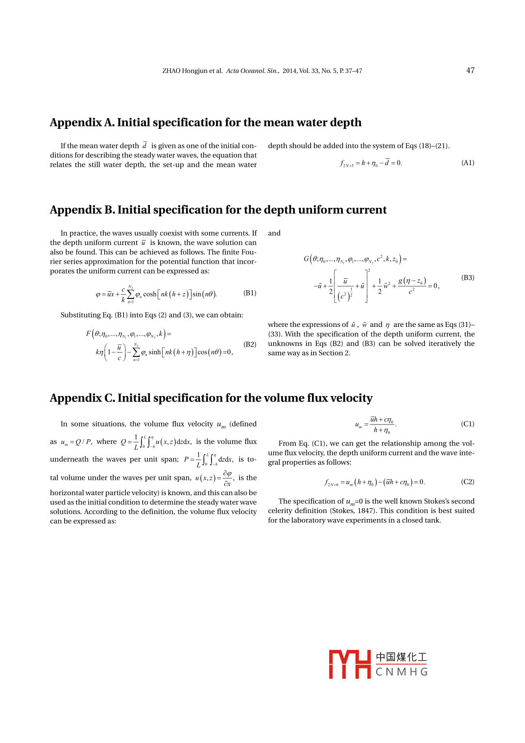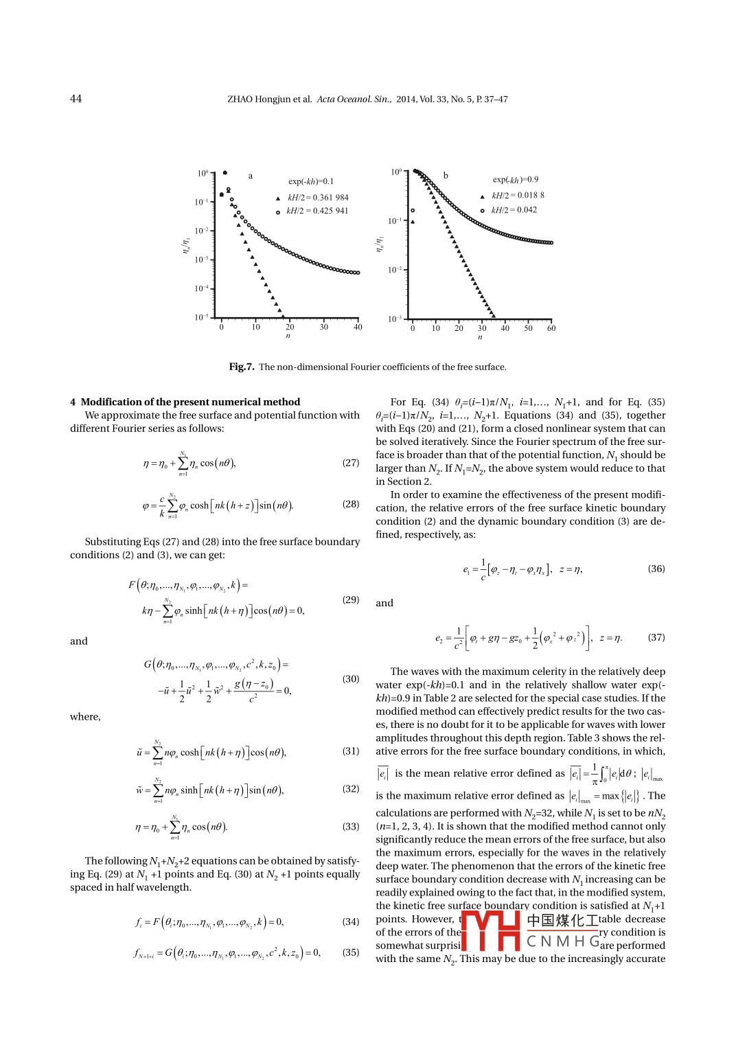38ZHAO Hongjun et al. Acta OCceanol. Sin, 2014, Vol.33, No. 5, P 37-47tions for steady water waves, during which several interesting of stream function, the inverse plane method and the streamnonlinear wave phenomena have been discovered. One of the function method are only applicable for 2-D waves. Therefore, inbest known numerical methods for steady water waves is the the present study, we are still interested in developing the Fou-Fourier approximation method. This method was first present- rier approximation method in the physical plane on the basised by Chappelear (1961) on the basis of potential theory in the of potential theory. With the free surface and potential functionphysical plane by expanding the free surface and velocity com-approximated by the finite Fourier series, Section 2 presents aponents in finite Fourier series, and determining the Fourier set of nonlinear algebraic equations for the Fourier cofficientcofficients by minimizing the square errors of the free surface from the free surface boundary conditions. These nonlinear al-boundary conditions. Later, Dean (1965) improved this method gebraic equations are subsequently solved thorough Newton'sby solving the stream function instead of the velocity compo- method with a relaxation technology. In Section 3, the accuracynents. In Dean's formulation, the primary specified conditions and convergence of the Fourier approximations are examined.are the mean water depth, the total head, and the wave period. The properties of steady water waves in the finite depth are nu-However, as shown by Cokelet (1977), the total head does not merically analyzed. It is shown that the spectrum of the waveincrease monotonically with the wave height, but has the maxi- surface is broader than that of the potential function. This fur-mum for waves slightly lower than the highest. This means that ther leads us to explore a modification for the present method inthe primary specification of the total head would lead Dean's Section 4. Conclusions are summarized at the end.method into inexact solutions for the highly nonlinear waves.Thisshortcoming has been overcome by Chaplin (1980) through 2 Steady water wave equations and numnerical methodintroducing a Schmidt orthogonalization process. Rieneckerand Fenton (1981) and Fenton (1988) introduced a method that 2.1 Governing equations and Fourier approximationsconsistently used the Fourier approximation, allowing for theThe problem to be considered is that of the steadily pro-condition of deep water and for the current circumstance. In gressing periodic water wave train of wavelength L, crest-to-their methods, the Newton's iterative scheme was used to solvetrough wave height H, and wave period T. This problem can bethe nonlinear algebraic equations. Their results, even for the described using an upward vertical z-axis originating from thehighly nonlinear waves, agreed well with the numerical solu- still water level (SWL) and x-axis in the wave propagation direc-tions of Cokelet (1977). With Newton's method solving the Fou-tion. Figure 1 shows the one cycle wave sketch and some impor-rier cofficients in arbitrary precision computer arithmetic, Lu- tant physical quantities.komsky et al. (2002) obtained more accurate solutions for steadywater waves in the infinite depth. Their method was improvedto be more rapidly convergent by Lukomsky and Gandzha (2003)through the fractional Fourier approximations. For deep waterz. 1waves, Liao and Cheung (2003) developed a homotopy analysisMEL一Vmethod to determine the Fourier components.MwL二立二平later extended to the finite water depth by Tao et al. (2007).HParallel to the Fourier approximation method in the physicalSWLo≥plane, series attempts have been made to develop the inverseplane method. The inverse plane method originated from Stokes(1880). Since the boundary conditions in the inverse plane areinitially known, numerical computations for Stokes wave solu-tions are usually performed in this plane, of which Schwartz(1974) finished the leading works. He first expanded the spatial_bottomvariables as Fourier series in terms of the potential and streamfunction, and then perturbed the Fourier coefficients as powerseries of the wave steepness. The Pade approximation was alsoFig.1. Sketch for the periodic steady water wave train.introduced into the perturbation expansions as a summationtechnology. In that way, very accurate solutions of highly non-If the motion is irrotational, the potential function ρ shouldlinear waves were obtained. In Schwartz (1974), the perturba- satisfy the Laplace's equation throughout the fluid domain.tion parameter is not known ab initio. This was improved byLonguet-Higgins (1975) and Cokelet (1977), where the itallyPx +9_ =0, -h≤z≤η,(1)known parameters were chosen as the perturbation ones. With-out introducing the perturbation expansions, Tanaka (1983) pre-where the subscripts denote partial differentiation; h is the stllsented a more acurate inverse plane method. In Tanaka (1983),water depth; and n is the free surface.the free surface boundary conditions were first transformedThe boundary conditions to be satisfied are the free surfaceinto an integral equation, and then the equation was solved kinetic boundary condition:iteratively. The variable transformation was also introduced toconcentrate the points near the crest, thus giving more accurate9.=η,+9,nx,z=n;(2)solutions for the highly nonlinear waves.It should be noted that in the inverse plane method, the the free surface dy中國煤化工complex mathematical transformation from the inverse planefYHCNMHGto the physical plane is inevitable, thus making it very com-plex for the practical applications. In addition, due to the use9.+;(o? +φ?2)+gn=87o,z=7;(3)ZHAO Hongjun et al. Acta Oceanol. Sin, 2014, Vol. 33, No. 5, P37-4739and the bottom boundary condition:The free surface function can also be approximated by thefollowing Fourier series as:φ:=0, z=-h.4)η=ηo+ En。cos(n),(
