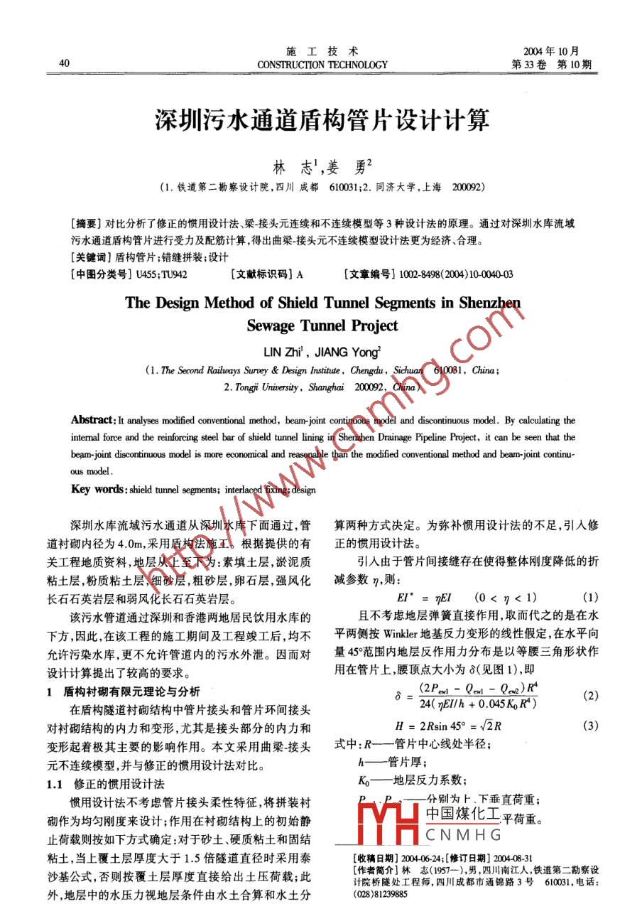 施工技術(shù)2004年10月40CONSTRUCTION TECHNOLOGY第33卷第10期深圳污水通道盾構(gòu)管片設計計算林志',姜勇2(1.鐵道第二勘察設計院,四川成都610031;2. 同濟大學,上海 200092)[摘要]對比分析了修正的慣用設計法、梁接頭元連續(xù)和不連續(xù)模型等3種設計法的原理。通過對深圳水庫流城污水通道盾構(gòu)管片進行受力及配筋計算,得出曲梁~接頭元不連續(xù)模型設計法更為經(jīng)濟、合理。[關(guān)鍵詞]盾構(gòu)管片;錯縫拼裝;設計[中圖分類號] U455;TU942[文獻標識碼] A[文章編號] 102-8498<200)10-003The Design Method of Shield Tunnel Segments in ShenzhenSewage Tunnel ProjectLIN Zhi',JIANG Yong(1. The Second Railuays Suney & Design Institute,Chengdu, Sichuan 610031, China;2. Tongji Unierity, Shanghai 200092, China)Abstract: It analyses modifed conventional method, beam-joint continuous model and discontinwous model. By calculaing theintermal force and the reinforcing steel bar of shield tunnel lining in Shenzhen Drainage Pipeline Project, it can be seen that thebeam-joint discontinuous model is more economical and reasonable than the modified conventional method and bearm-joint continu-ous model.Key words: shield tunnel segments; interlaced fixing;design深圳水庫流域污水通道從深圳水庫下面通過,管算兩種方式?jīng)Q定。為彌補慣用設計法的不足,引人修道襯砌內(nèi)徑為4.0m,采用盾構(gòu)法施工。根據(jù)提供的有正的慣用設計法。關(guān)工程地質(zhì)資料,地層從上至下為:素填土層,淤泥質(zhì)引入由于管片間接縫存在使得整體剛度降低的折粘土層,粉質(zhì)粘土層,細砂層,粗砂層,卵石層,強風化減參數(shù)η.則:長石石英巖層和弱風化長石石英巖層。EI* = nEI(0< η< 1)(1)該污水管道通過深圳和香港兩地居民飲用水庫的且不考慮地層彈簧直接作用,取而代之的是在水下方,因此,在該工程的施工期間及工程竣工后,均不平兩側(cè)按Winkler地基反力變形的線性假定,在水平向允許污染水庫,更不允許管道內(nèi)的污水外泄。因而對量45°范圍內(nèi)地層反作用力分布是以等腰三角形狀作設計計算提出了較高的要求。用在管片上,腰頂點大小為δ(見圖1),即1盾構(gòu)襯砌有限元理論與分析δ=(2Pw- Qown- Qm)R'(2)24( nEl/h+ 0.045K,RF)在盾構(gòu)隧道襯砌結(jié)構(gòu)中管片接頭和管片環(huán)間接頭對襯砌結(jié)構(gòu)的內(nèi)力和變形,尤其是接頭部分的內(nèi)力和H = 2Rsin45° =v2R .(3)變形起著極其主要的影響作用。本文采用曲梁接頭式中:R--管 片中心線處半徑;h--管片厚;元不連續(xù)模型,并與修正的慣用設計法對比。1.1修正的慣用設計法Ko一地層反力 系數(shù);慣用設計法不考慮管片接頭柔性特征,將拼裝襯分別為卜、下垂直荷重;砌作為均勻剛度來設計;作用在襯砌結(jié)構(gòu)上的初始靜中國煤化工平荷重。止荷載則按如下方式確定:對于砂土、硬質(zhì)粘土和固結(jié)MHCNMHG粘土,當上覆土層厚度大于1.5倍隧道直徑時采用泰[收稿日期] 2004-06-24;[修訂日期] 200408-31沙基公式,否則按覆土層厚度直接給出土壓荷載;此[作者簡介]林志(1957--),男 ,四川南江人,鐵道第二勘察設計院橋隧處工程師,四川成都市通錦路3號610031, 電話:外,地層中的水壓力視地層條件由水土合算和水土分(028)812398852004 No.10林志等:深圳污水通 道盾構(gòu)管片設計計算4對于錯縫拼裝方式,為考慮相鄰管片環(huán)間的彎矩2.1施工階段厚覆土處設計分析傳遞作用,引入彎矩增加系數(shù)ξ,故實際彎矩為2.1.1水 土壓力計算M=(1+ξ)M°(4)土體φ平均值23.72*,c平均值為37.03kPao頂部式中,M*為計算彎矩。對于接頭部分的彎矩,在設計壓力為188.6kPa,頂部側(cè)壓為32.04kPa,底部側(cè)壓為時可考慮為(1- &)M*。71. 1kPa,底部對管片壓力為208.2kPa,乘以荷載分項系Pon數(shù)后,其值分別為:226.3、38.4.85.3kPa(未包括底部對管片壓力,該部分由程序自動計算,下同)。| >82.1.2地層反力系數(shù)根據(jù)地質(zhì)資料提供的標準貫人擊數(shù)得法向反力系J Qan數(shù)為15000kPa/m,切向反力系數(shù)為3000kPa/m。圖1修正的慣用設計法的荷載分布模式2.1.3計算結(jié)果1.2 直(曲)梁~接頭元連續(xù)模型計算得到的管片彎矩、軸力、剪力分別如圖2.3.4直(曲)梁-接頭元連續(xù)模型是建立在線彈性理論所示?;A(chǔ)上,即接頭元和管片本身均為彈性體,將管片視為448453603-24梁,接頭視為變形連續(xù)的彈簧。采用卡氏第二定理(δ-s7=aU/aF),先求得柔度陣,再對之求逆,即得到剛度4-76陣。梁_接頭連續(xù)模型法為日本現(xiàn)行設計法。地層彈-787-64簧作用與否按平衡迭代方式進行。對錯縫式拼裝,縱向連接螺栓作用模擬成接頭元。但是,梁接頭連續(xù)模型是建立在適用于線彈性介質(zhì)的卡氏第二定理的基礎(chǔ)圖2施工階段厚覆土處襯砌彎 矩(單位:kN. m)上,它不能全面、準確地模擬管片接頭的非線性性狀。298301288而試驗表明接頭內(nèi)力變形關(guān)系在整個加載過程表現(xiàn)382397出明顯的非線性特征。44041.3直(曲)梁-接頭元不連續(xù)模型5-487478該模型從結(jié)構(gòu)的非線性出發(fā),引進了非線性介質(zhì)457<393力學數(shù)值分析的古德曼單元的思想,并認為接頭單元318286具有抗拉伸作用。盾構(gòu)隧道是由若干管片組成的,因此它本身存在圄3施工階段厚土處襯砌軸力(單位:kN)固有不連續(xù)接縫或接頭。所以,可以將管片離散為梁單元,而將兩管片間的接頭離散成雙節(jié)點構(gòu)成的接頭單元。對于管片錯縫拼裝